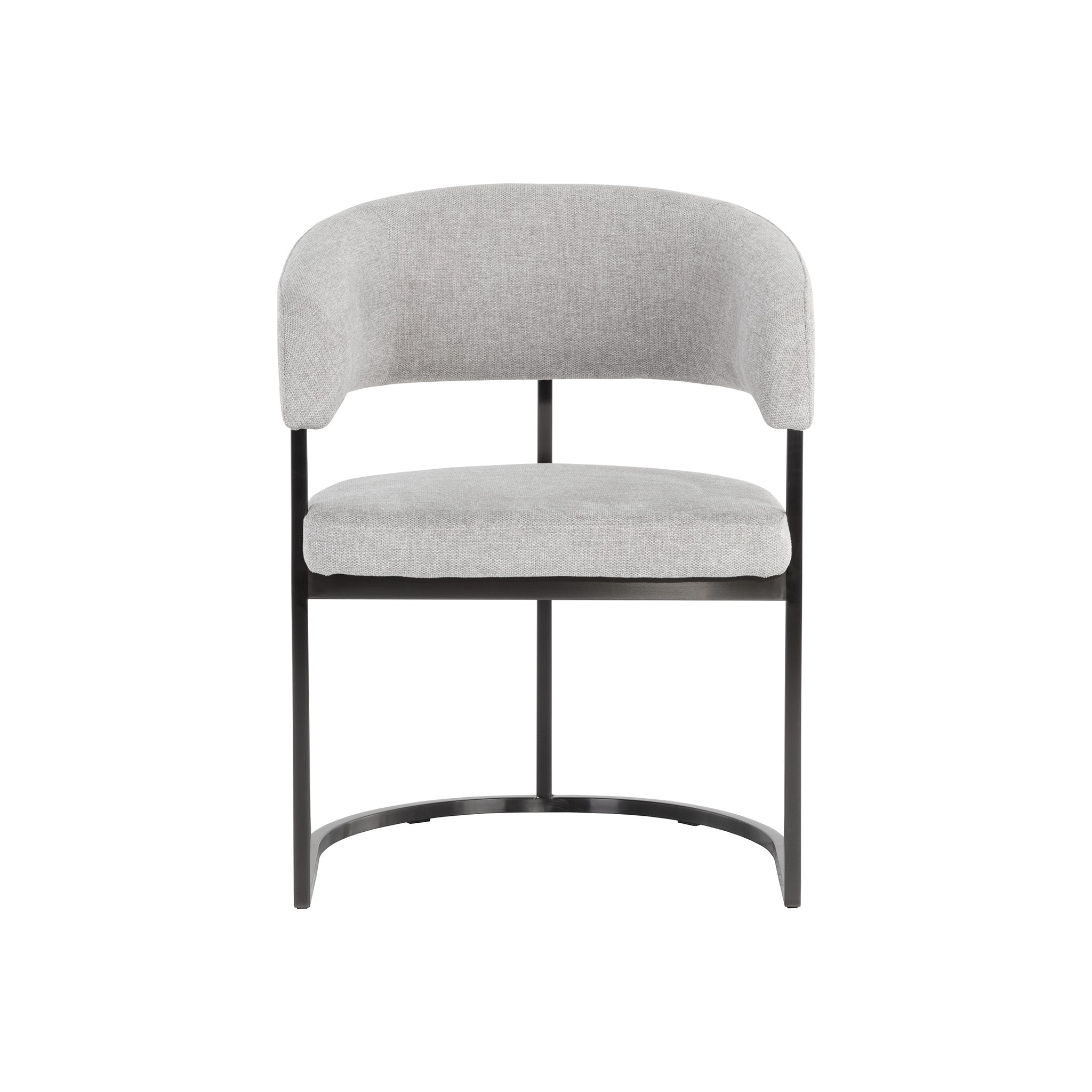 Uniting the beauty of sleek modern design with timeless elegance, this dining armchair is a great addition to any dining space. Stocked in belfast heather grey fabric and completed with a cantilever frame in a gunmetal stainless steel finish.