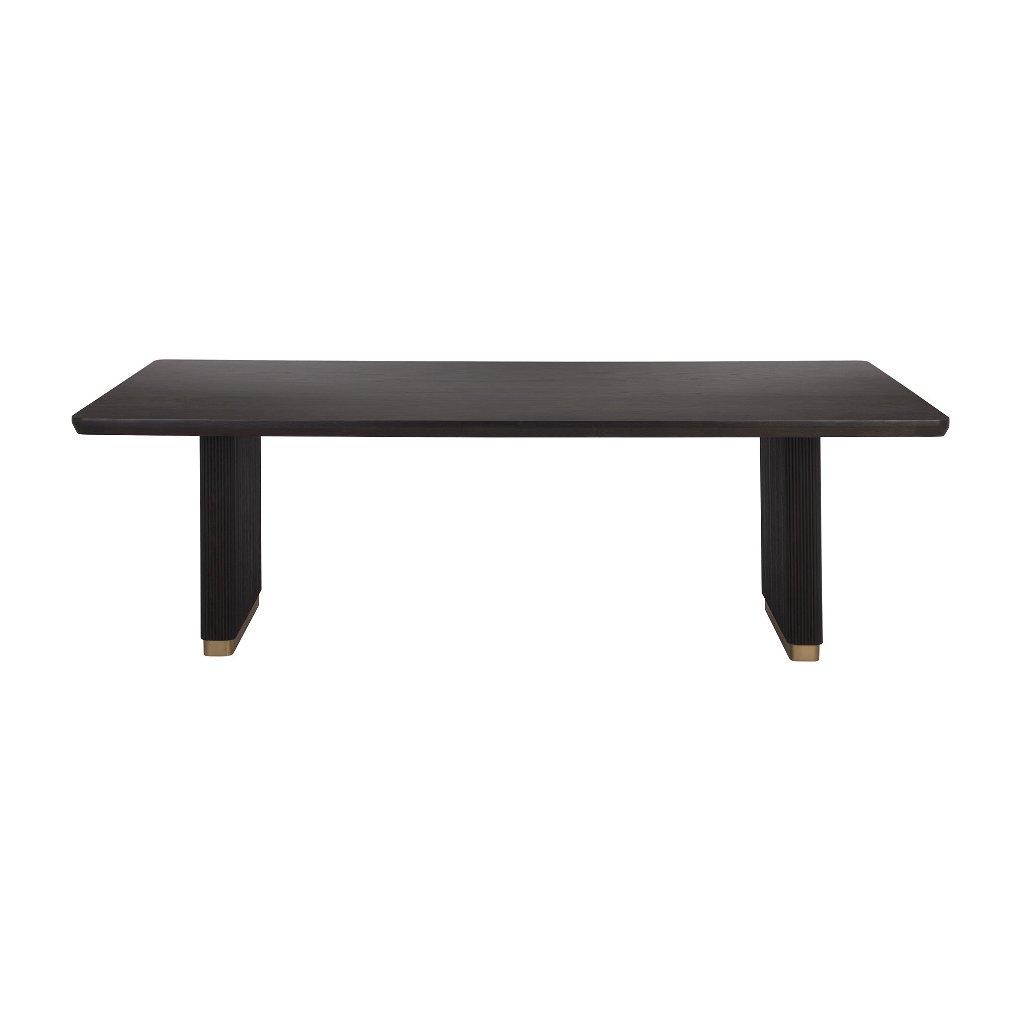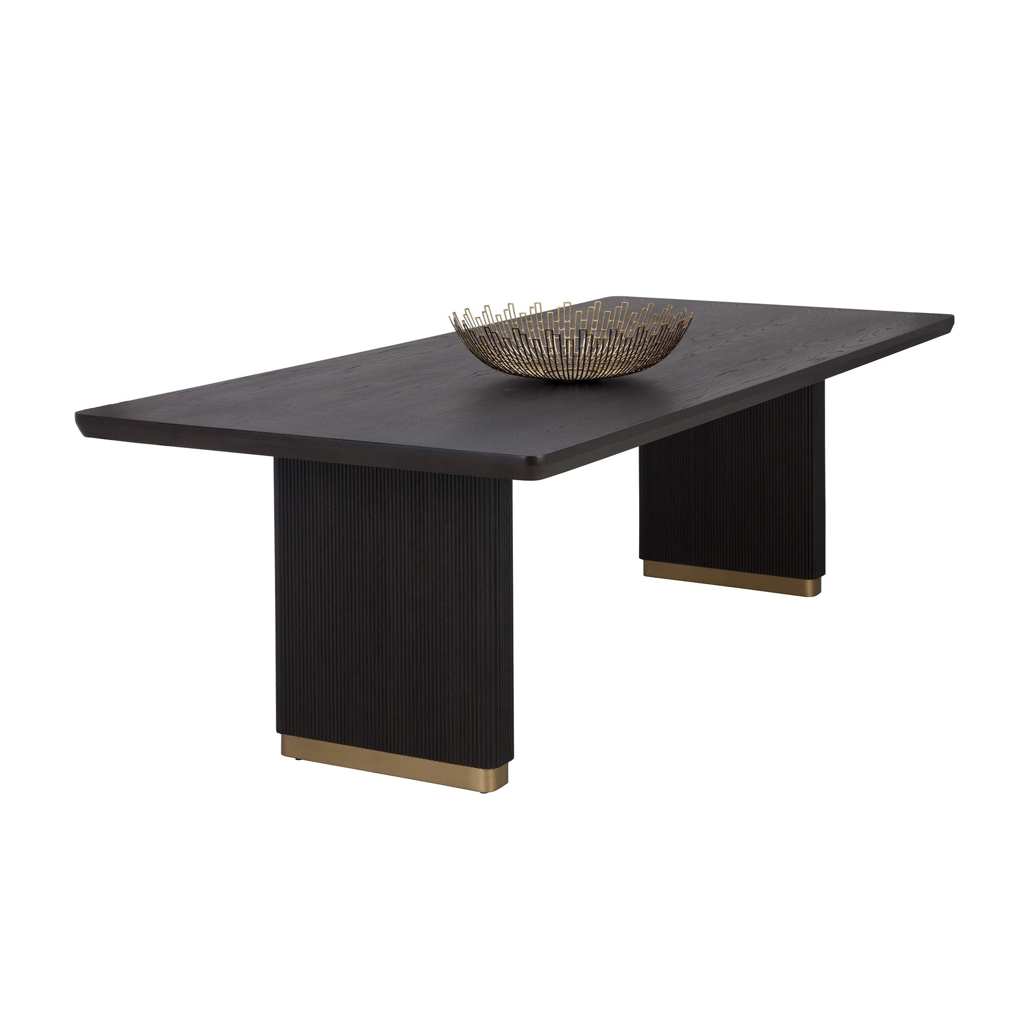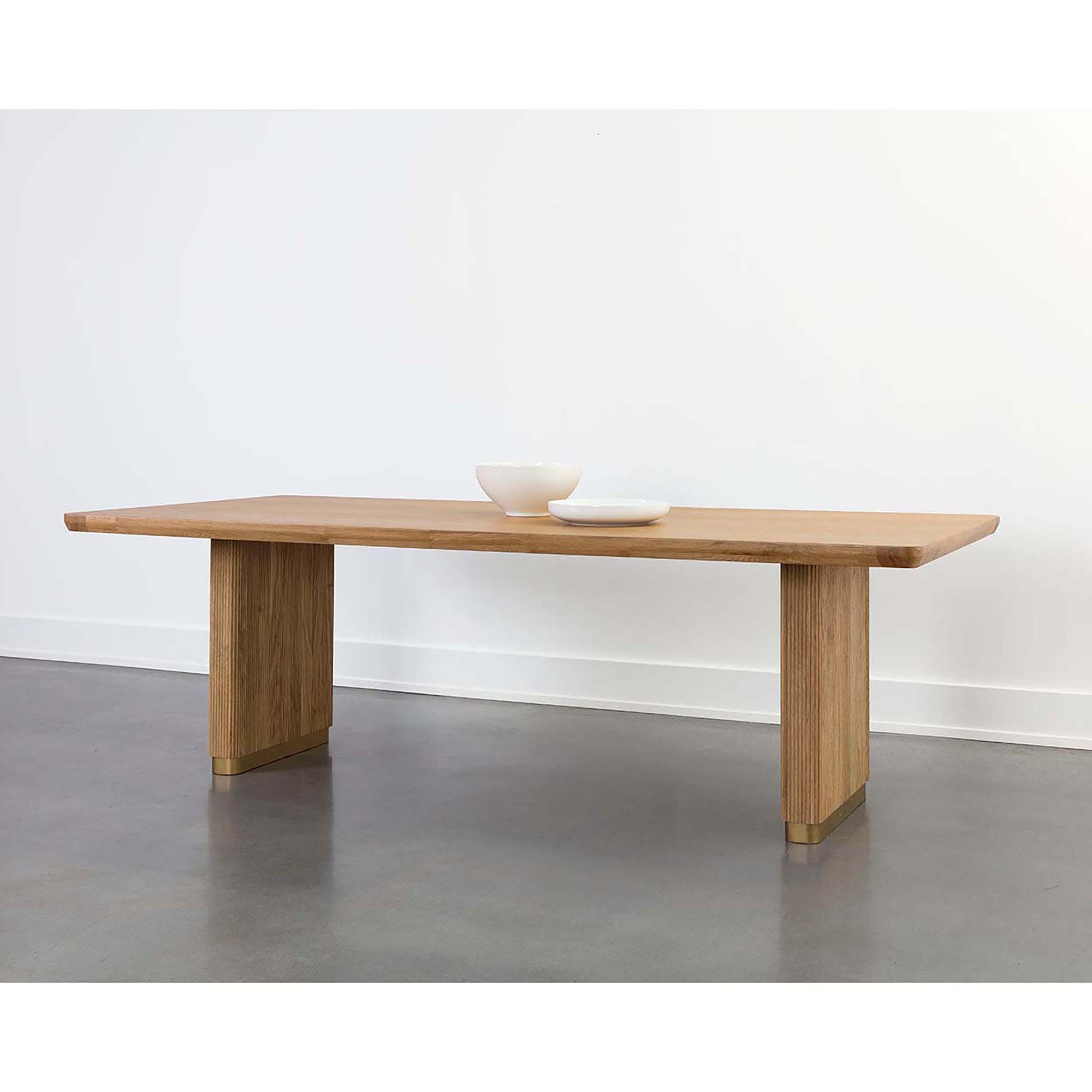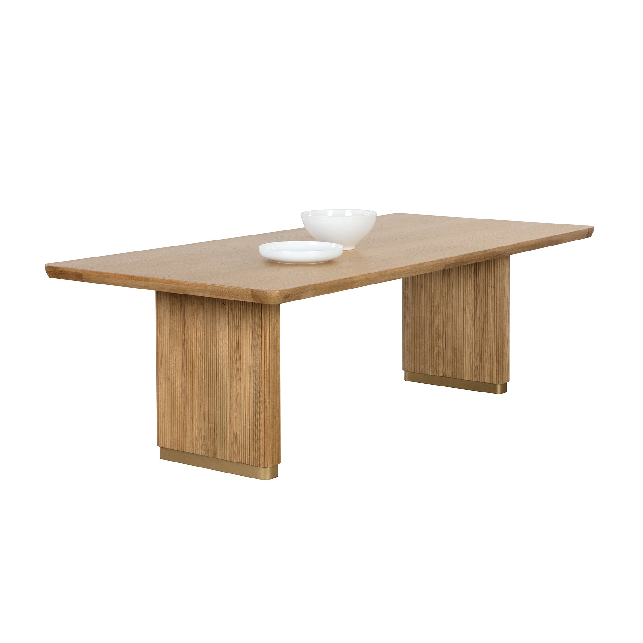 The Anthony Dining Table brings form and function to life. Crafted with veneer table top with a chamfered edge. Vertical reeding on a solid oak wood base with brushed gold steel detailing at the bottom finishes the look. As wood is an organic, porous material, these pieces will contain natural variation of texture and may also exhibit fine indentations and cracks. Wood pieces will also display a disparity of colour and grain, and visible knots and burls that add to the character of each piece.