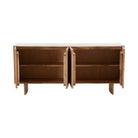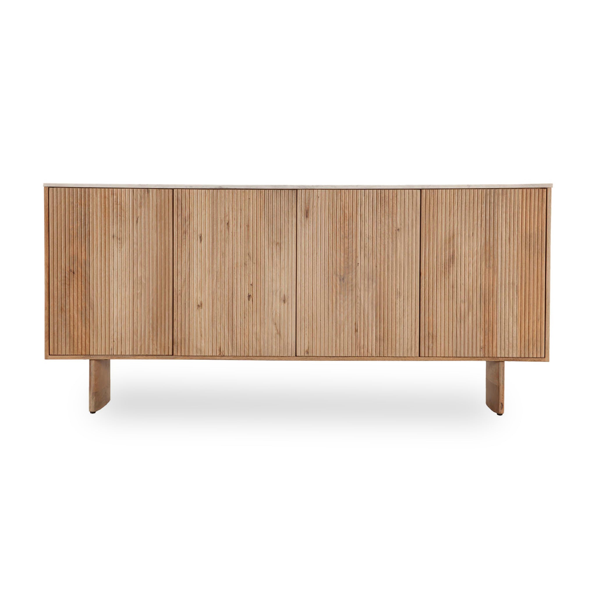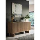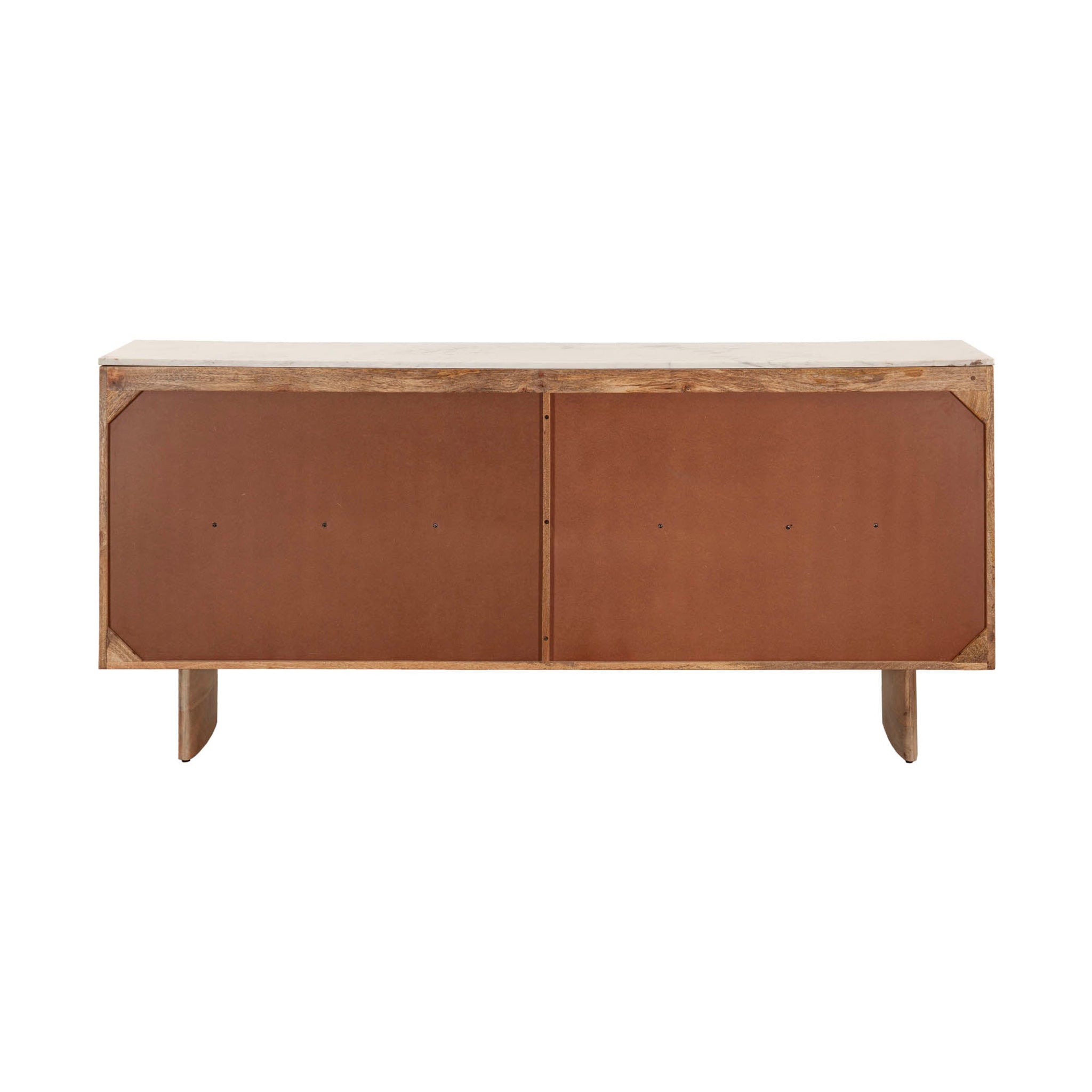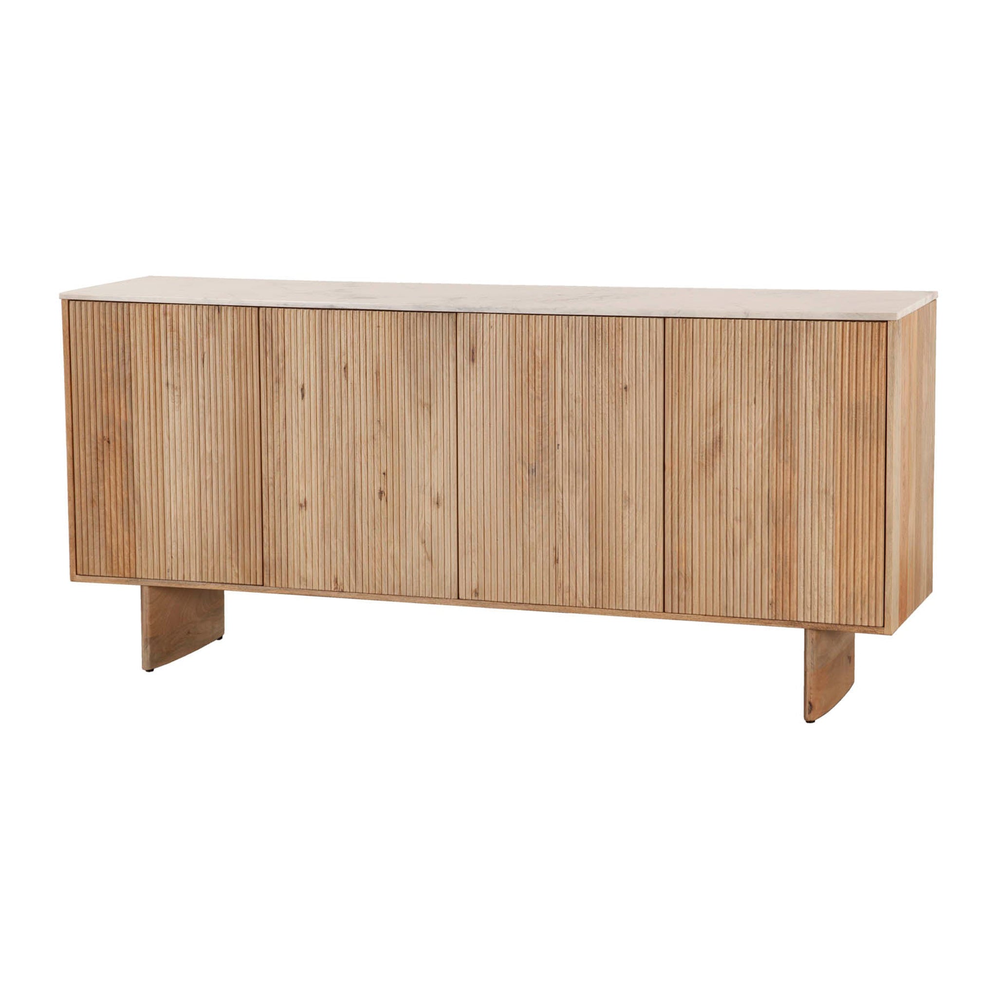 The Ferrante Sideboard combines smooth white marble with warm mango wood. Its push-to-open doors feature fluted detailing for a clean, modern look. Inside, fixed shelves offer storage space. Each piece shows off the natural wood grain. Light tones and simple lines help brighten your space, adding texture and a calm, stylish feel.