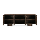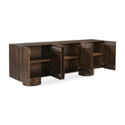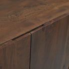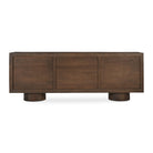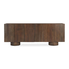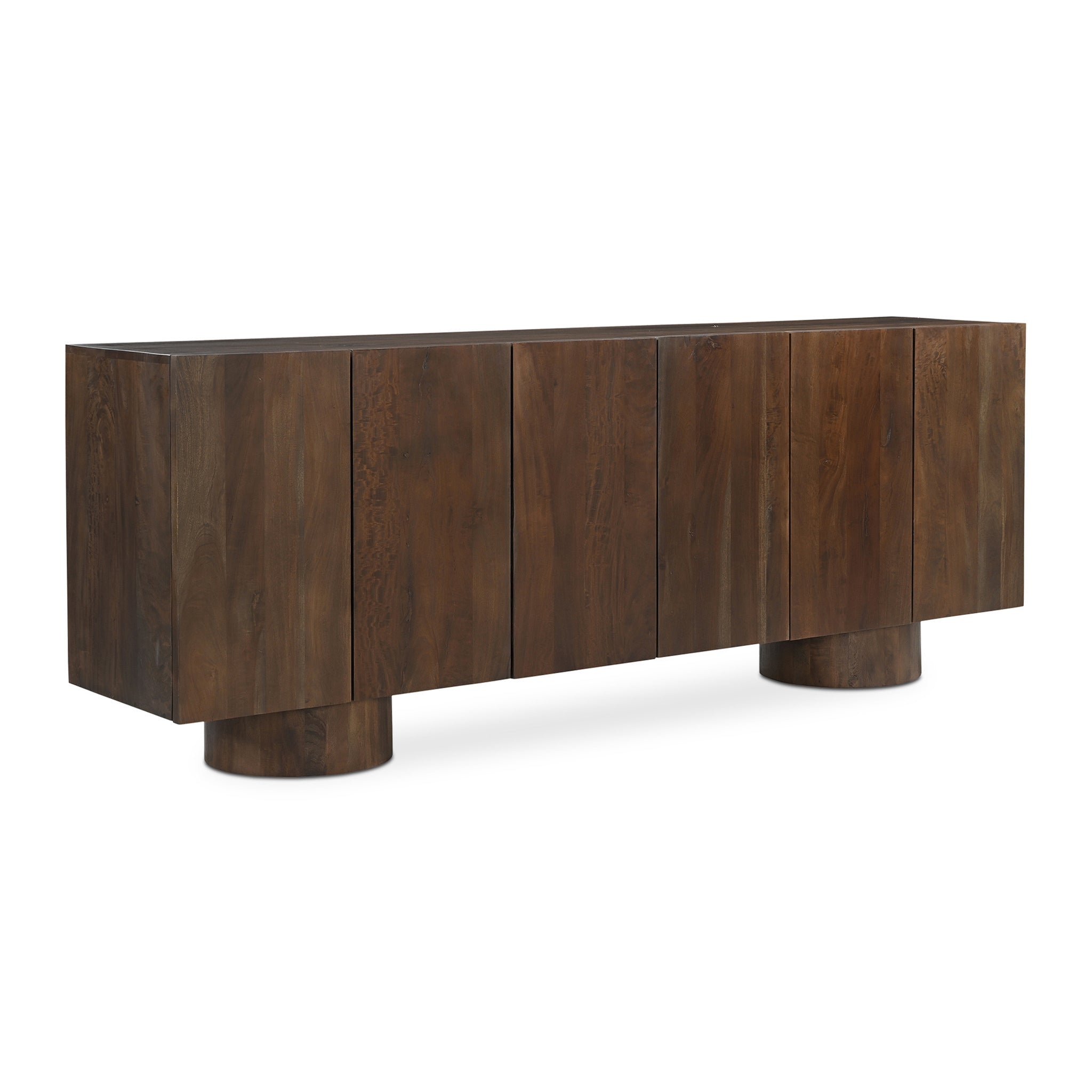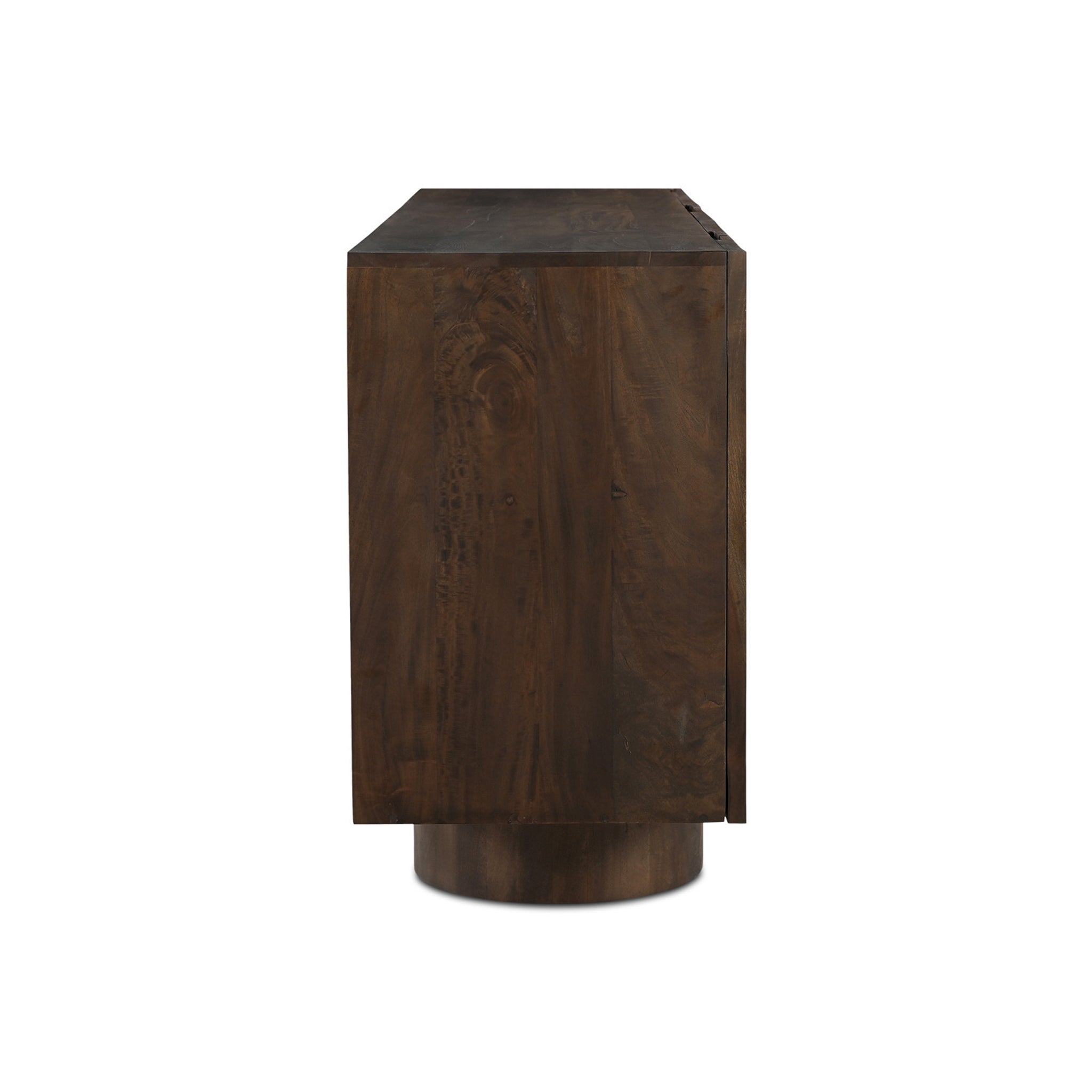 Crafted from reclaimed neem wood, the Gianni sideboard top rests on robust cylindrical bases, grounding the piece with quiet confidence. Six generous doors featuring integrated handles reveal ample storage, while its warm hue and natural wood variations create a uniquely inviting ambiance.