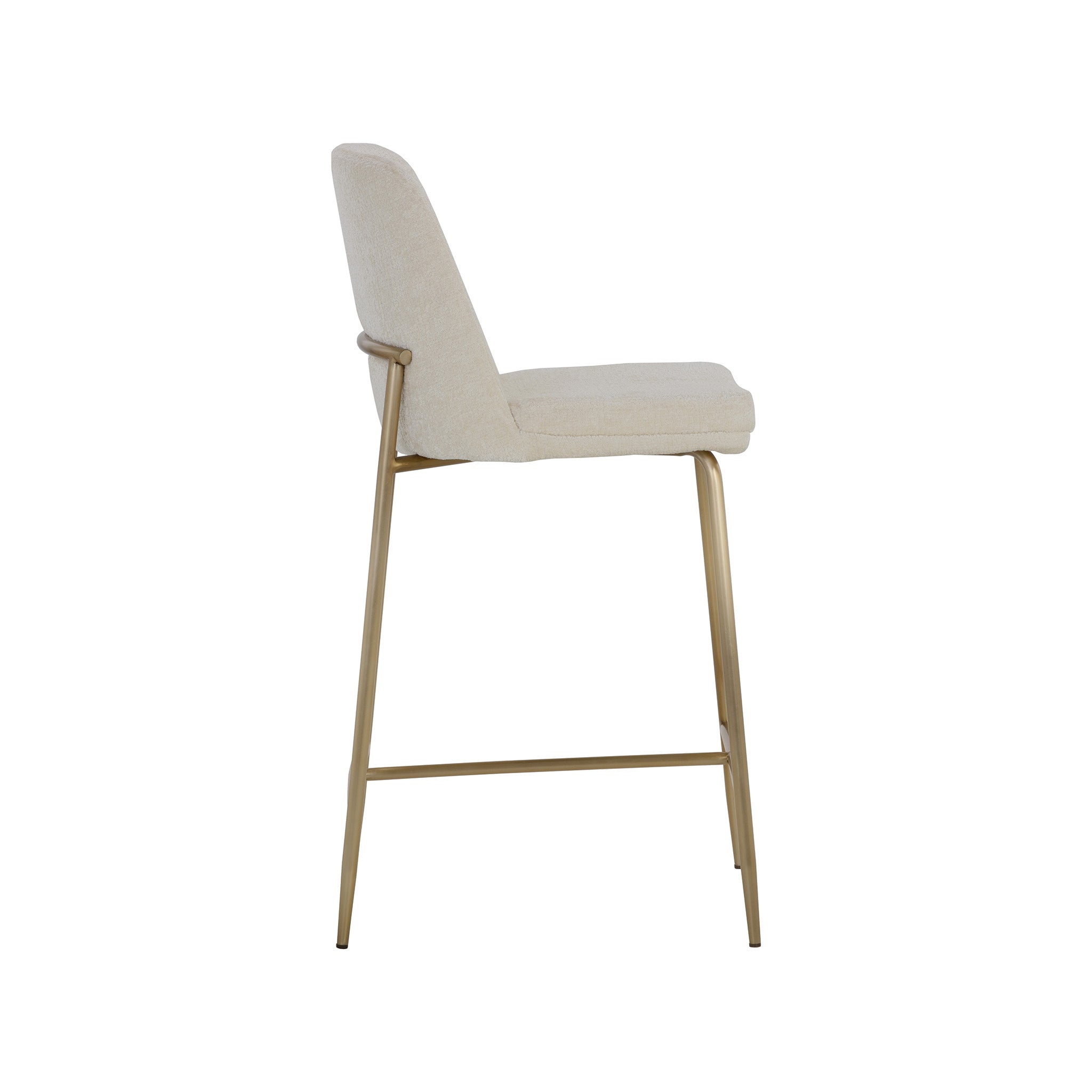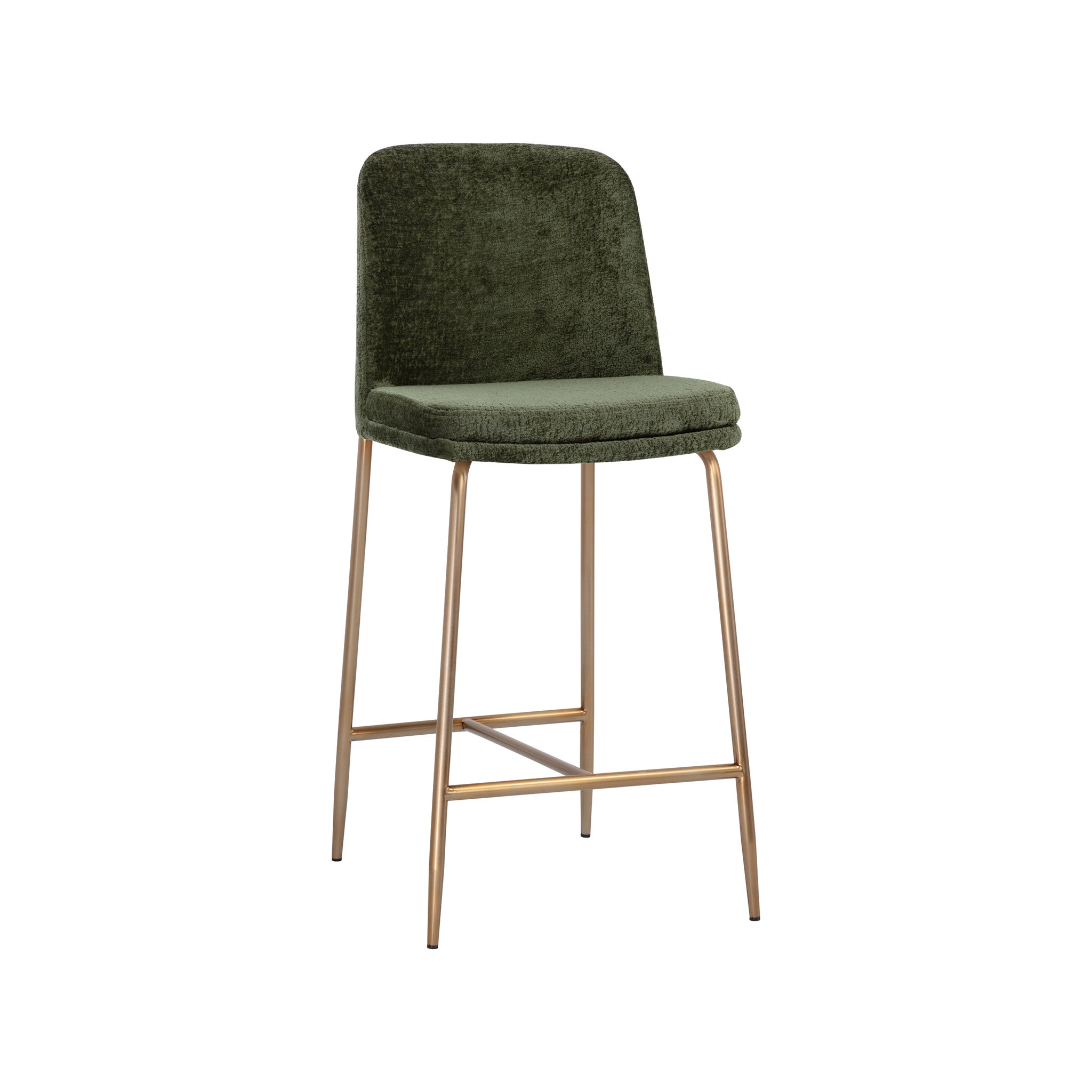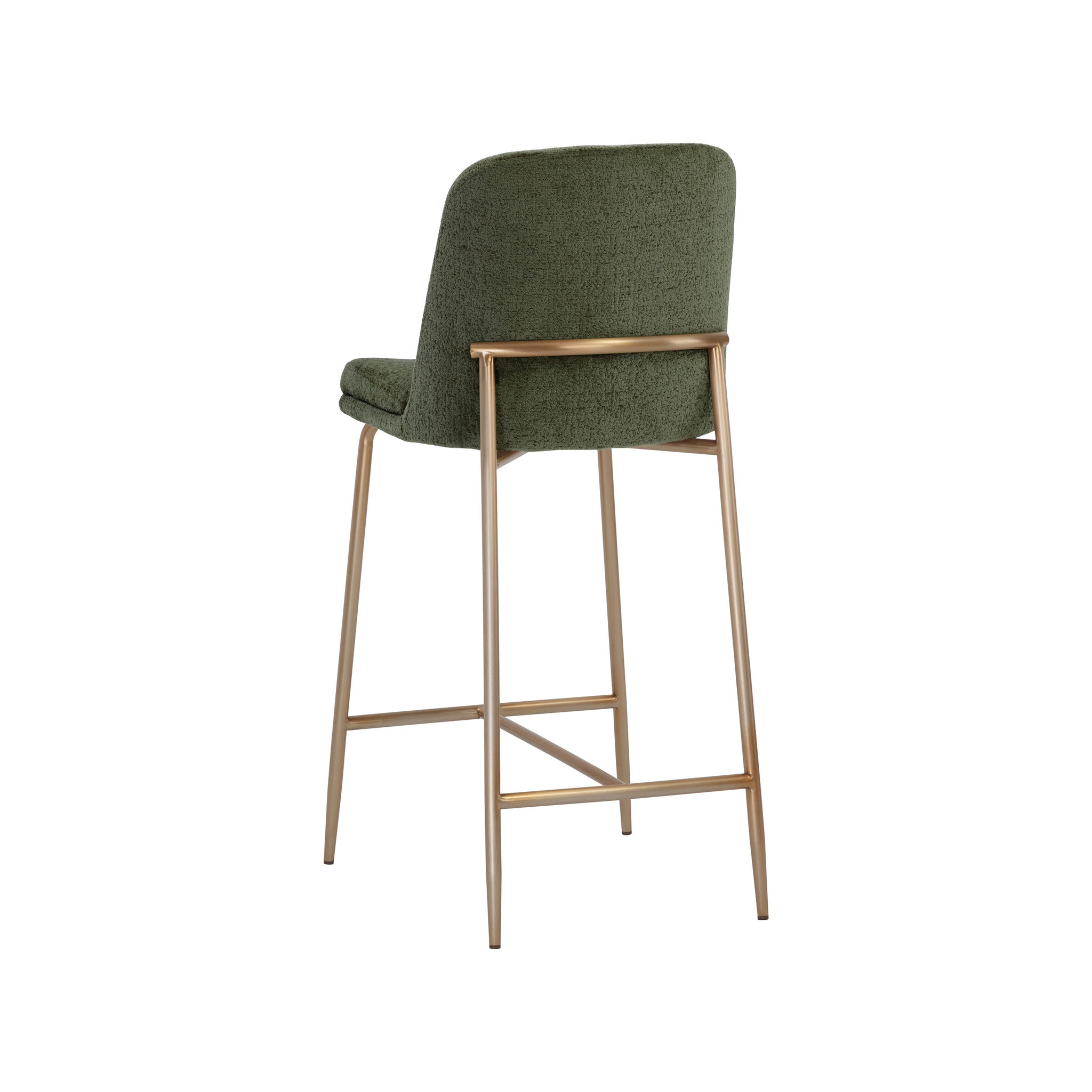 This stylish counter stool features a classic silhouette that provides comfortable seating in any modern living space. Features an antique brass stainless steel frame and curved backrest upholstered in bergen fabric.