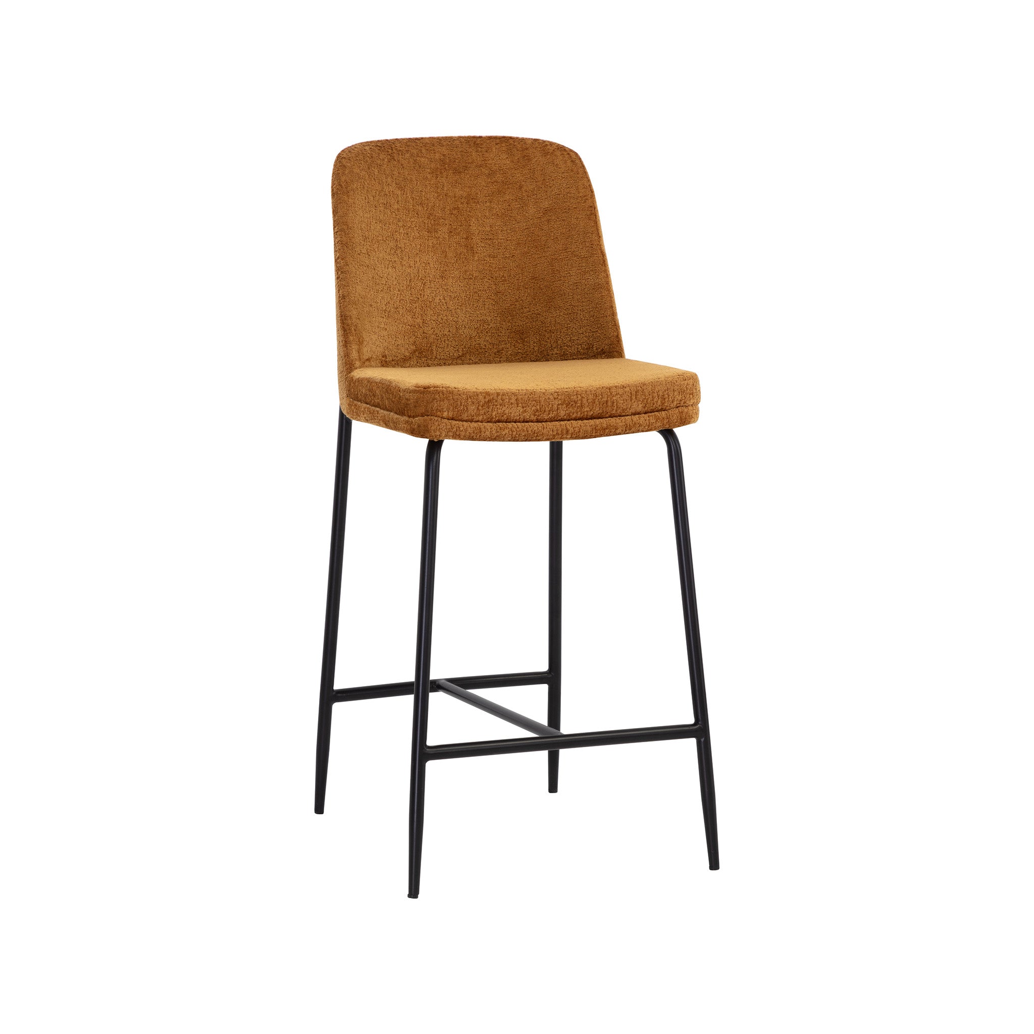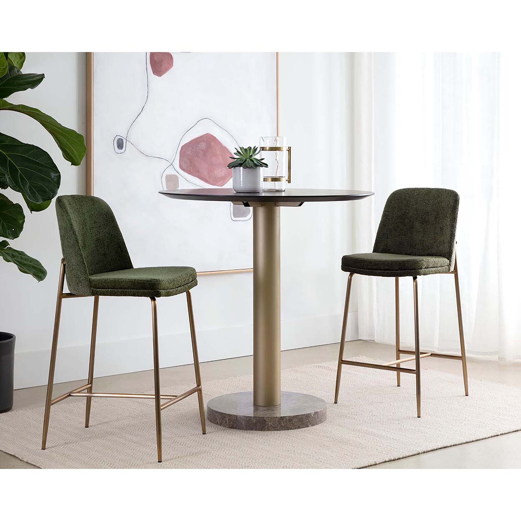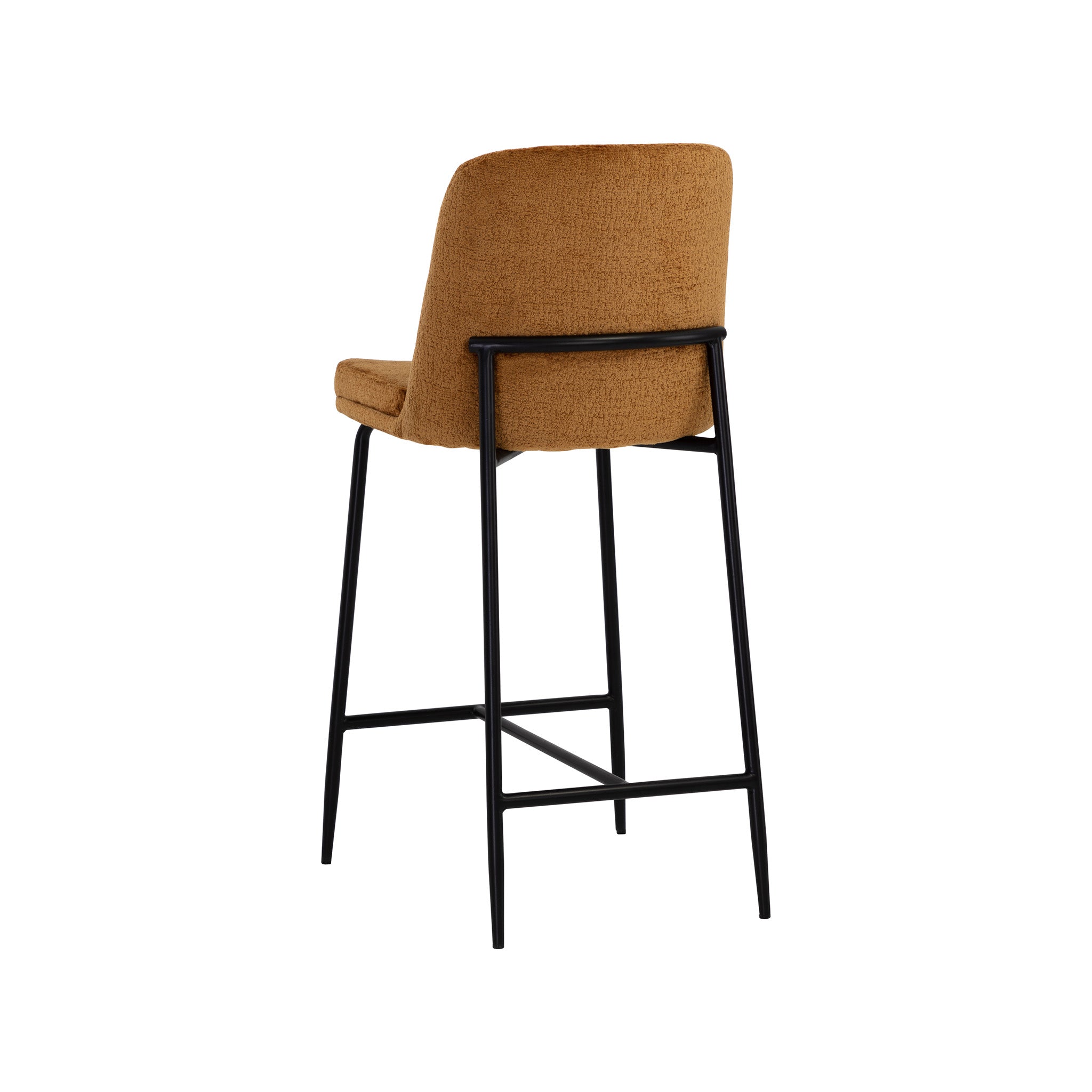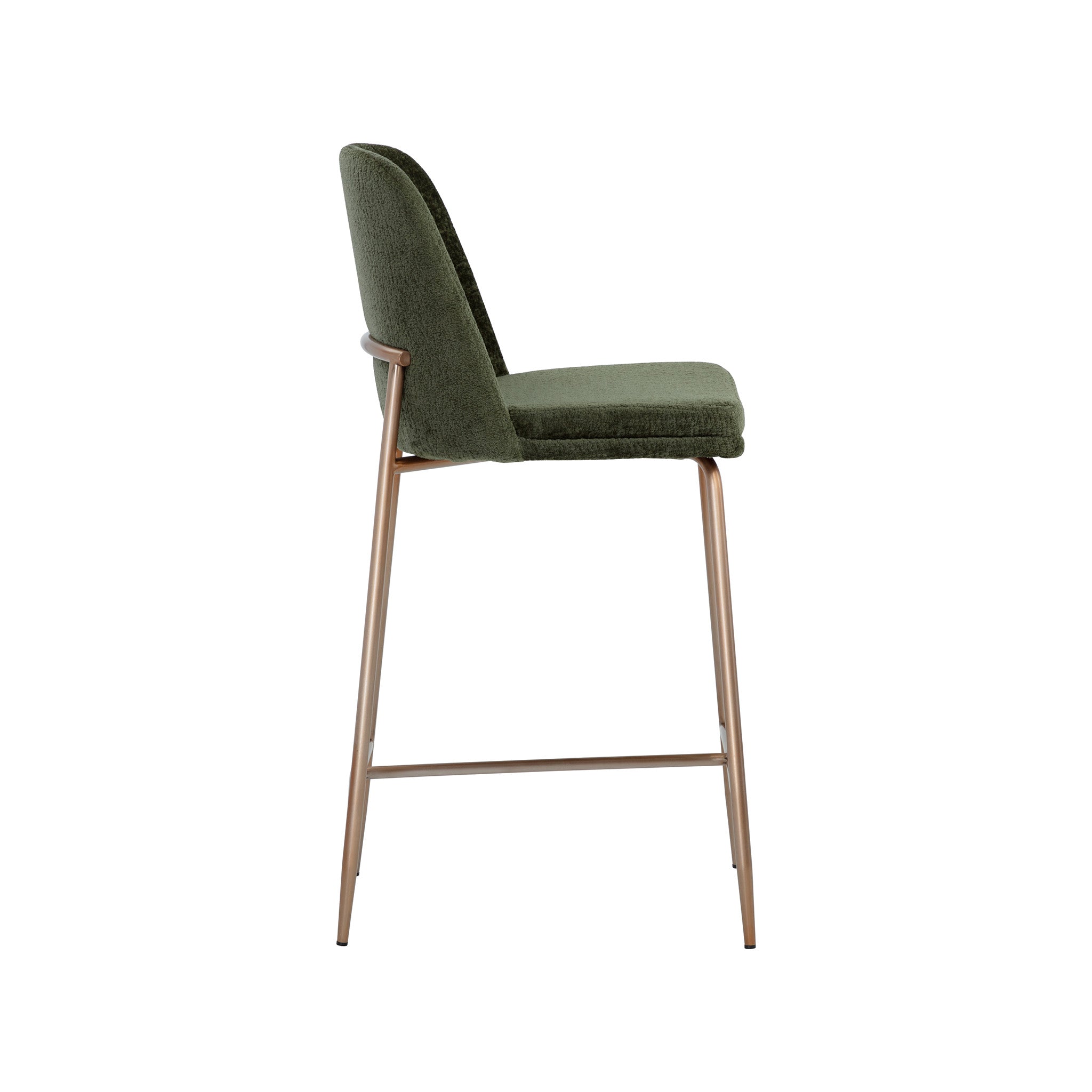 This stylish counter stool features a classic silhouette that provides comfortable seating in any modern living space. Features an antique brass stainless steel frame and curved backrest upholstered in bergen fabric.