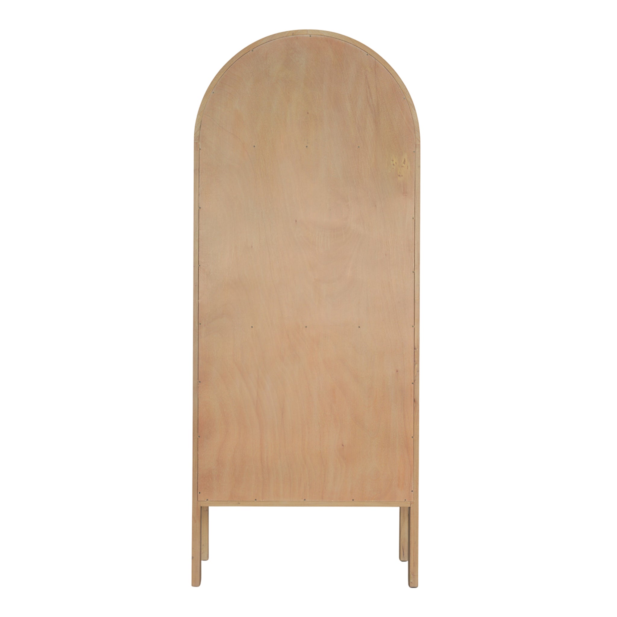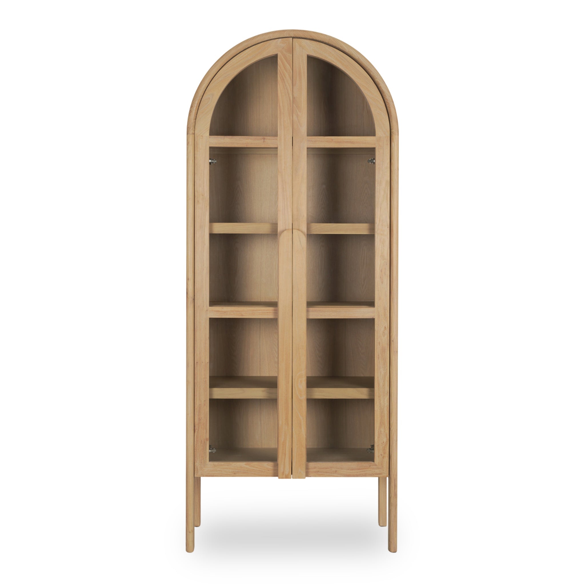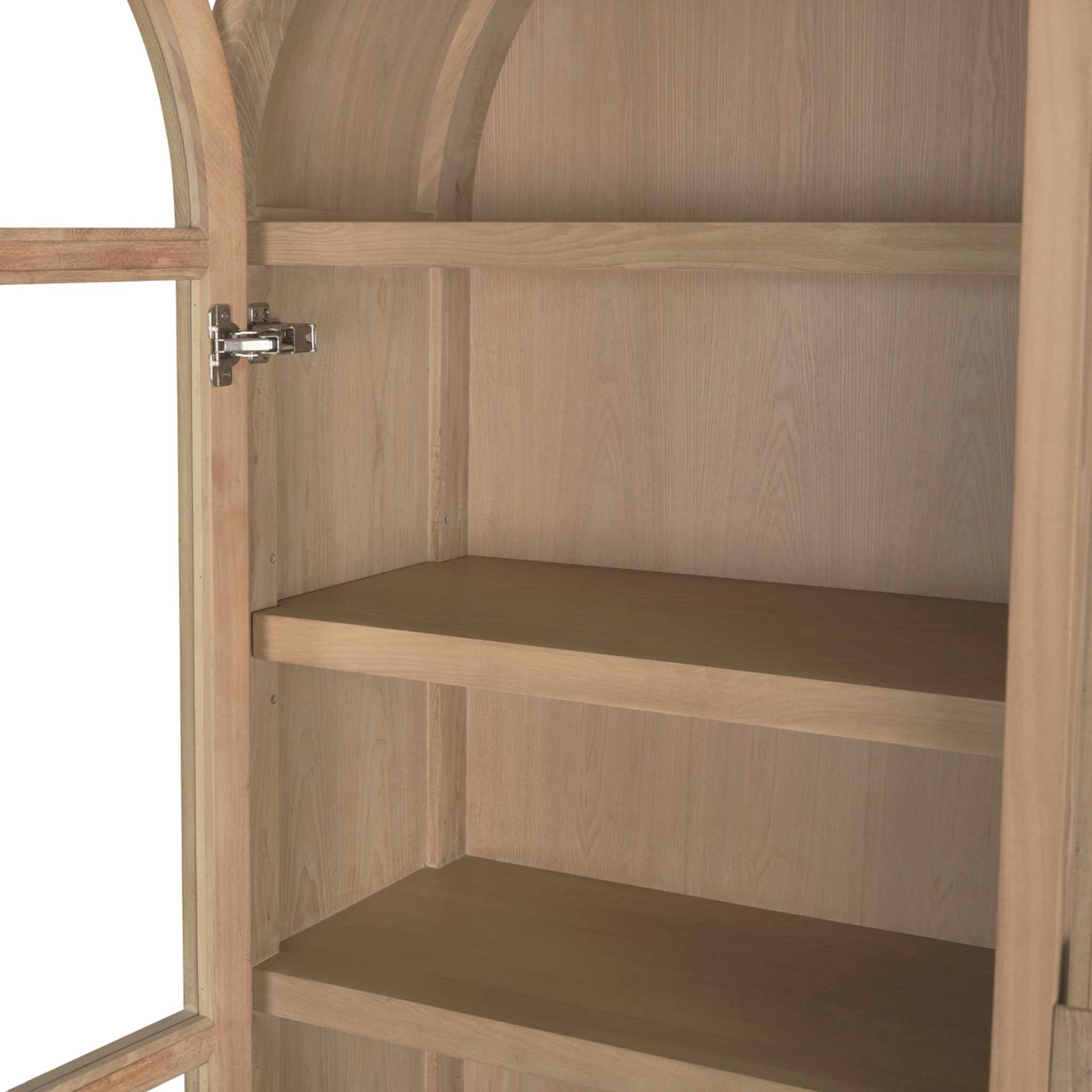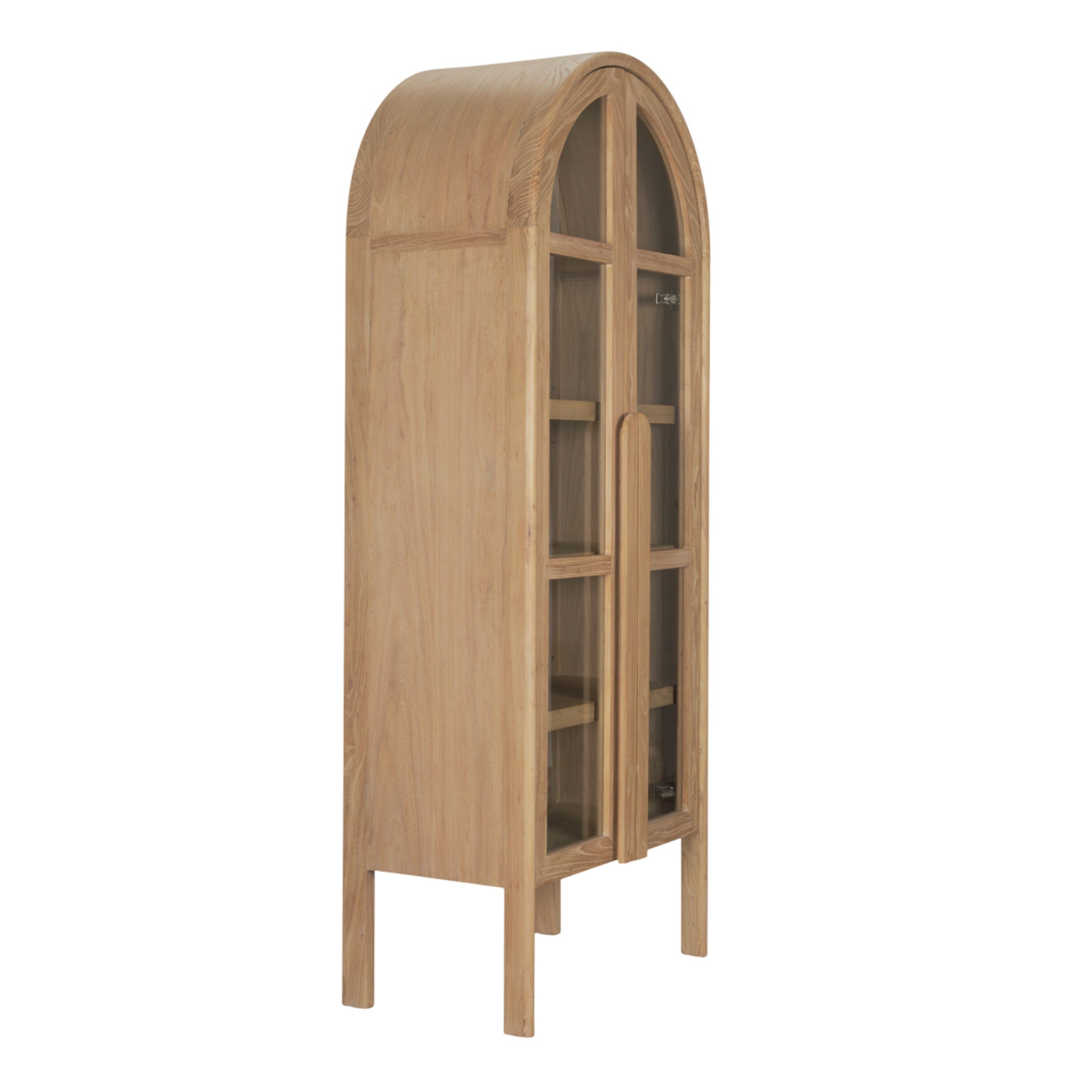 The Melanie Arched Curio Cabinet brings organic elegance to any room with its solid and manufactured elm construction, beautifully wire-brushed to reveal a warm yellow-blond wood grain. Tall, sculpted door pulls open to reveal two fixed and two removable glass-paneled shelves secured by a magnetic catch-perfect for artful display and secure storage. Ideal for living rooms or studies, it elevates the atmosphere with serene functionality and refined craftsmanship.