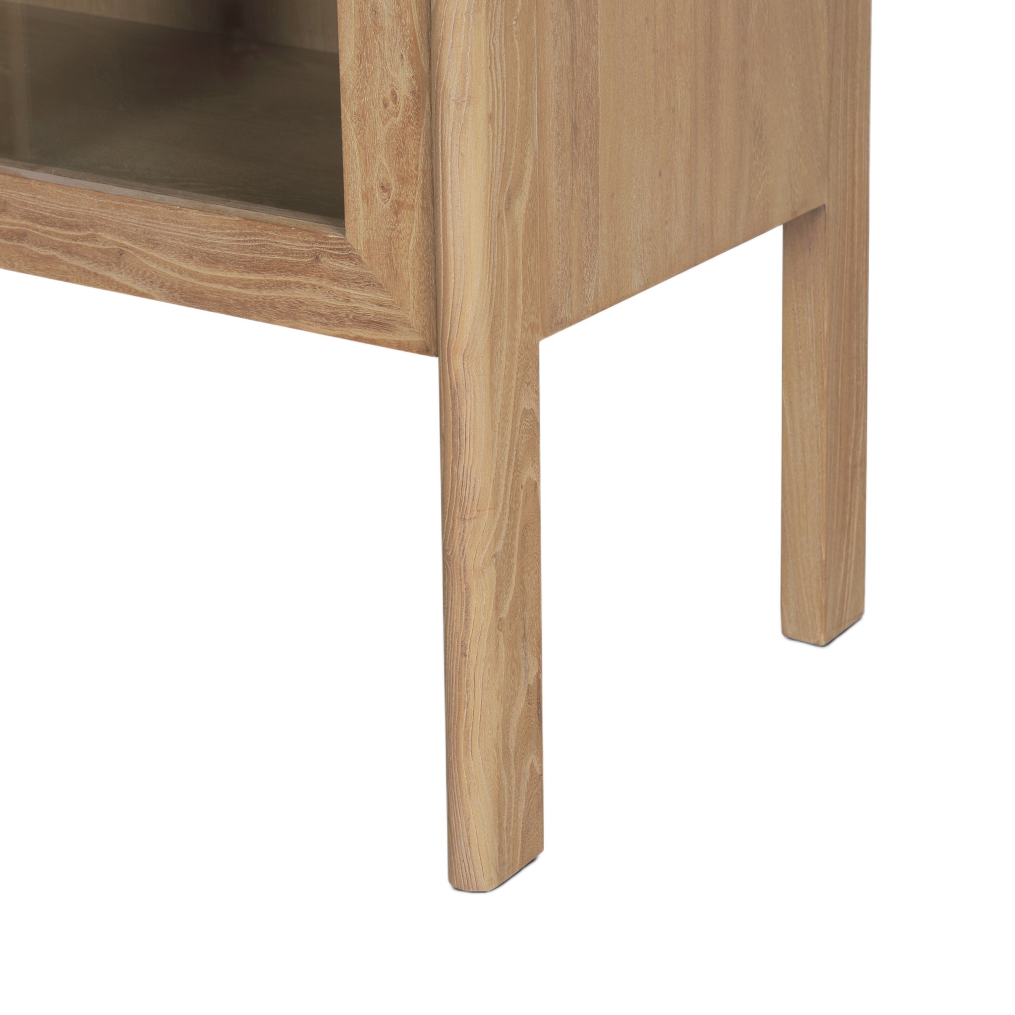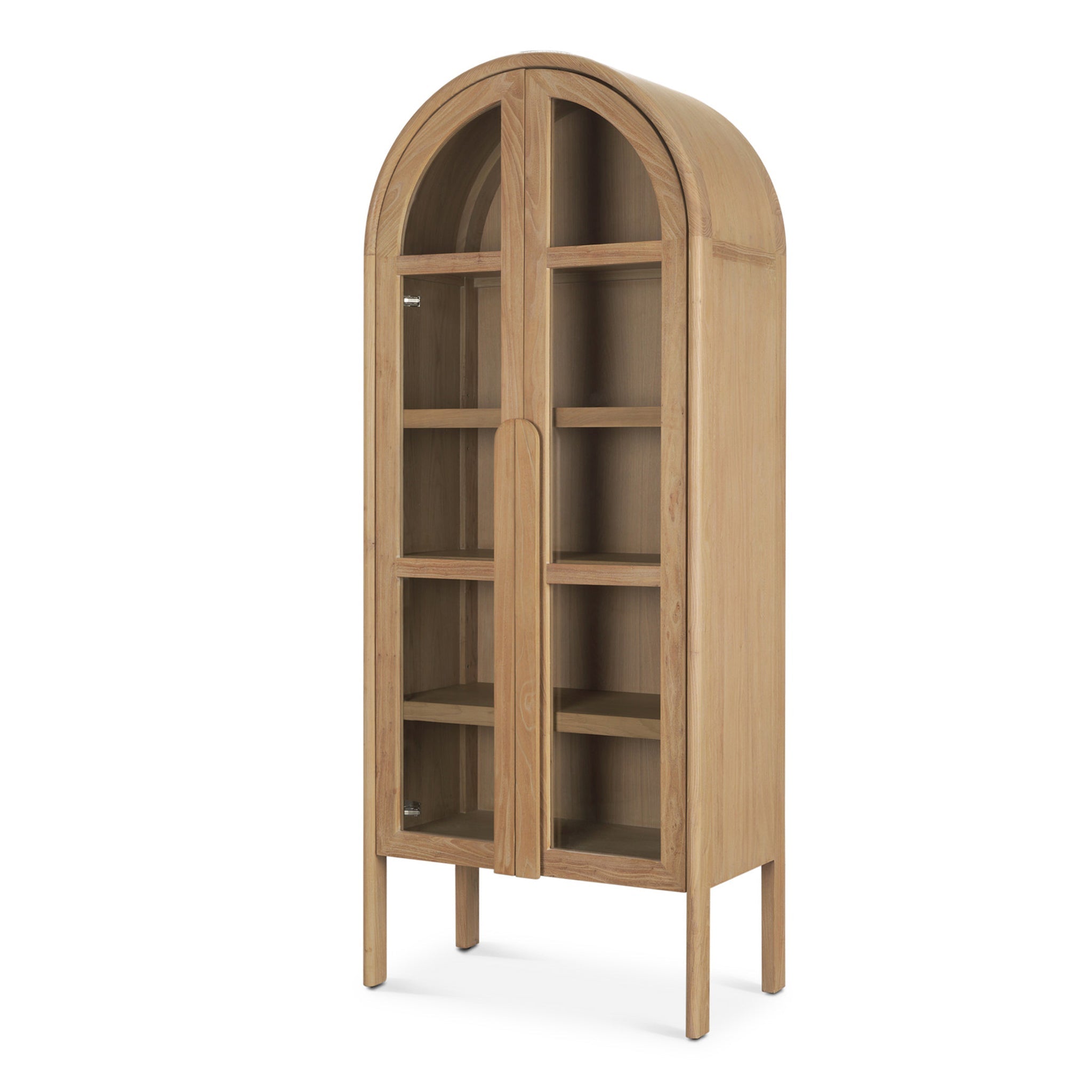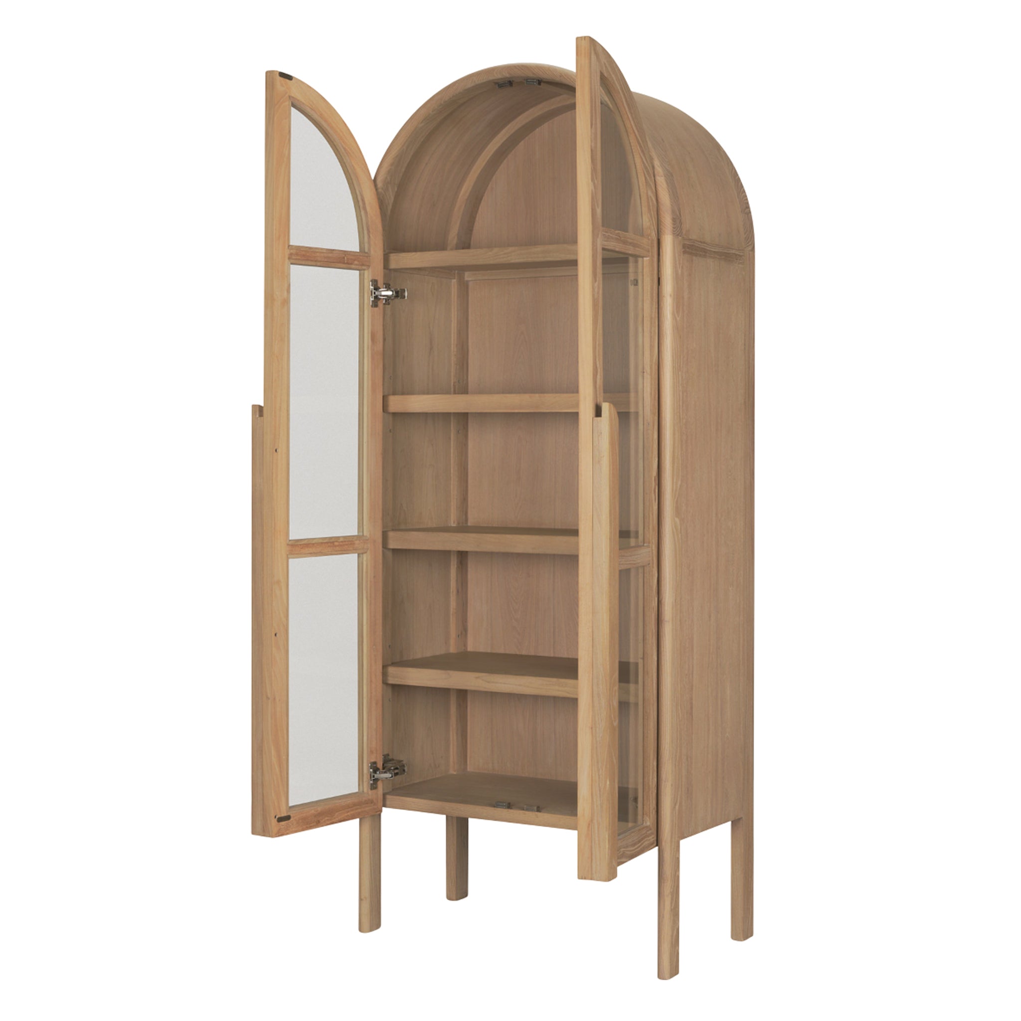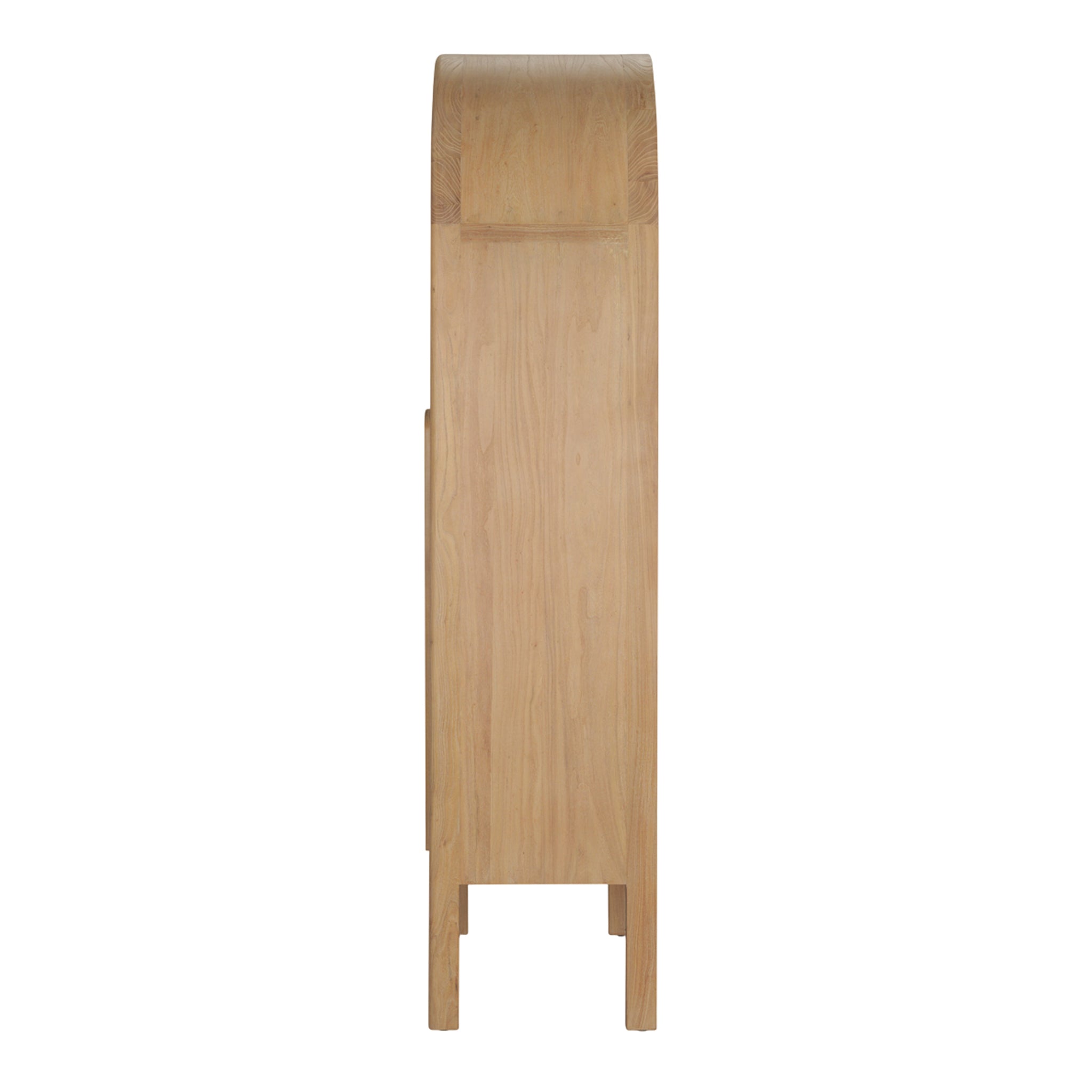 The Melanie Arched Curio Cabinet brings organic elegance to any room with its solid and manufactured elm construction, beautifully wire-brushed to reveal a warm yellow-blond wood grain. Tall, sculpted door pulls open to reveal two fixed and two removable glass-paneled shelves secured by a magnetic catch-perfect for artful display and secure storage. Ideal for living rooms or studies, it elevates the atmosphere with serene functionality and refined craftsmanship.