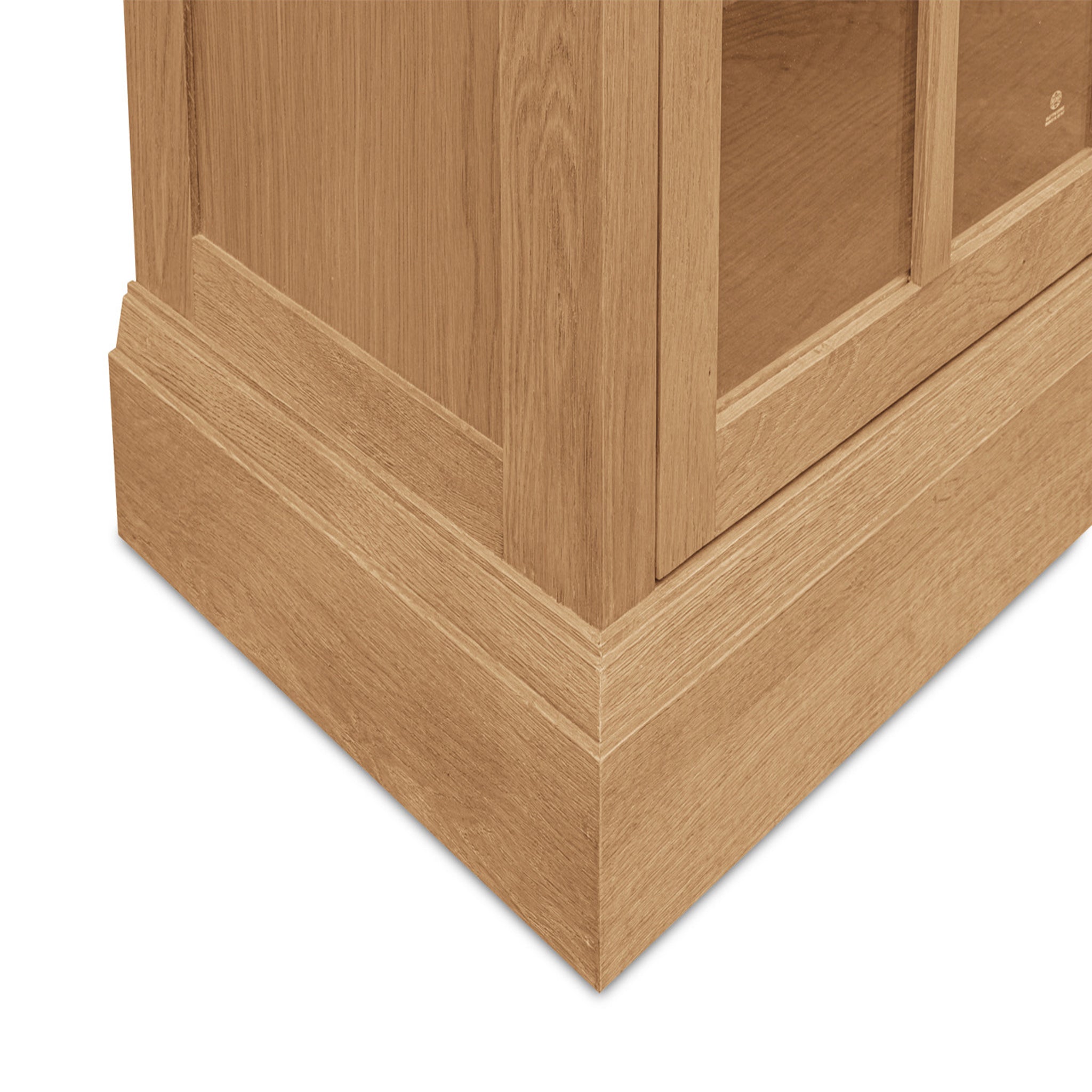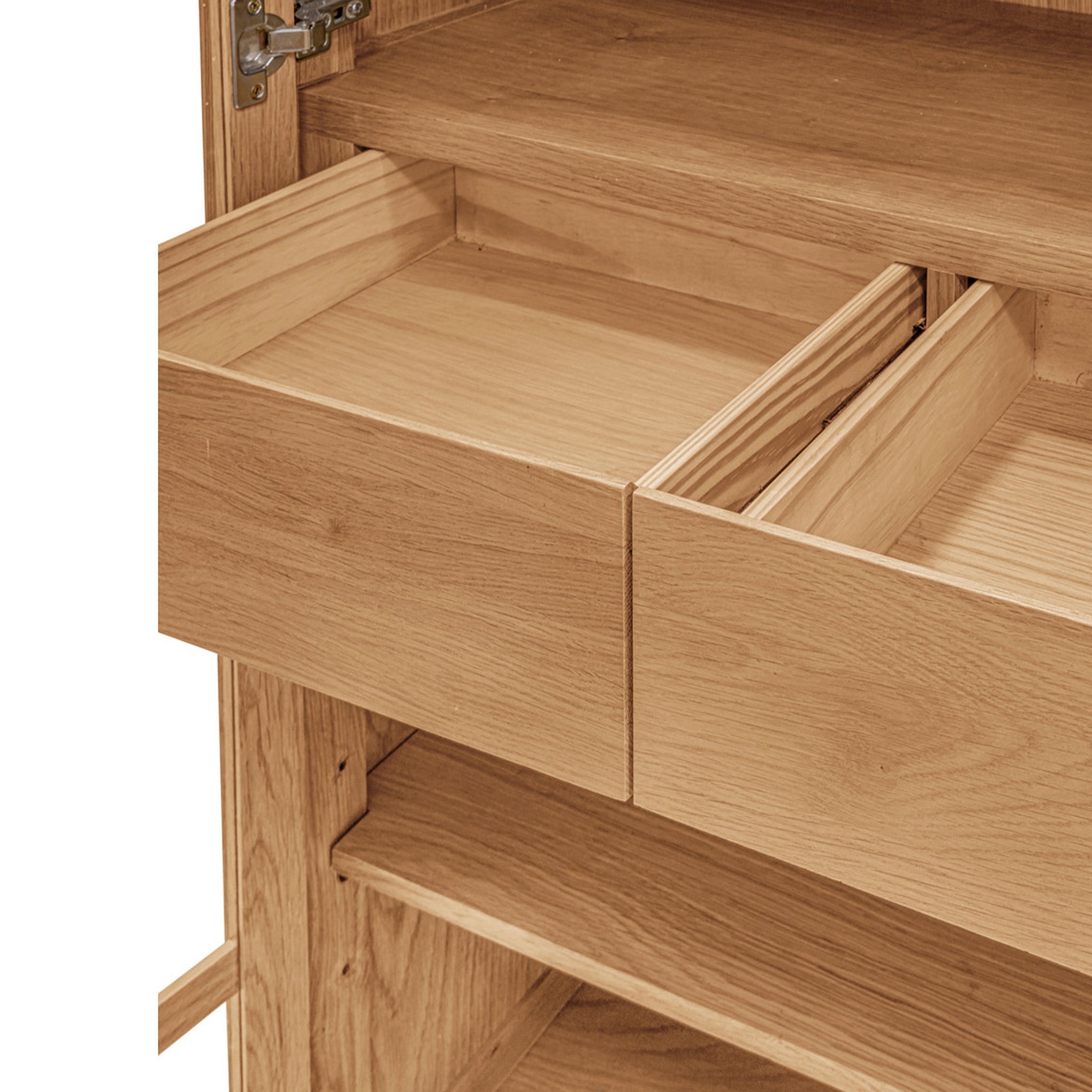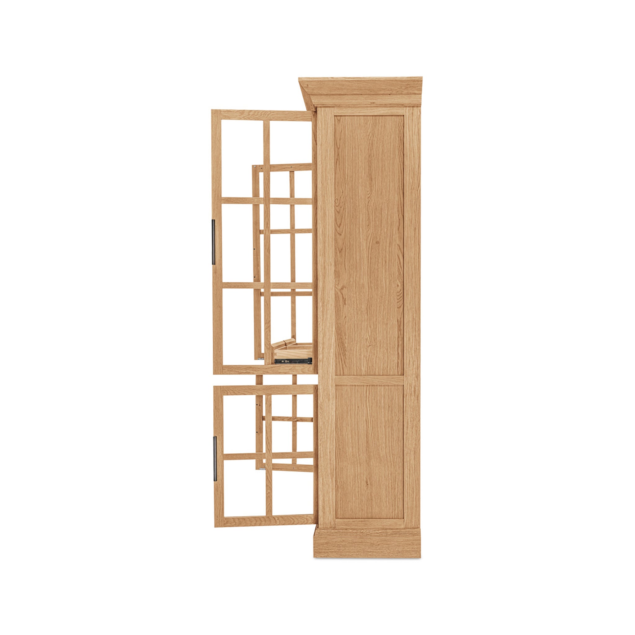Meticulously crafted from solid oak and oak veneer, the Rocco tall cabinet's wire-brushed natural finish exudes warmth and texture. The glass front, adorned with traditional molding and a graceful overhang, adds elegance with a contemporary twist. Two interior drawers and discreet cable management provide practical storage solutions.