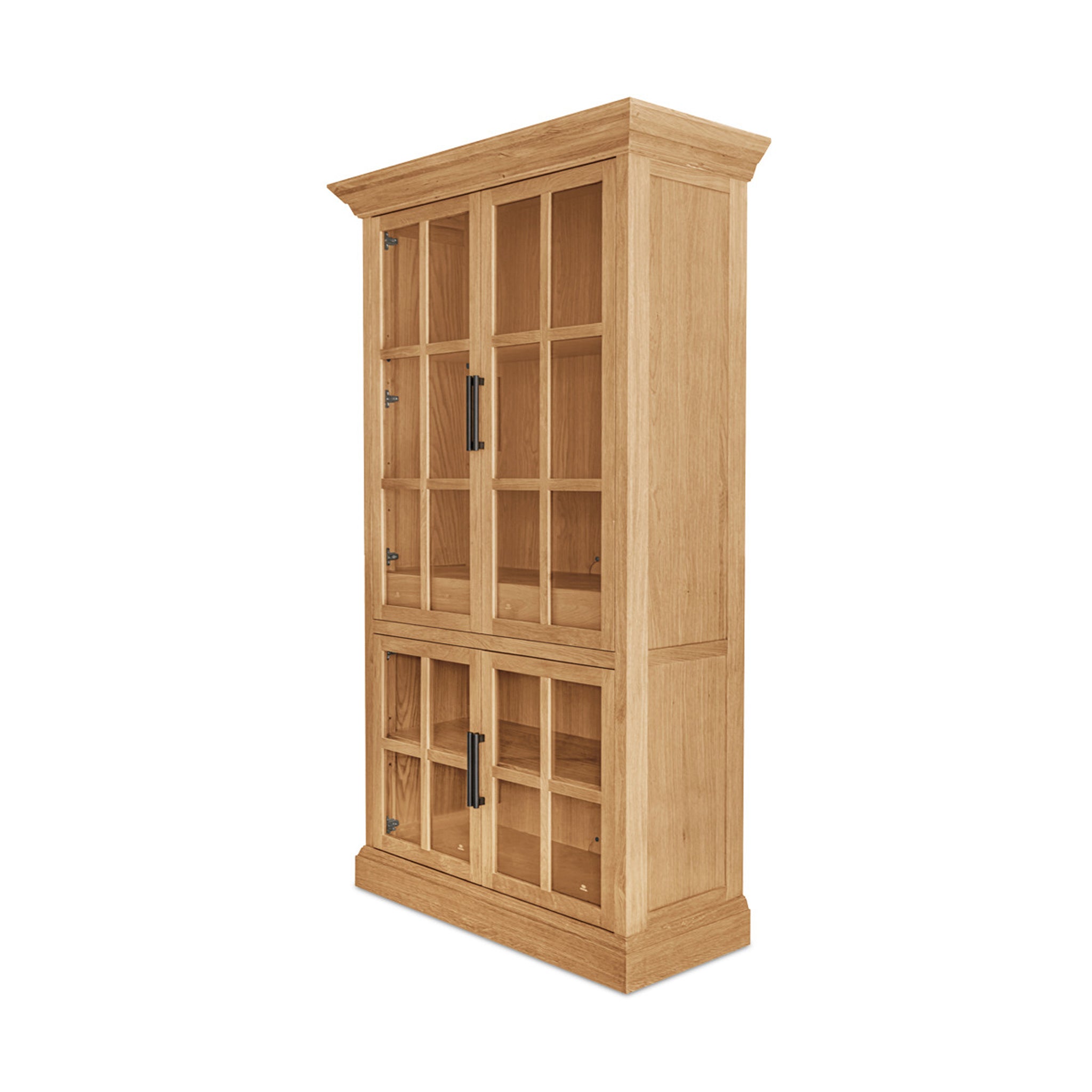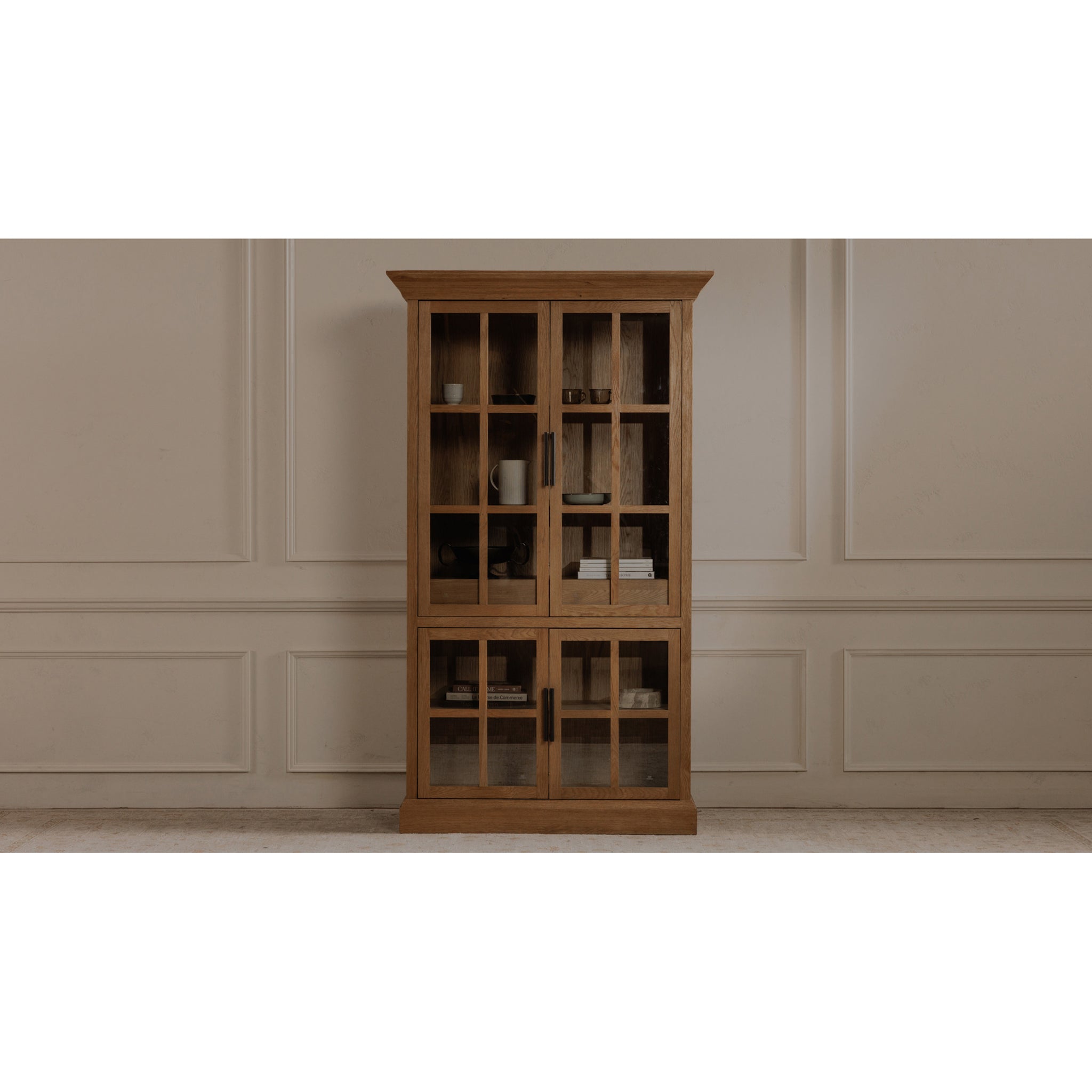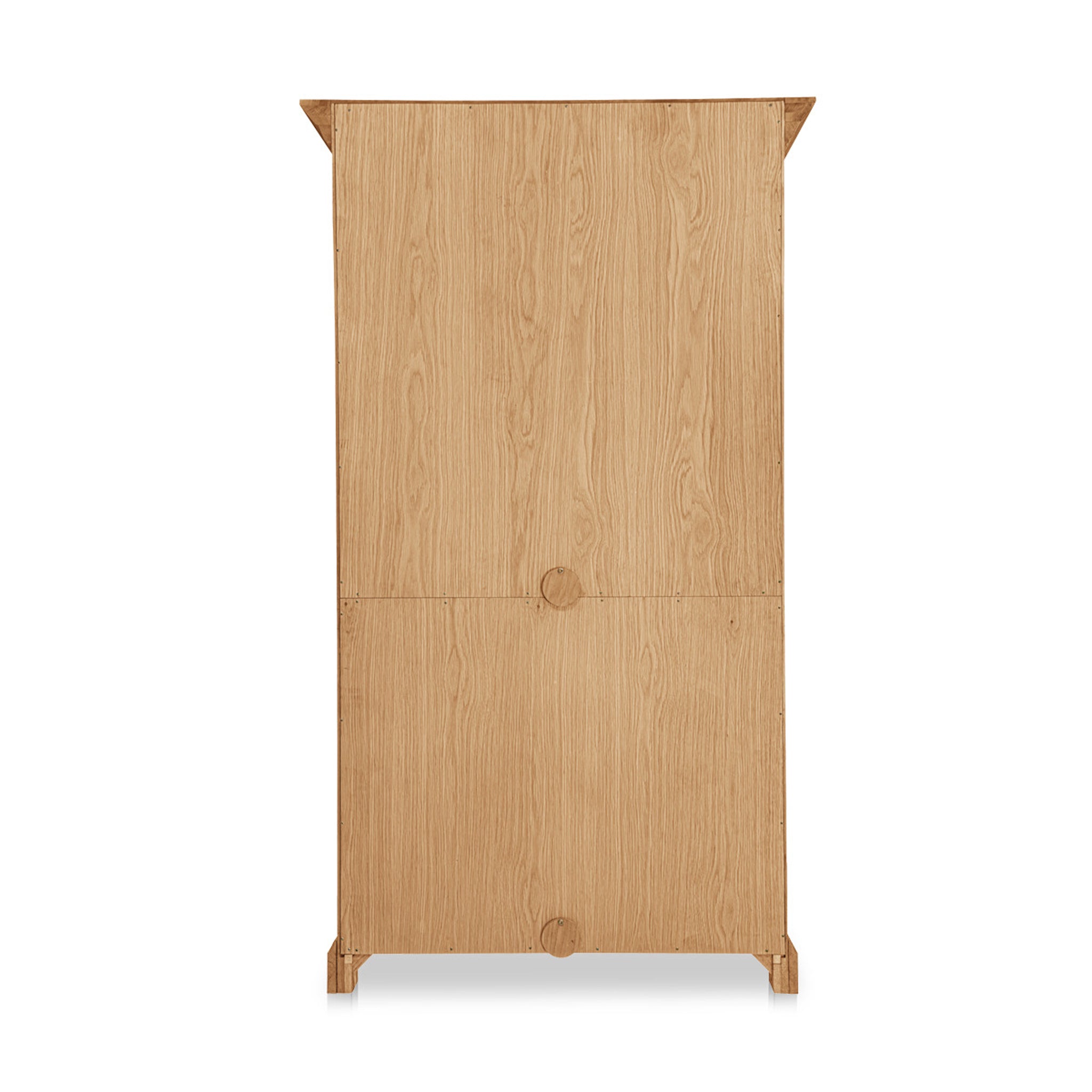 Meticulously crafted from solid oak and oak veneer, the Rocco tall cabinet's wire-brushed natural finish exudes warmth and texture. The glass front, adorned with traditional molding and a graceful overhang, adds elegance with a contemporary twist. Two interior drawers and discreet cable management provide practical storage solutions.