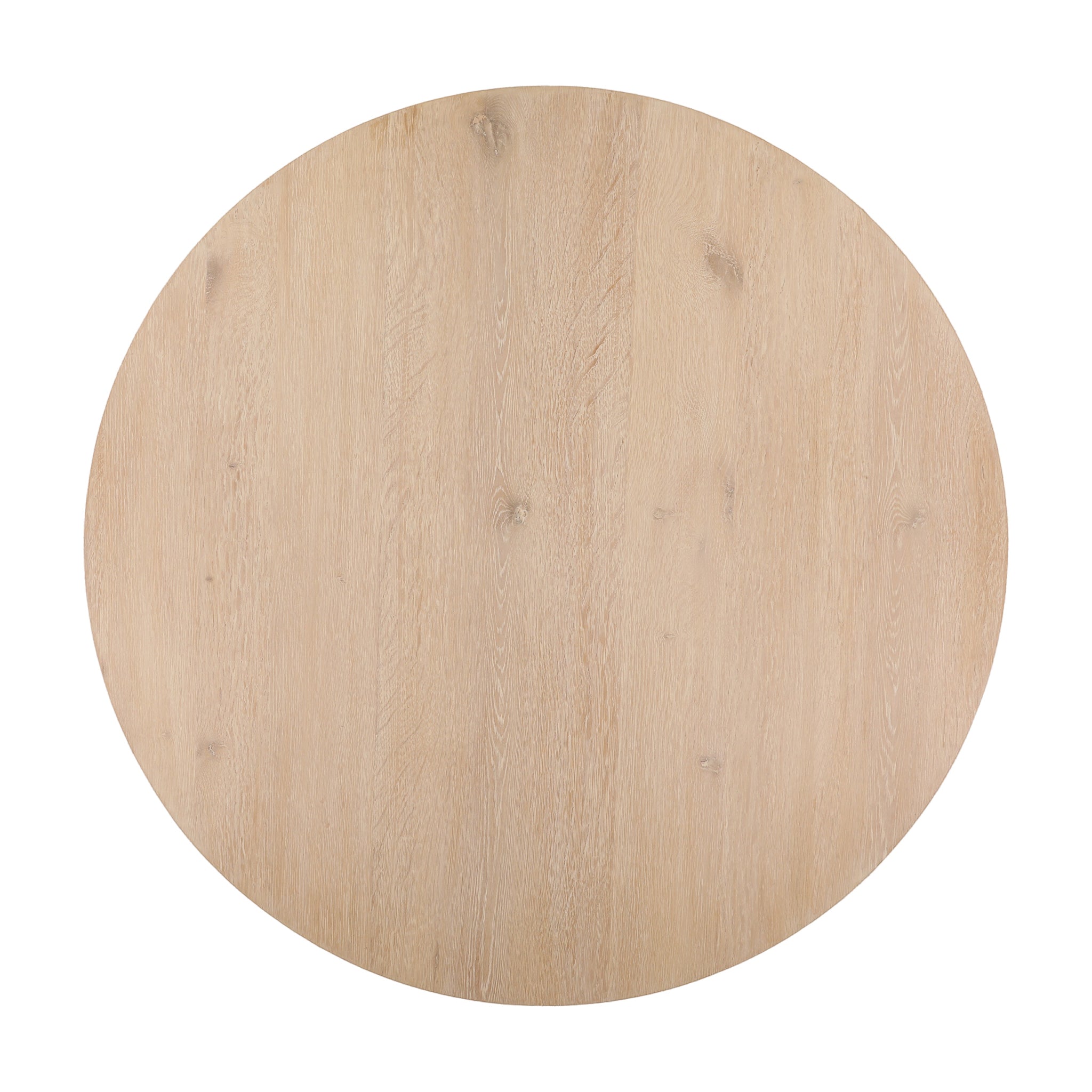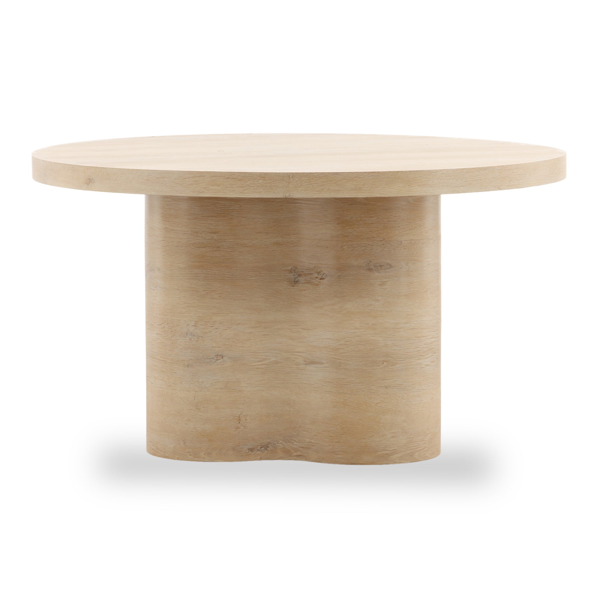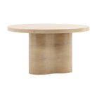 This striking round table is a celebration of organic modern design. The thick, smooth tabletop is beautifully supported by a unique, undulating pedestal base with a scalloped, fluted texture. Crafted from light, natural wood with a visible grain, this piece offers a perfect balance of clean lines and fluid form. It serves as a beautiful centerpiece for a dining room or a spacious living area.