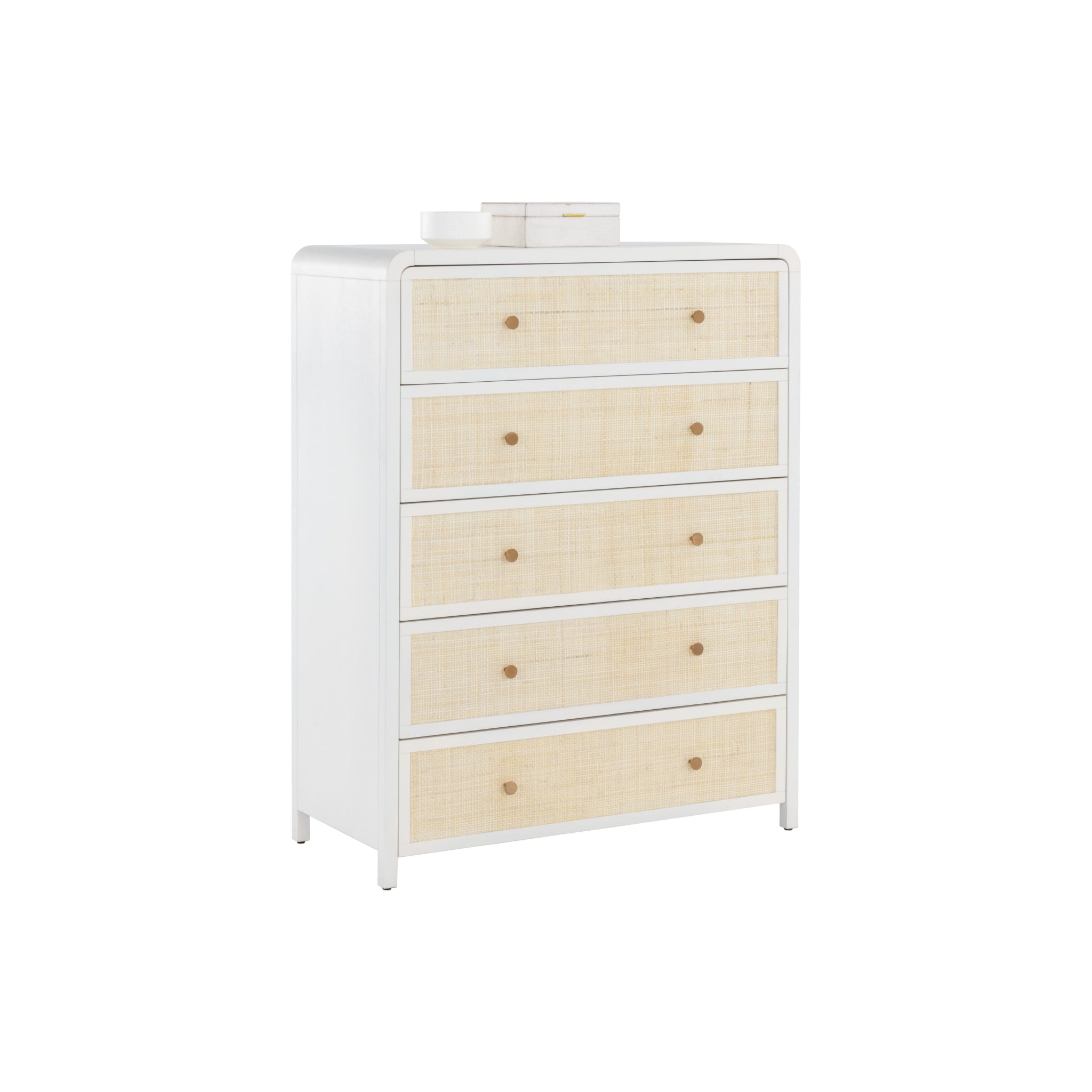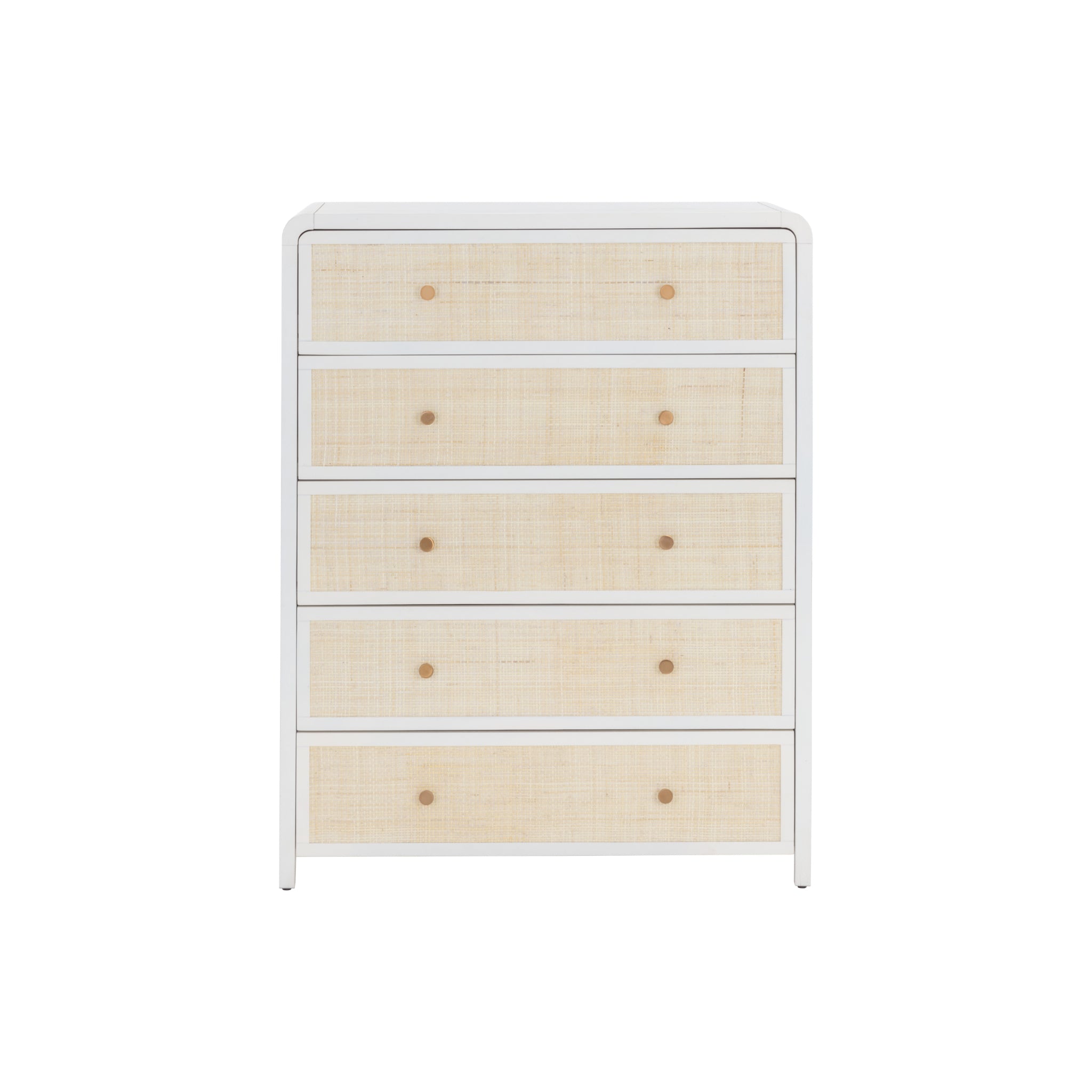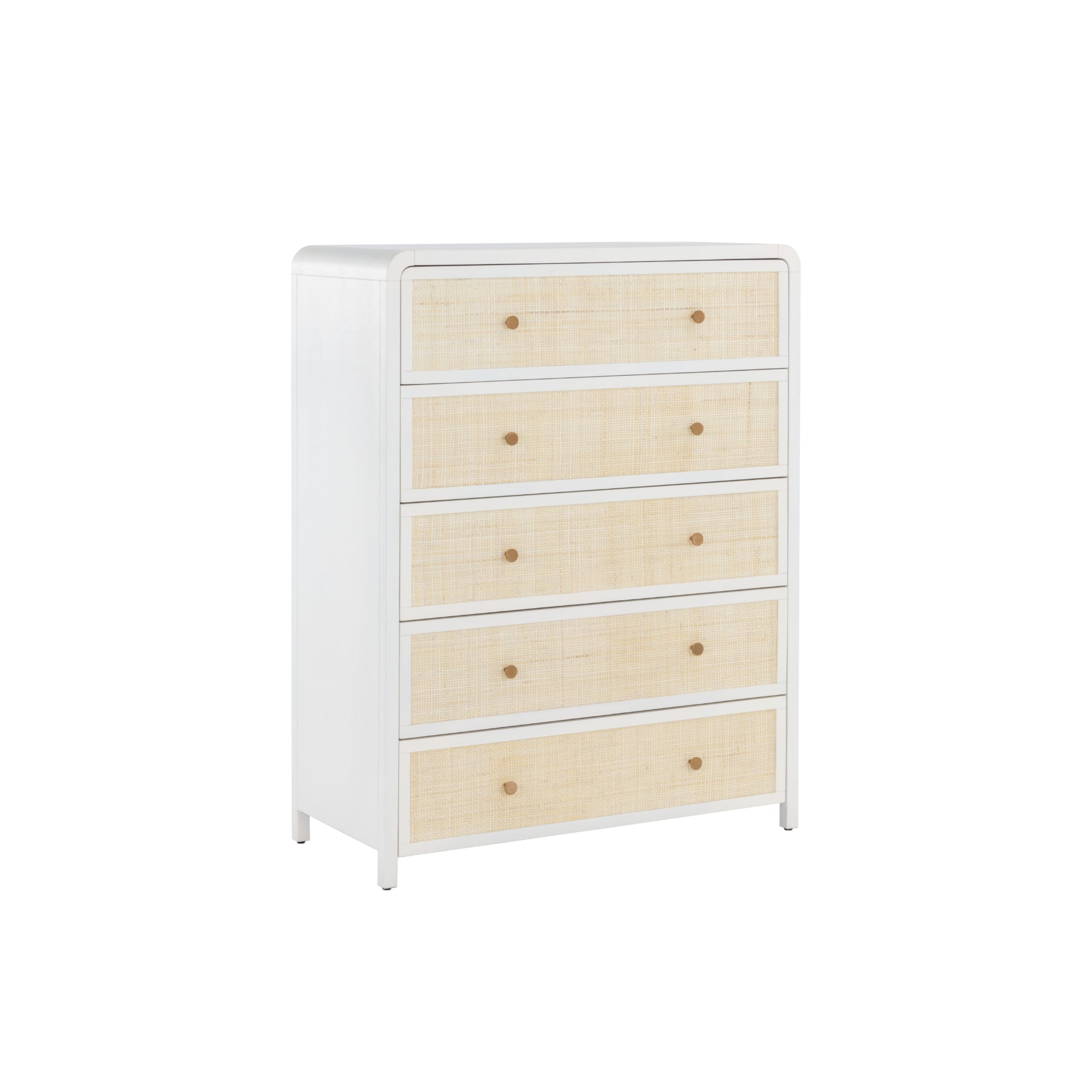 Boasting a stylish design with coastal influence, this beautiful chest features a clean-cut silhouette. Features an antique white wood frame with natural rattan detailing on five, spacious drawers. Completed with minted copper steel hardware. Handle With Care: This design has been crafted with rattan. This artisan-crafted material features intricate weaving that results in natural variations where no two pieces are alike. Colour and texture differences are to be expected and embraced with this natural material. Due to the weaving process used, the fibres in this material may display shorter or longer lengths where the weaving ends.