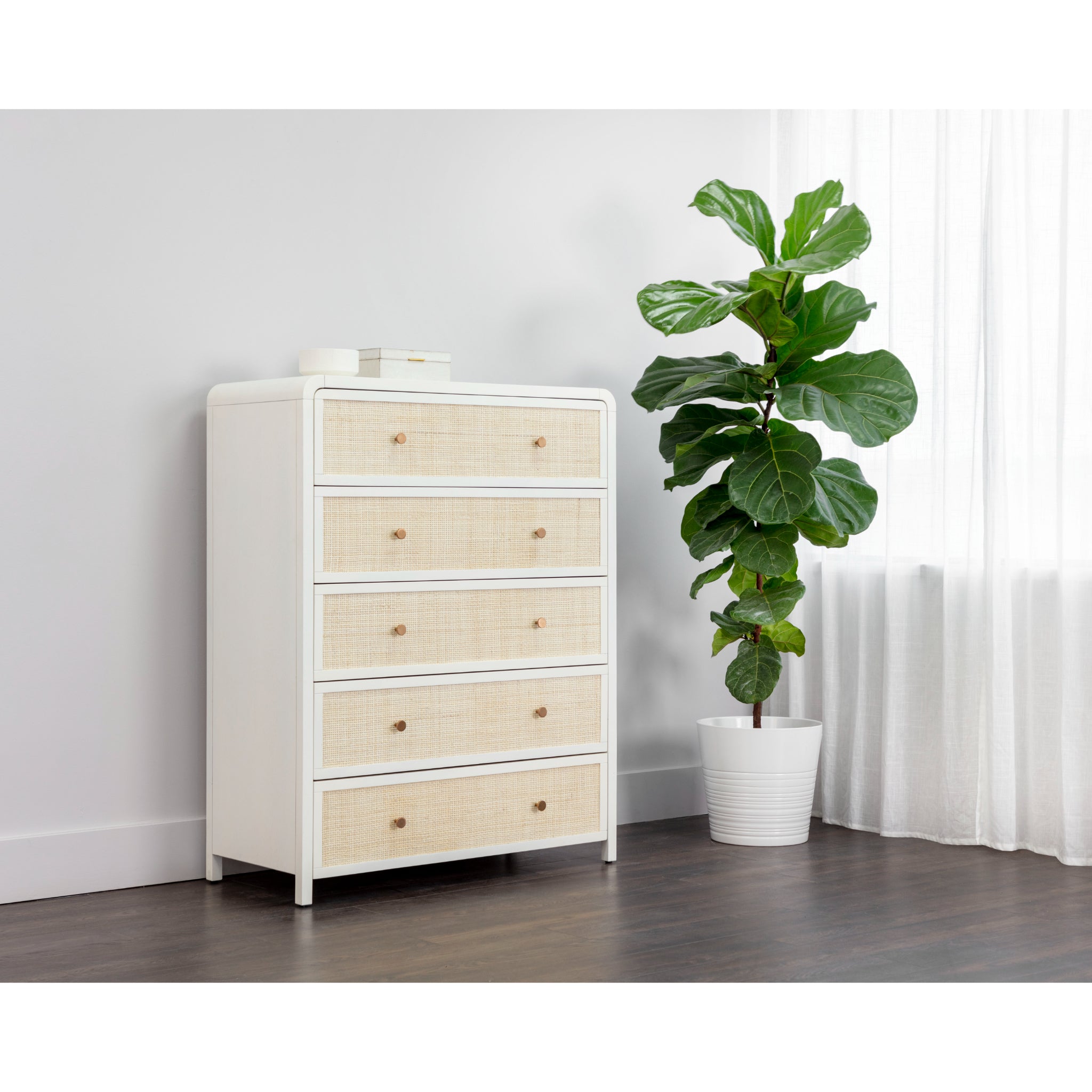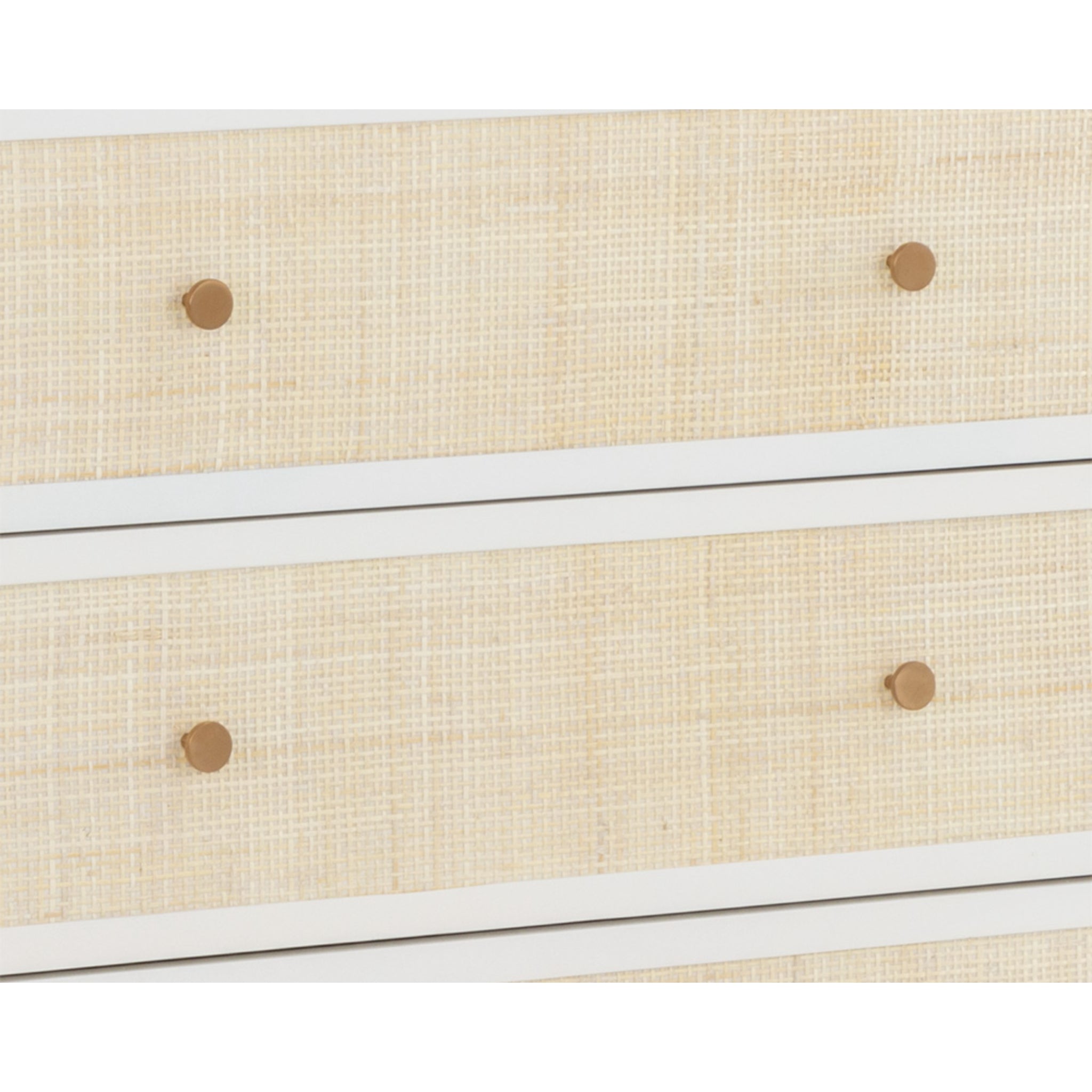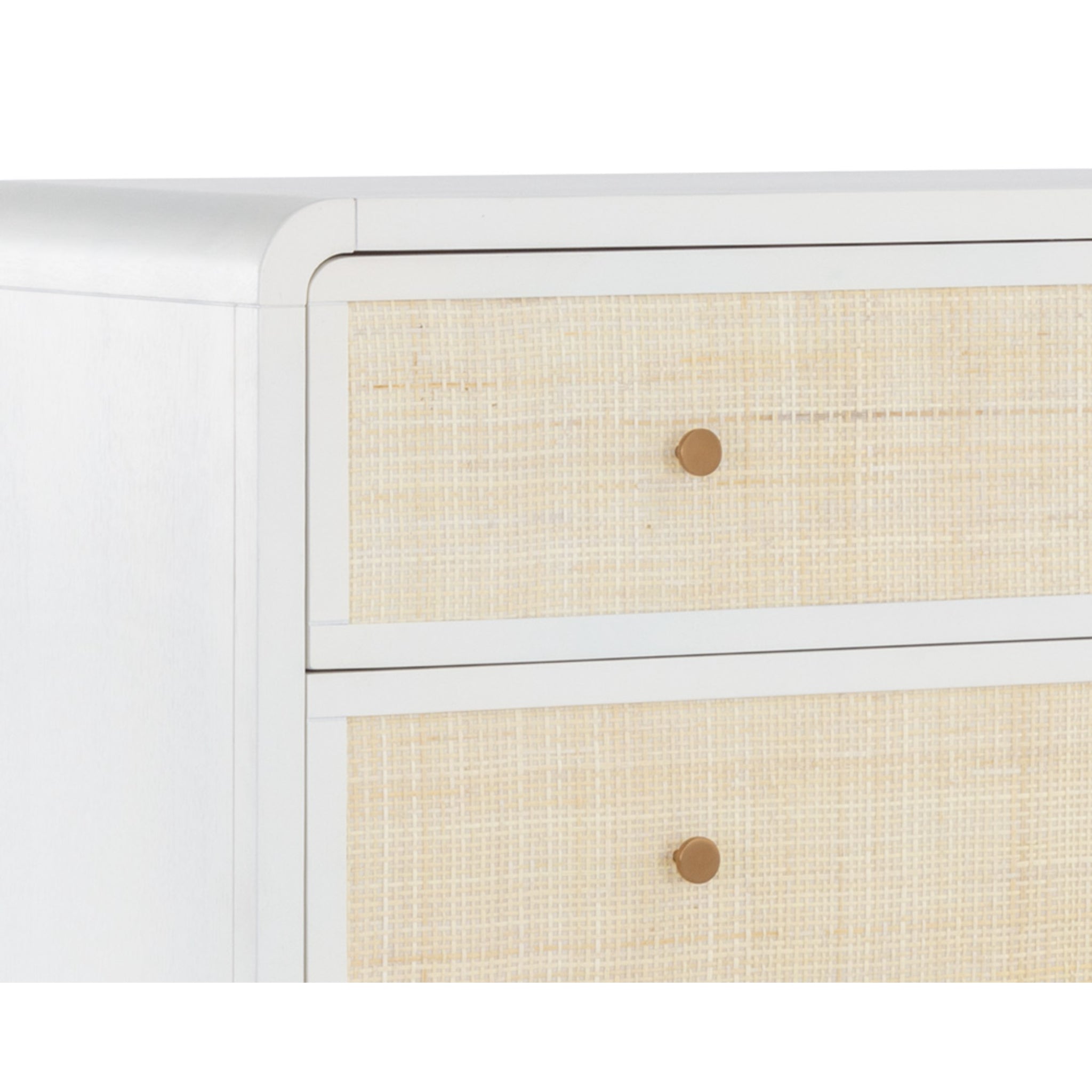 Boasting a stylish design with coastal influence, this beautiful chest features a clean-cut silhouette. Features an antique white wood frame with natural rattan detailing on five, spacious drawers. Completed with minted copper steel hardware. Handle With Care: This design has been crafted with rattan. This artisan-crafted material features intricate weaving that results in natural variations where no two pieces are alike. Colour and texture differences are to be expected and embraced with this natural material. Due to the weaving process used, the fibres in this material may display shorter or longer lengths where the weaving ends.
