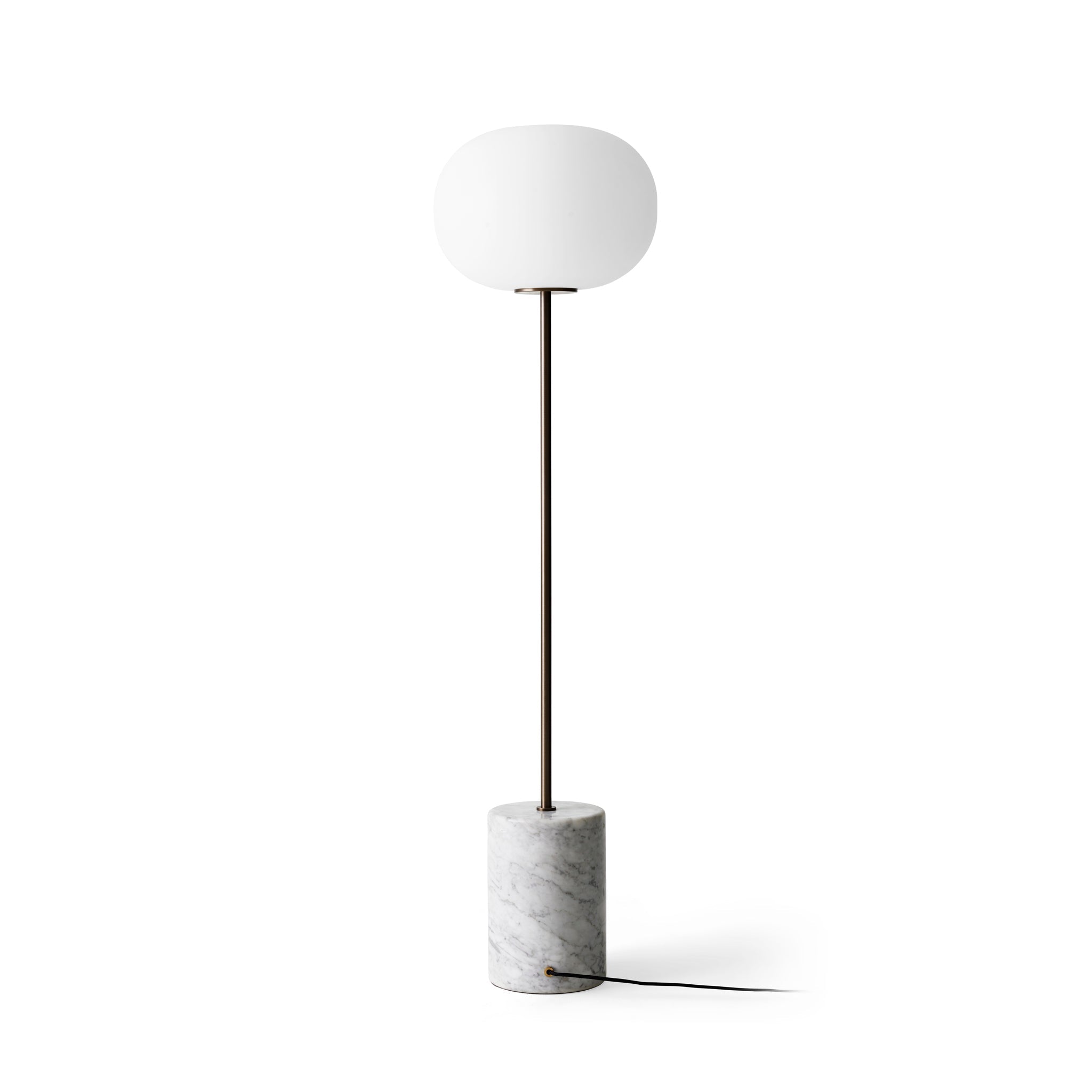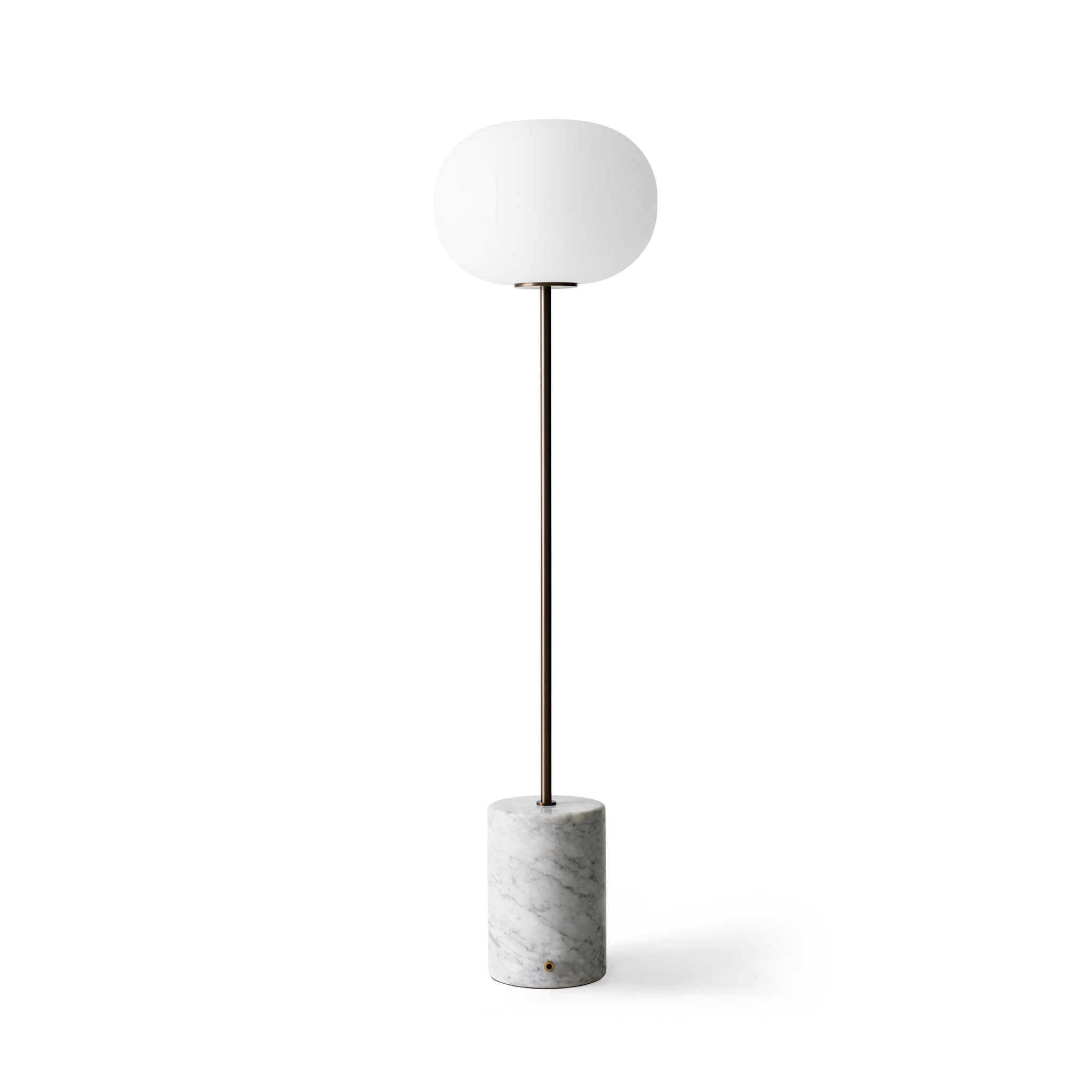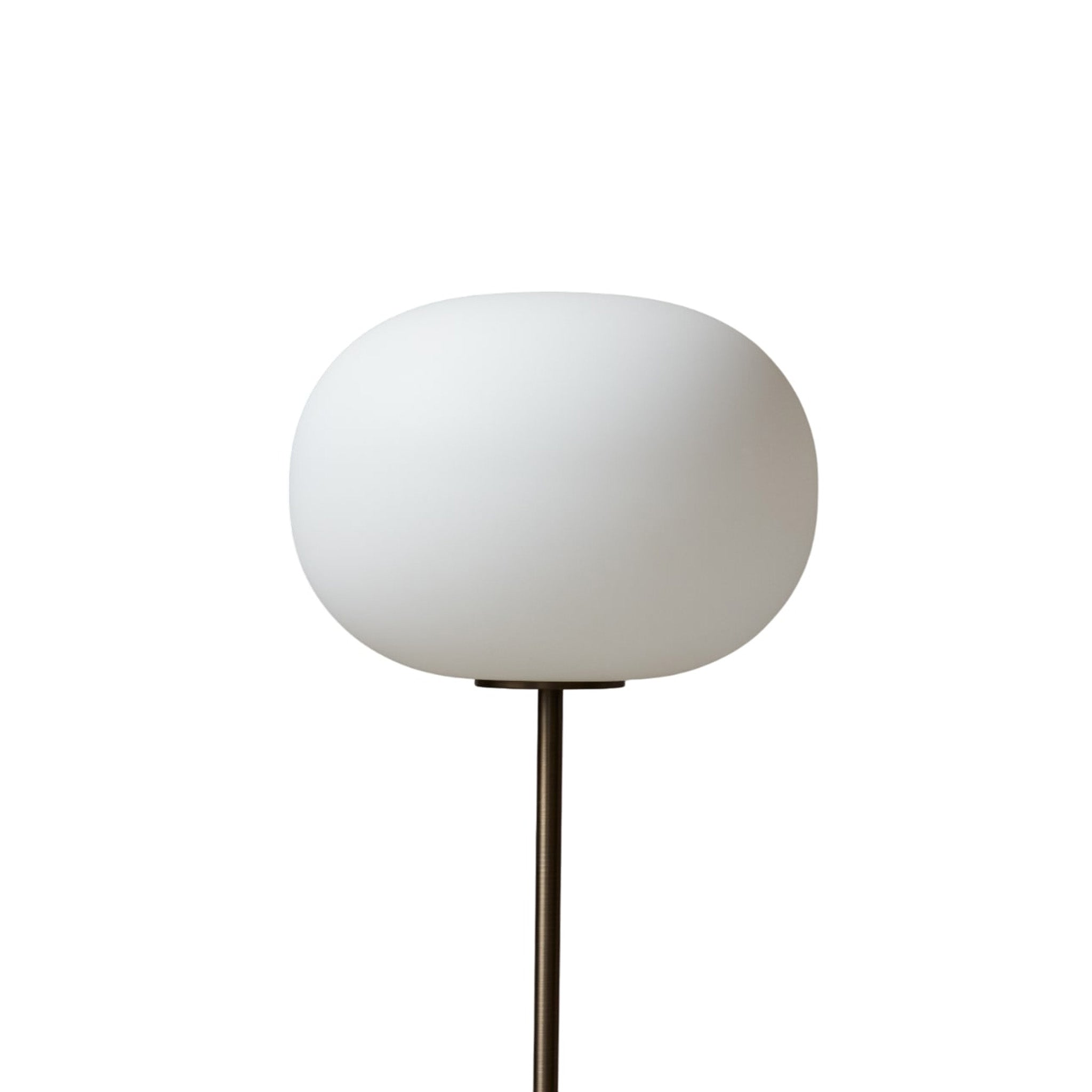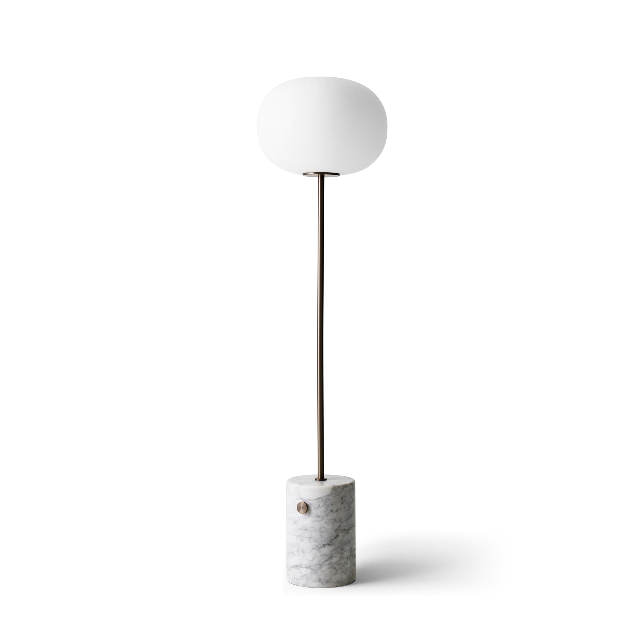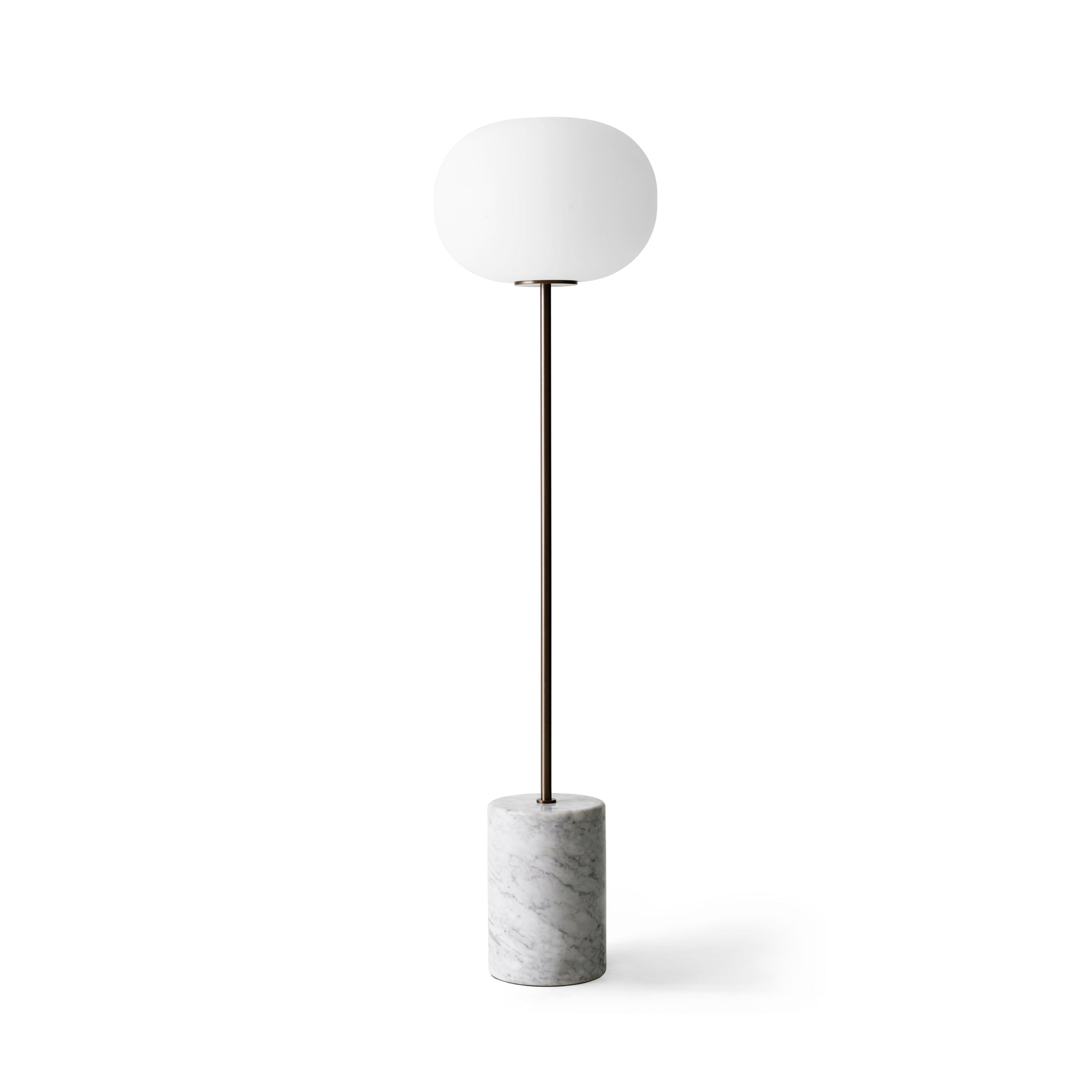 JWDA Floor Lamp is a refined, standalone design that merges contrasting elements to elegant effect. Set on a stem of powder-coated steel or solid brass, the shade is formed from opal glass into an elliptical shape, while the base retains its characteristic rounded form, available in either two types of marble or red travertine stone, each with unique veining and inclusions. A brushed or bronzed brass dimmer switch lets you control the brightness of the bulb - for reading or relaxing, or simply to create ambience in a room.
