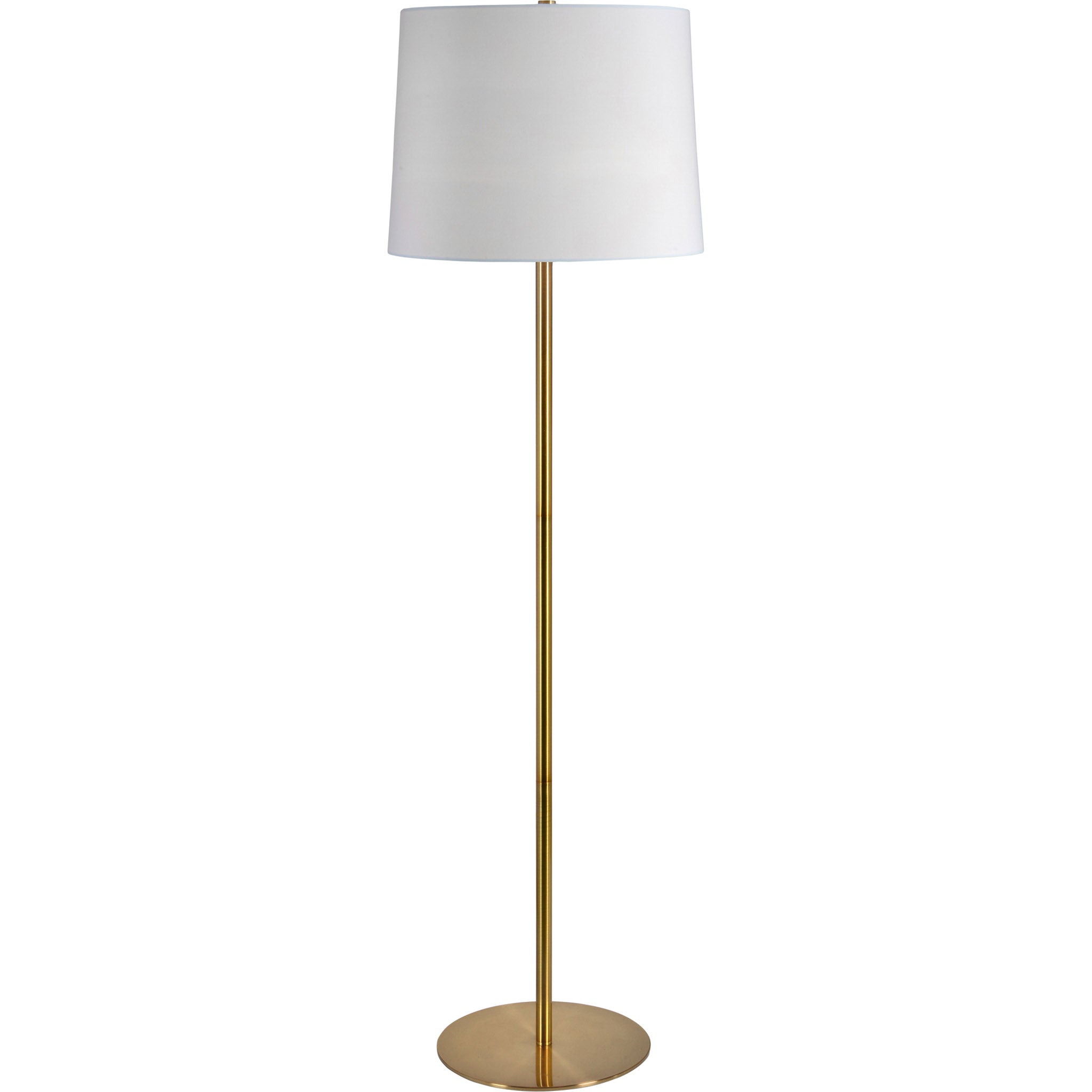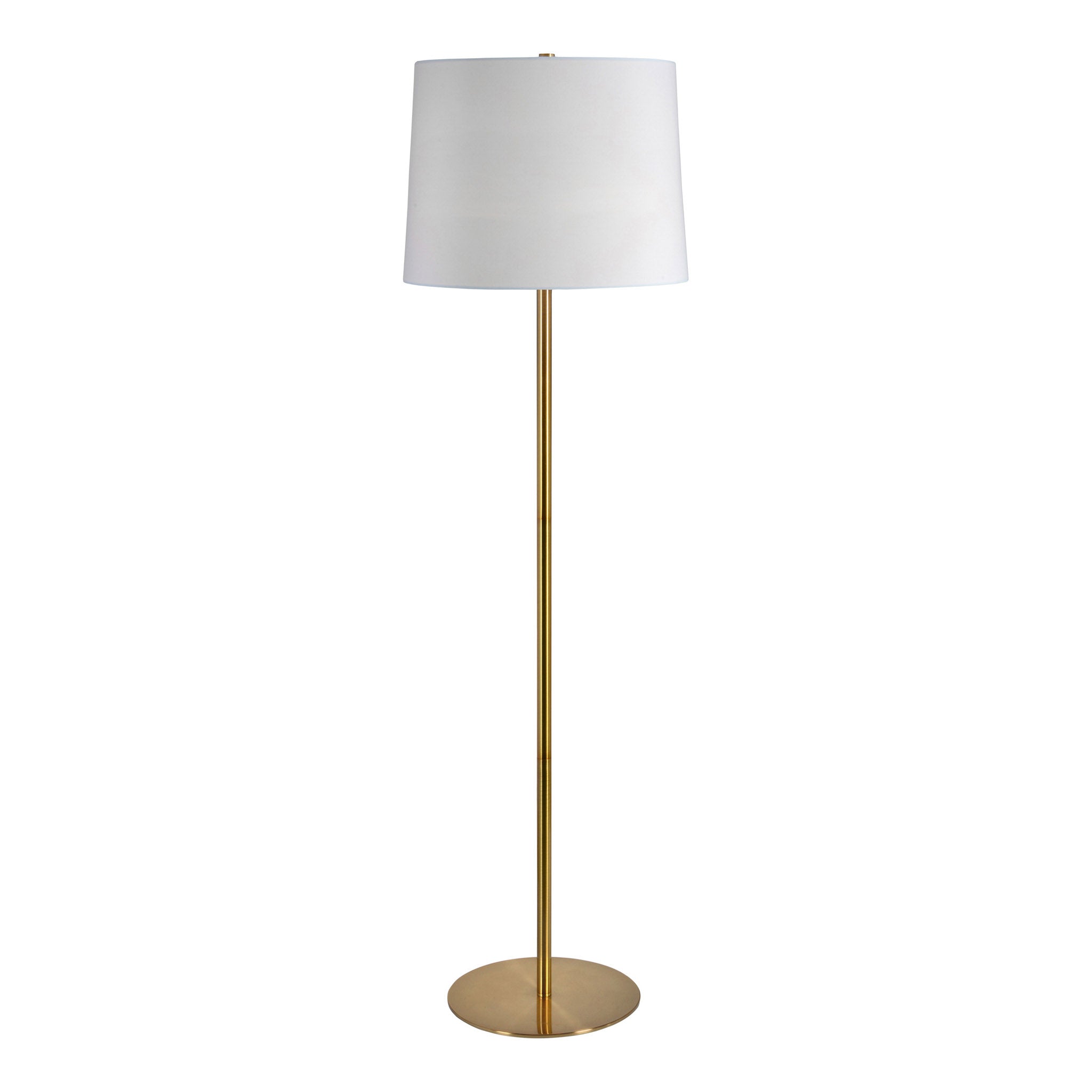 The understated silhouette of this modern floor lamp is simple, yet subtly chic. The modest lines of the lamp base boast a slim Iron stem centered by a circular metal stand. Topped with a clean white cotton drum lampshade, the decorative light fixture is plated with an antique brass finish that adds a glamorous element to everyday furnishings.