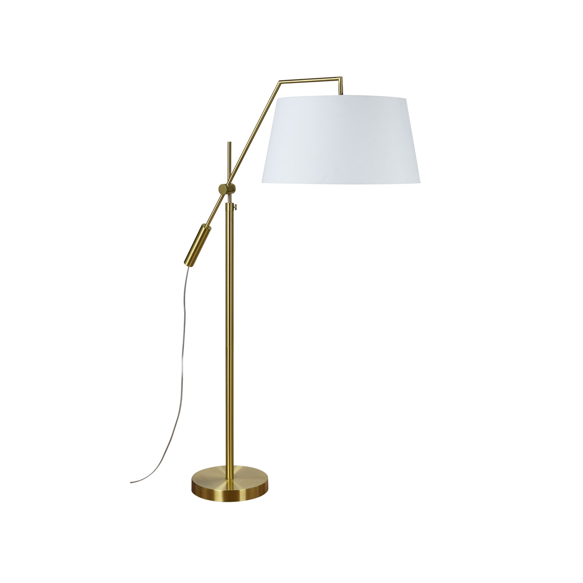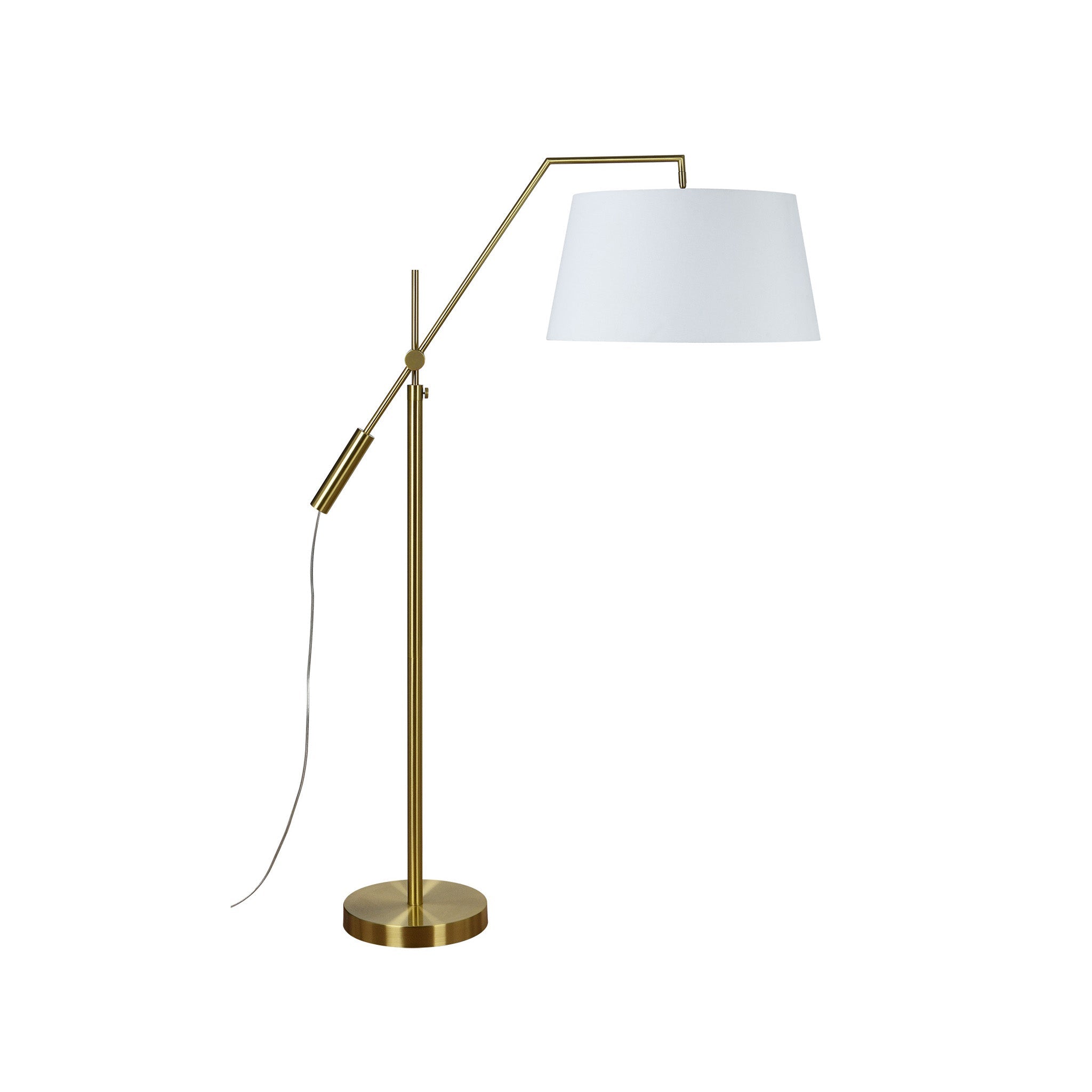 Traditional construction gets a stylish makeover in this floor lamp design. An optimal fit for a living room or home office, the arching structure of this piece makes it ideal to set near a sofa or desk. With a satin brass finish and crisp white shade, this floor lamp pairs equally well with neutral tones as it does vibrant hues and printed wallpaper.