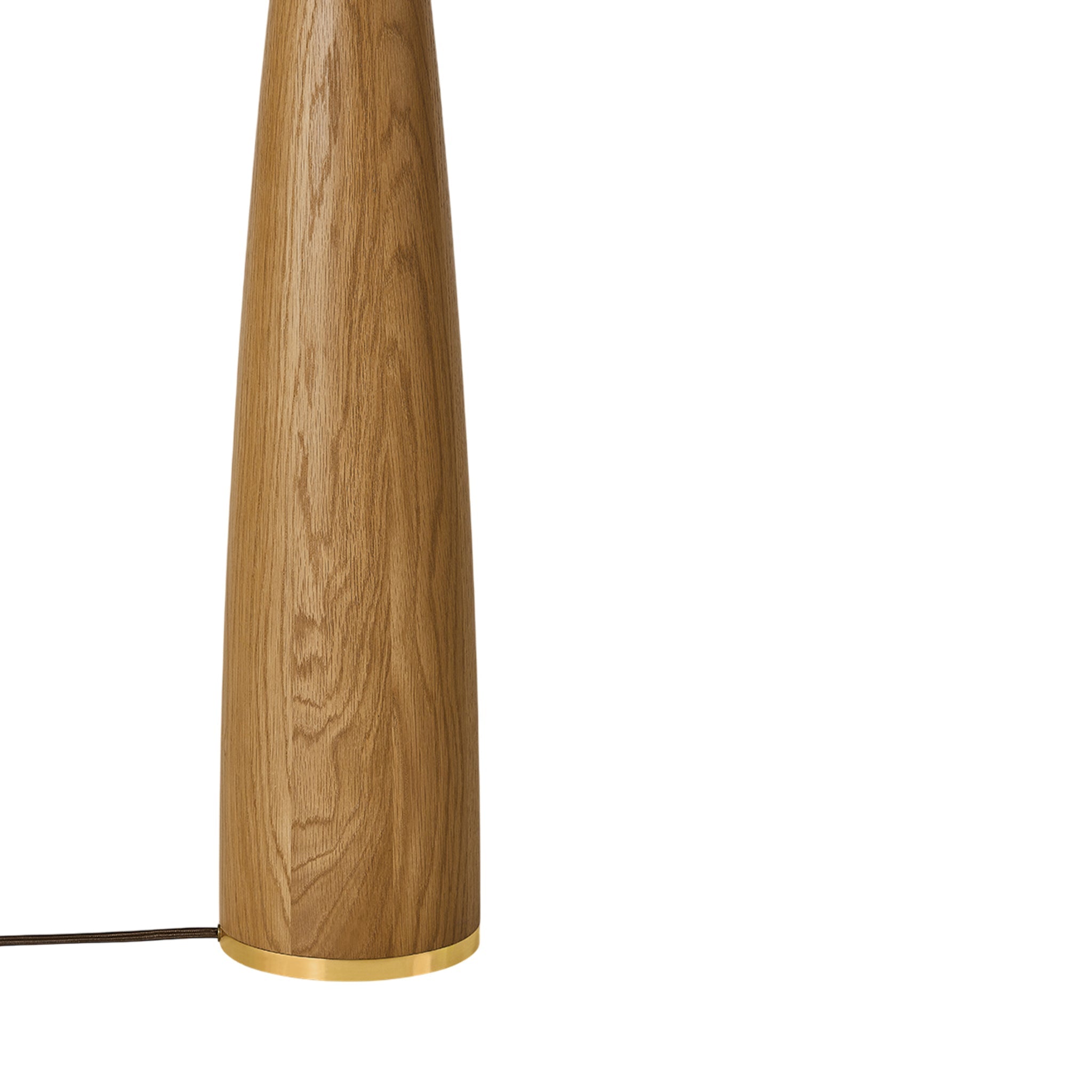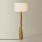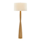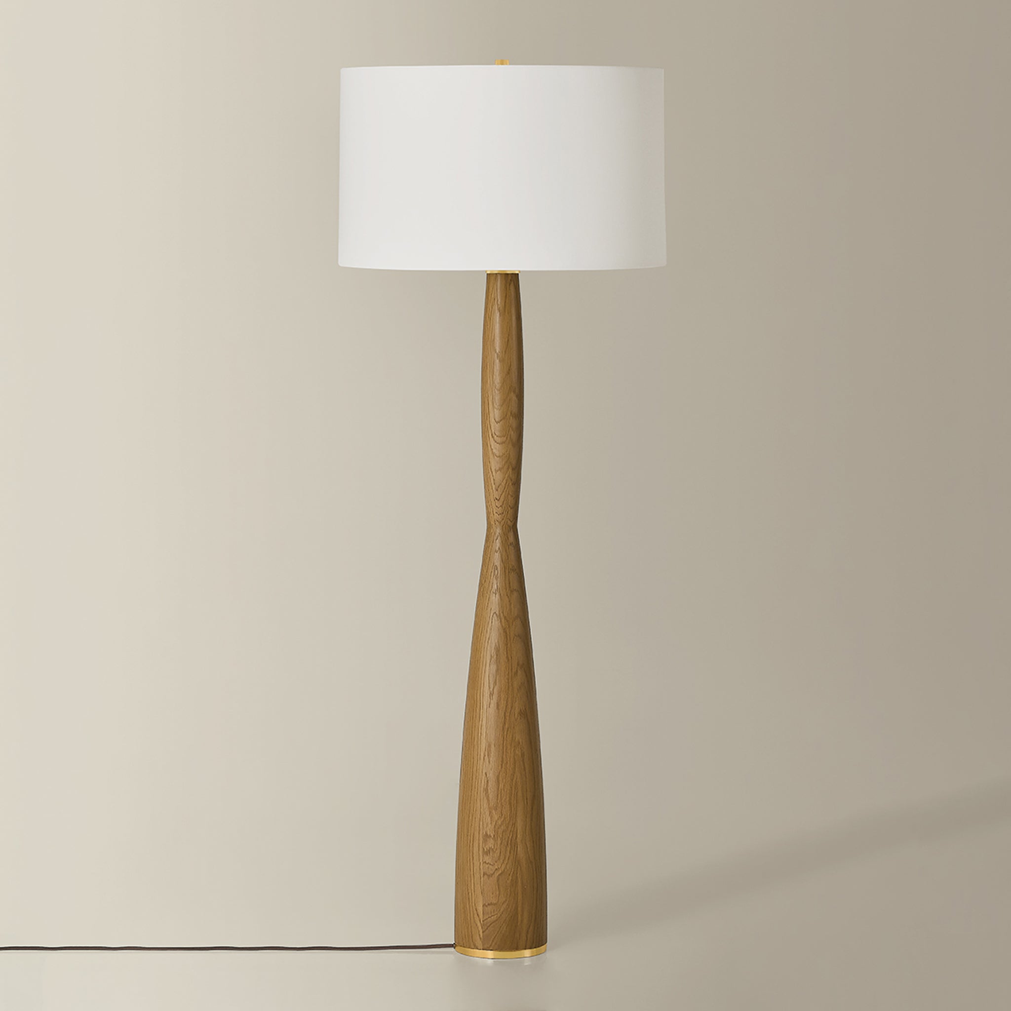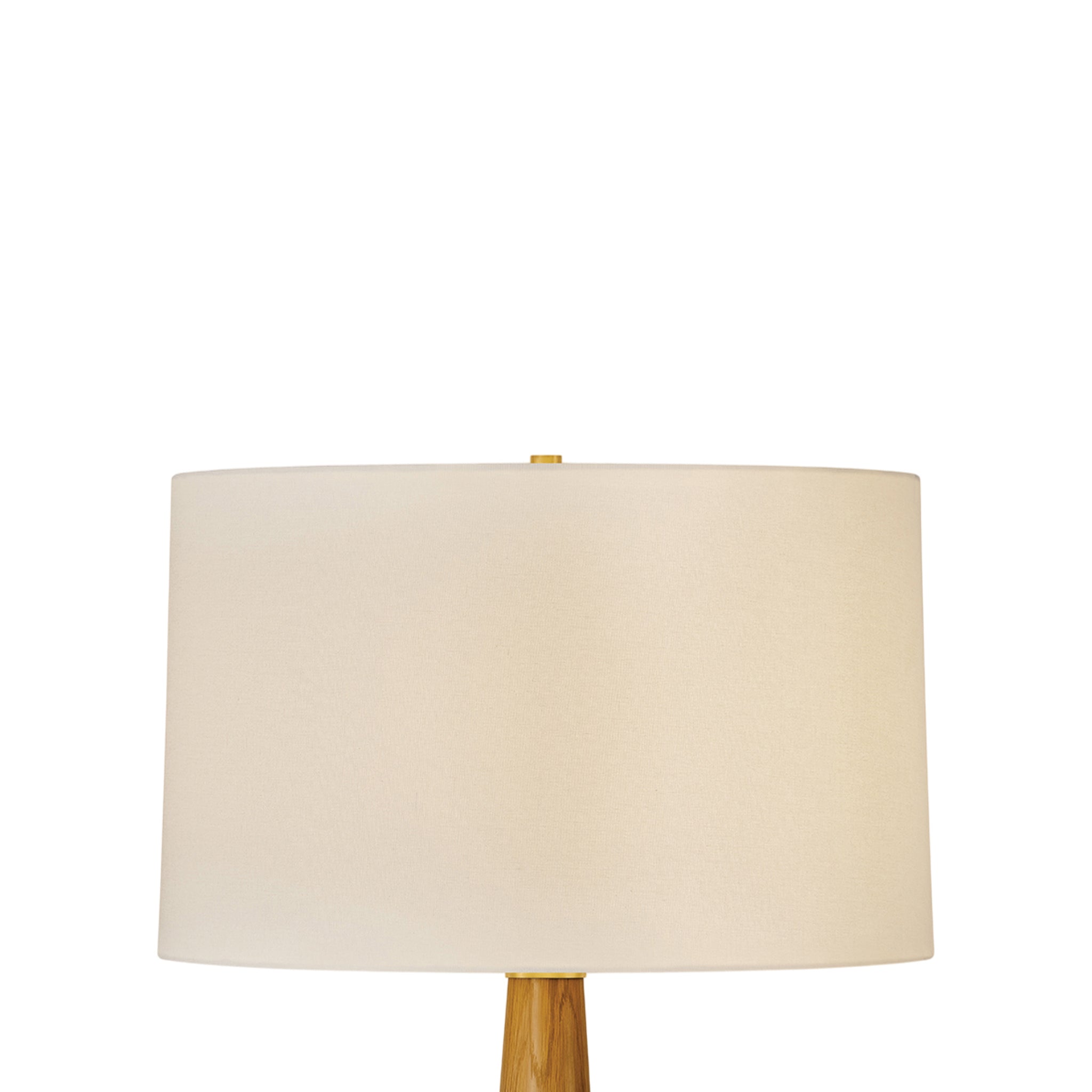 Streamlined and statuesque, the mid-century silhouette of the Somers Chase floor lamp has been hand-carved from natural wood. The light oak base tapers inwards at the middle, creating a point of interest. A large crisp white linen drum shade complements the wood, while an Aged Brass finish on the hardware adds an element of shine at the base.