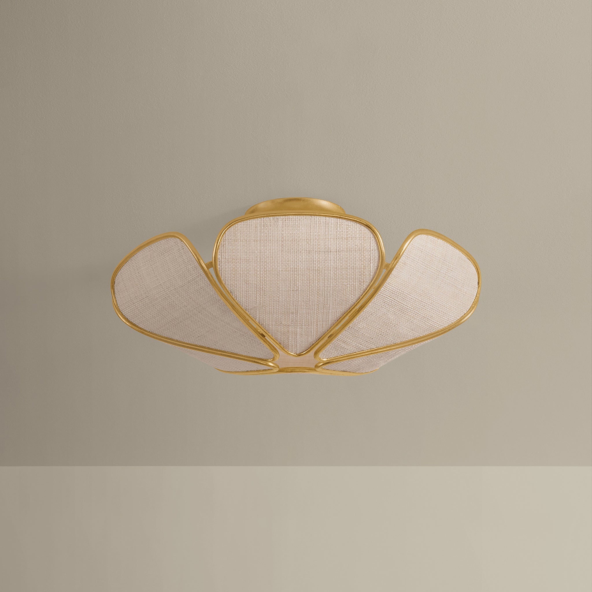 Inspired by Art Nouveau designs, the Bayville family uses natural materials to create flowing botanical silhouettes. The breezy Saguran fabric shade is constructed of petal-like panels edged in Vintage Gold Leaf and lined with abaca. Available as a semi-flush and a pendant in two sizes, Bayville will breathe new life into any space.