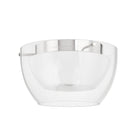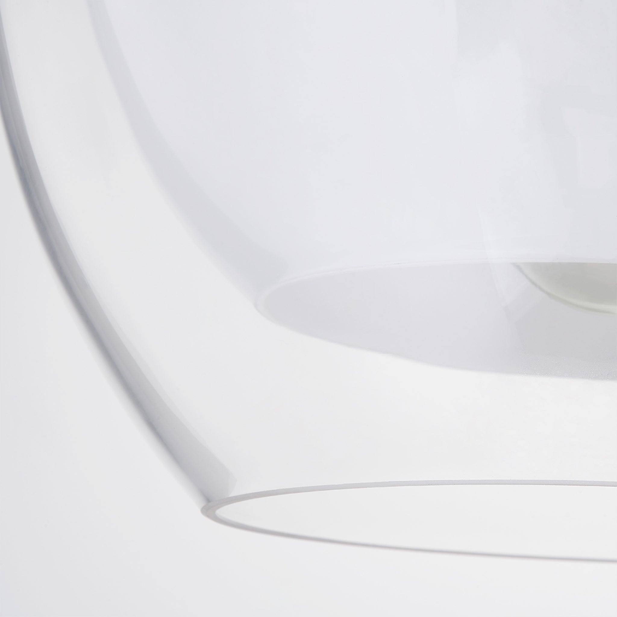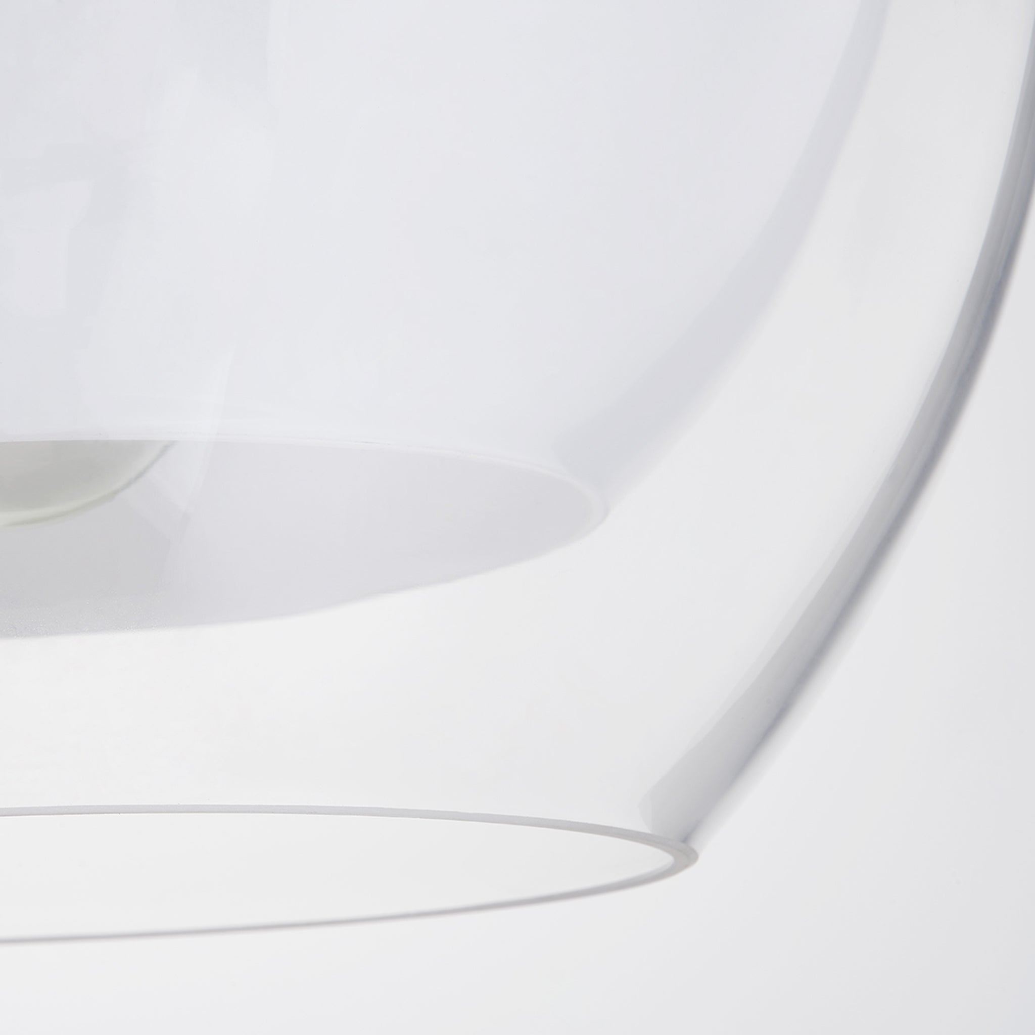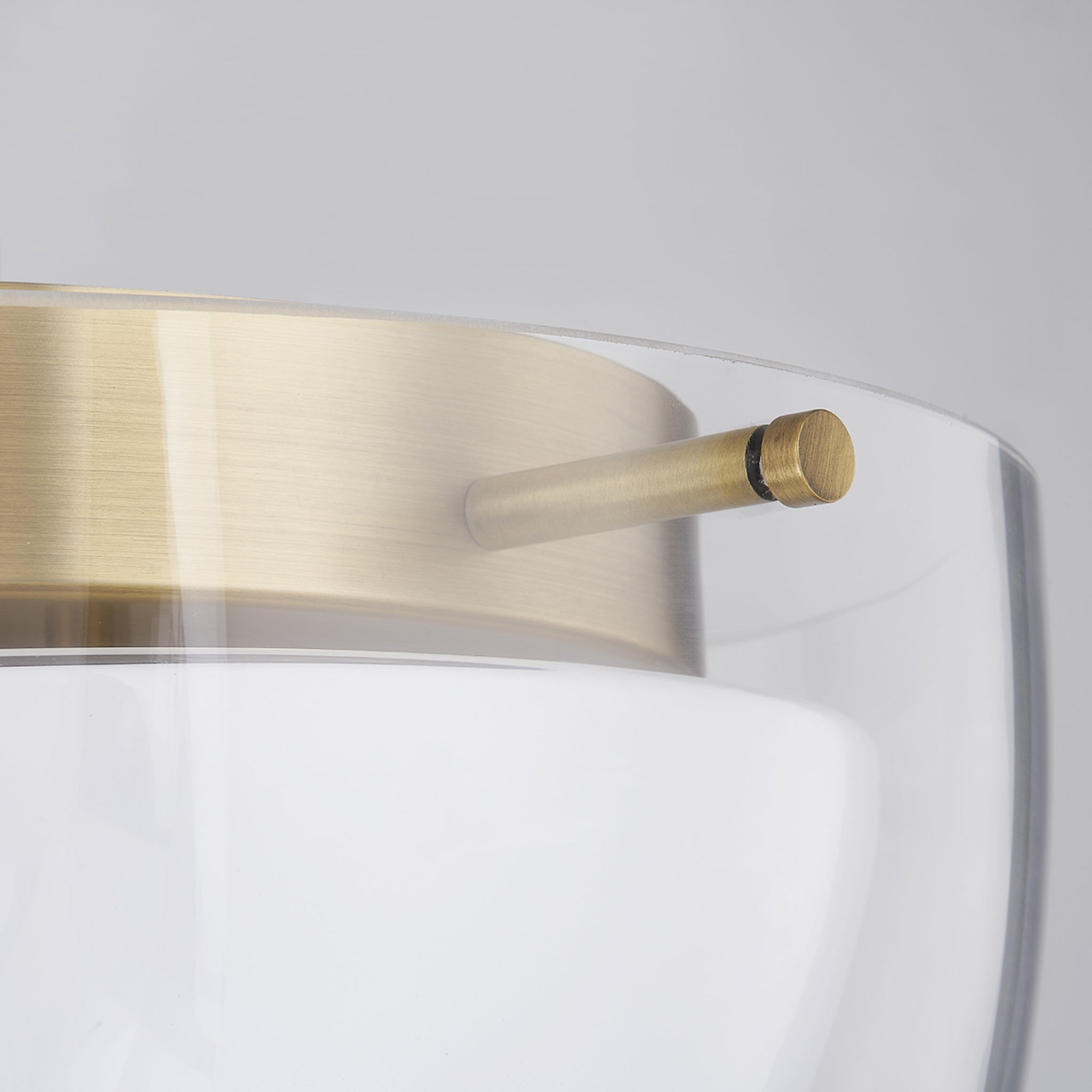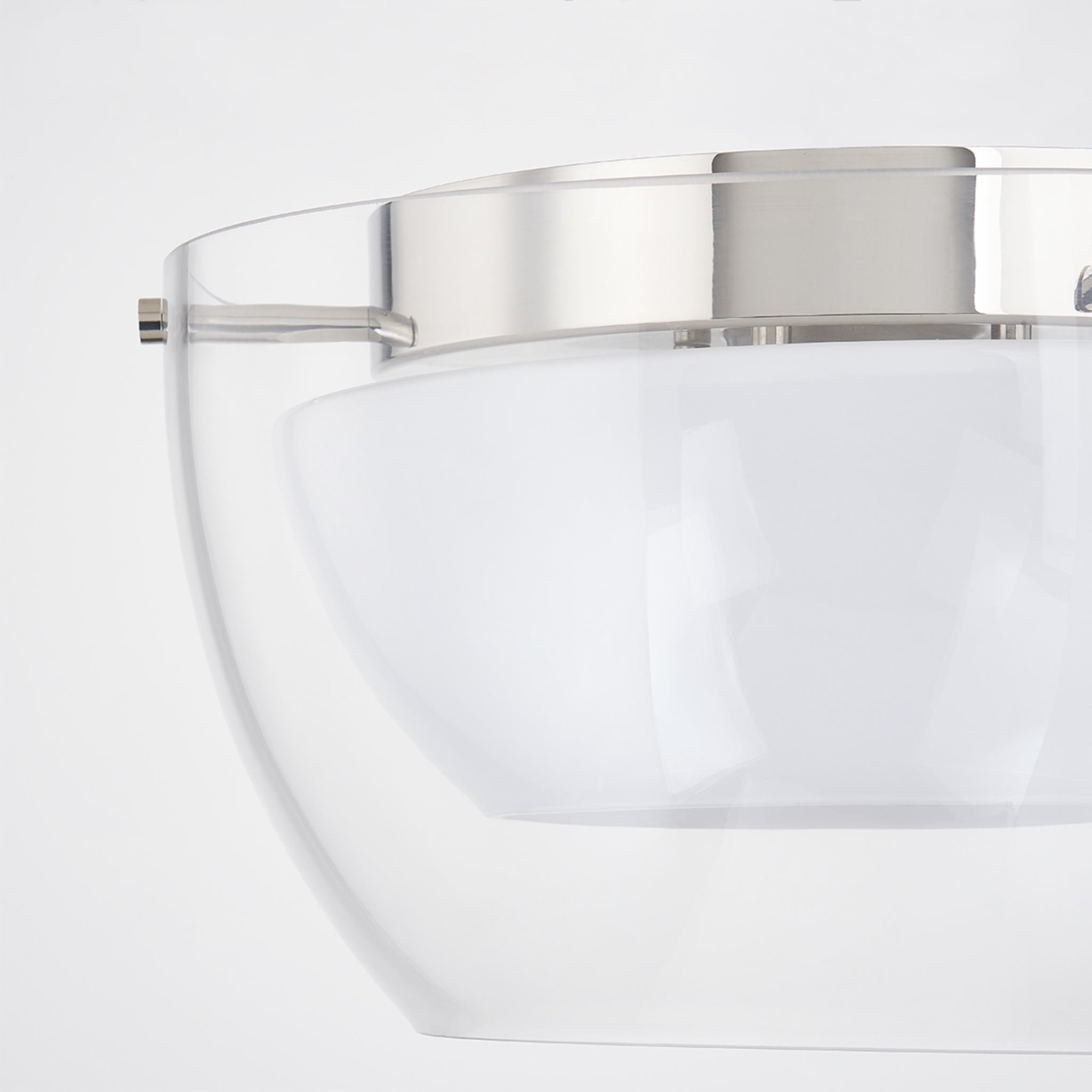 A smooth opal glossy glass shade and metal collar in Polished Nickel or Patina Brass are enclosed within a similarly shaped thick clear glass for a sophisticated layered look that makes this modern flush mount stand out. Openings in both the shade and the covering allow light to flow freely.