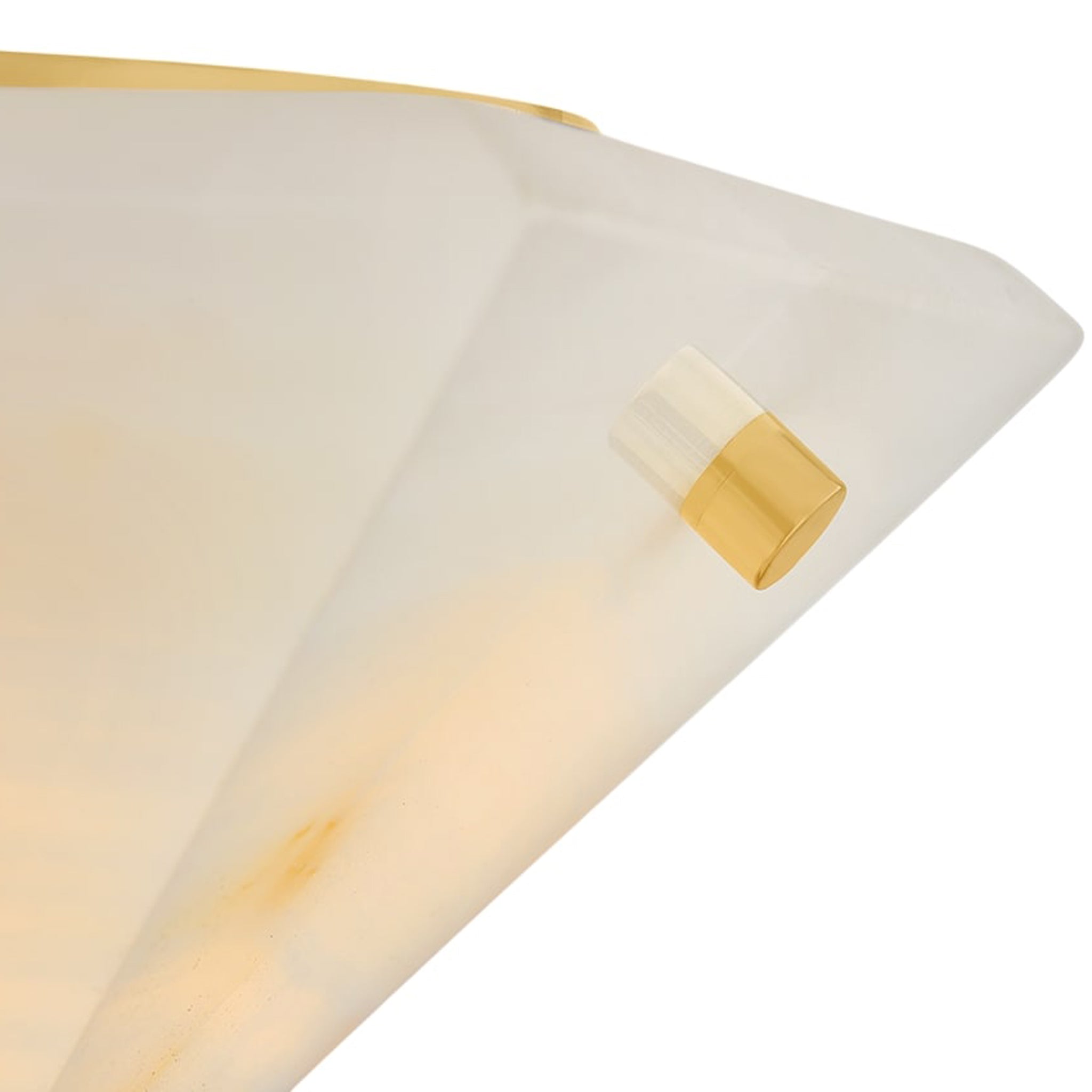 Geo is defined by its quiet strength and sculptural clarity. Glowing panels of honey onyx are book matched to reveal mirrored veining-an artisanal detail more often seen in luxury surfaces than lighting. The symmetry of the stone takes center stage, framed by clean, minimal metalwork in Vintage Brass that amplifies its natural elegance. Available as a 1-light wall sconce in two shapes and sizes, as well as a 1-light flush mount, Geo offers a soft, grounded glow that feels both bold and restrained. Its graphic silhouette and elemental beauty lend structure and visual rhythm to interiors. Moniomi for Corbett Lighting.