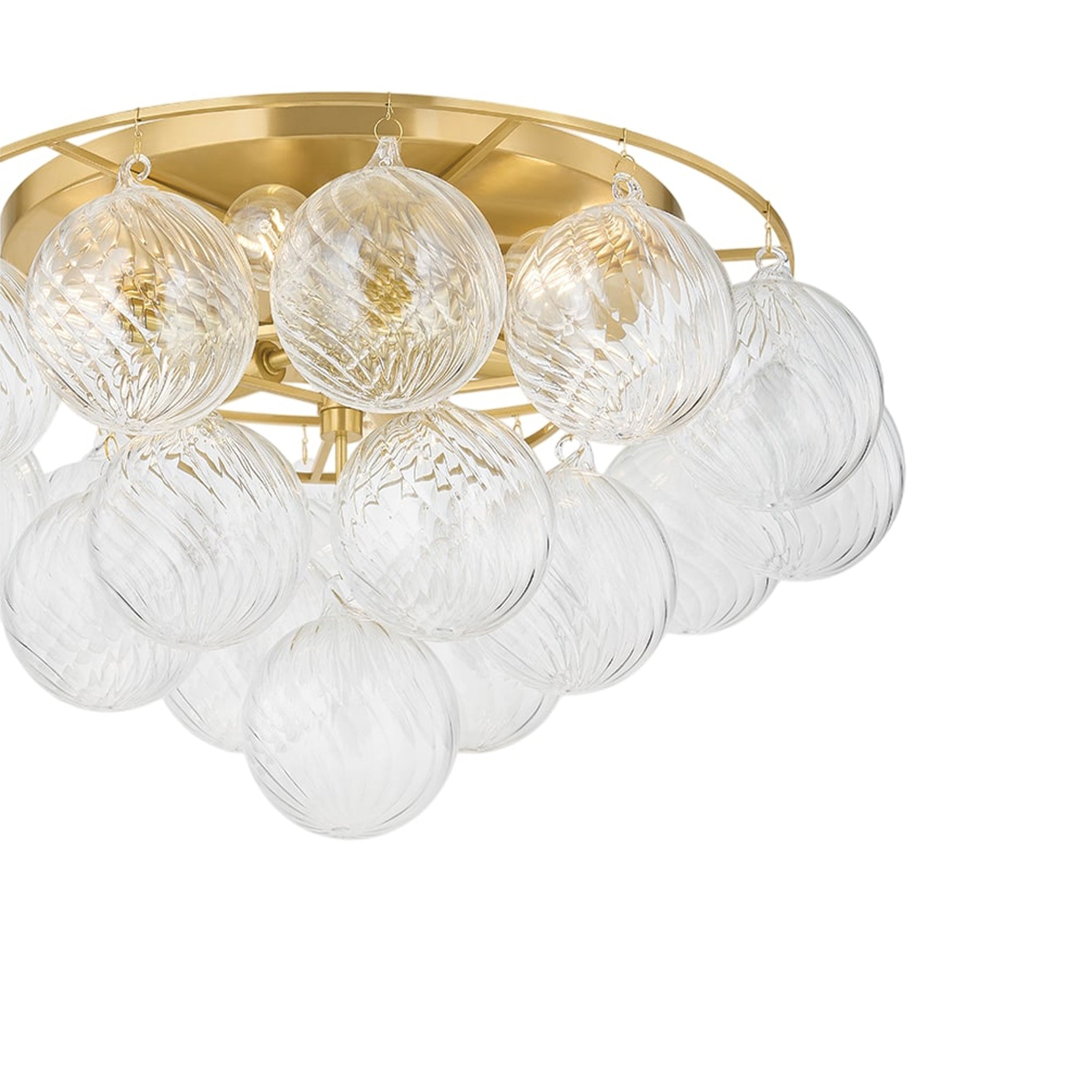 Swirl-ribbed or plated champagne glass globes dangle from an Aged Brass frame, creating this cloud-like showstopper. Whether you're dressing up a breakfast nook with the small chandelier, adding a soft glow to an entryway with the flush mount, or making a glam statement in your dining room with the large chandelier, the possibilities for Mimi are endless. Megan Molten for Mitzi Lighting.