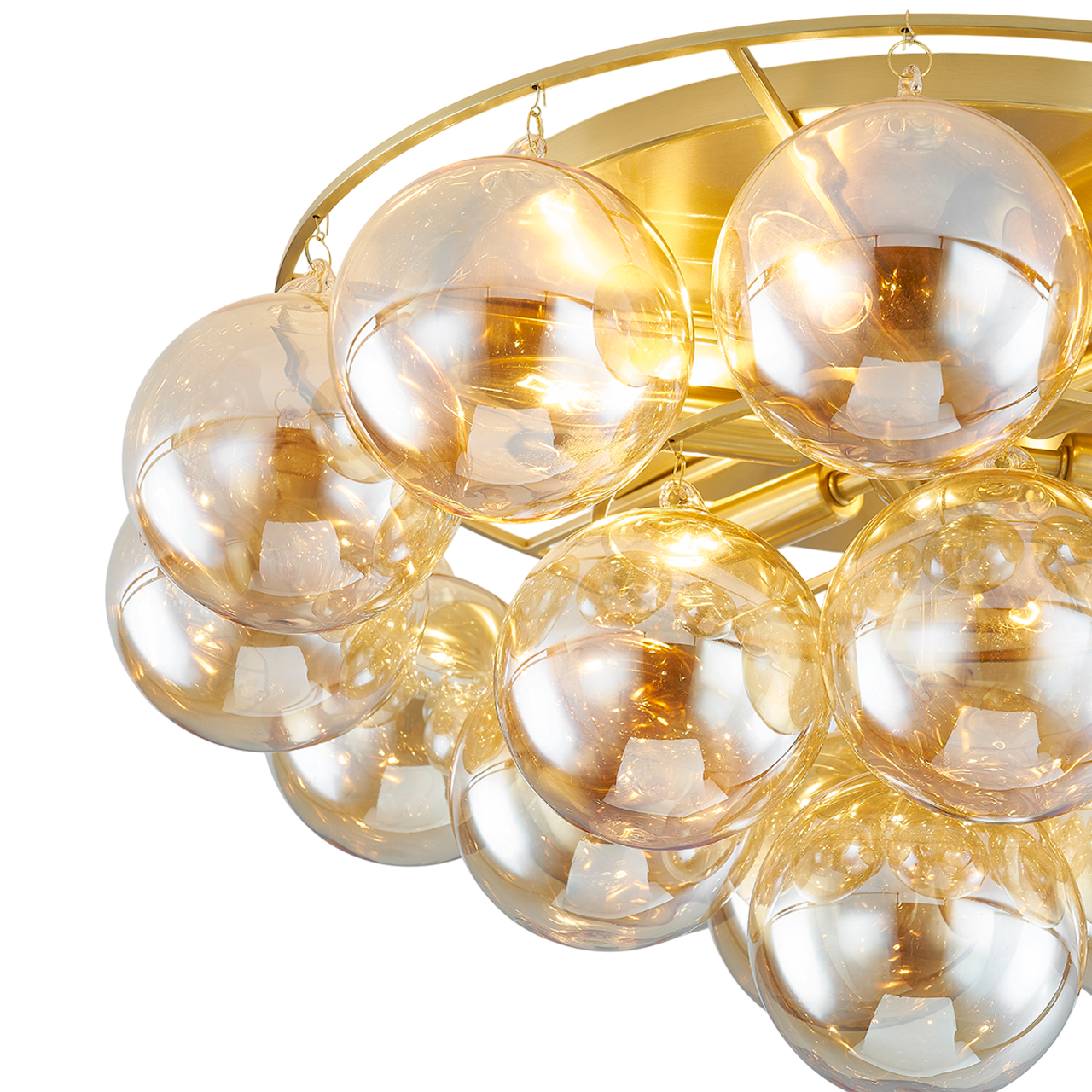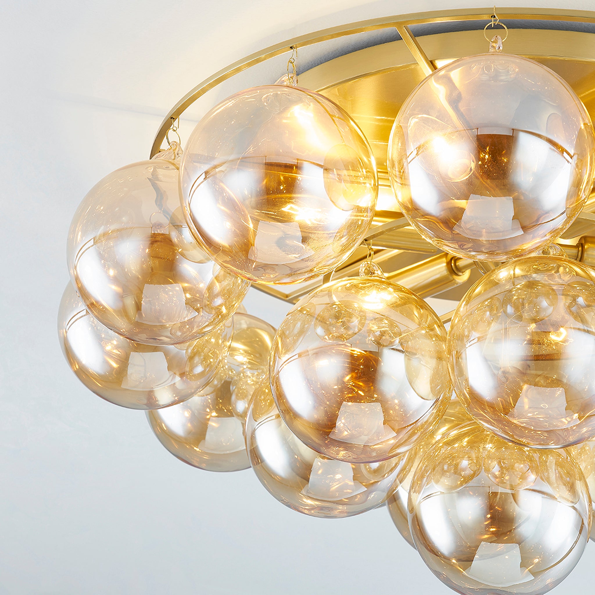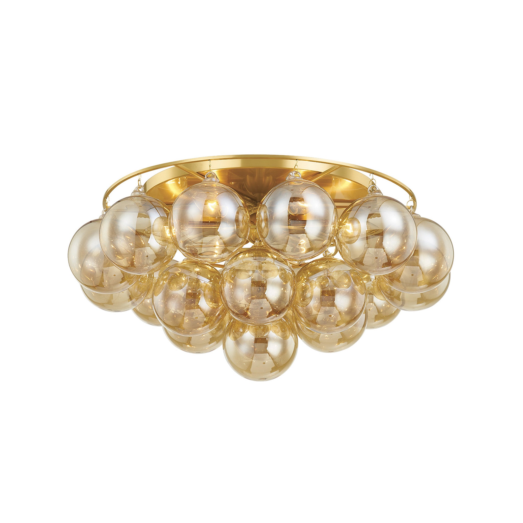 Swirl-ribbed or plated champagne glass globes dangle from an Aged Brass frame, creating this cloud-like showstopper. Whether you're dressing up a breakfast nook with the small chandelier, adding a soft glow to an entryway with the flush mount, or making a glam statement in your dining room with the large chandelier, the possibilities for Mimi are endless. Megan Molten for Mitzi Lighting.