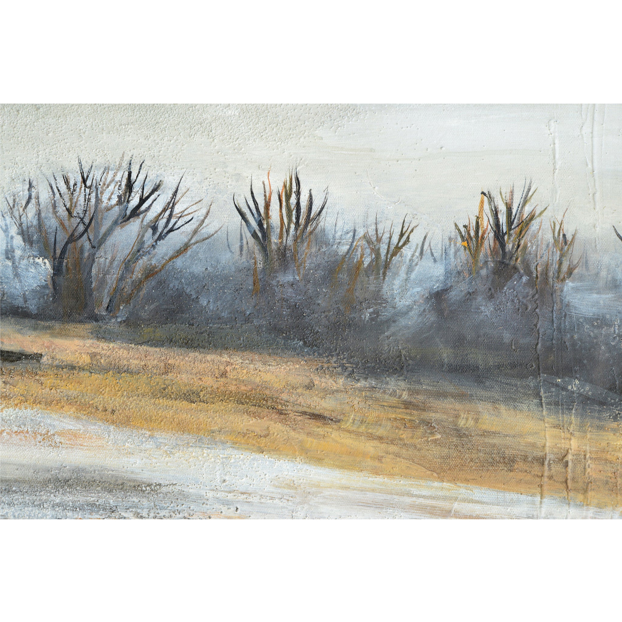 The Daniel Canvas showcases the mystical, elegant visual of a forest in the fog, the hand-painted texture brings the look to life. The thin grey frame intensifies the dark focal features of the art.
