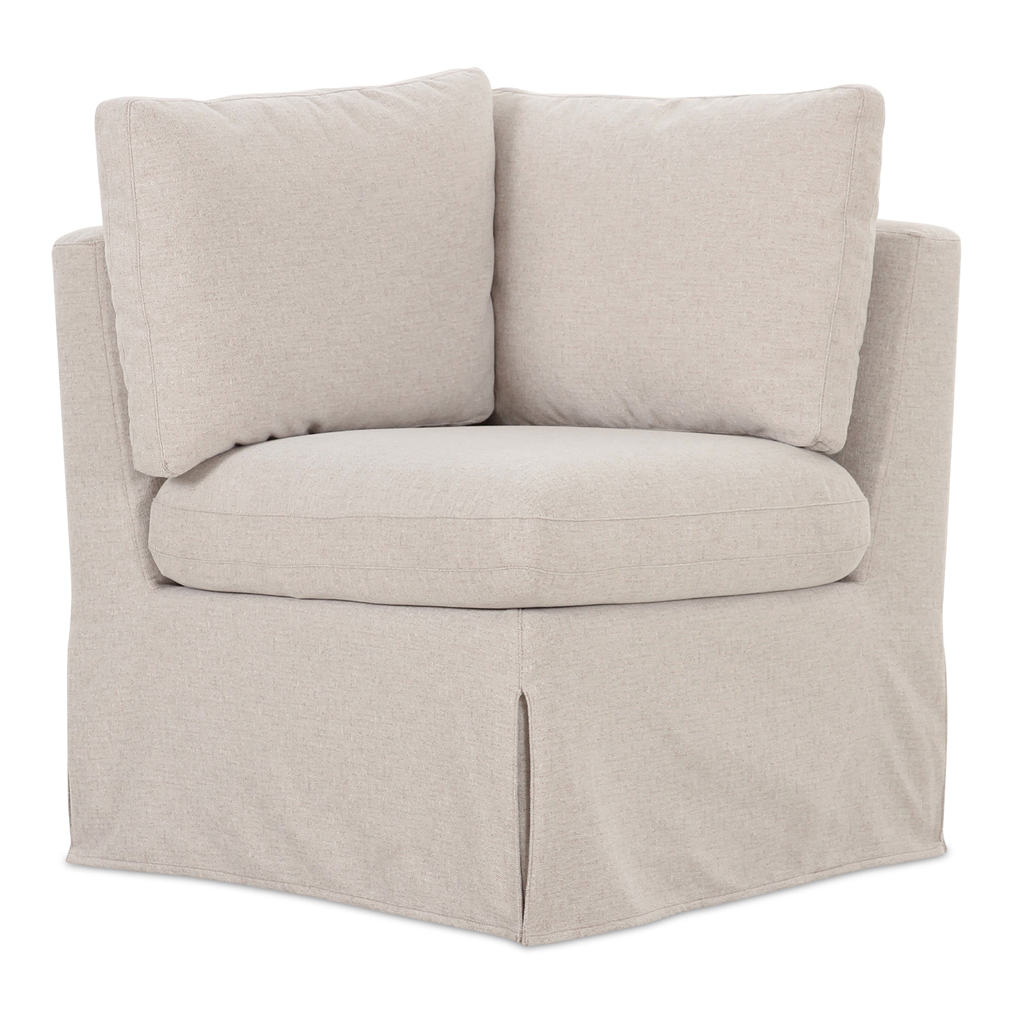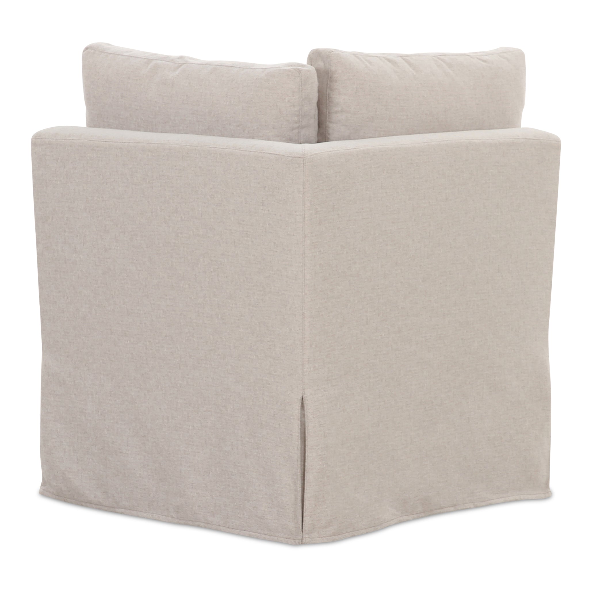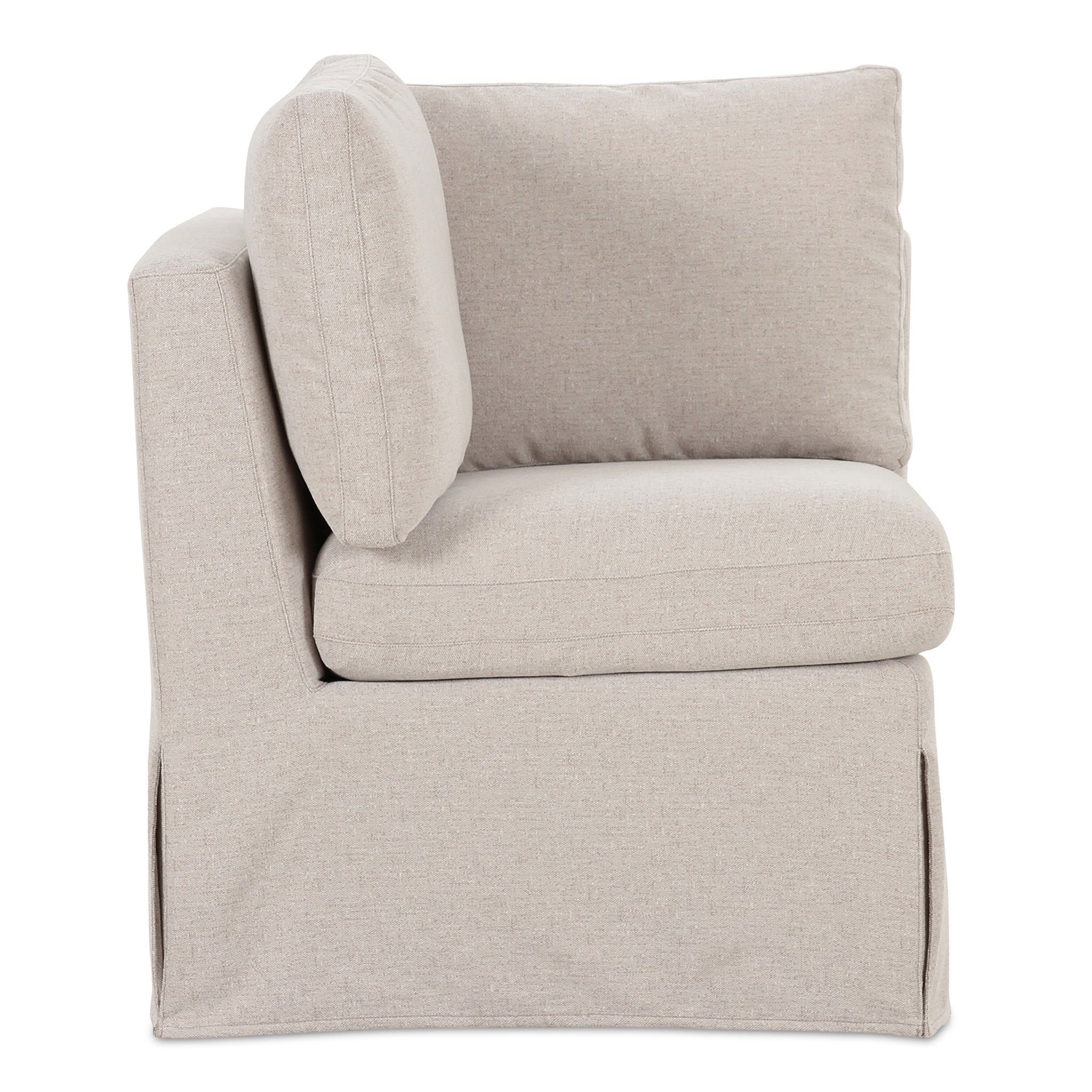 The Fiona slipcover dining corner chair's snug-fitting, washable slipcover with inverted pleats offers a tidy appearance and effortless upkeep. A slight tilt encourages a relaxed seating posture with a pillow back and seat cushions for comfort. Designed to be modular, it includes alligator clips to connect with other pieces in the collection, adapting seamlessly to various dining table sizes.