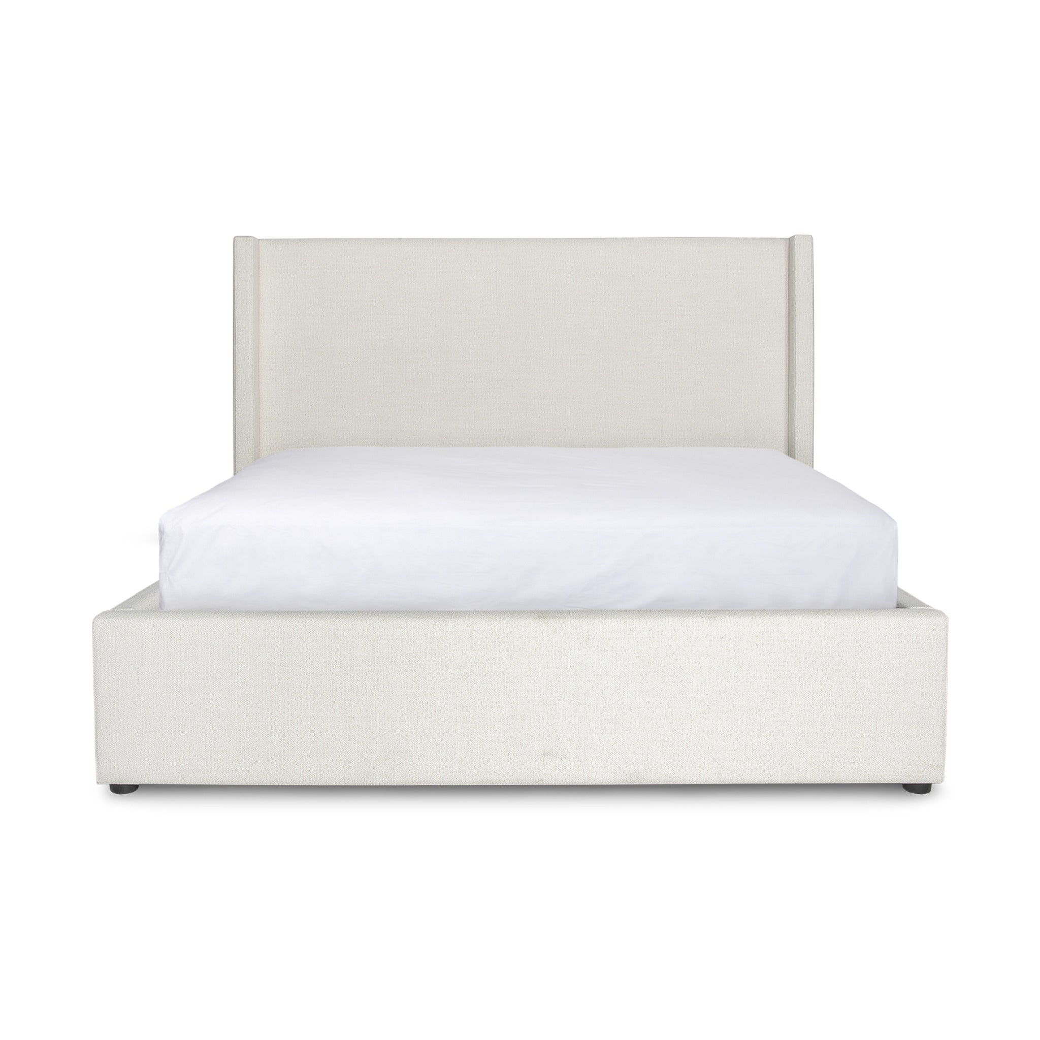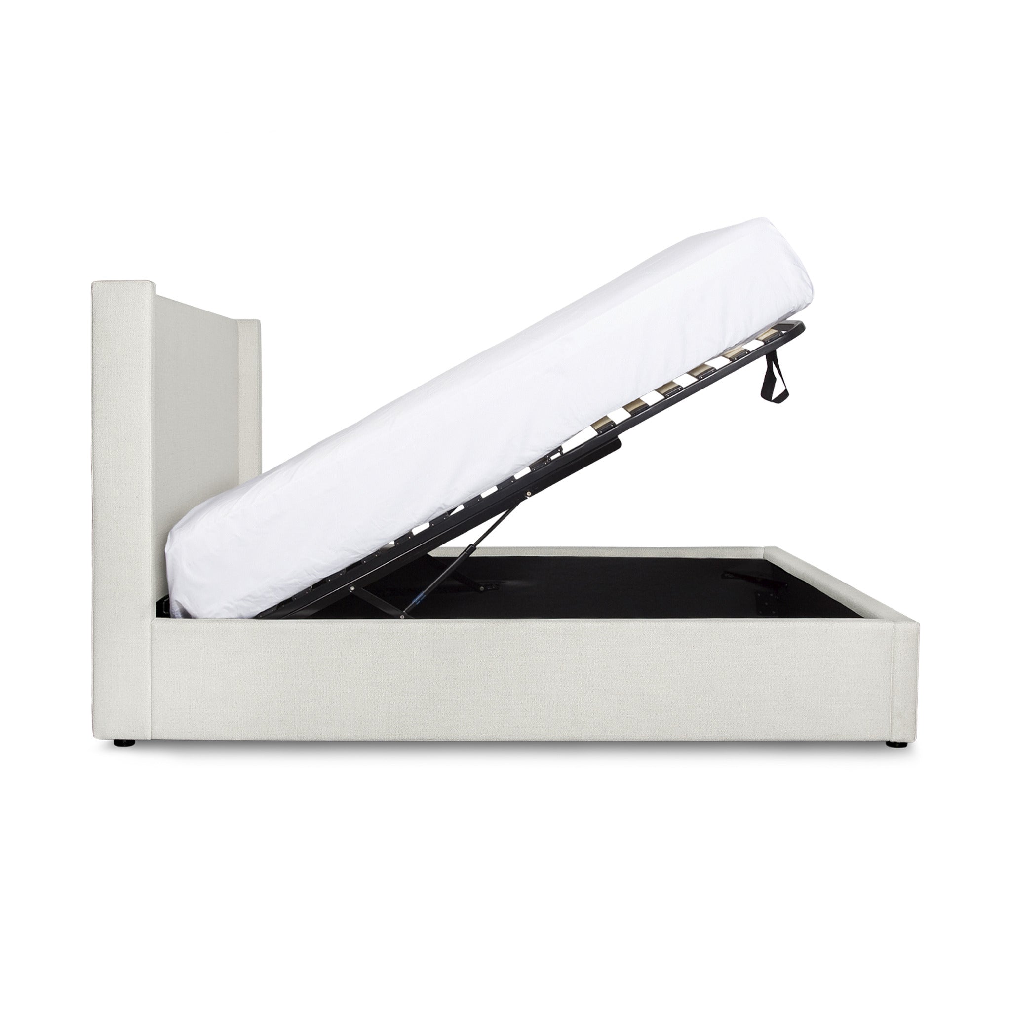 The Lando Queen Storage Bed, a streamlined new take on a classic wingback bed - timeless perfection! Upholstered in a classic woven cream fabric, the slim frame can fit into a small condos or large homes alike, while giving a feeling of coziness provided by the wings on the headboard. The added bonus of gas-piston lift mechanism allowing access the storage beneath the bed is a must, no matter the size of your space. Hide your extra linens, seasonal clothing, anything you need to stow away.