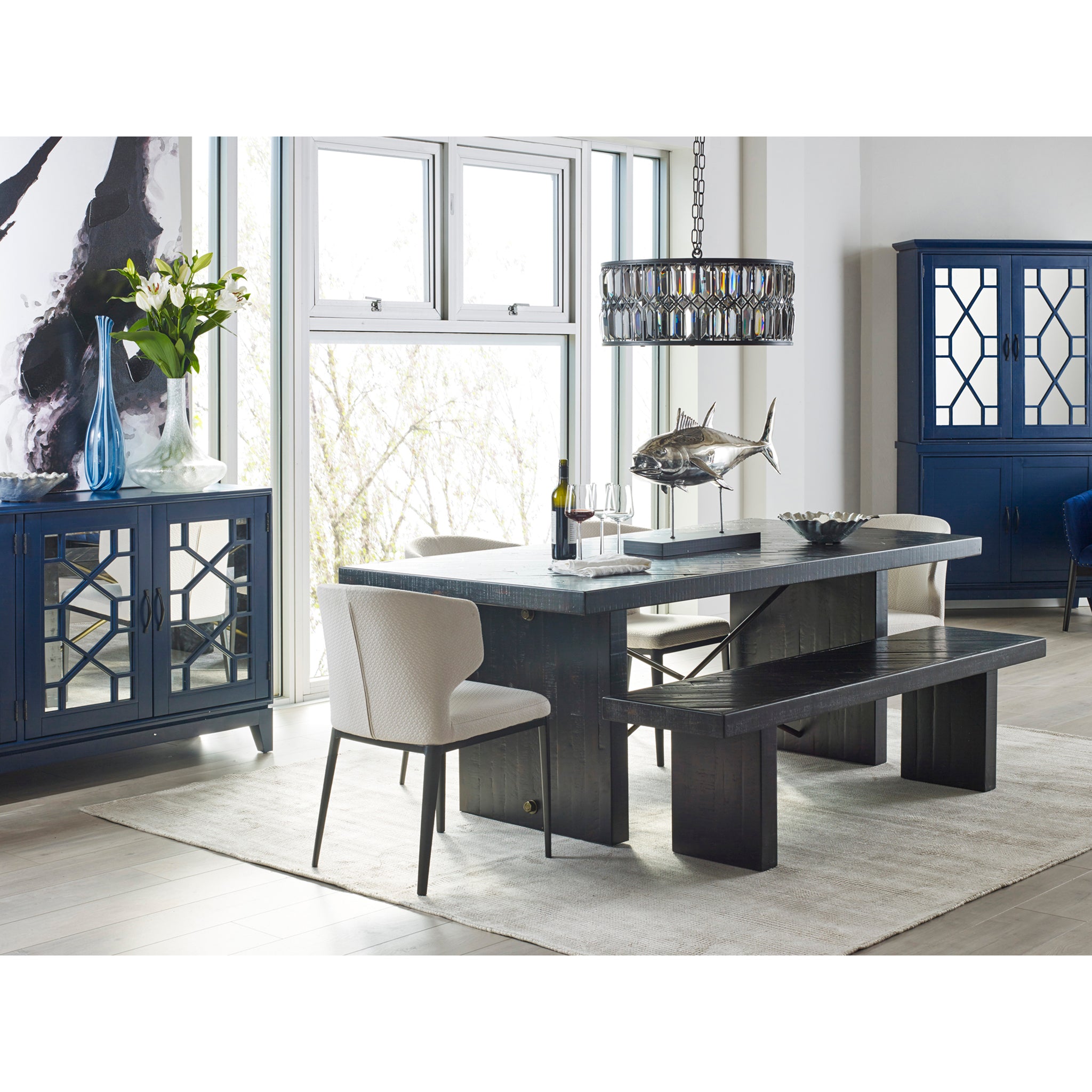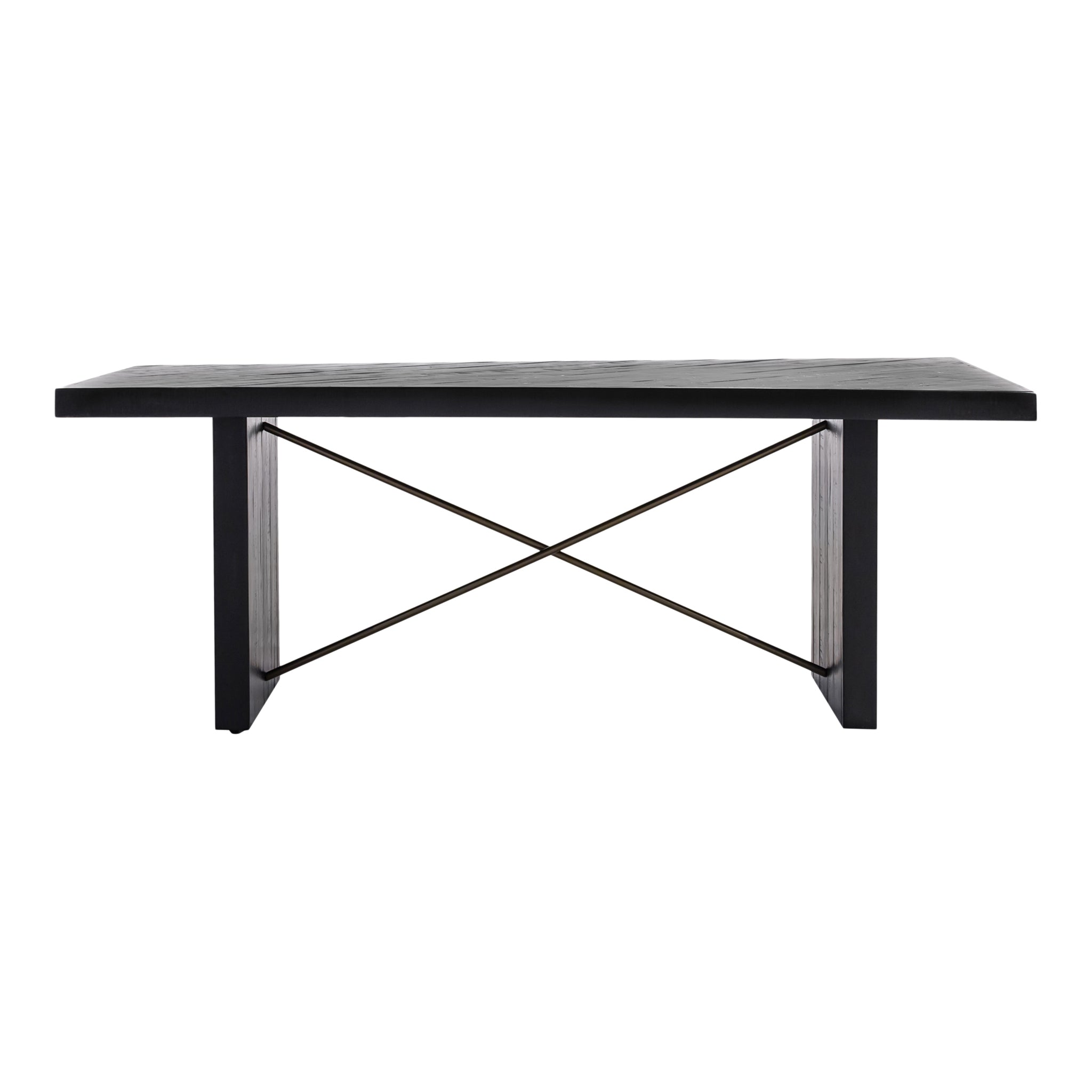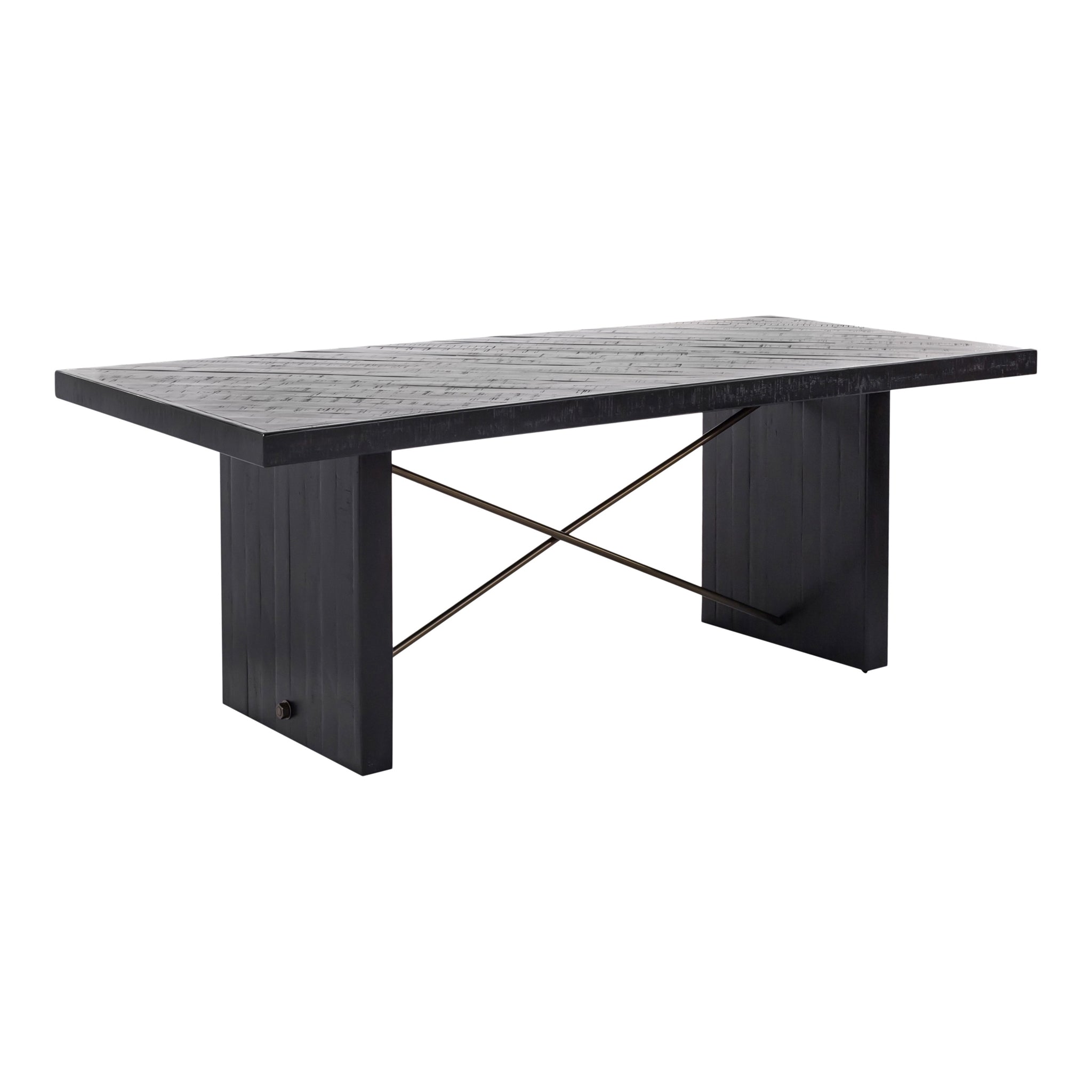 The Glen dining table has a rustic wood top with a glossy ebony stain and a contemporary parquet pattern. Steel supports and bolts give the piece a slight industrial edge. The overhang allows for additional seating on the ends, allowing room for up to 8. Check out the Glen collection.