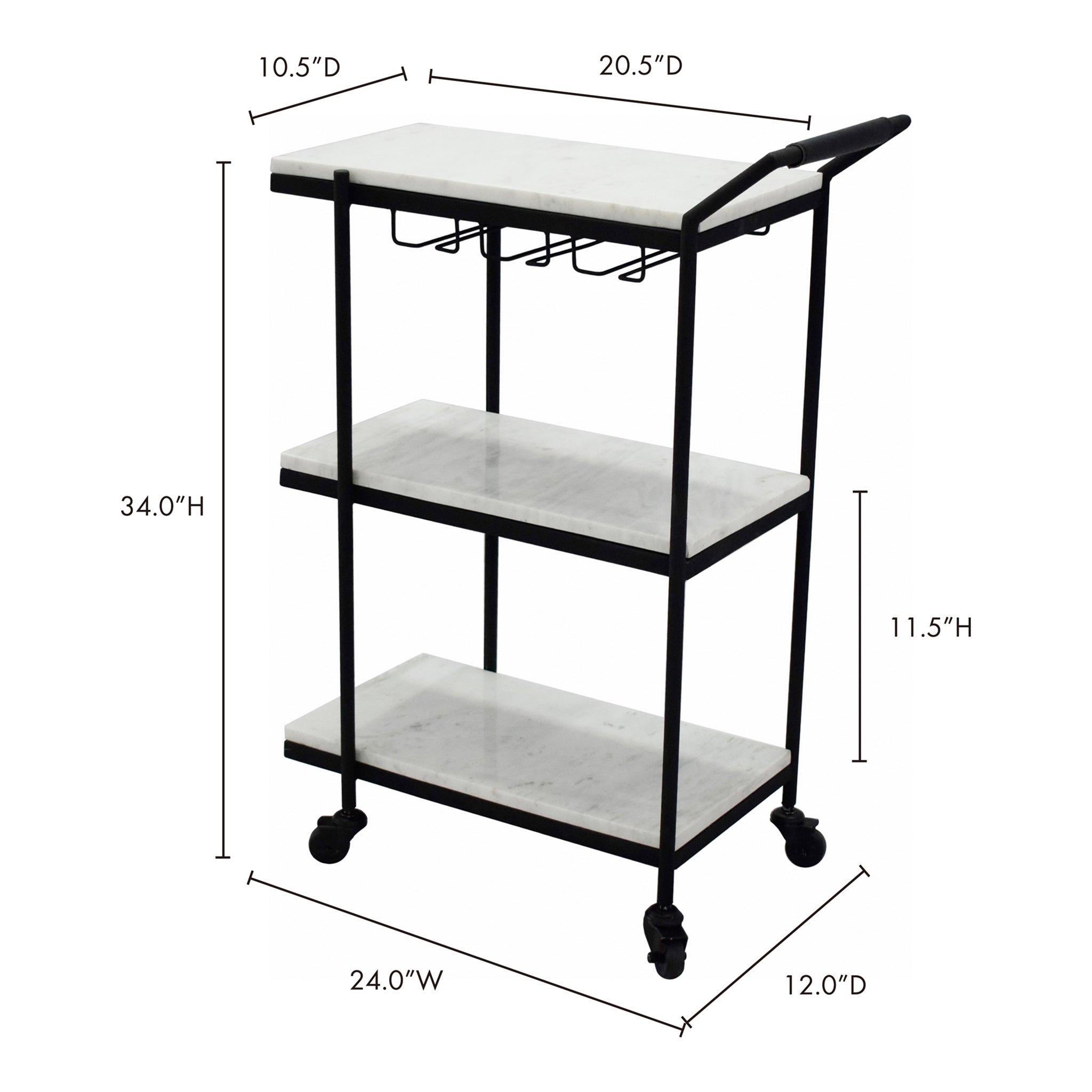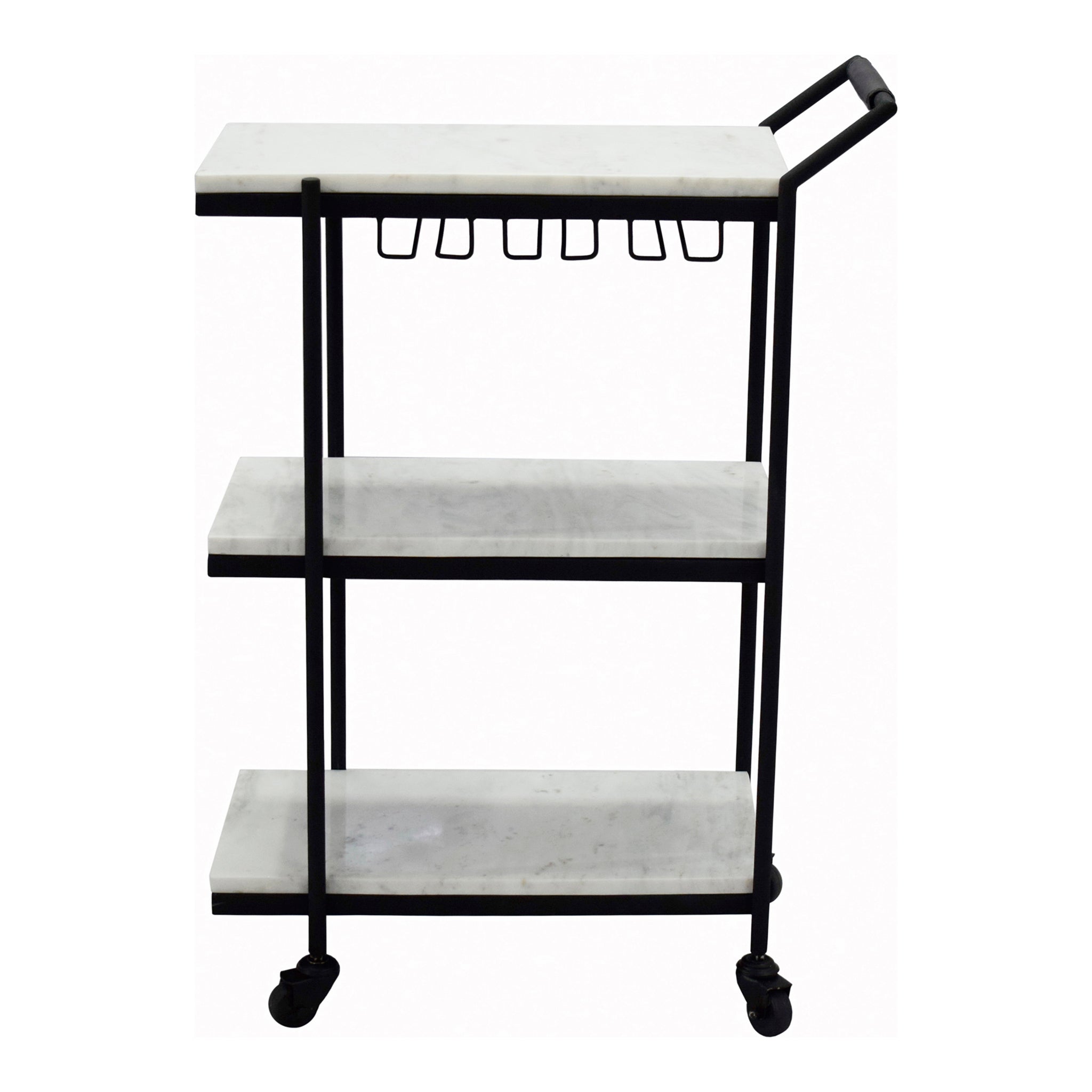 The Liverpool bar cart is guaranteed to be a hit at your next hosting occasion. This dining room showstopper has a traditional style with a touch of retro glamor. Featuring three white marble shelves housed within an iron frame and a handle wrapped in leather, this cart allows you to store your favorite drinks, glassware and cocktail accessories, and to serve your guests in style.