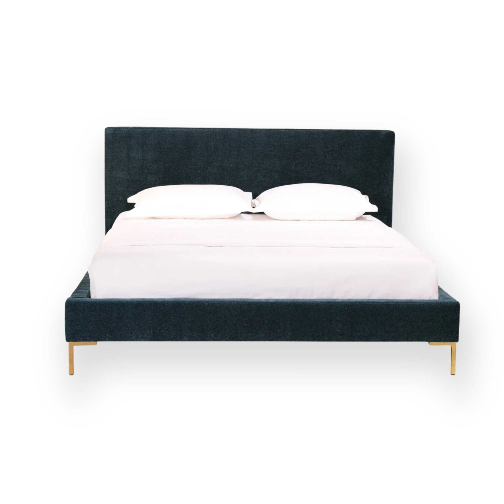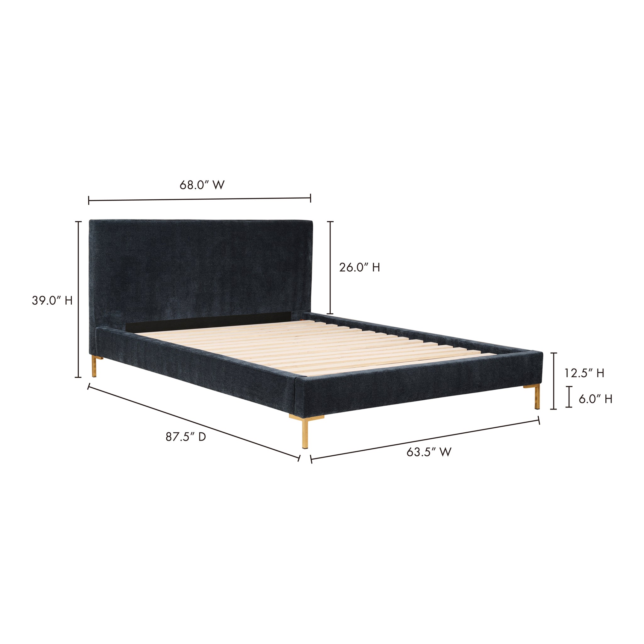 Perfect to breathe new life into your bedroom, Dumfries was designed with comfort, luxe, and quality in mind. It is fitted with clean lines and a solid pine frame wrapped in a midnight blue velveteen fabric, complete with a padded and upholstered headboard and golden leg accents.