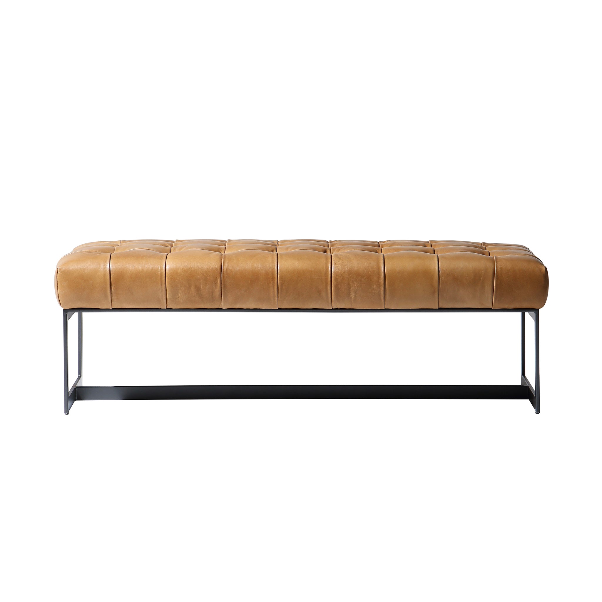 The Wales bench, a noble design. Striking a balance between modern and industrial aesthetic, it's tufted top-grain buffalo leather provides the luxe while a sturdy iron frame grounds this design. This versatile, foam-padded bench is equal parts comfortable, functional and stylish from the entryway to the bedroom.