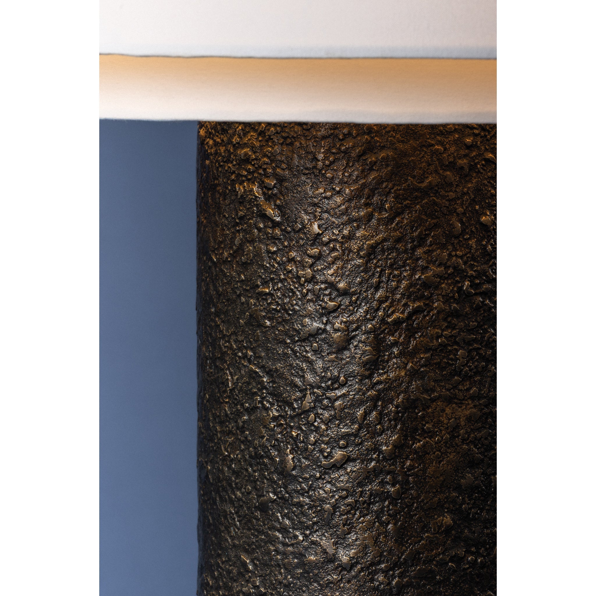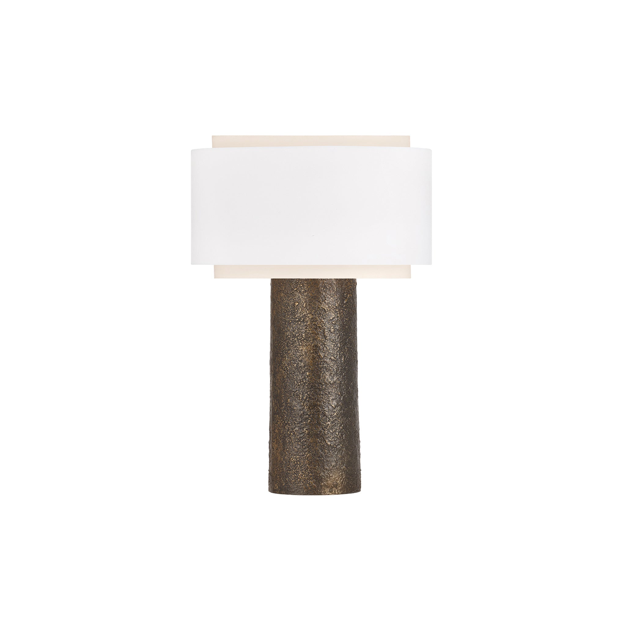 The Ashburton table lamp is a substantial statement piece for earthy interiors. Giving the base a grounded feel, the cast aluminum silhouette is marked by bronze patina highlights and surface imperfections recalling natural stone. A two-layer white linen shade adds an architectural element to complement the tactile base. A stunning addition to a side table or console, Ashburton's quiet stature is enduring.