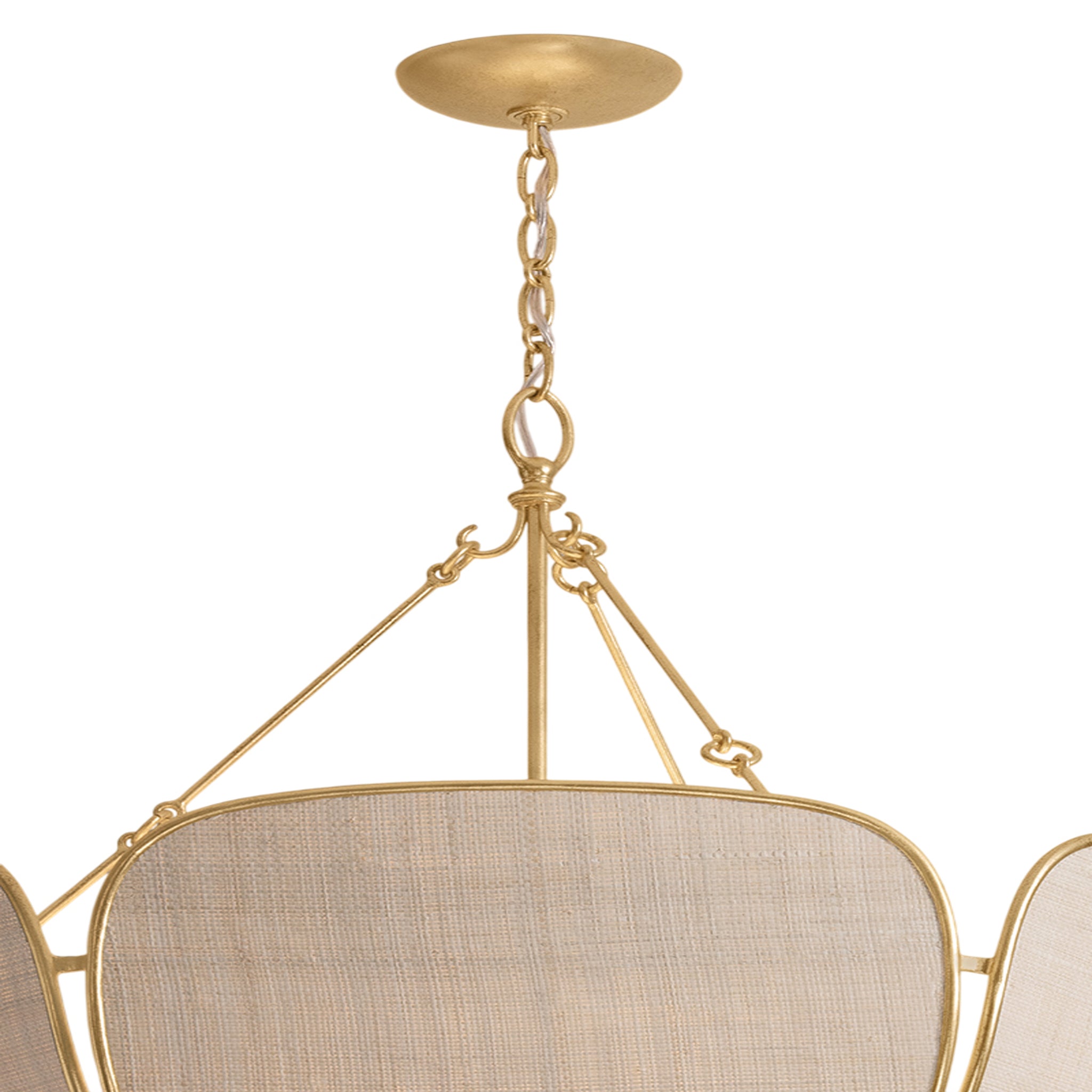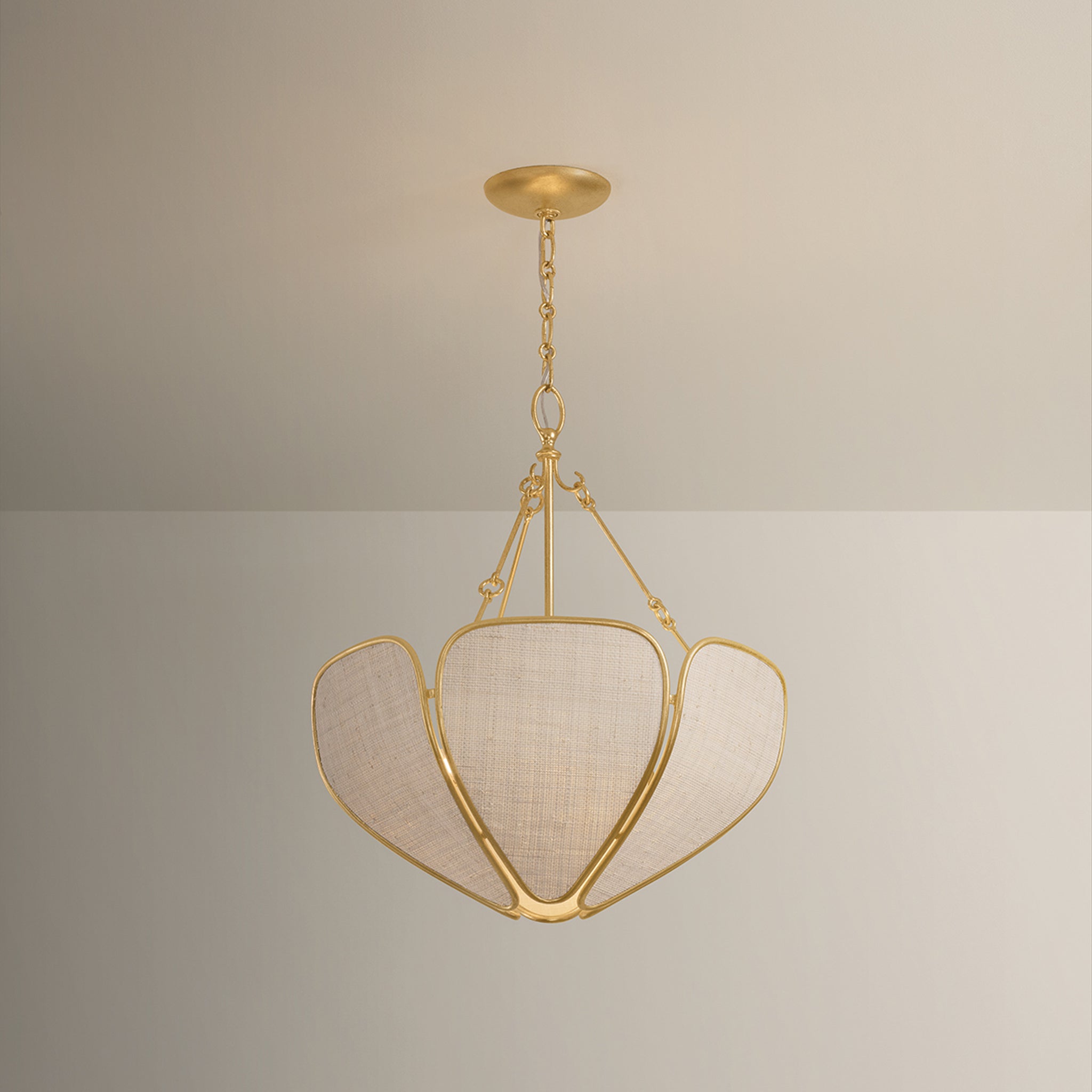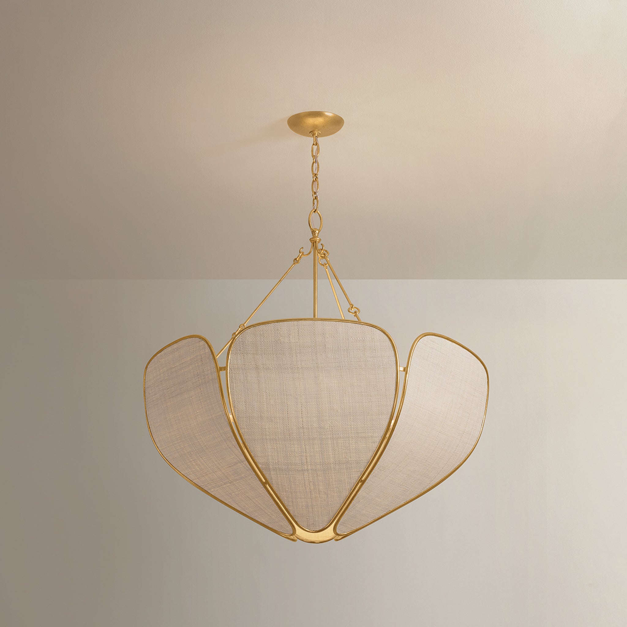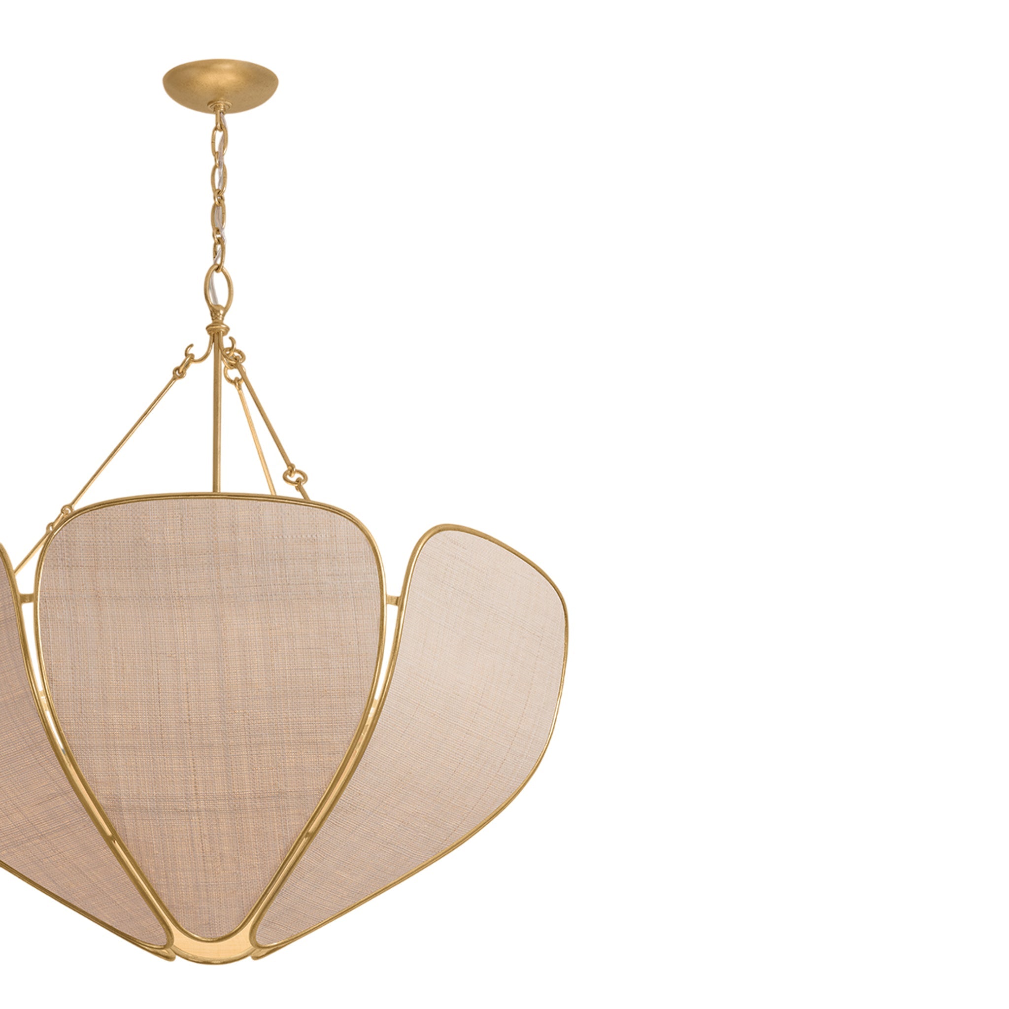 Inspired by Art Nouveau designs, the Bayville family uses natural materials to create flowing botanical silhouettes. The breezy Saguran fabric shade is constructed of petal-like panels edged in Vintage Gold Leaf and lined with abaca. Available as a semi-flush and a pendant in two sizes, Bayville will breathe new life into any space.