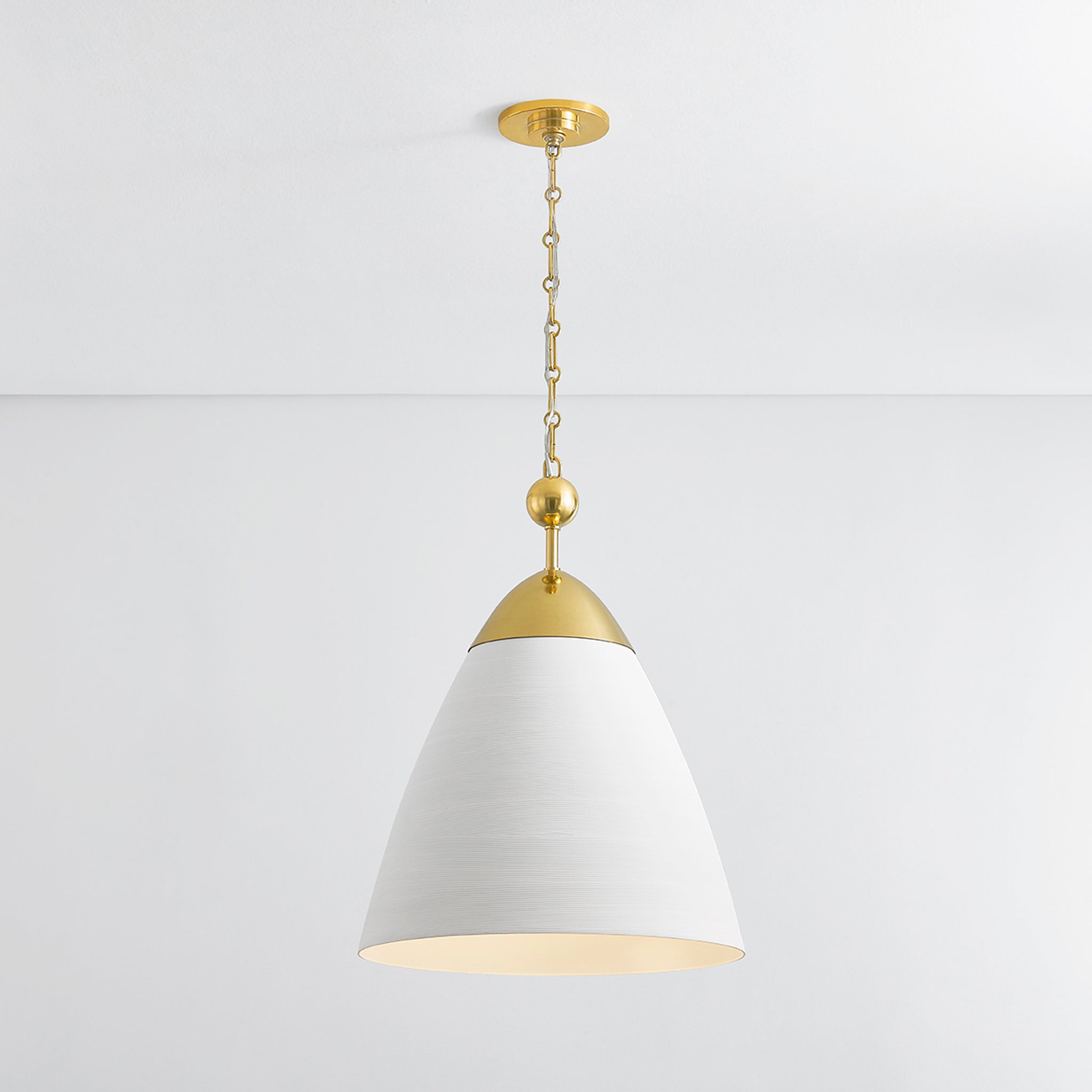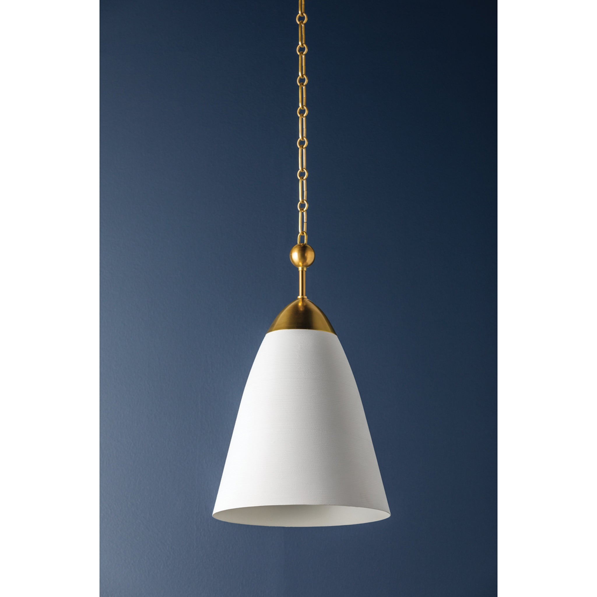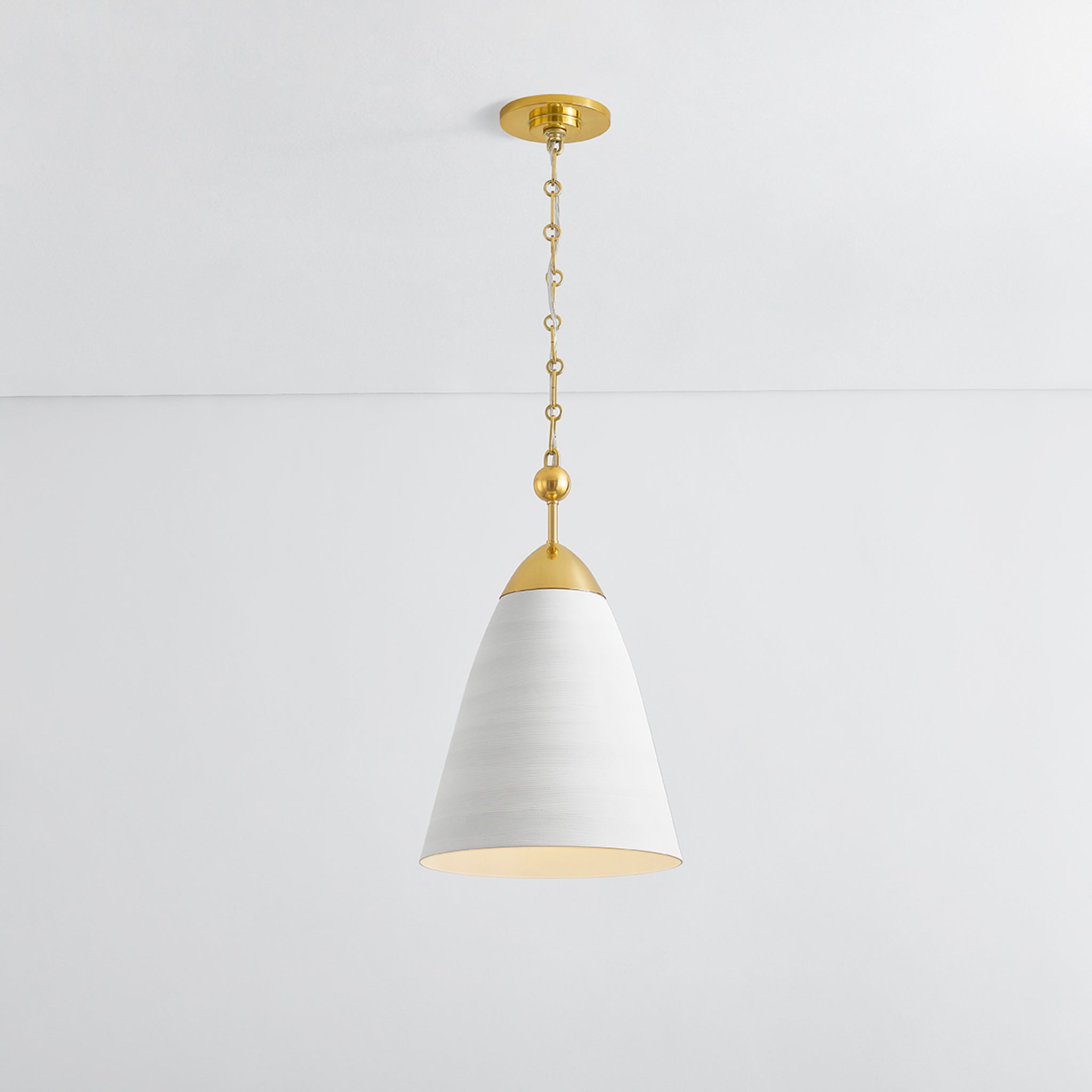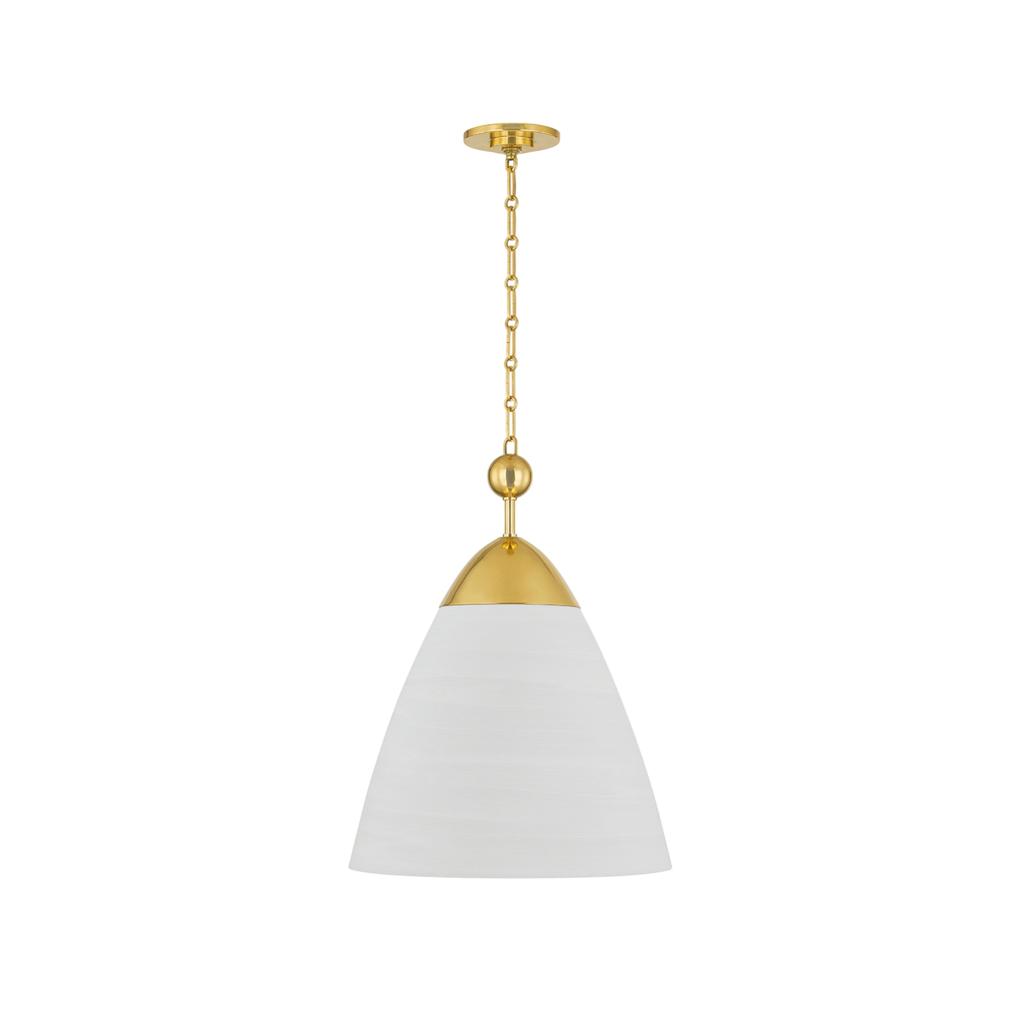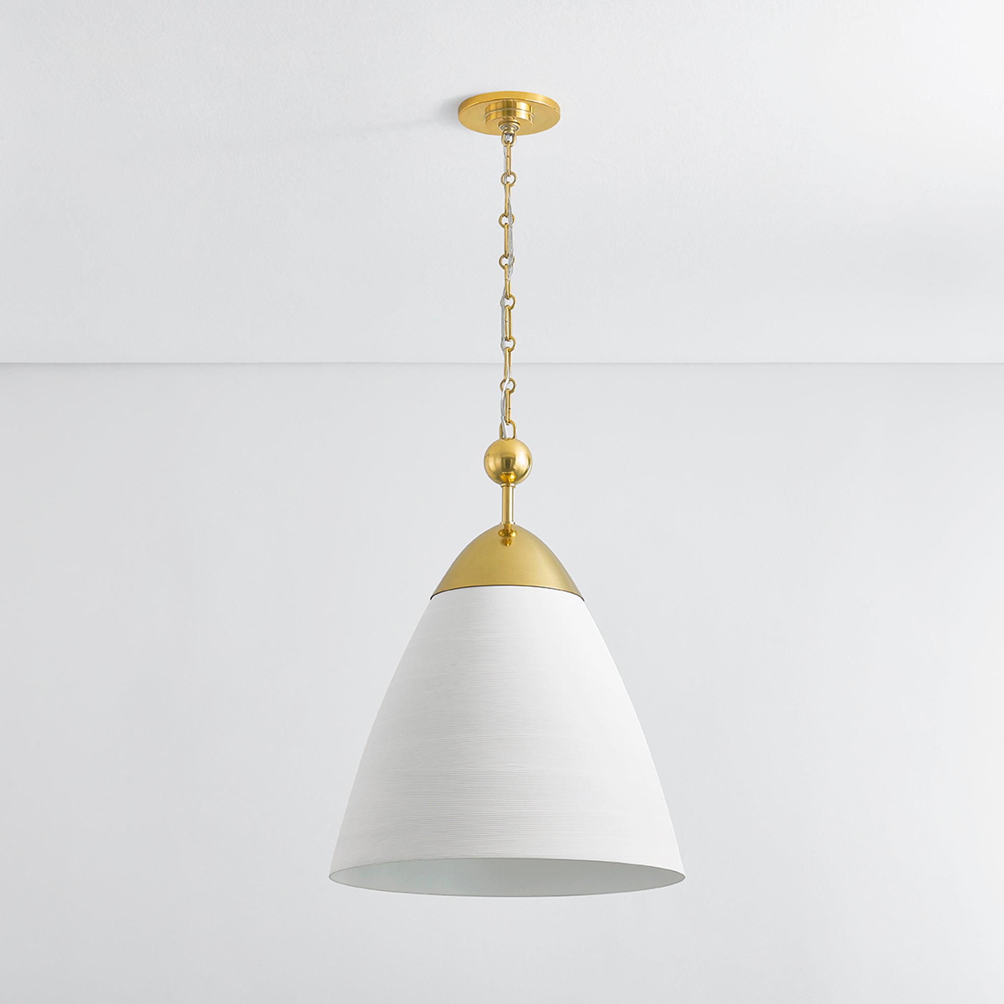 A refined bell-shaped fixture with a modern edge, Bronson features a sleek, tapered silhouette crafted from clean Bronson Pendant Plaster. The opaque materiality and funnel shape creates a powerful downlight to fill a large area. Accented by the inviting warmth and reflective nature of Aged Brass/Bronson Pendant Plaster, including a large cap and finial, it evokes an organic feel. Available as a chandelier or pendant in two sizes. Becki Owens for Hudson Valley Lighting.