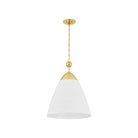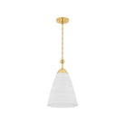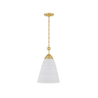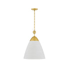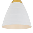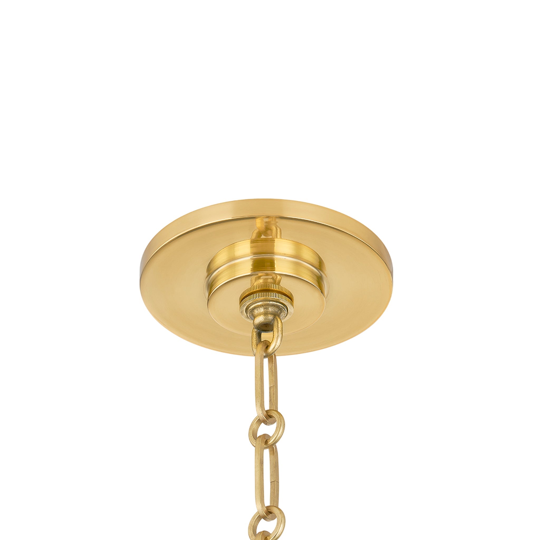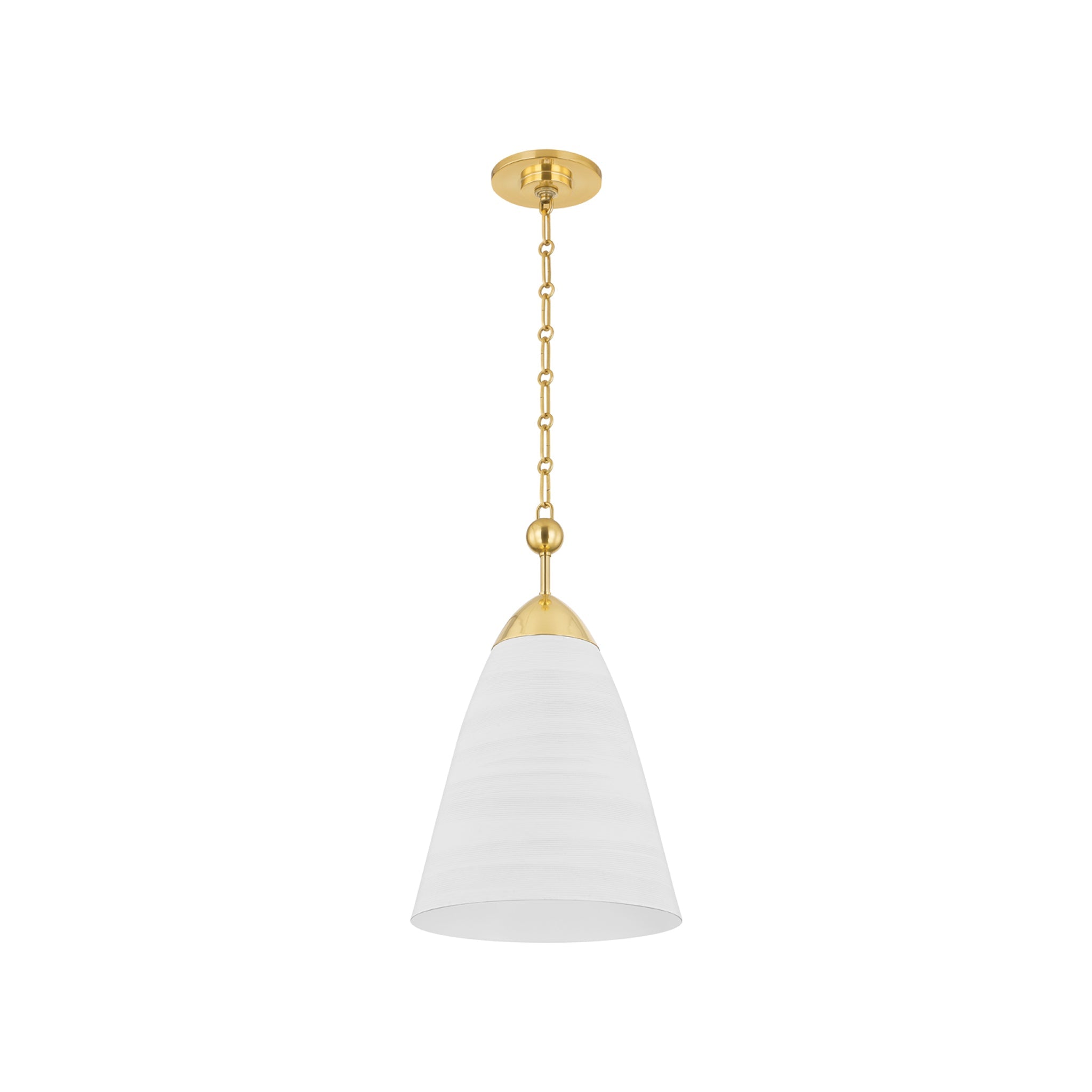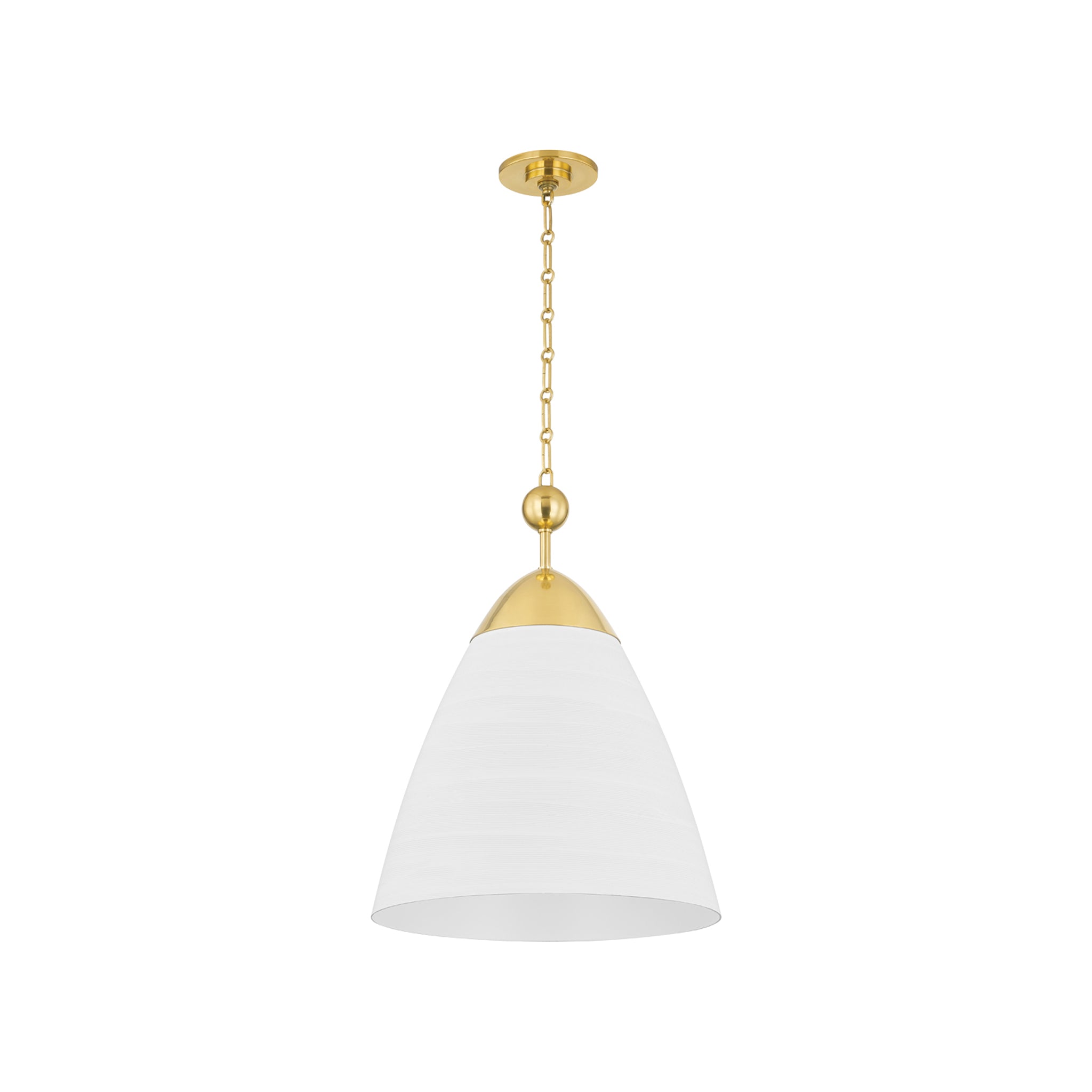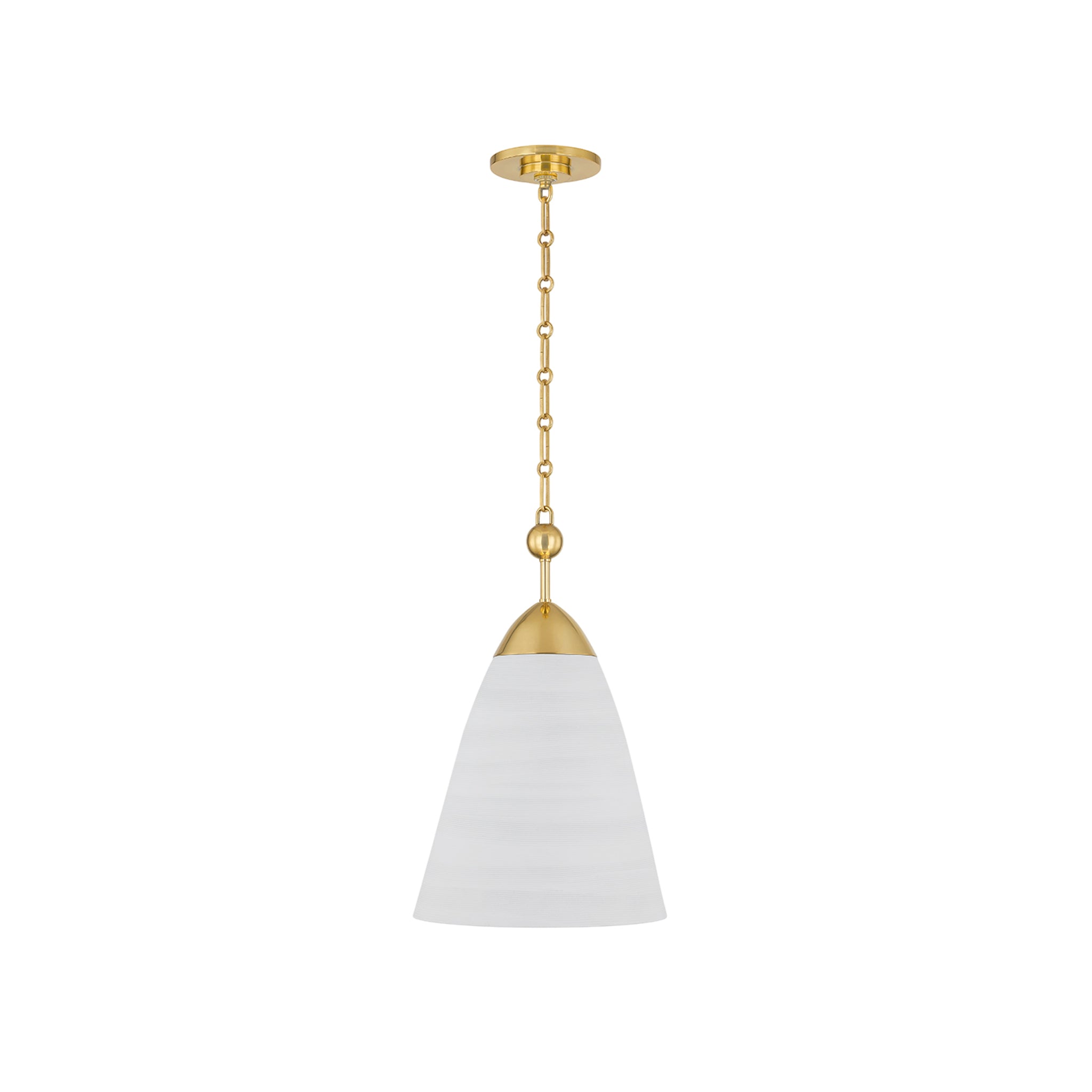 A refined bell-shaped fixture with a modern edge, Bronson features a sleek, tapered silhouette crafted from clean Bronson Pendant Plaster. The opaque materiality and funnel shape creates a powerful downlight to fill a large area. Accented by the inviting warmth and reflective nature of Aged Brass/Bronson Pendant Plaster, including a large cap and finial, it evokes an organic feel. Available as a chandelier or pendant in two sizes. Becki Owens for Hudson Valley Lighting.