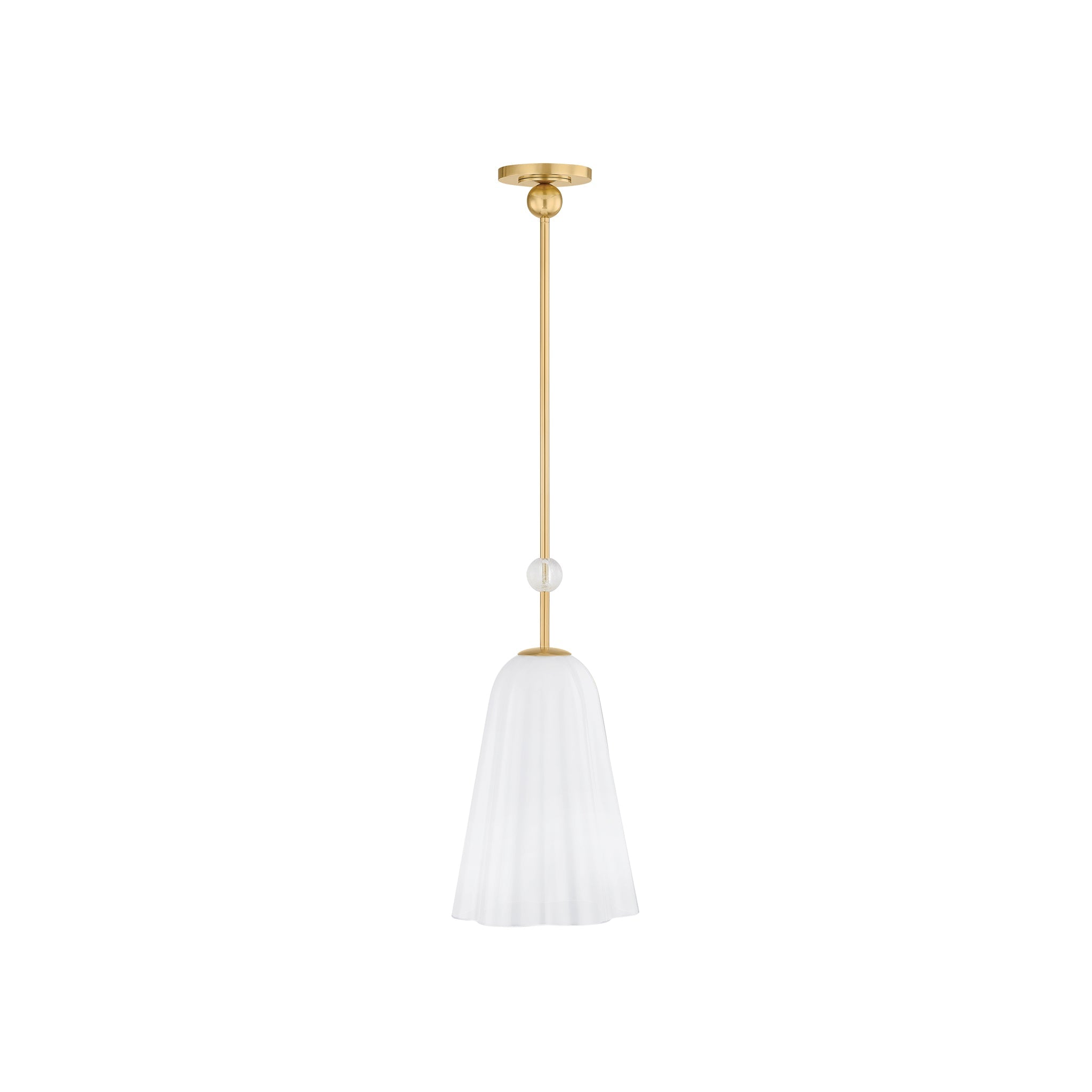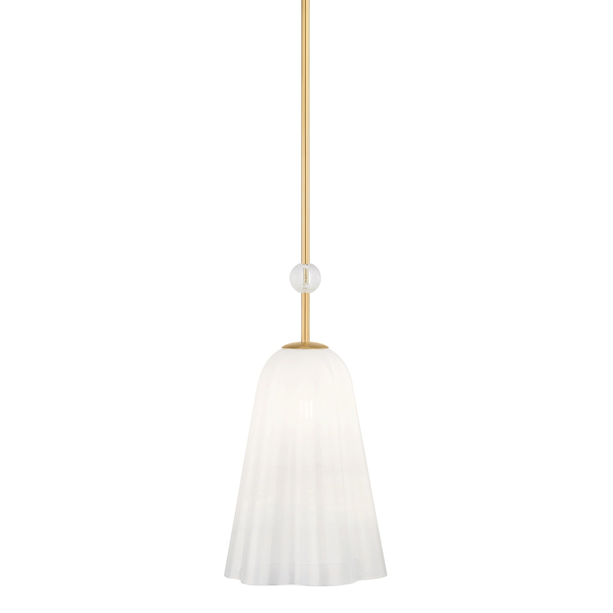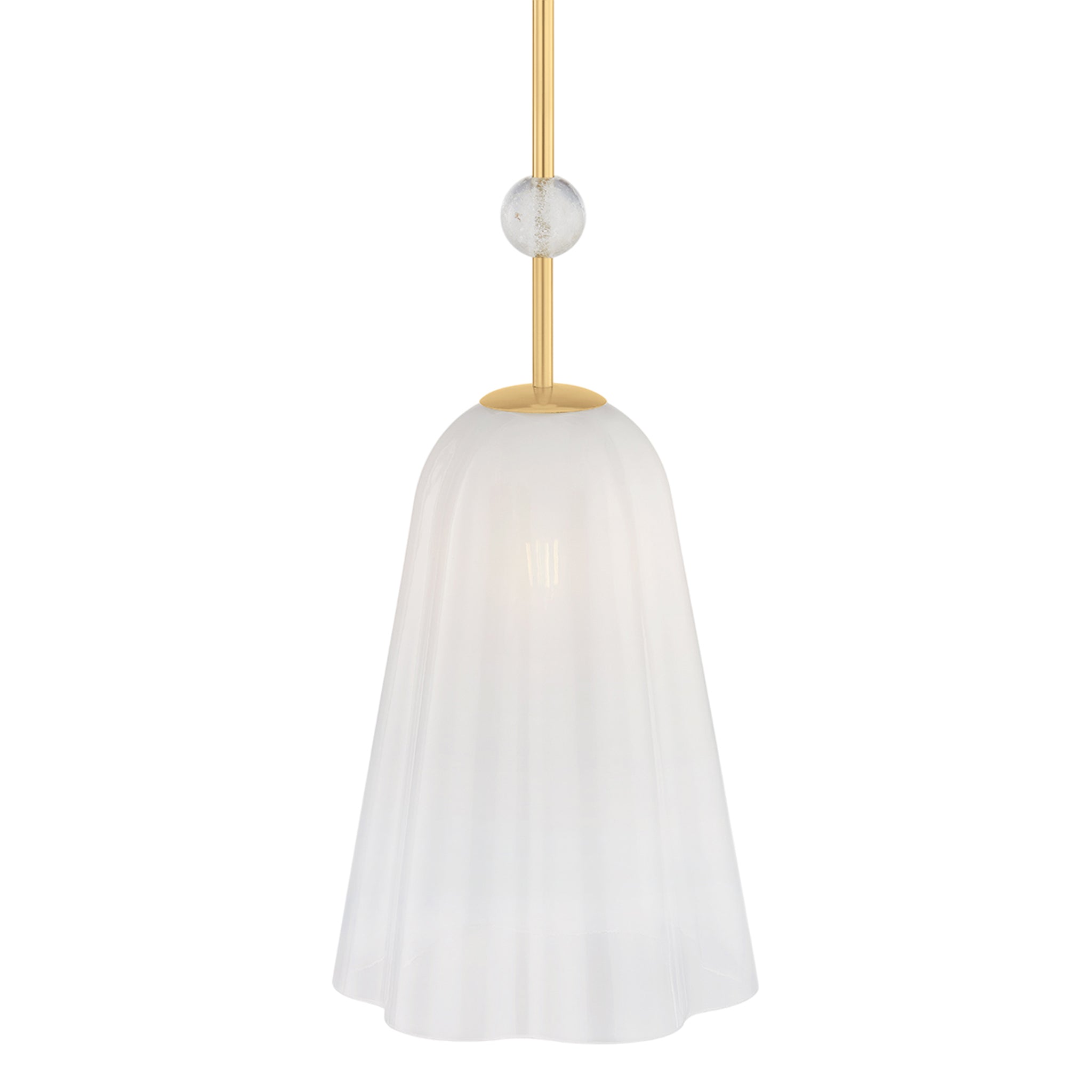 Soft and airy in form, Cambria Heights brings nature-inspired drama to a ceiling. A misty Sfumato glass shade with gently scalloped edges appears to float mid-air in both the pendant and lantern. Adding to the decorative nature of the specialty glass is a gem-like rock crystal ornament. Finished in Aged Brass, the central rod provides sleek support for this ethereal fixture.