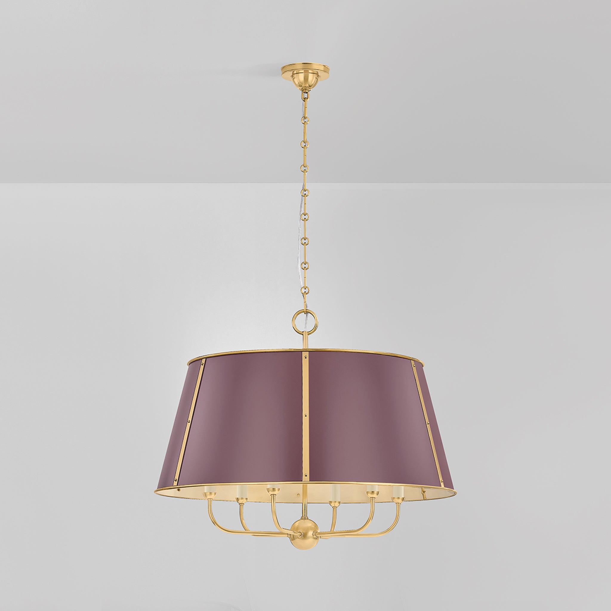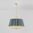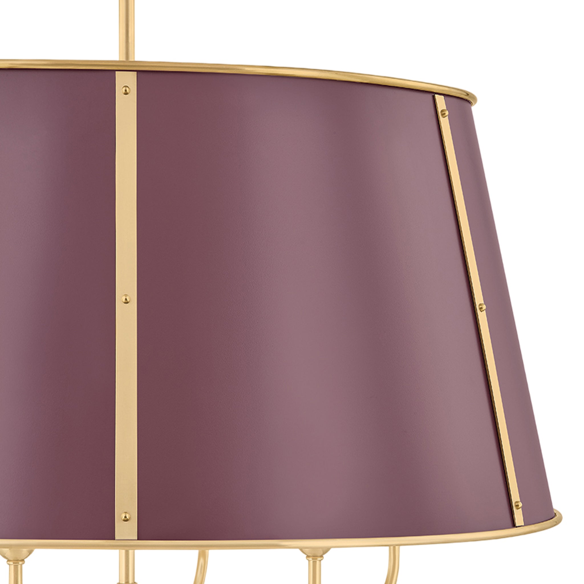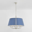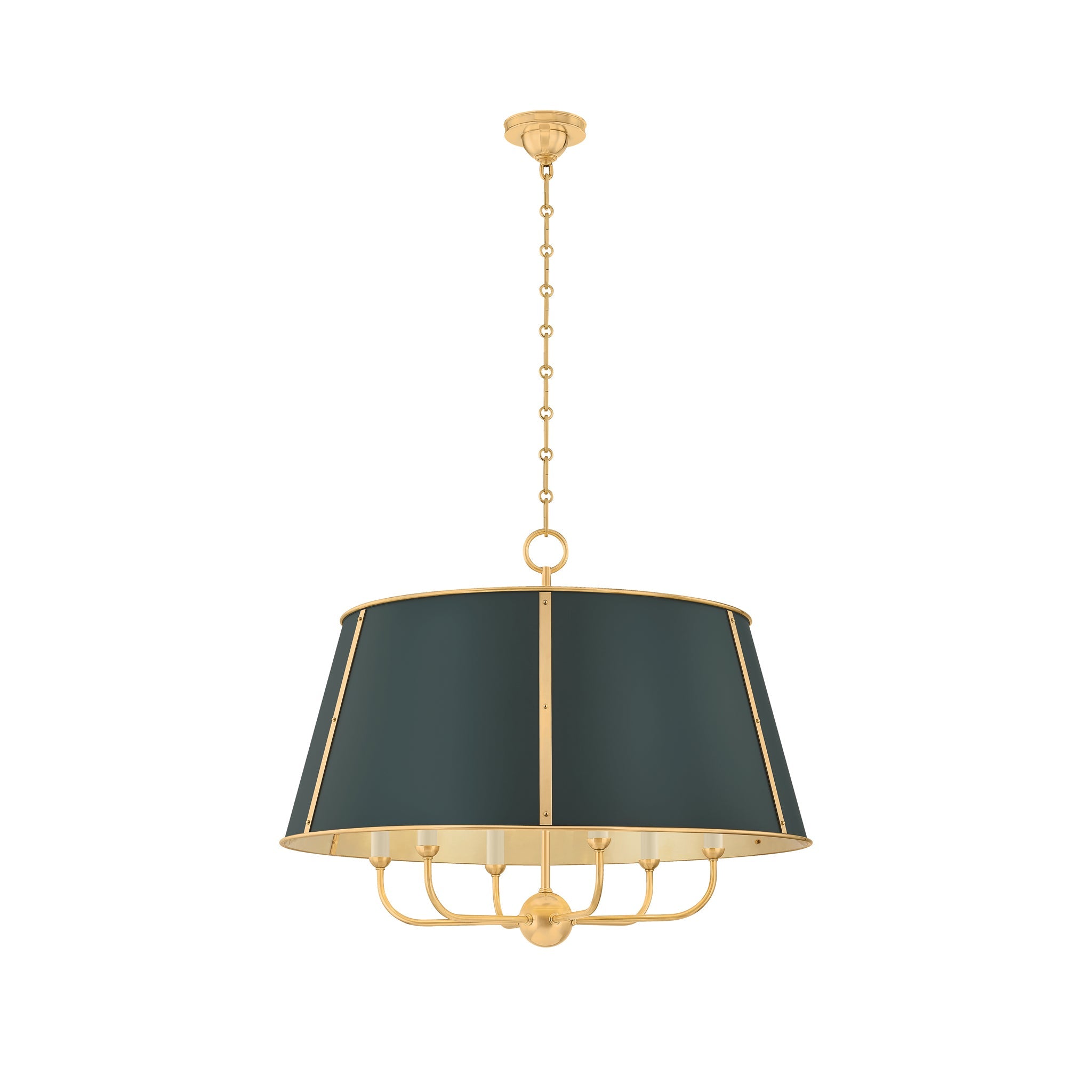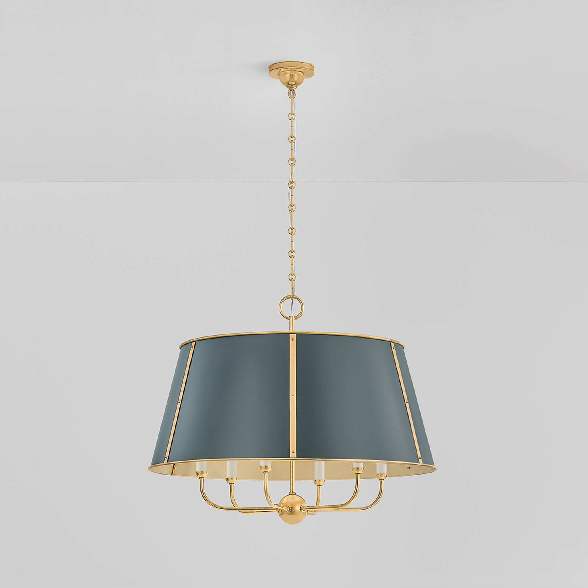 The Cambridge family features refined, metal drum shades with sleek details. The brass interior of the chandeliers amplifies light when illuminated, creating a warm, atmospheric glow. Strips of metal with visible screws add a modern touch, giving each fixture a distinctive industrial flair. Available in 4 and 6-light formats, Cambridge is well-suited to a dining room or kitchen. Available in three finish options, Aged Brass and Soft Studio Green, Aged Brass and Soft Crimson and Polished Nickel and Soft French Blue. Mark D. Sikes for Hudson Valley Lighting.