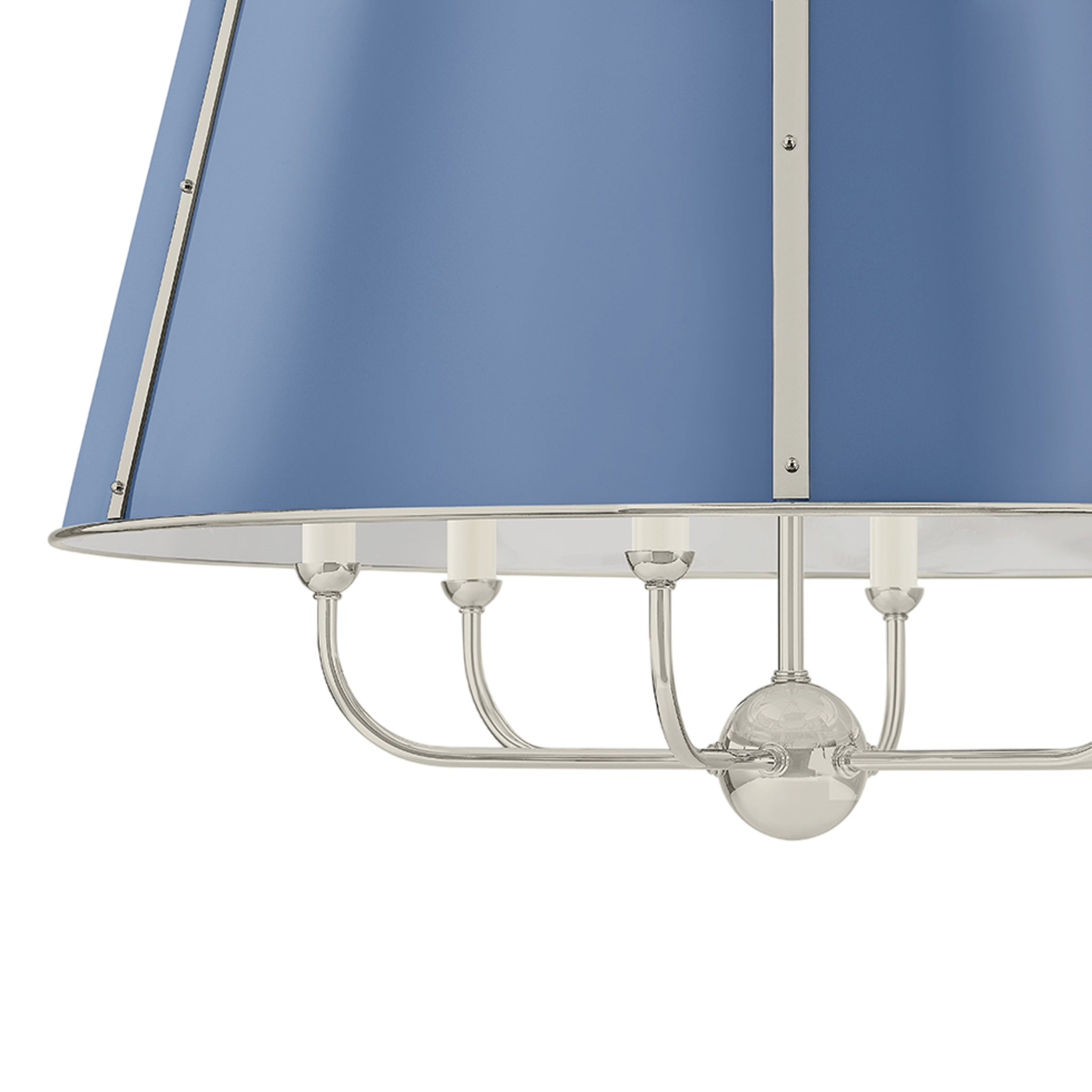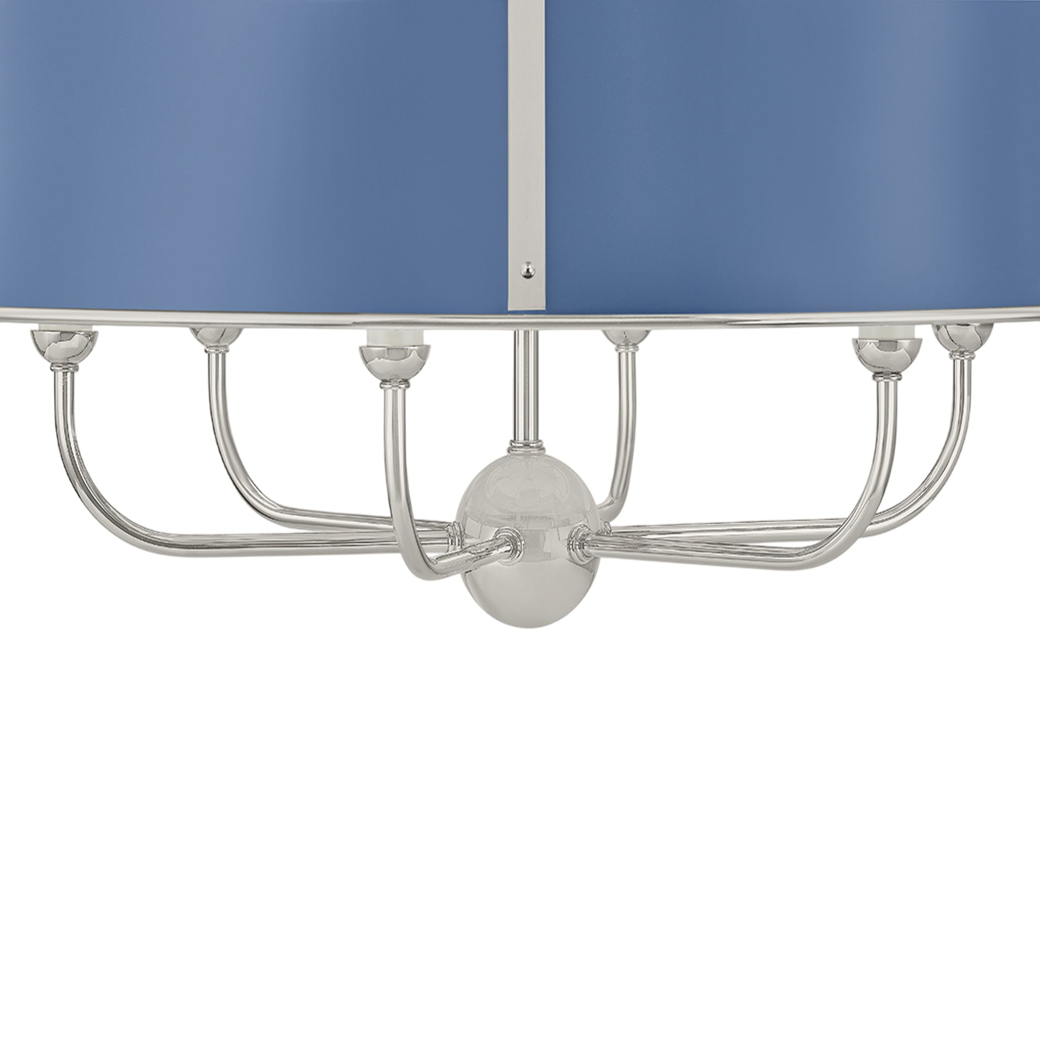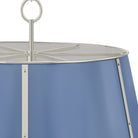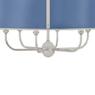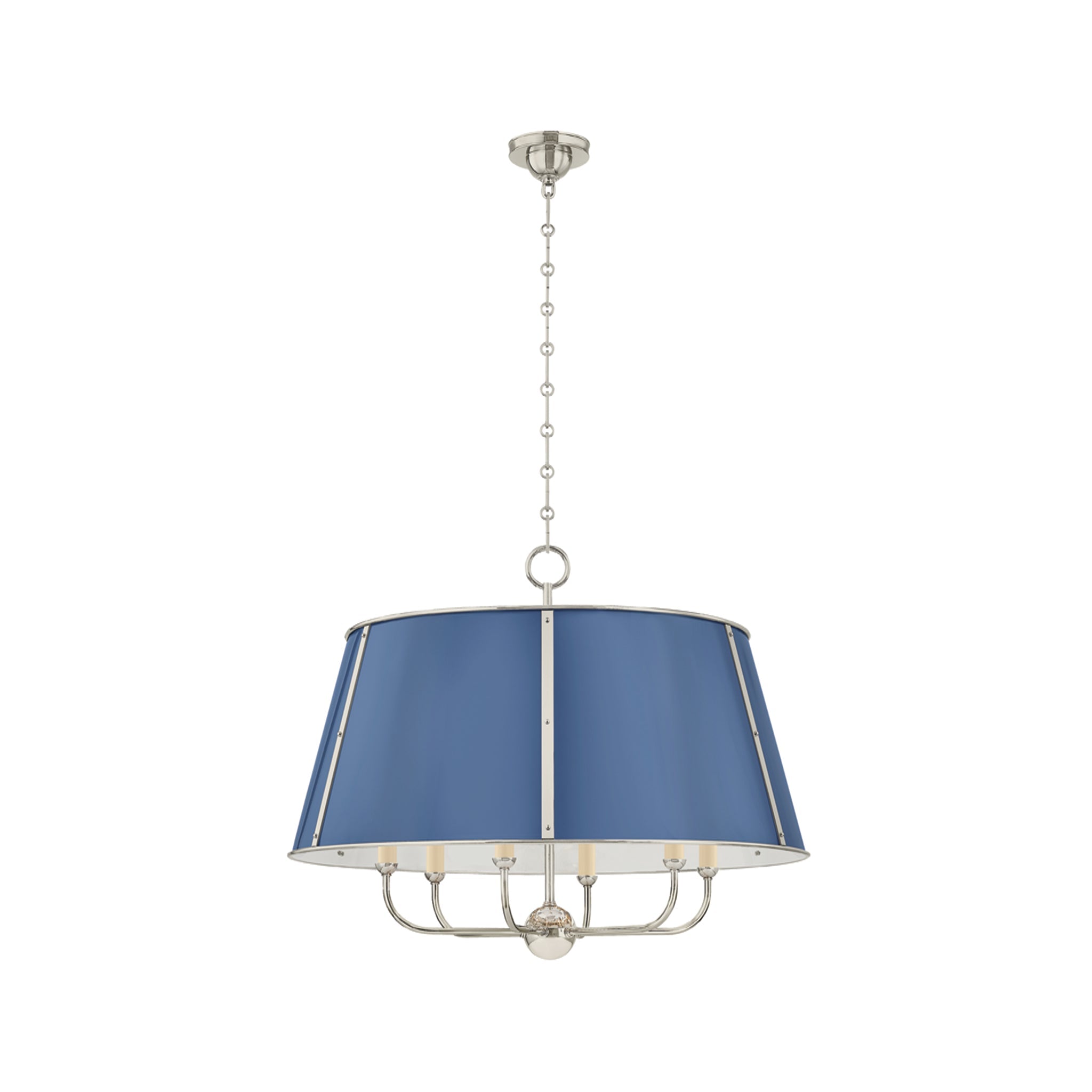 The Cambridge family features refined, metal drum shades with sleek details. The brass interior of the chandeliers amplifies light when illuminated, creating a warm, atmospheric glow. Strips of metal with visible screws add a modern touch, giving each fixture a distinctive industrial flair. Available in 4 and 6-light formats, Cambridge is well-suited to a dining room or kitchen. Available in three finish options, Aged Brass and Soft Studio Green, Aged Brass and Soft Crimson and Polished Nickel and Soft French Blue. Mark D. Sikes for Hudson Valley Lighting.