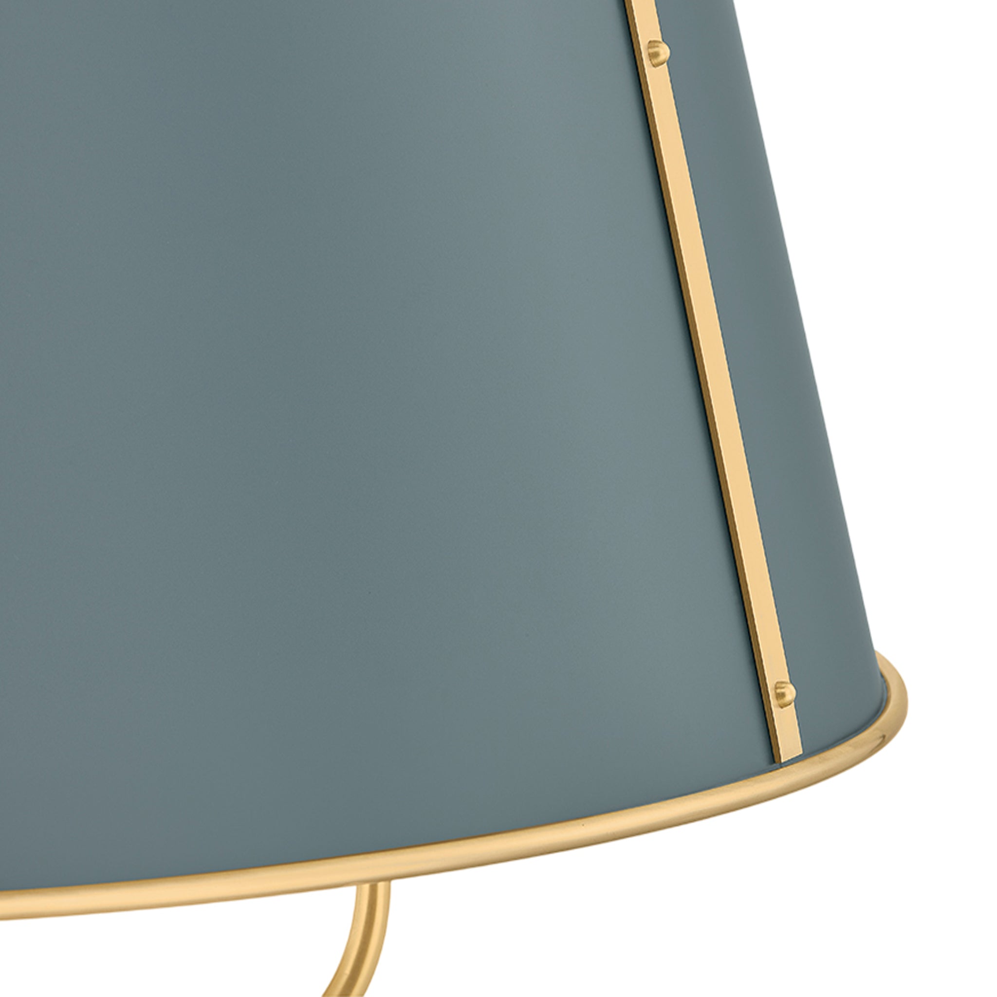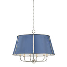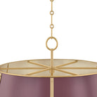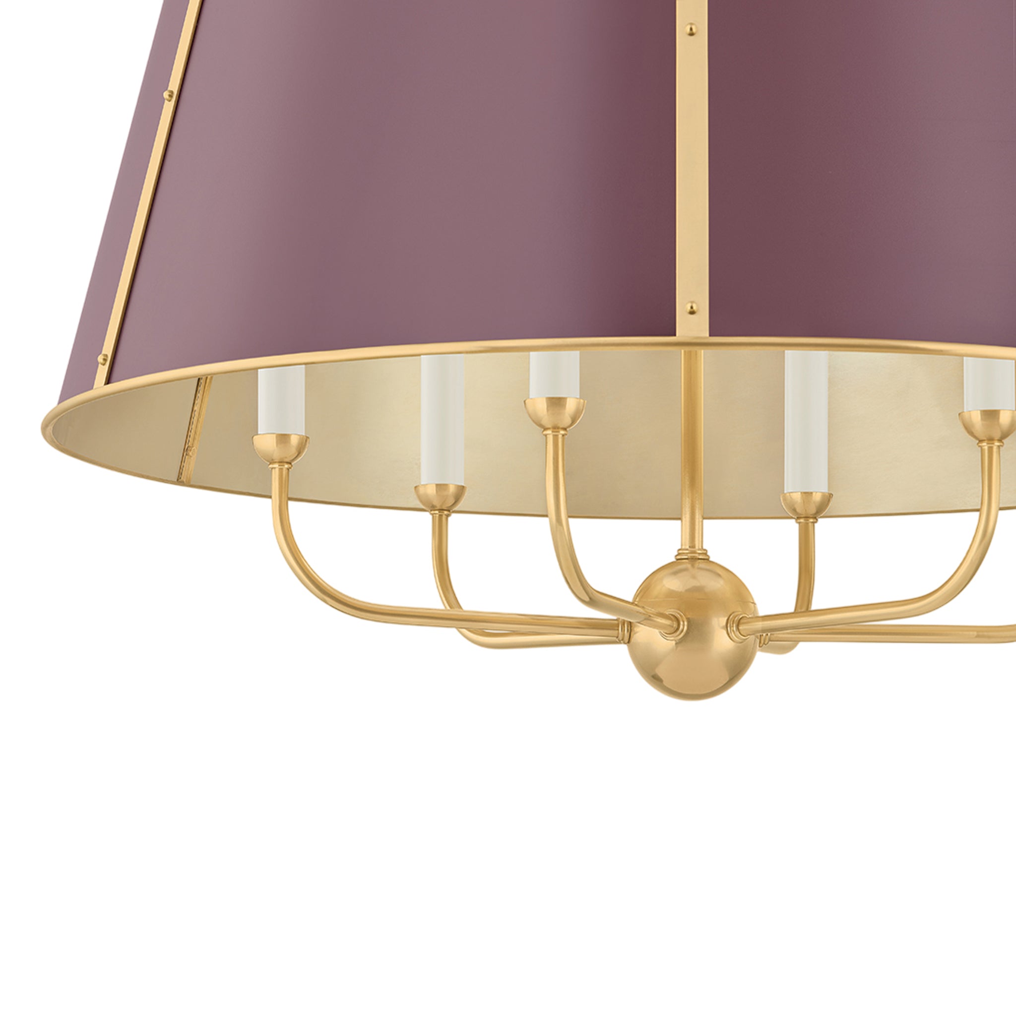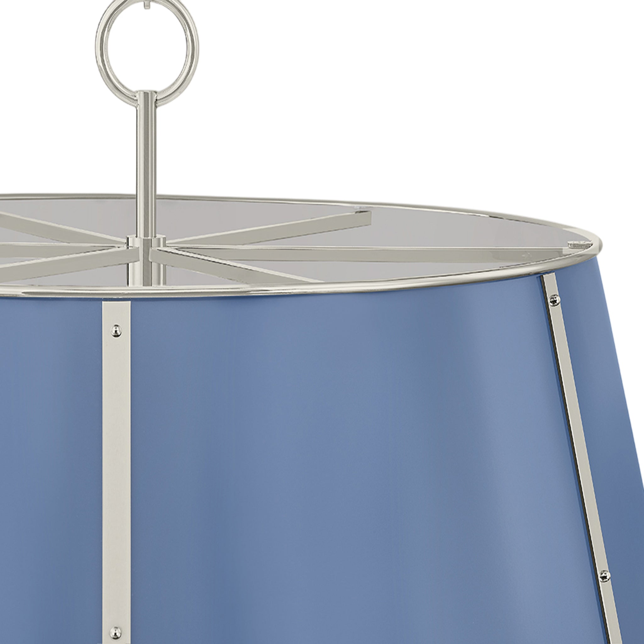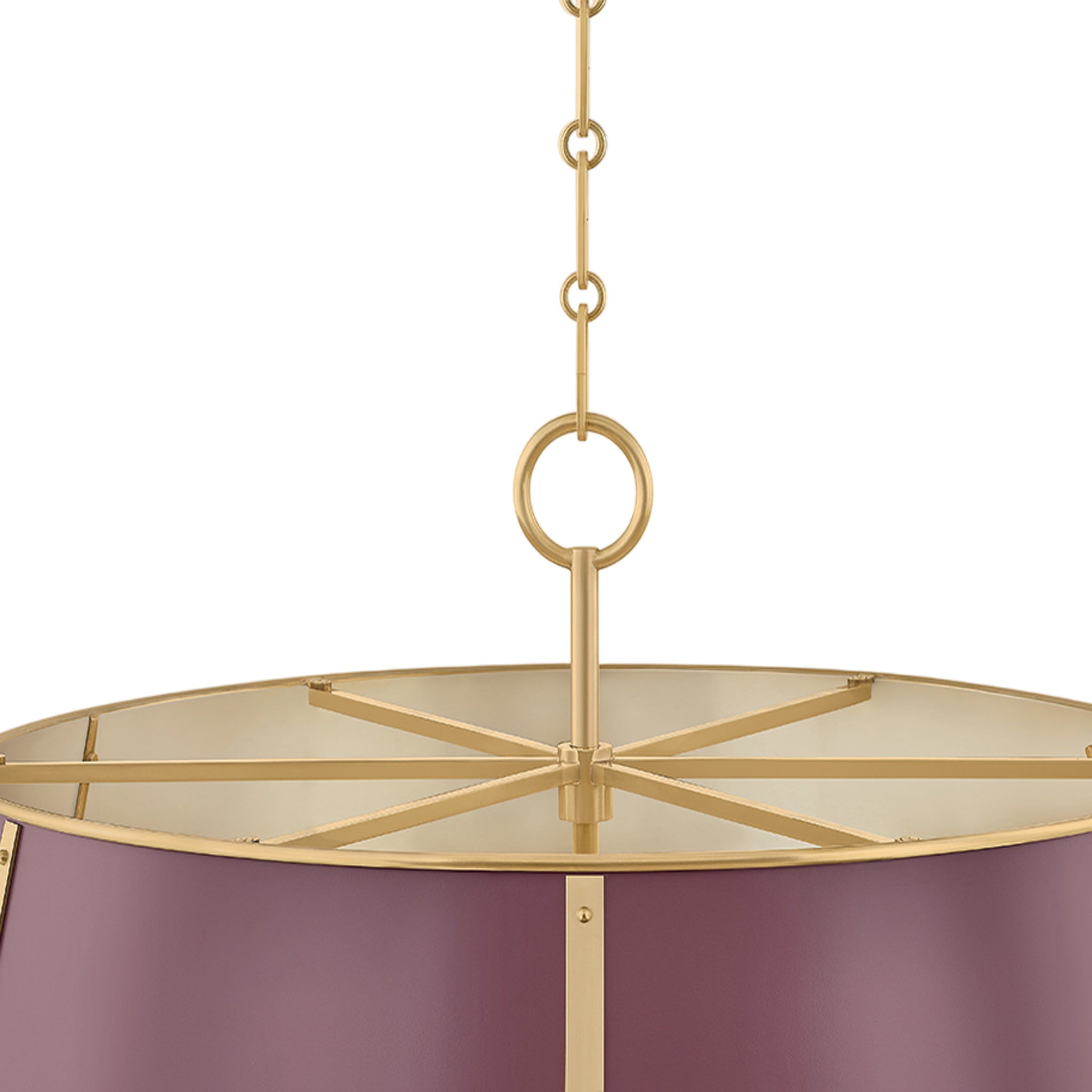 The Cambridge family features refined, metal drum shades with sleek details. The brass interior of the chandeliers amplifies light when illuminated, creating a warm, atmospheric glow. Strips of metal with visible screws add a modern touch, giving each fixture a distinctive industrial flair. Available in 4 and 6-light formats, Cambridge is well-suited to a dining room or kitchen. Available in three finish options, Aged Brass and Soft Studio Green, Aged Brass and Soft Crimson and Polished Nickel and Soft French Blue. Mark D. Sikes for Hudson Valley Lighting.