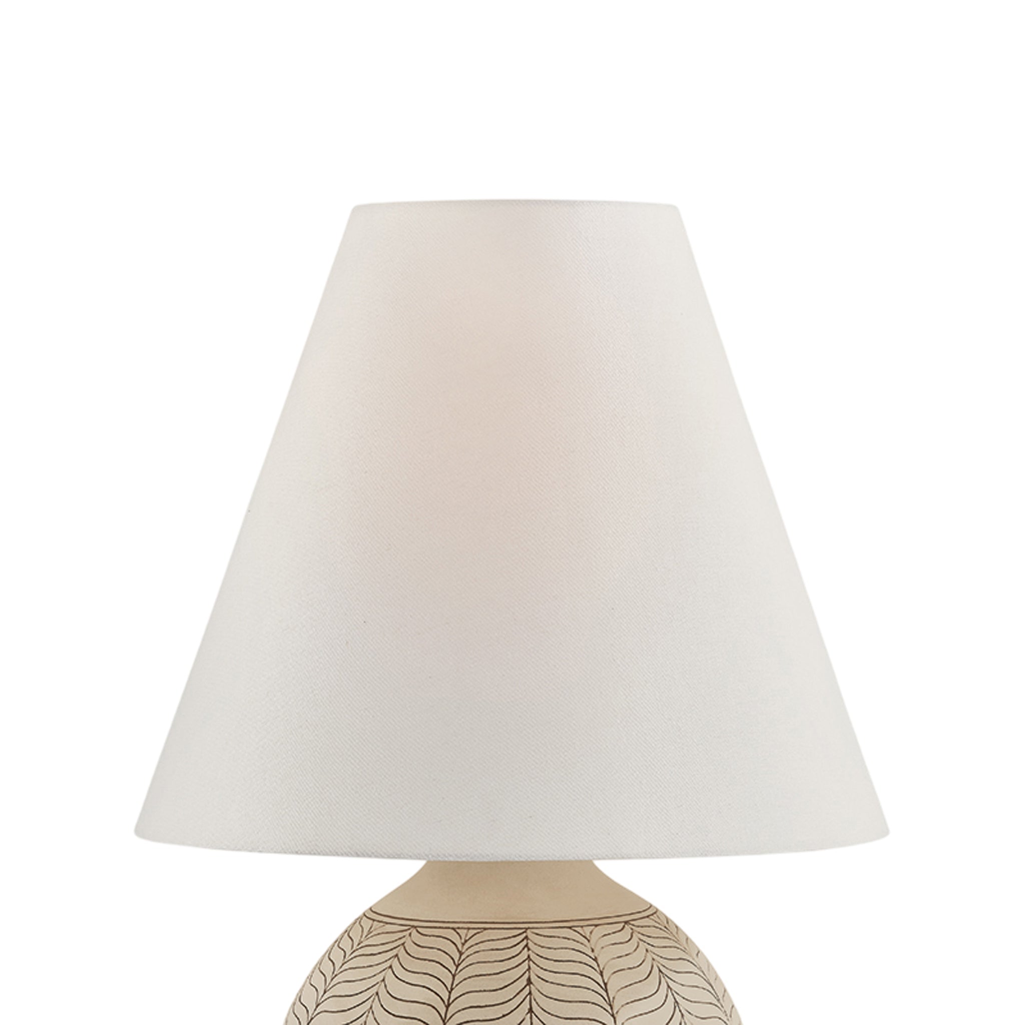 A nod to the pronounced, earthy forms of vintage 1960s lamps, Capers features a decorative botanical motif with a dense, leaf-like repeating pattern. The oversized Ivory Petal Ceramic base exudes a playful presence while the exaggerated scale of the natural linen lampshade pushes the silhouette beyond the expected. With subtle Aged Brass/Ceramic Ivory Petal metalwork, Capers balances sophistication with ease as a true signature of this collection. Cortney Bishop for Hudson Valley Lighting.