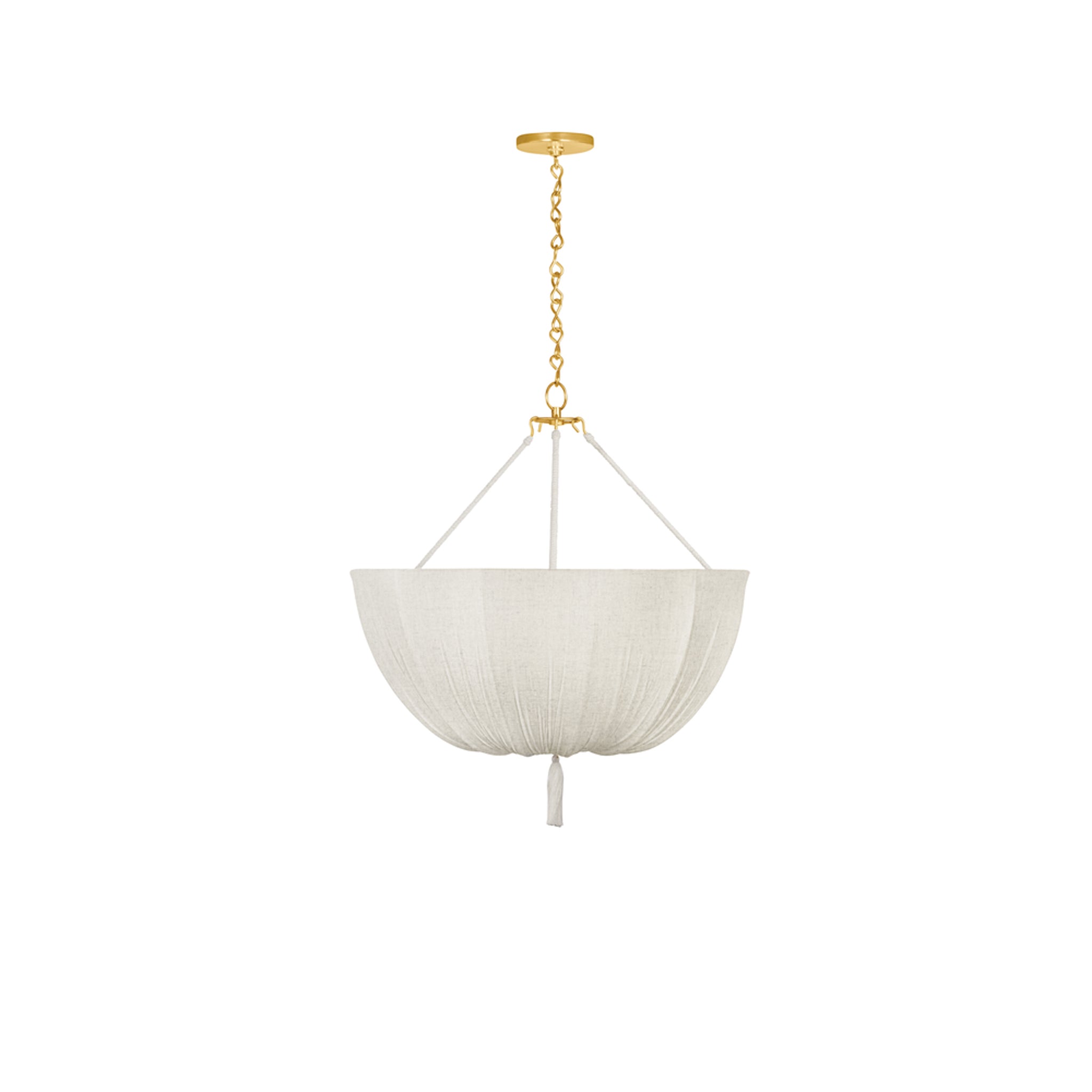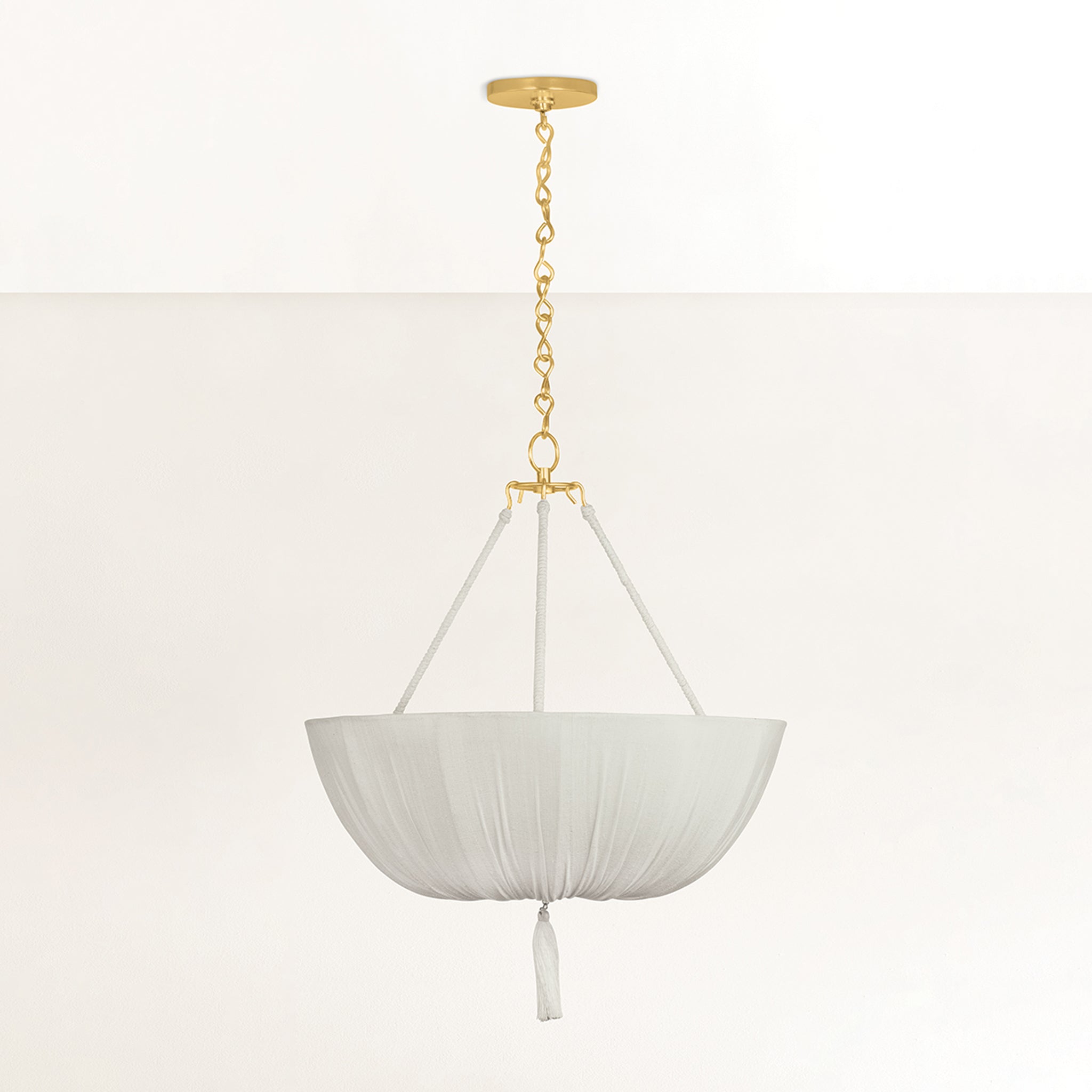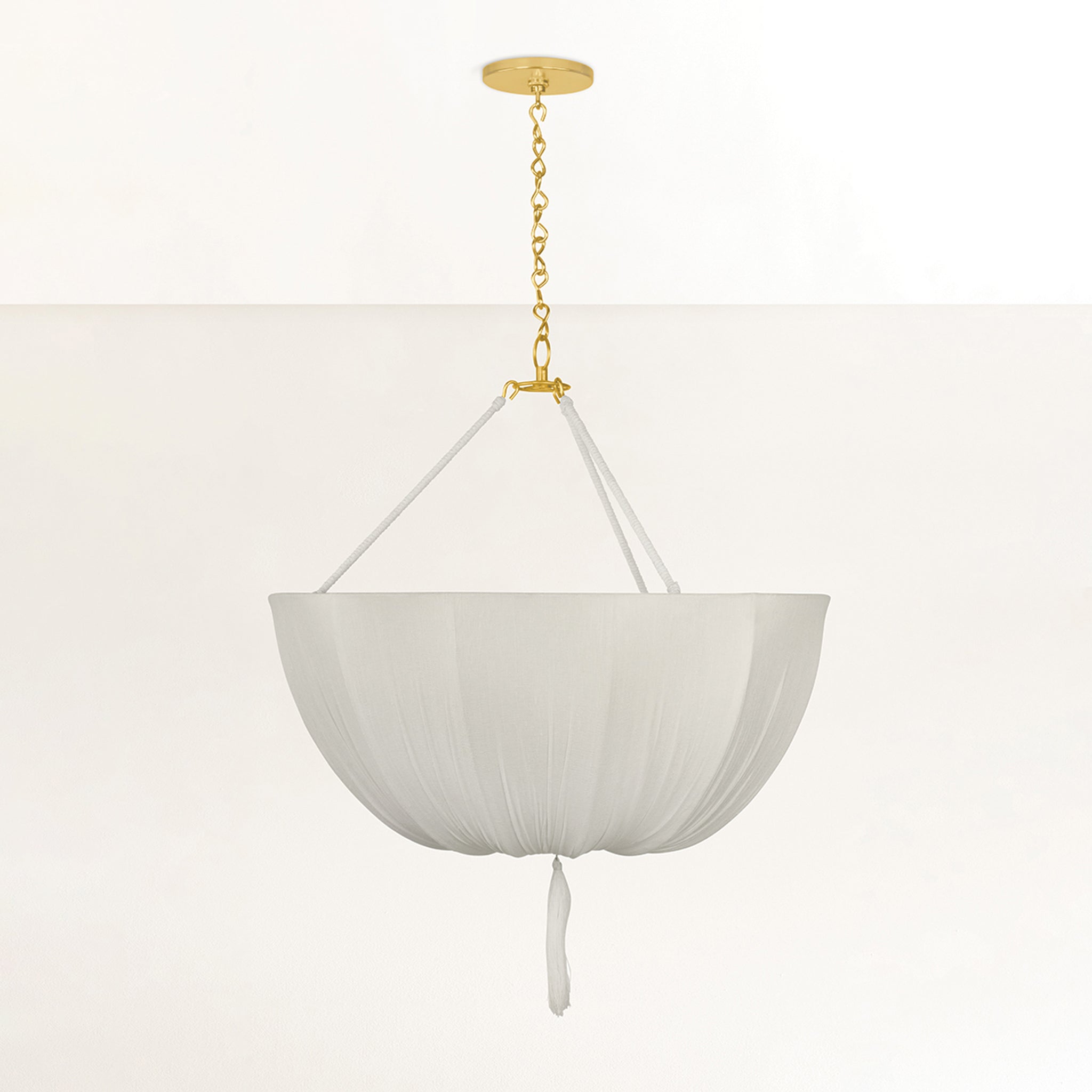 The Carolina pendant explores proportion and materiality with quiet confidence. The generous, soft form of the raw silk is eye-catching and special as it overlays a clear etched glass shade. The wrapped rods and matching tassel further add to the striking, airy material story. Accented by Aged Brass hardware, Carolina's warm, luxurious presence makes for a dreamy piece in dining areas and bedrooms. Cortney Bishop for Hudson Valley Lighting.