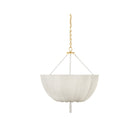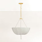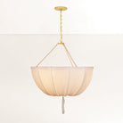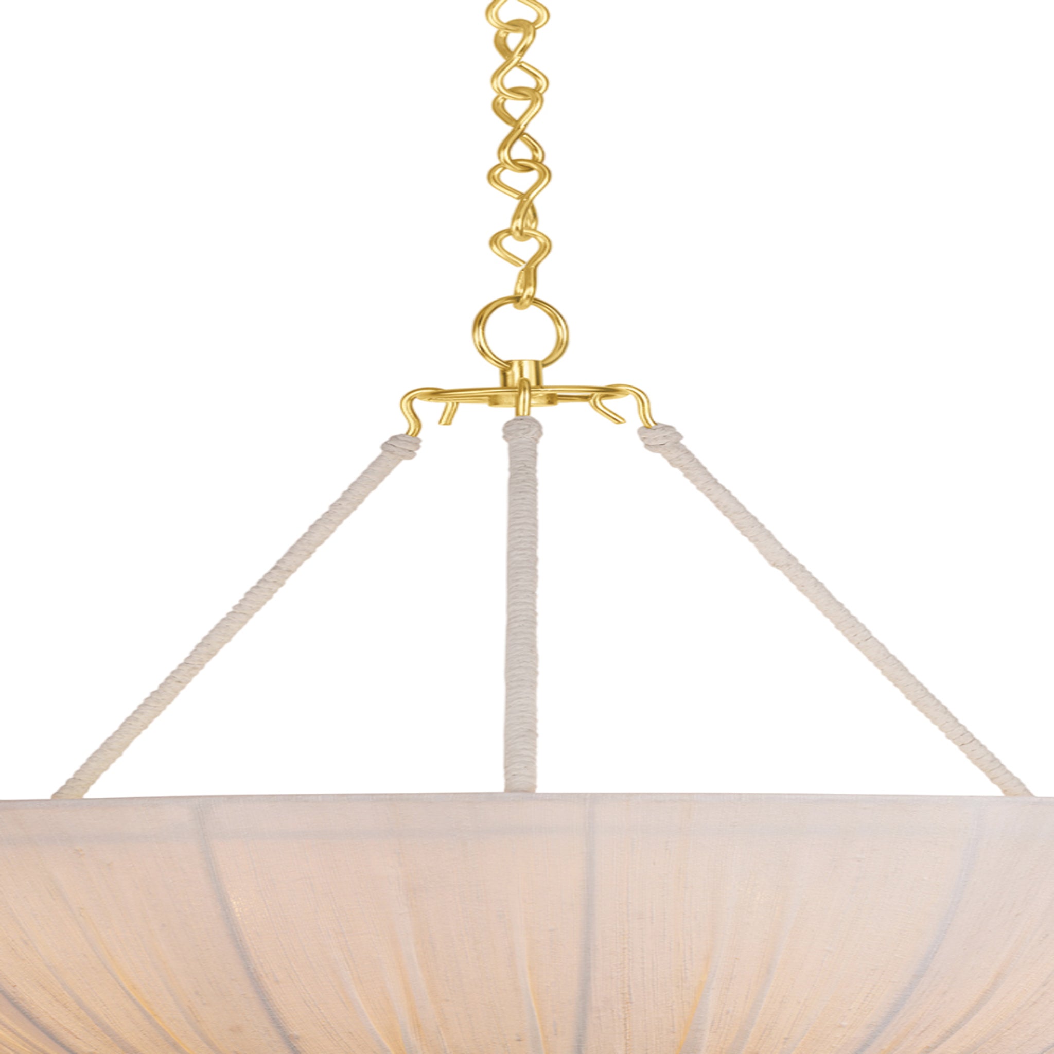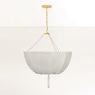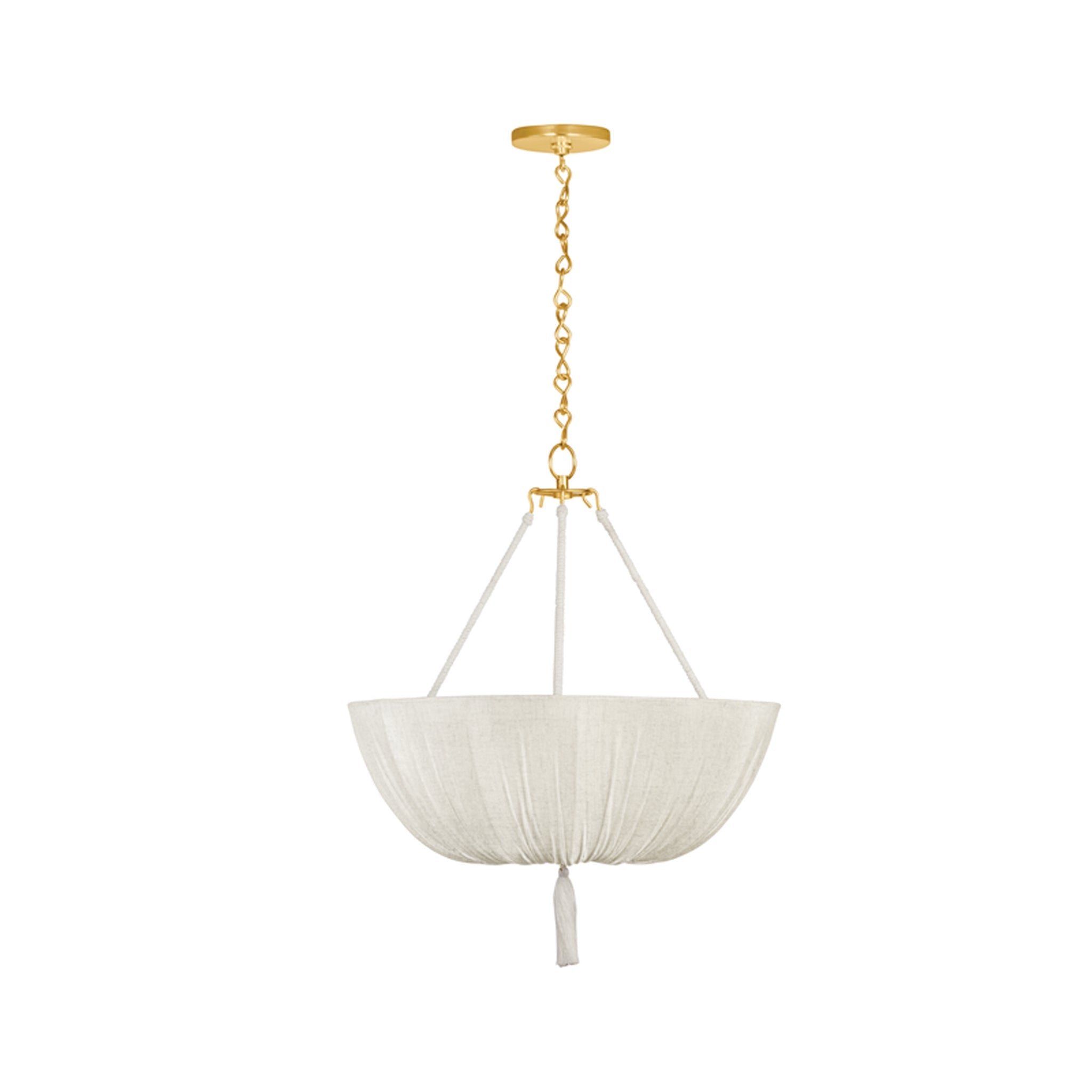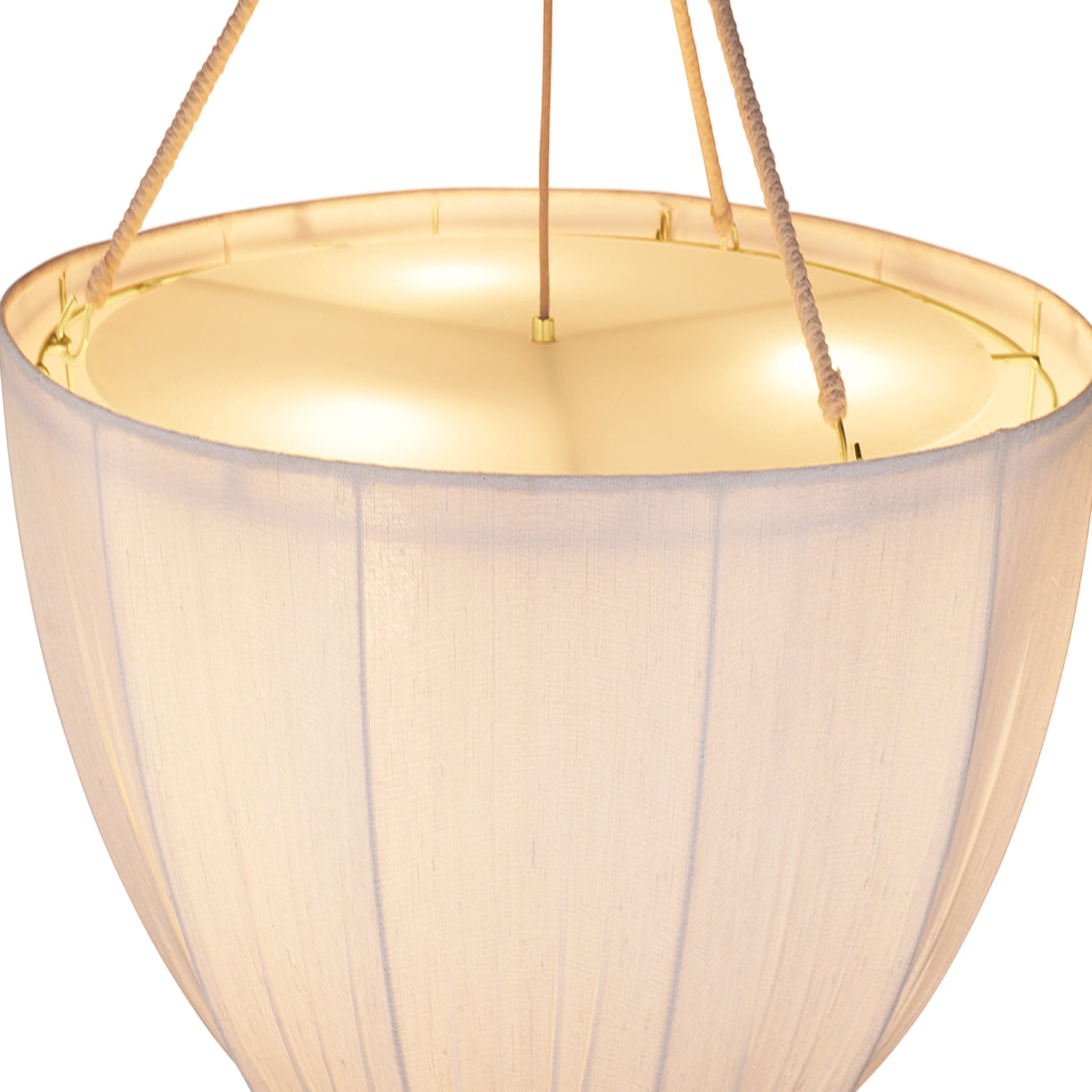 The Carolina pendant explores proportion and materiality with quiet confidence. The generous, soft form of the raw silk is eye-catching and special as it overlays a clear etched glass shade. The wrapped rods and matching tassel further add to the striking, airy material story. Accented by Aged Brass hardware, Carolina's warm, luxurious presence makes for a dreamy piece in dining areas and bedrooms. Cortney Bishop for Hudson Valley Lighting.