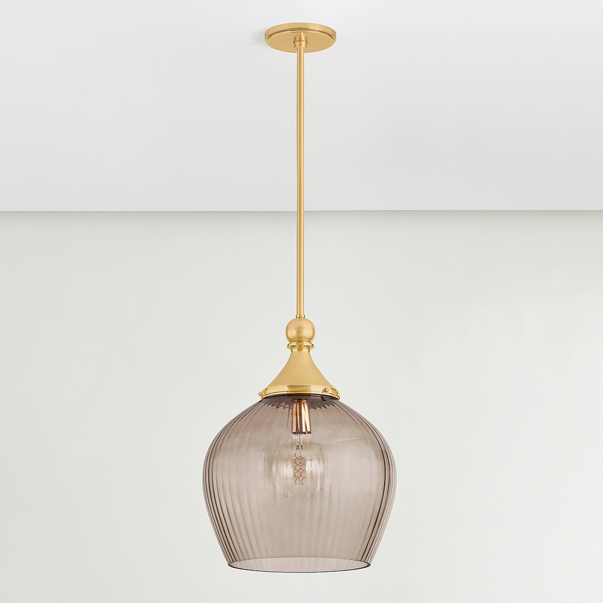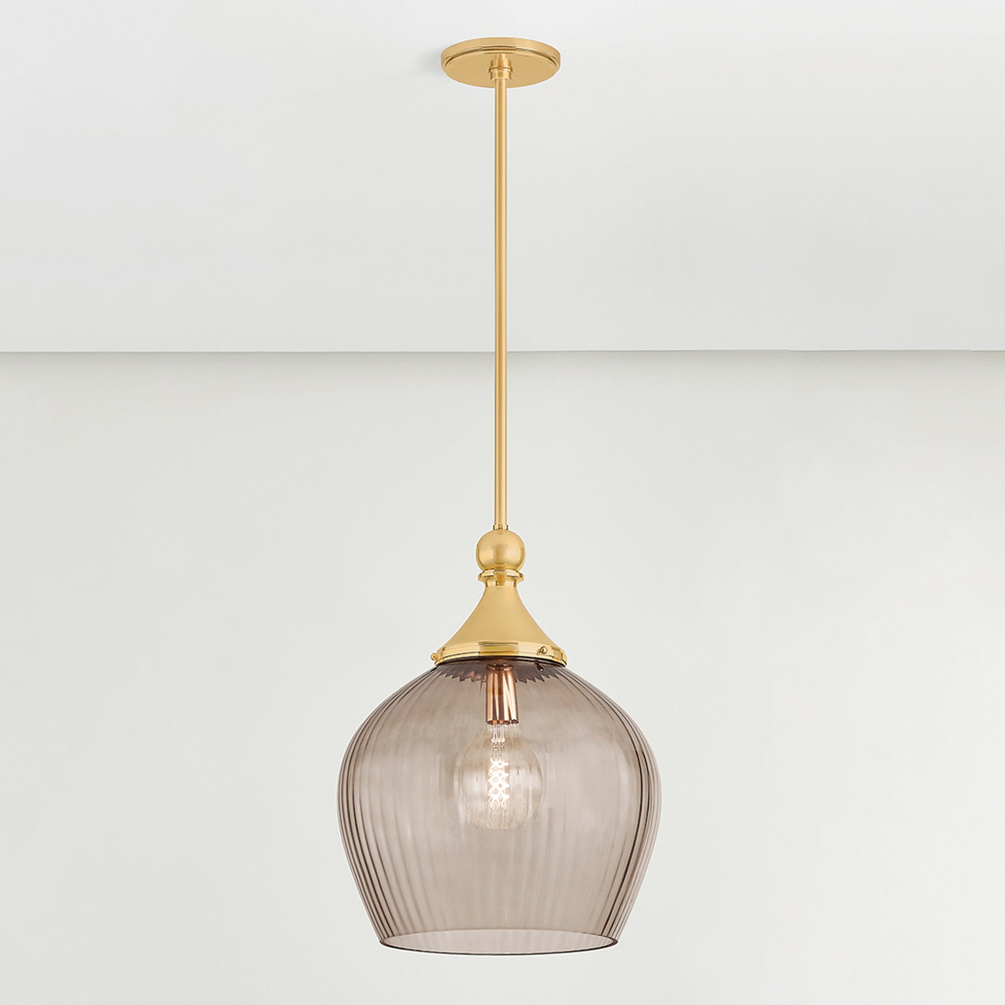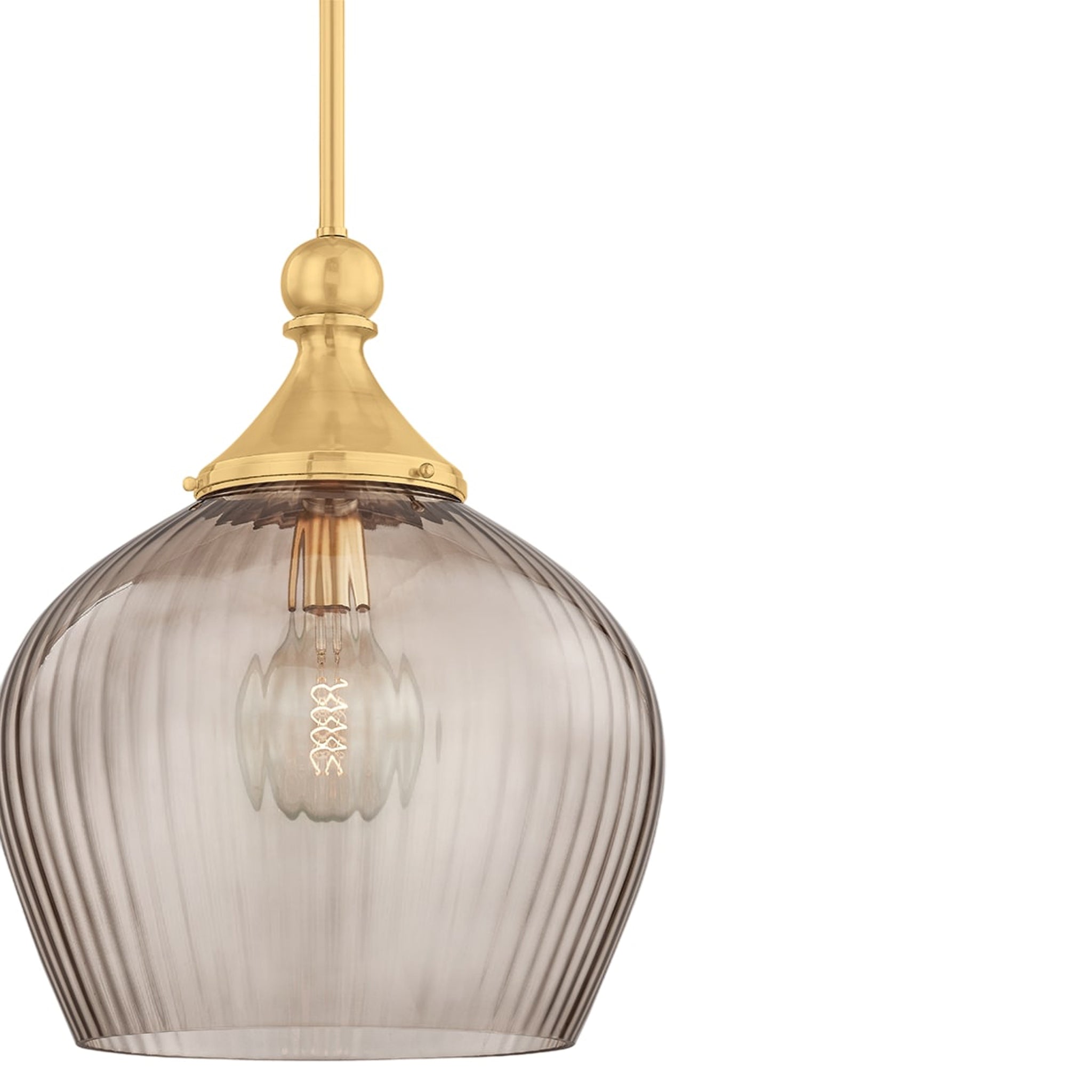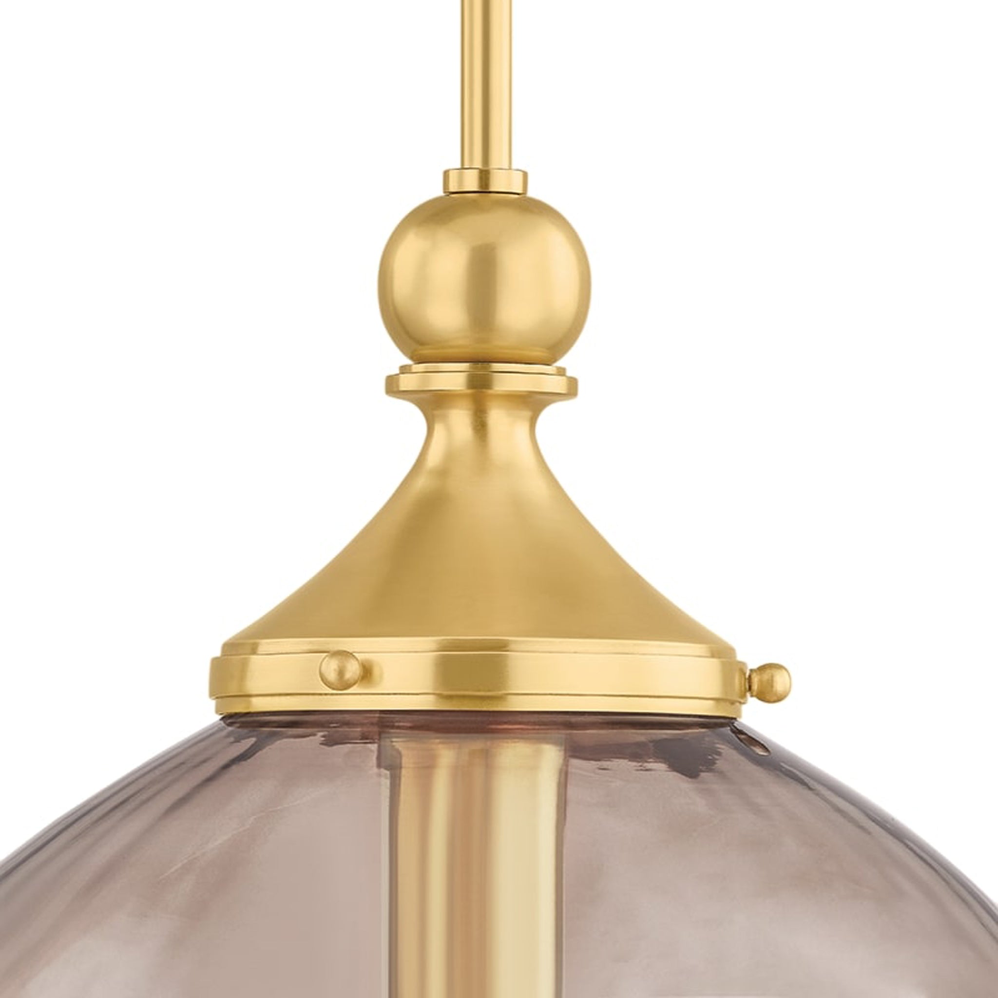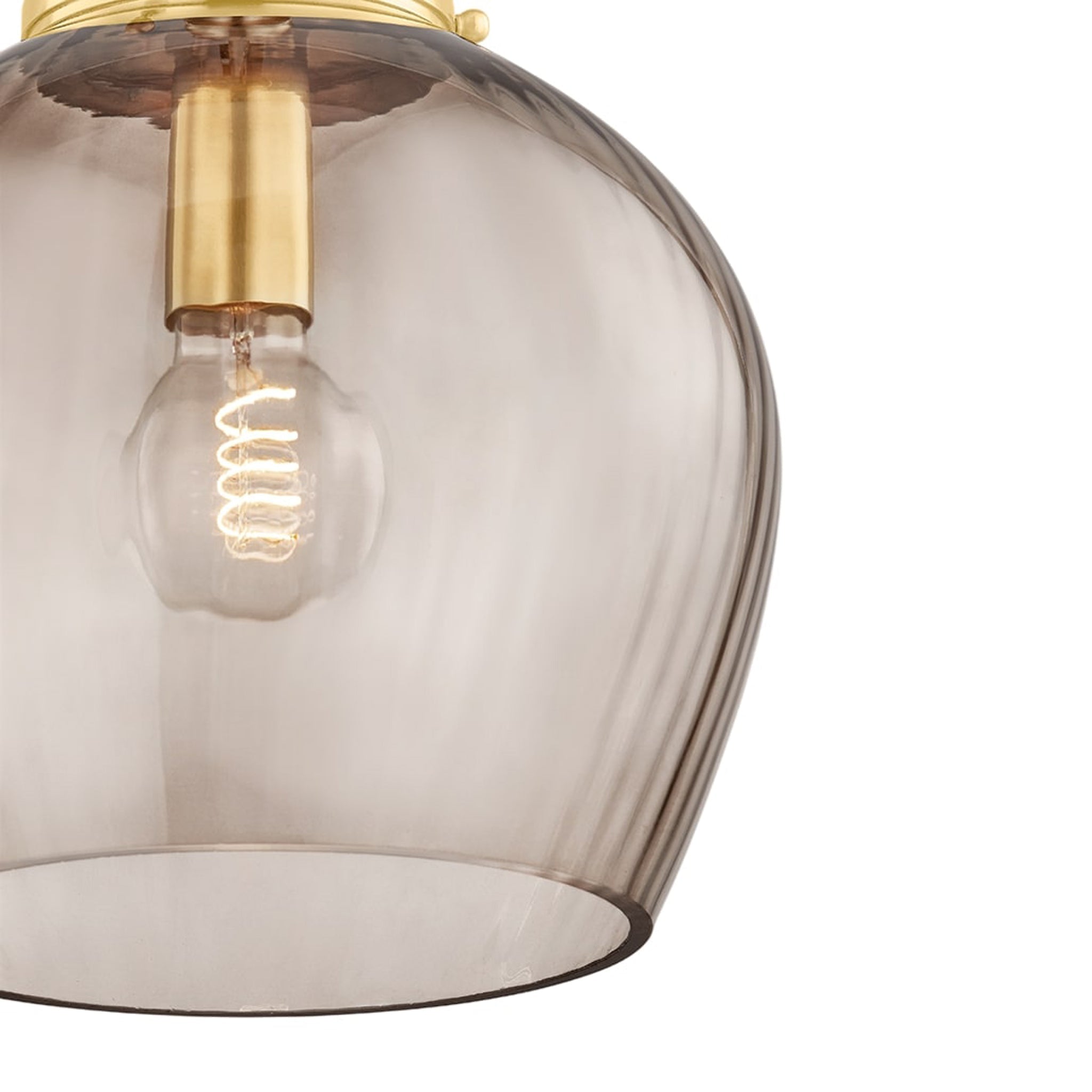The elegance of vintage Art Deco style blooms to life in the glamorous Chatton family. Blown from light bronze fluted glass, the tulip-shaped shade provides a delicate companion to the graceful metalwork finished in Aged Brass. Considered details like the graceful gooseneck arm on the sconce, and a large bead-like sphere accent further the botanical motif. Available as a sconce or pendant in two sizes, Chatton brings an area into focus with its whimsical ways.