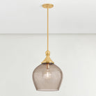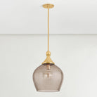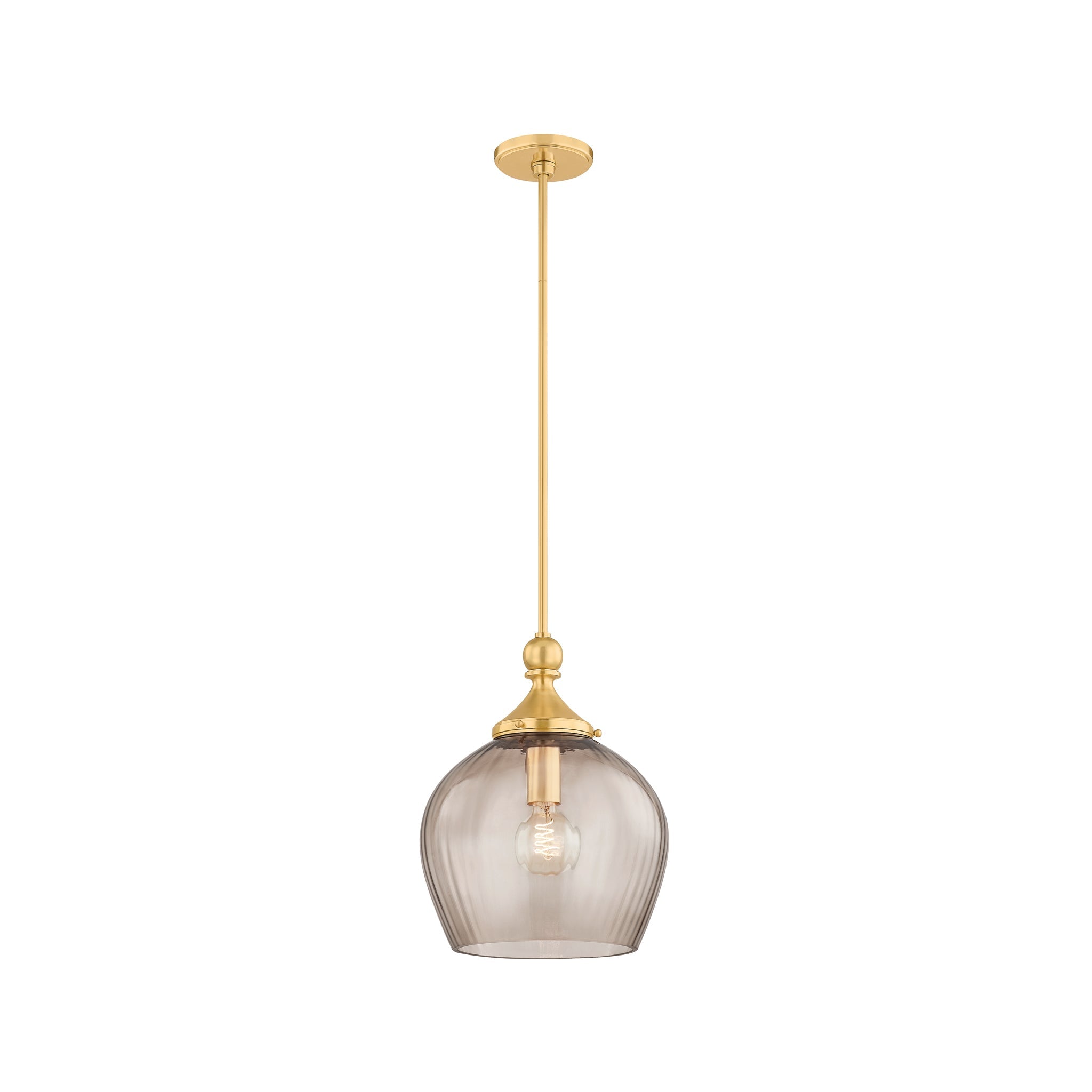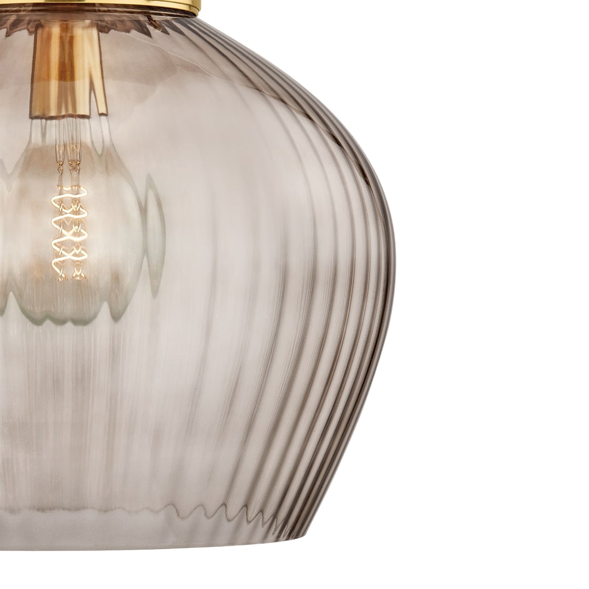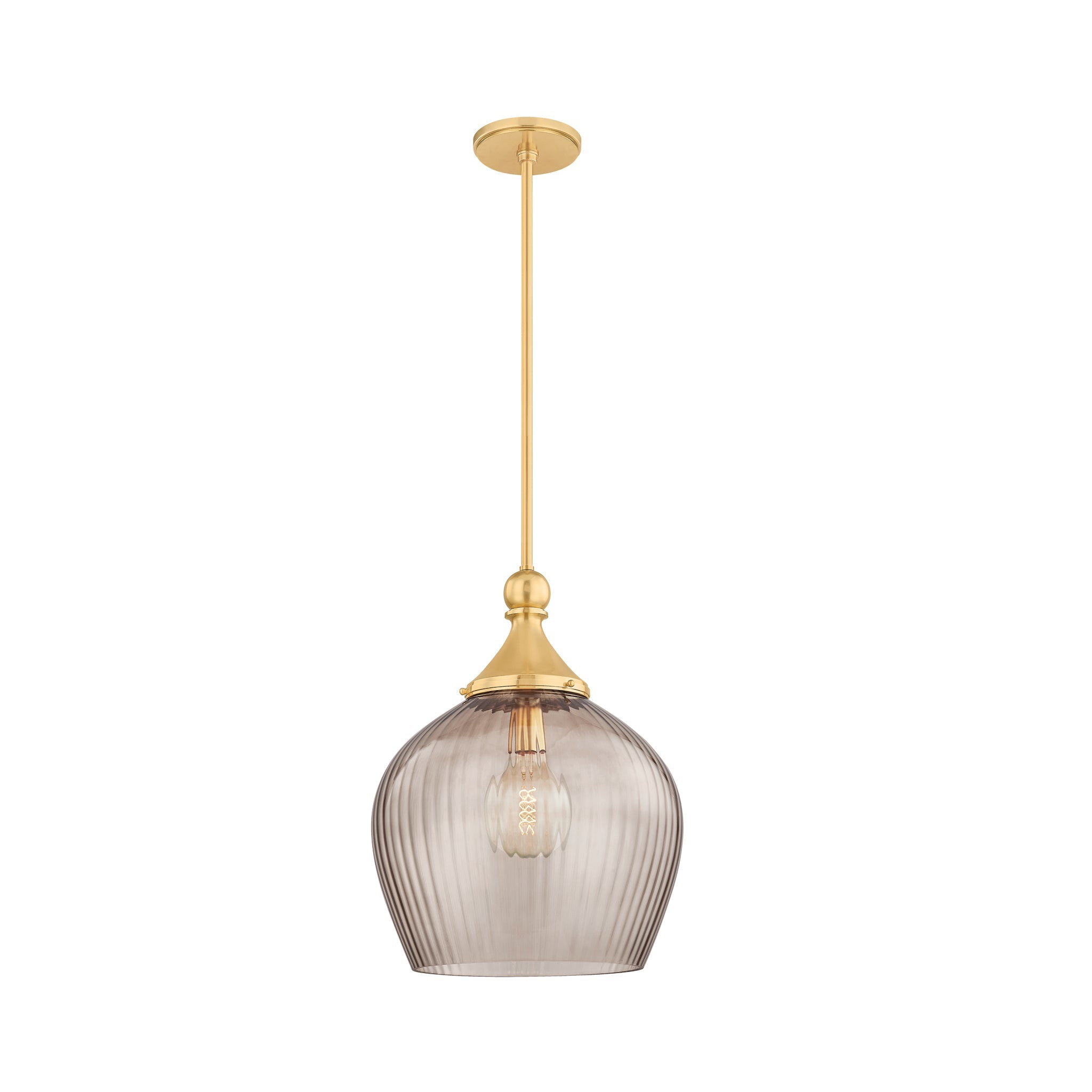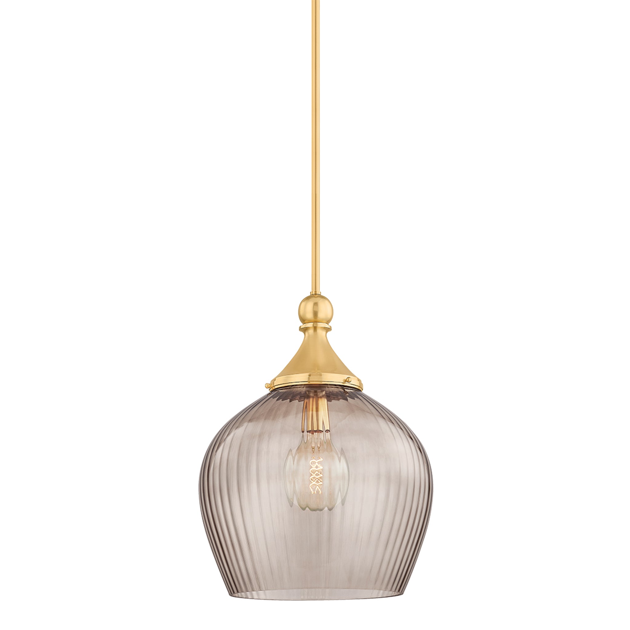 The elegance of vintage Art Deco style blooms to life in the glamorous Chatton family. Blown from light bronze fluted glass, the tulip-shaped shade provides a delicate companion to the graceful metalwork finished in Aged Brass. Considered details like the graceful gooseneck arm on the sconce, and a large bead-like sphere accent further the botanical motif. Available as a sconce or pendant in two sizes, Chatton brings an area into focus with its whimsical ways.