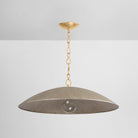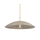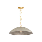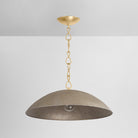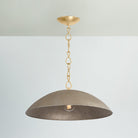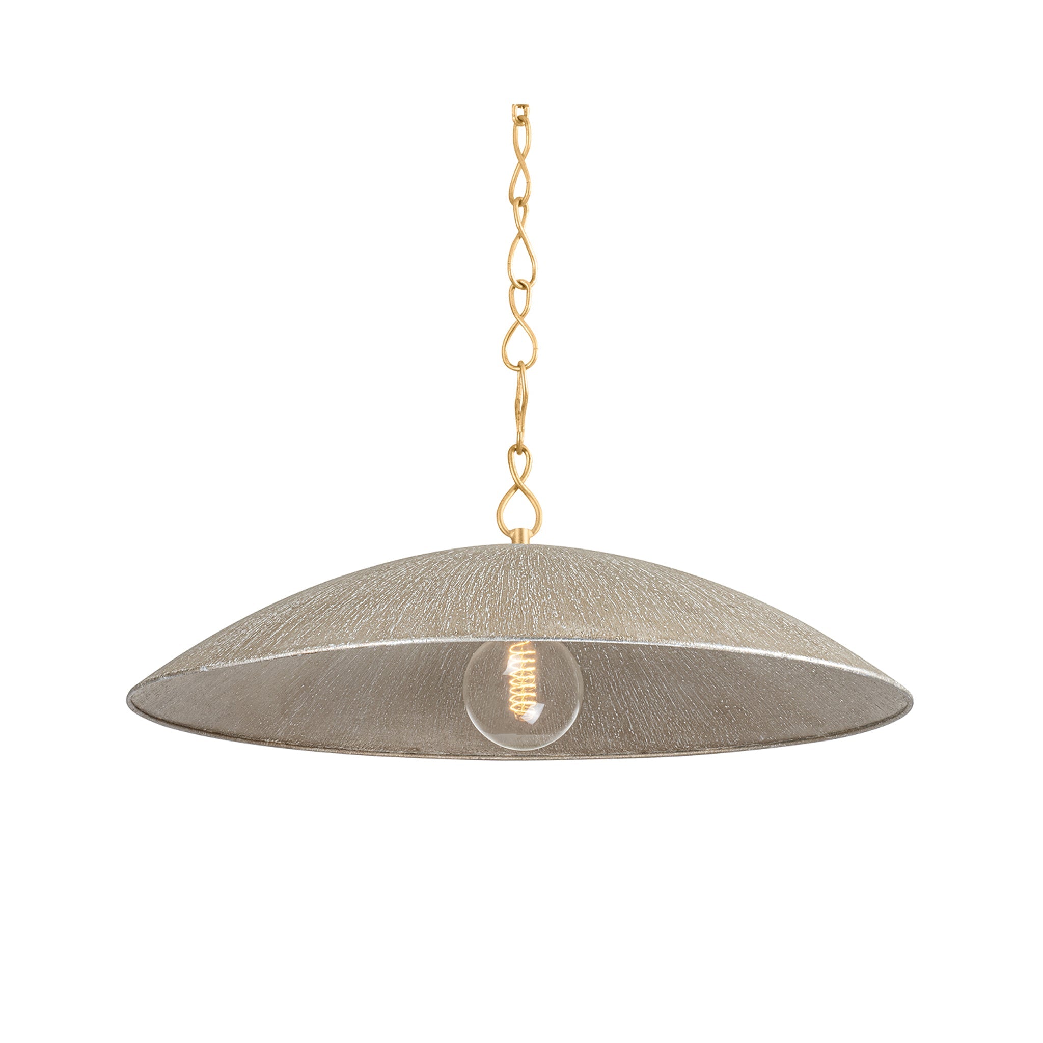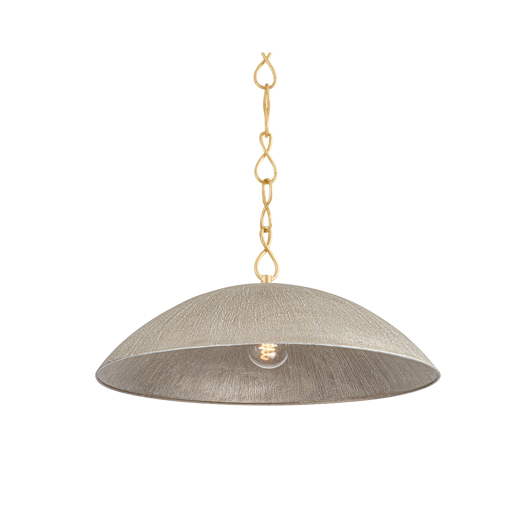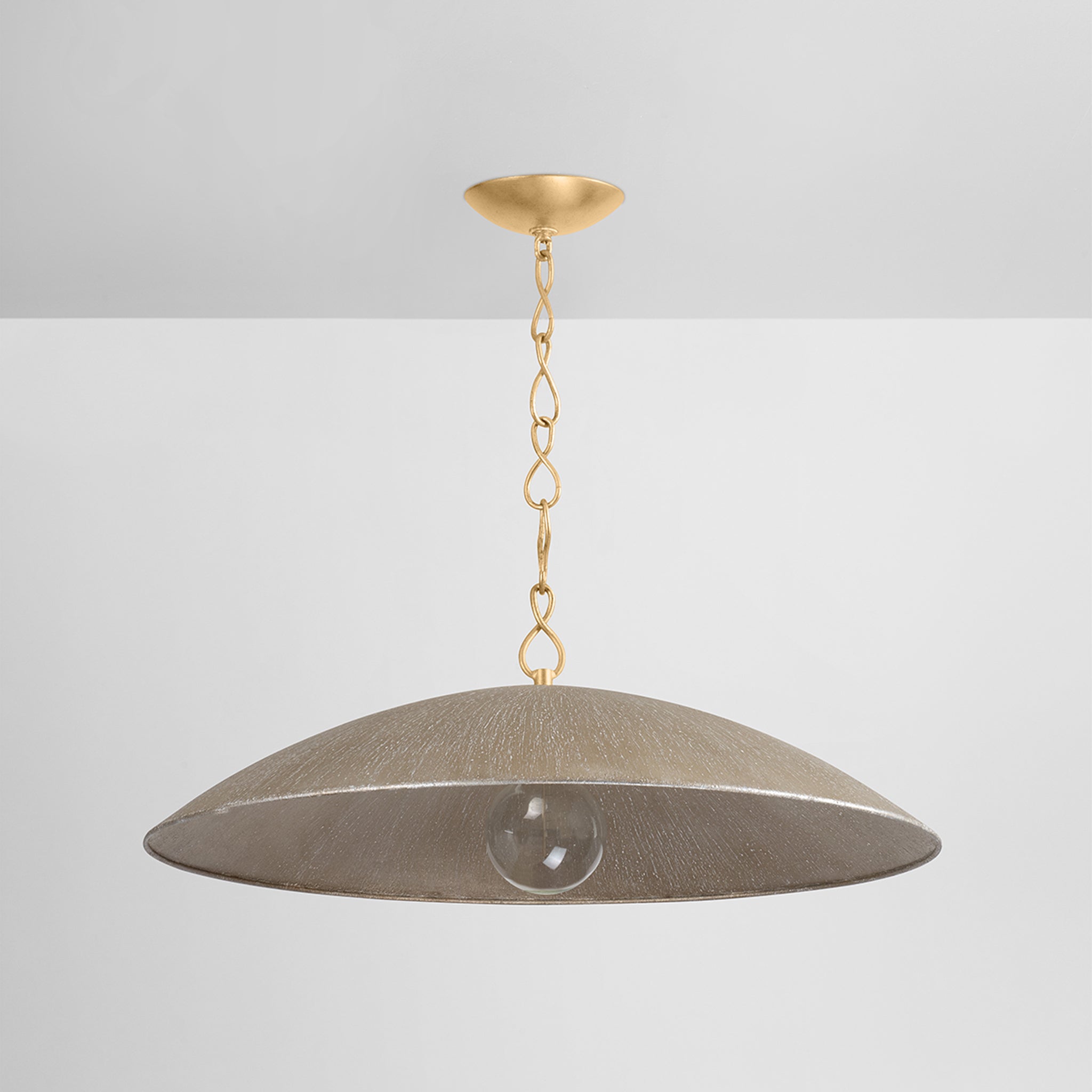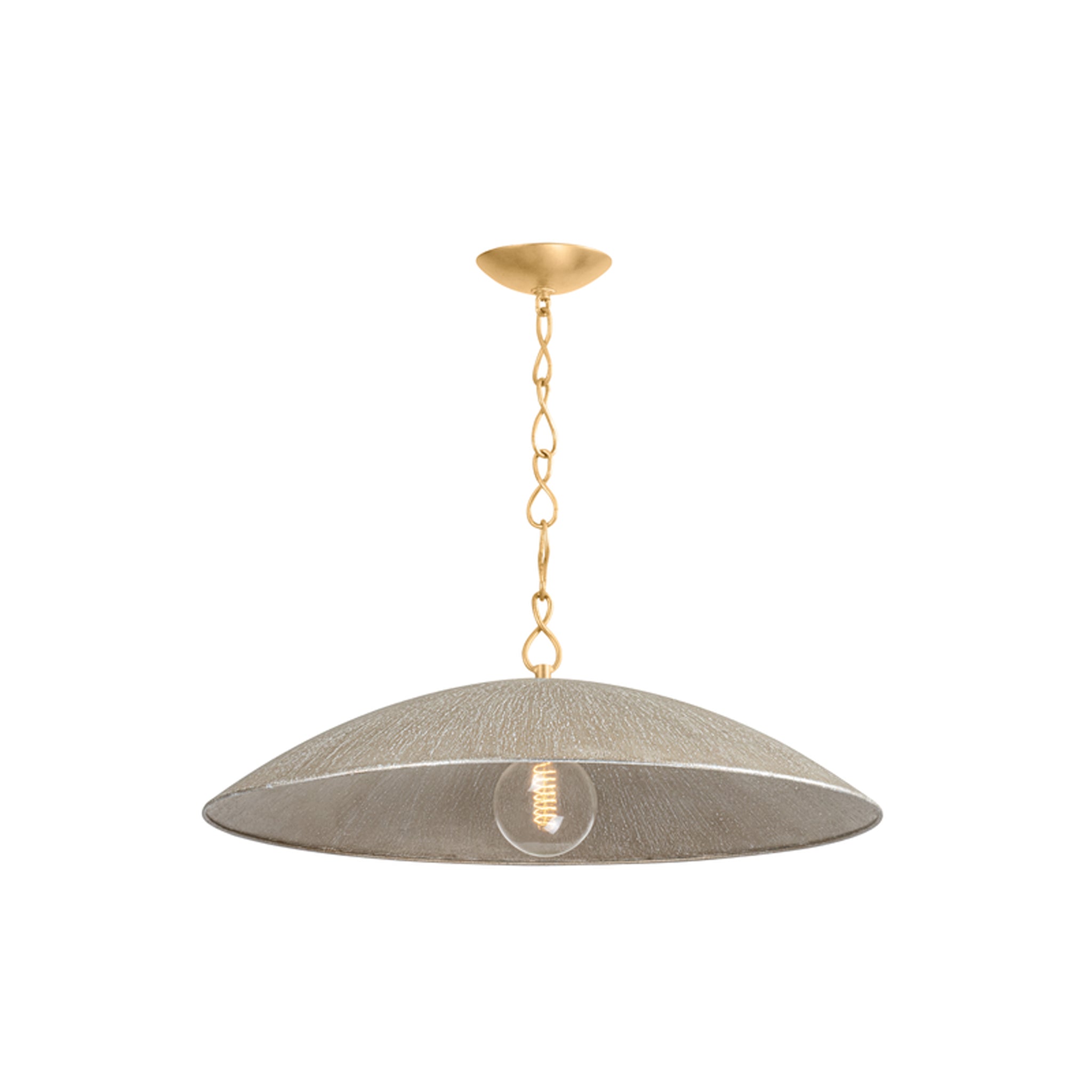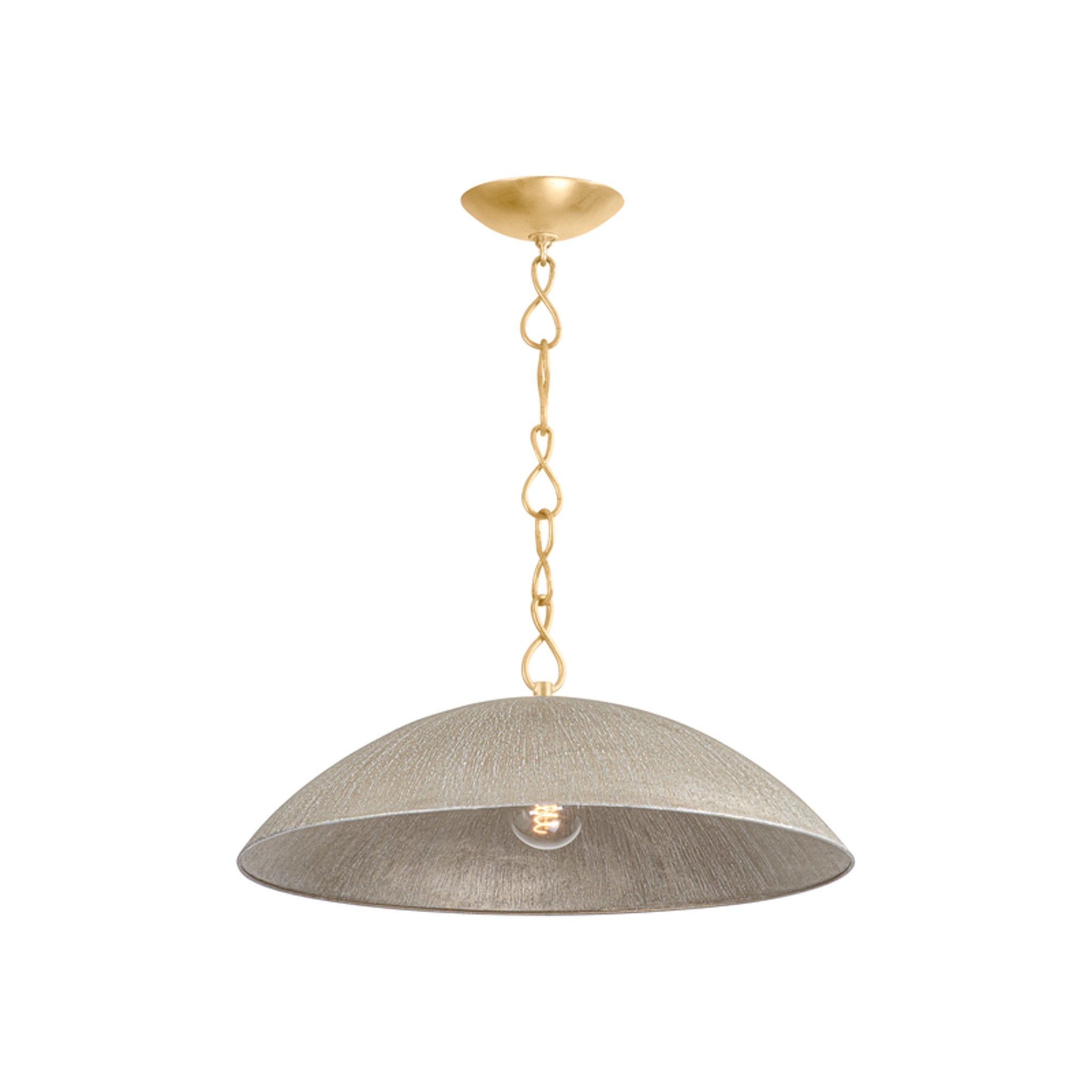 With a sculptural dome shape and thoughtful materiality, Eve embodies a purity of design. The subtle interplay of the Textured Warm Silver Leaf exterior with the Vintage Vintage Gold Leaf/ Textured Warm Silver Leaf interior creates a stylish finish that feels organic and fresh. In both available sizes, this pendant light creates an impact with its warm glow and understated elegance. Becki Owens for Hudson Valley Lighting.