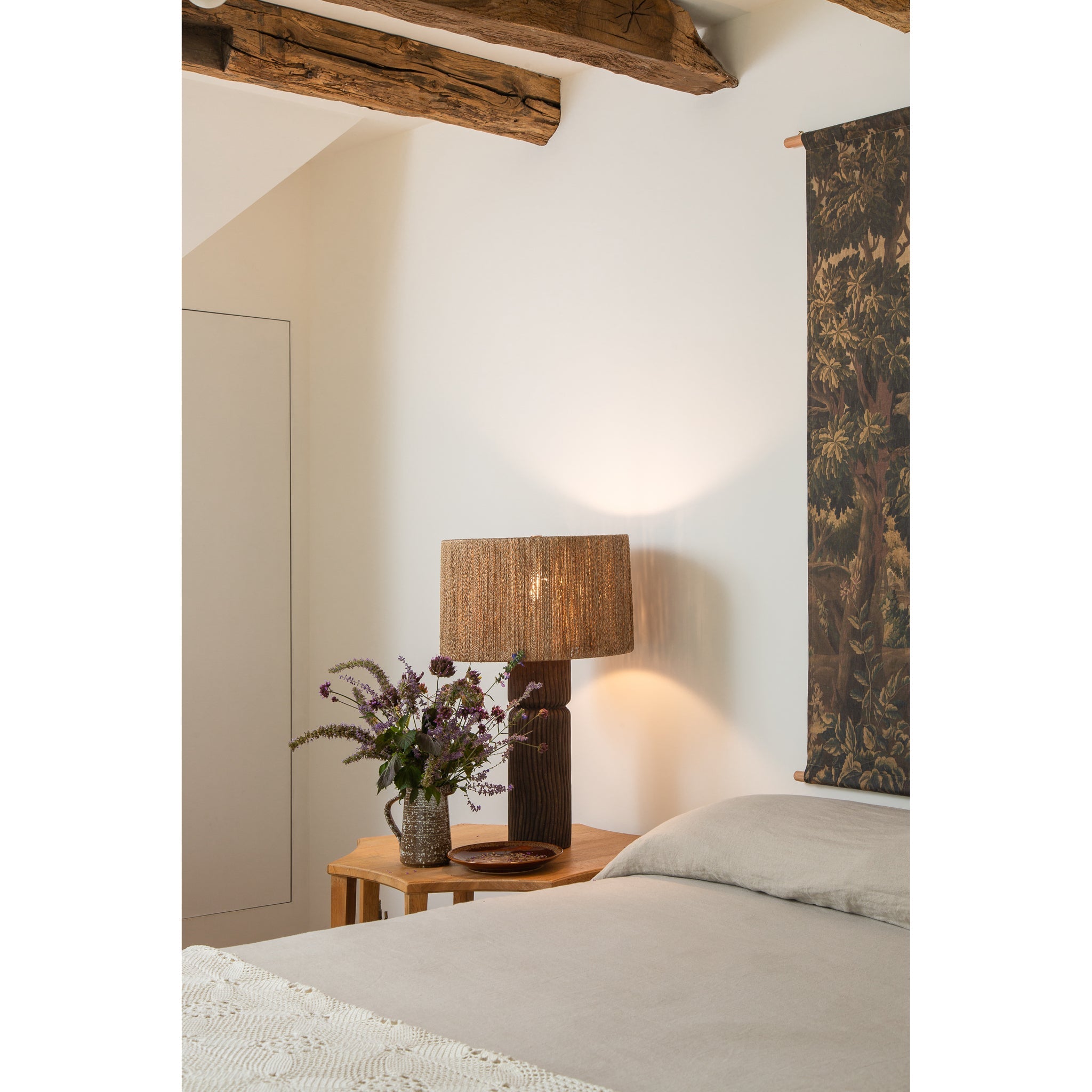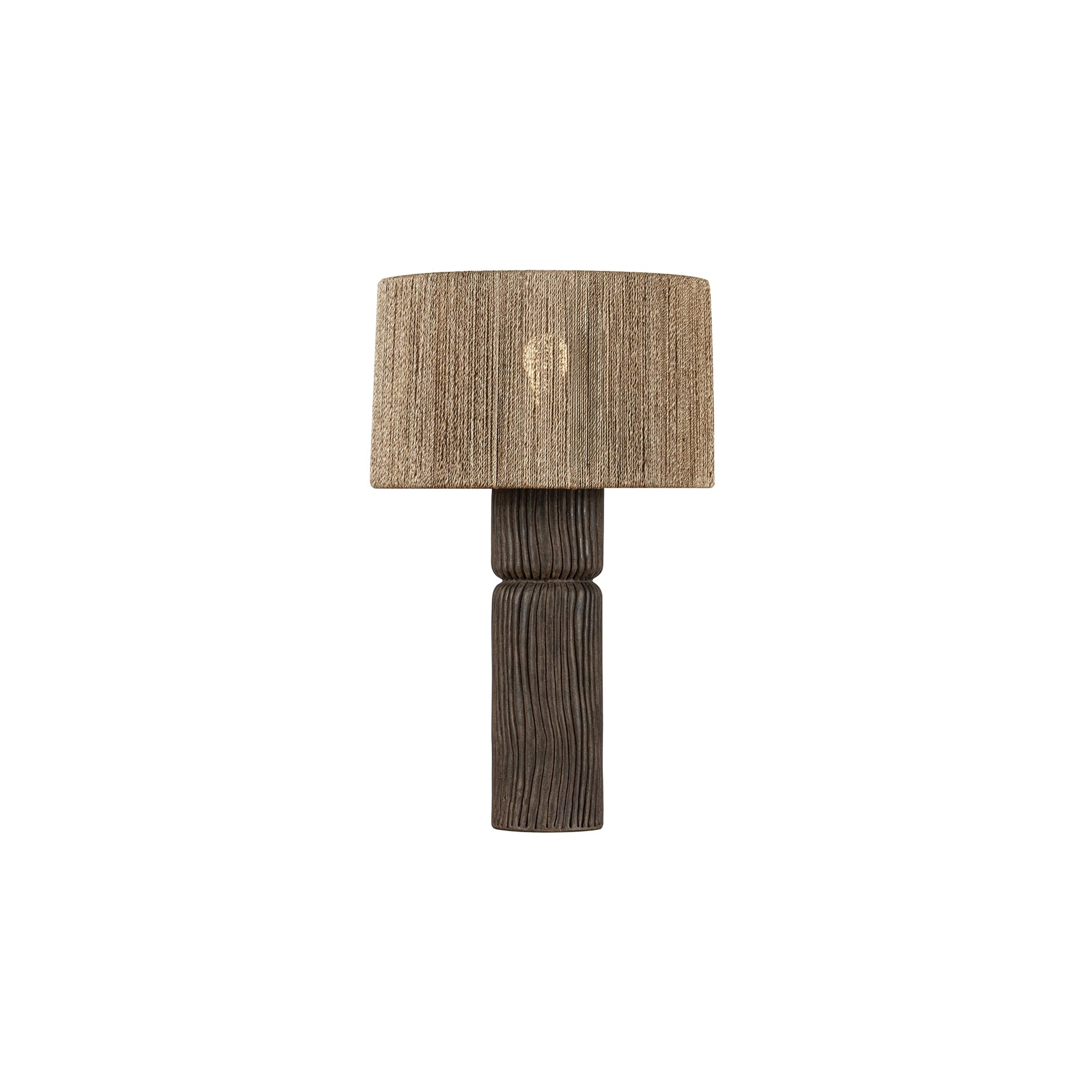 Celebrating natural texture and form, the Folk lamp pairs an earthy ceramic base with a handwoven abaca string shade. Raked grooves along the cylindrical base echo the shade's flowing strands, creating sculptural harmony and vertical movement. Patina Brass hardware adds a subtle touch of refinement to this richly layered design.