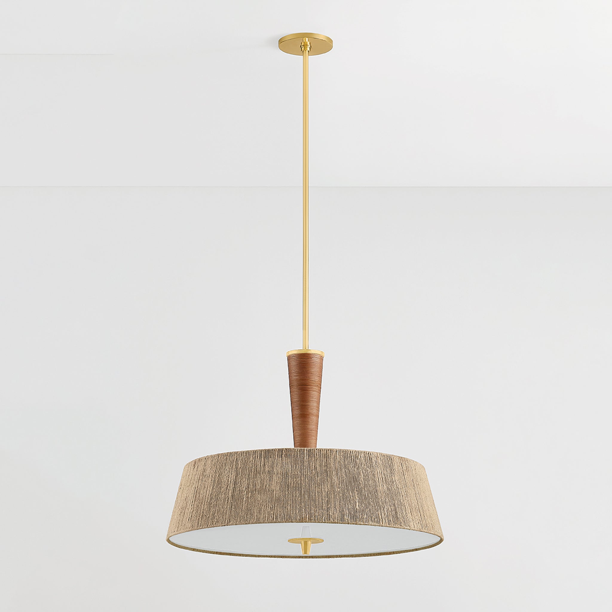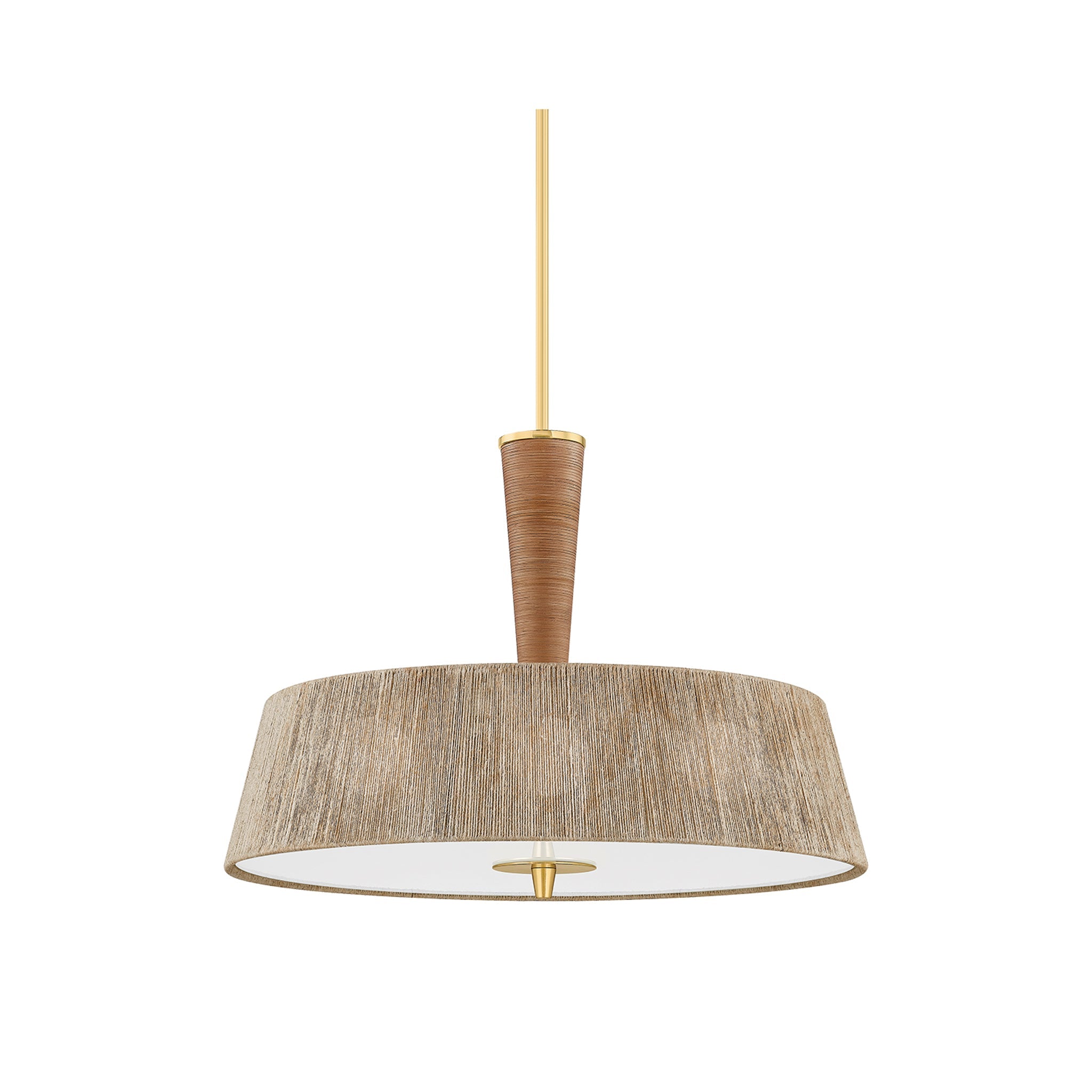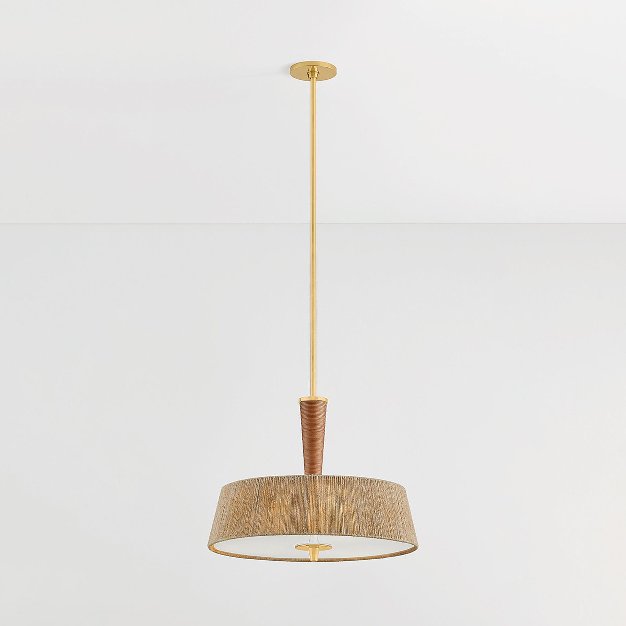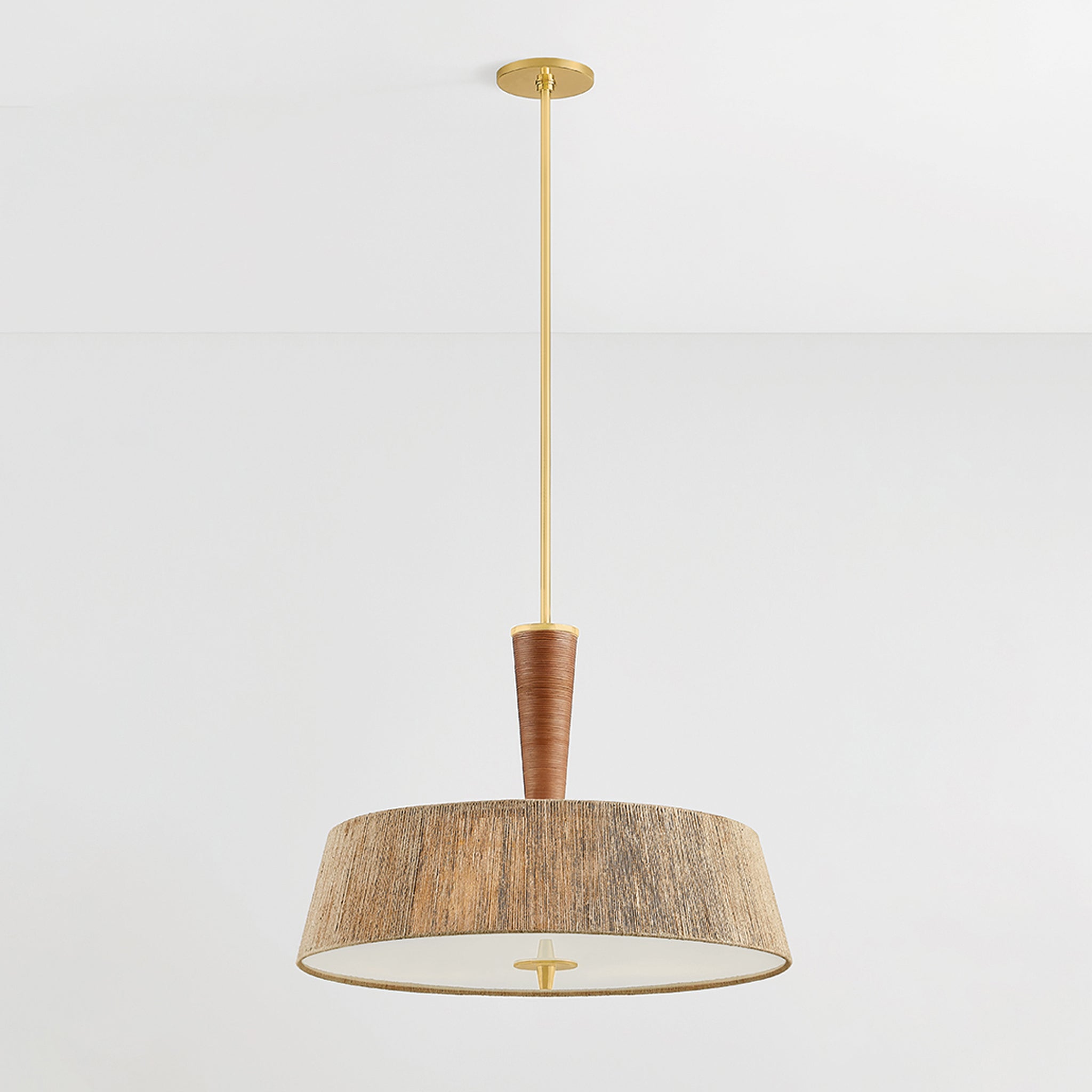 The George family of ceiling lights are boldly scaled and texturally inviting. The combination of the banana leaf string shade, rattan wrapping, and white glass gives each fixture a bohemian feel while remaining sophisticated. The natural, tonal hues enhance the rustic effect, while the Aged Brass metalwork is a timeless finish. Suitable for larger spaces, George introduces an organic freshness to entries and dining areas. Cortney Bishop for Hudson Valley Lighting.