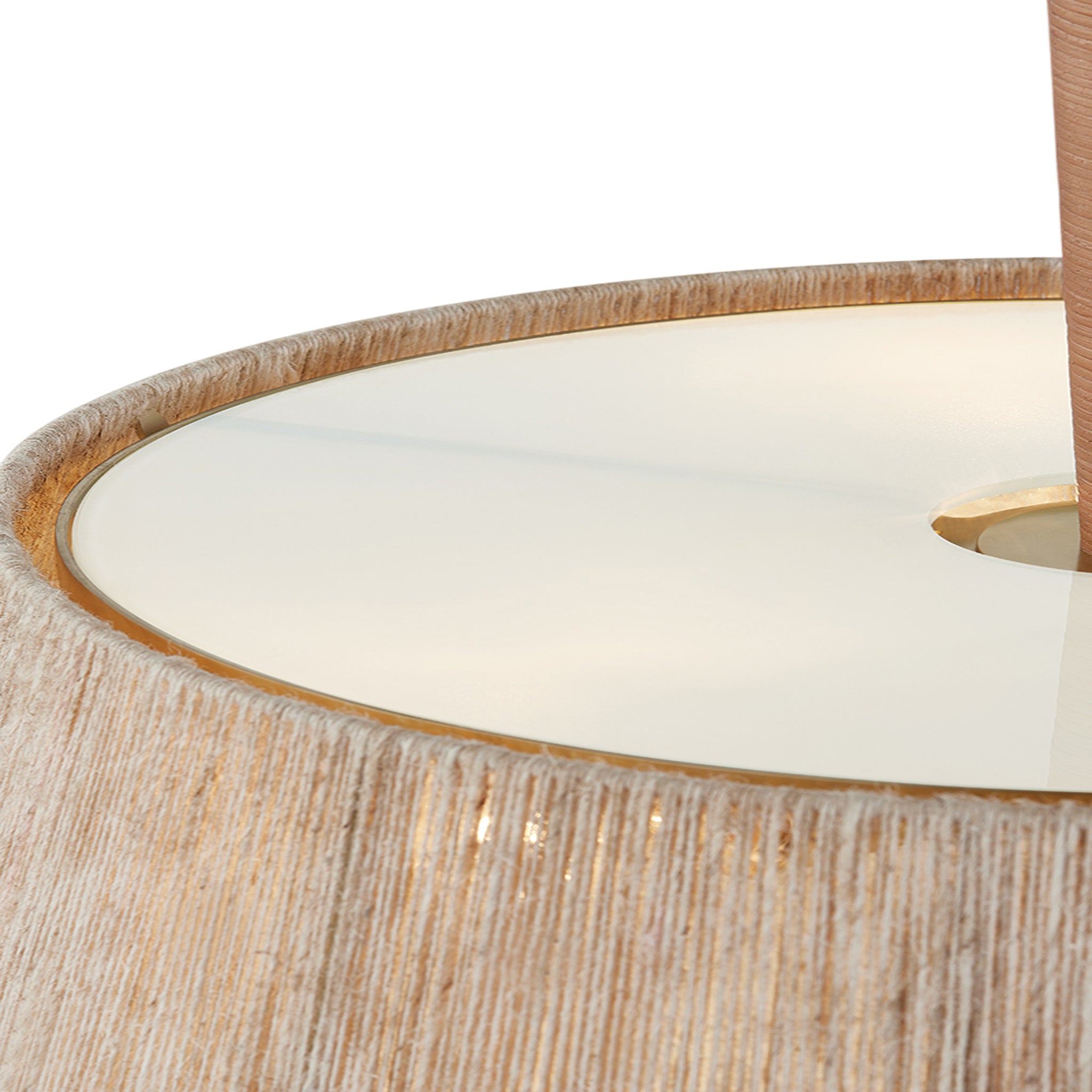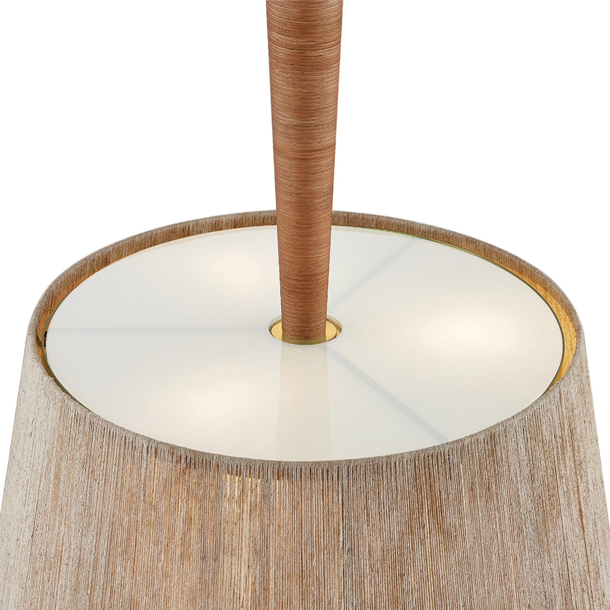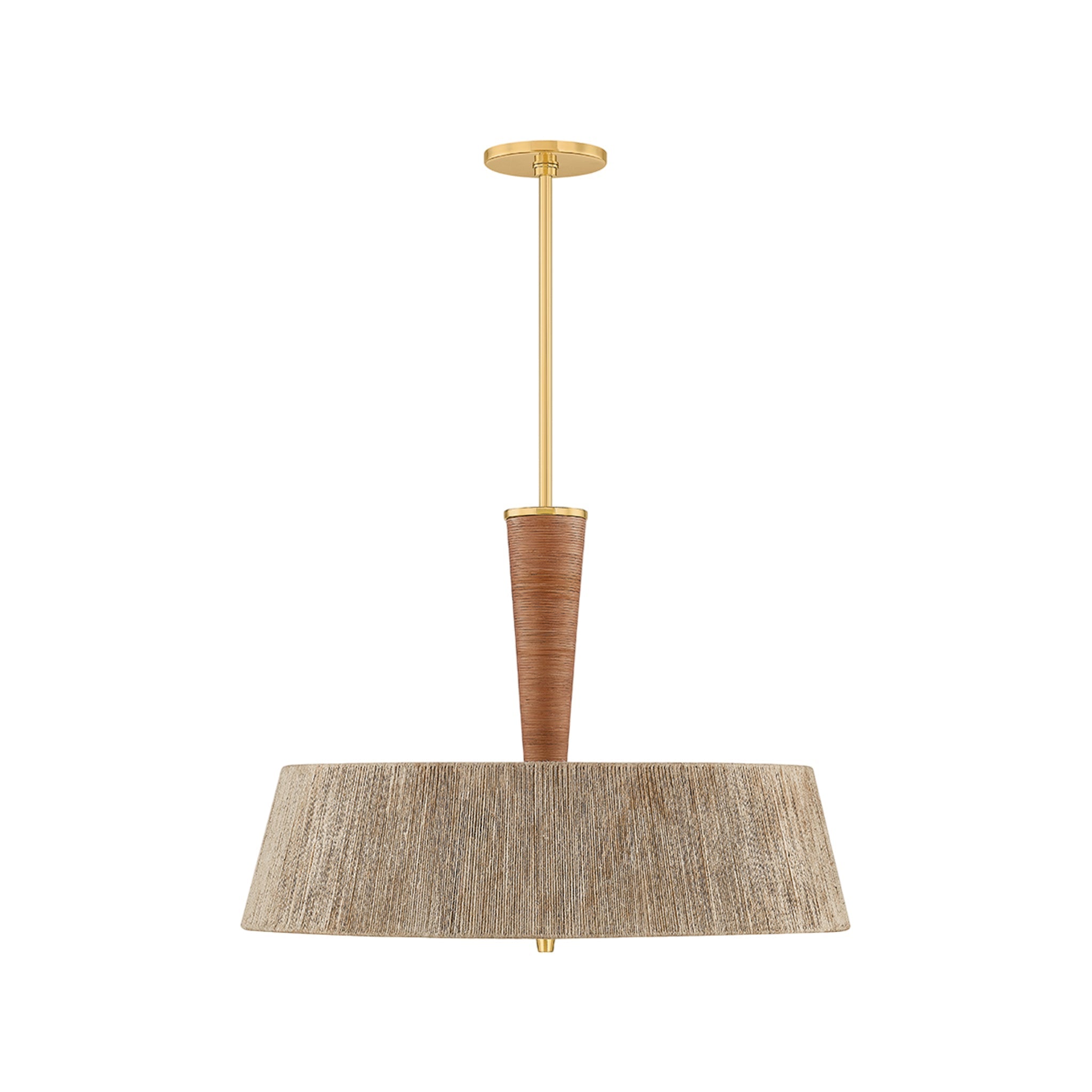 The George family of ceiling lights are boldly scaled and texturally inviting. The combination of the banana leaf string shade, rattan wrapping, and white glass gives each fixture a bohemian feel while remaining sophisticated. The natural, tonal hues enhance the rustic effect, while the Aged Brass metalwork is a timeless finish. Suitable for larger spaces, George introduces an organic freshness to entries and dining areas. Cortney Bishop for Hudson Valley Lighting.