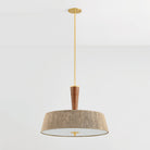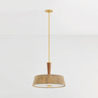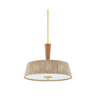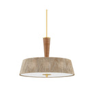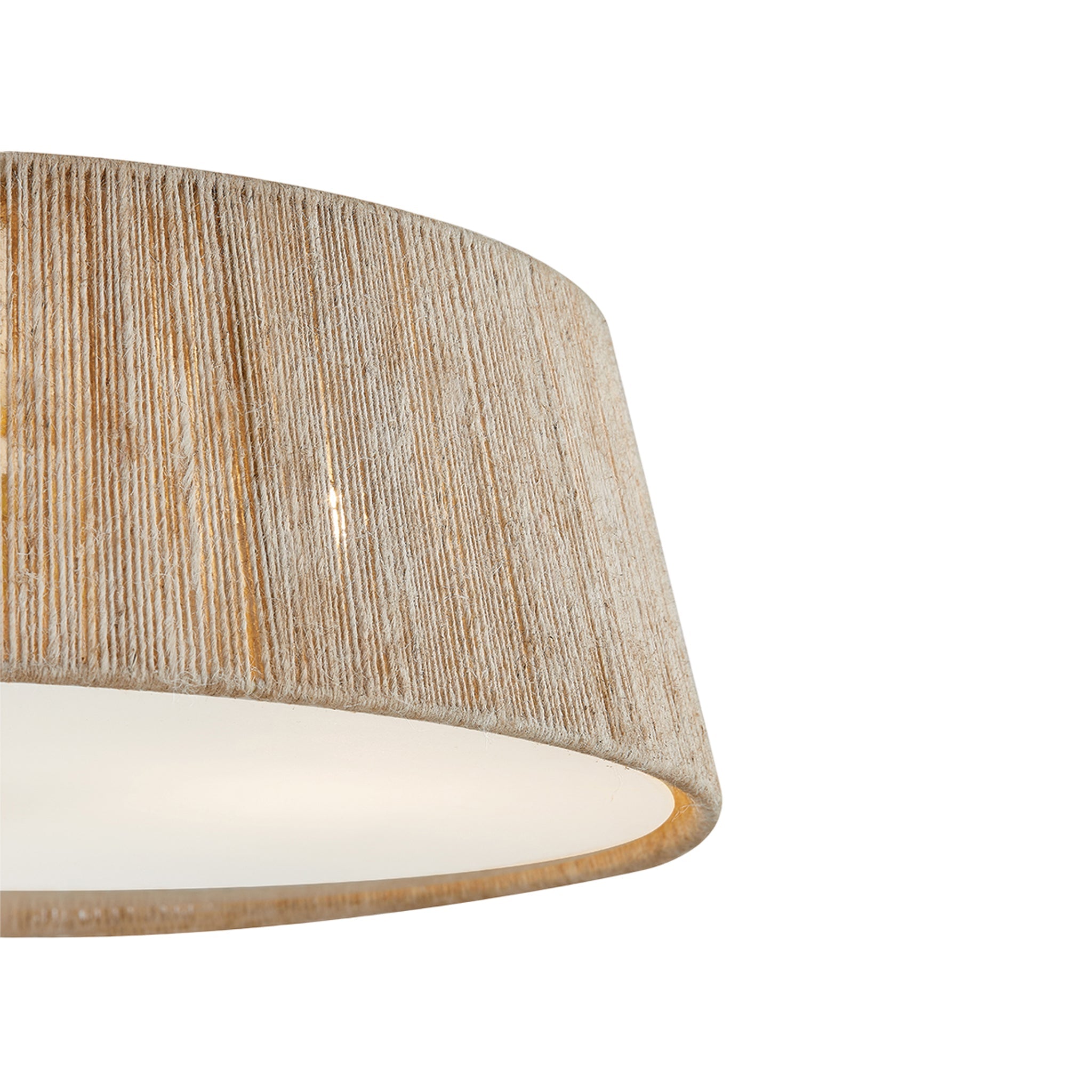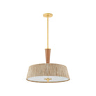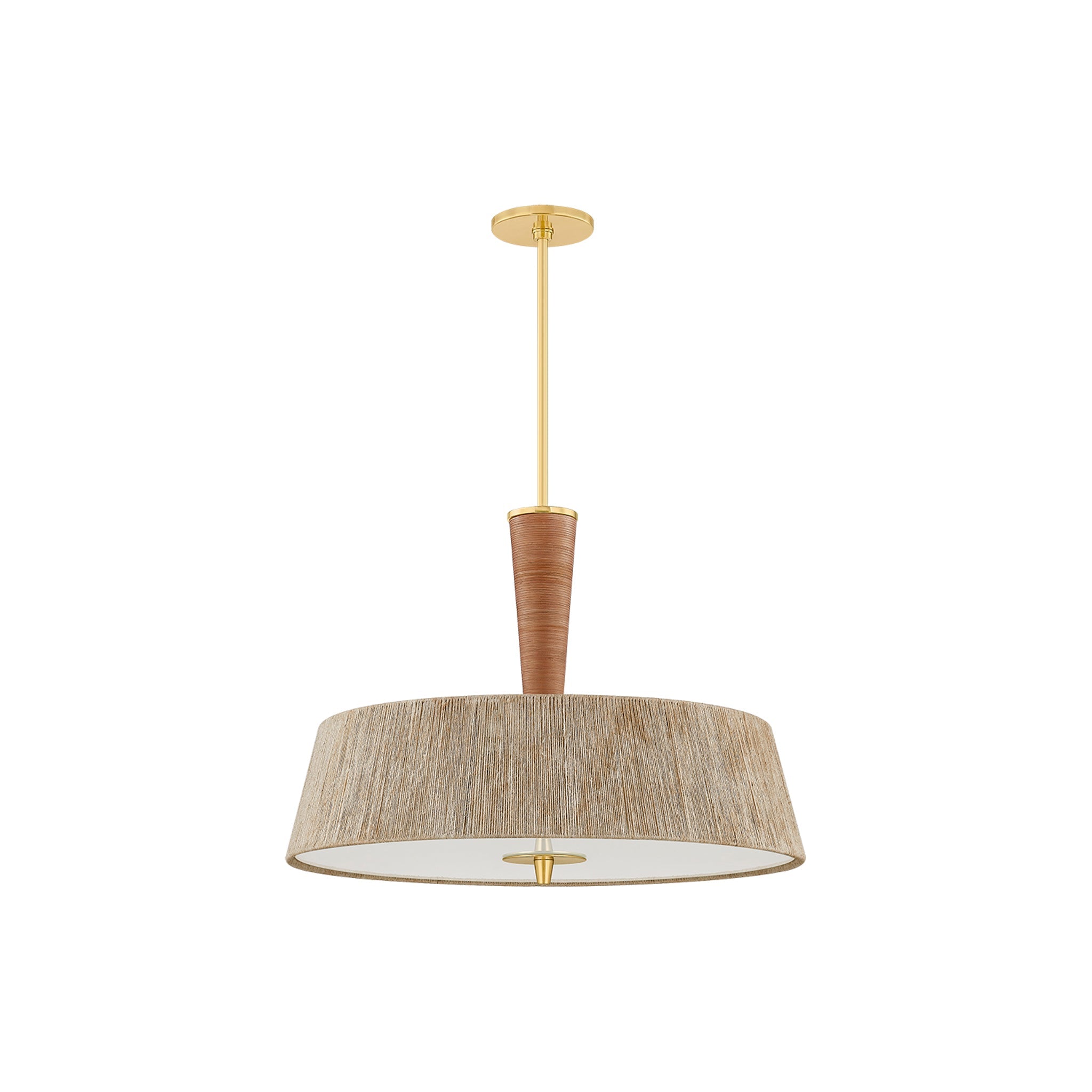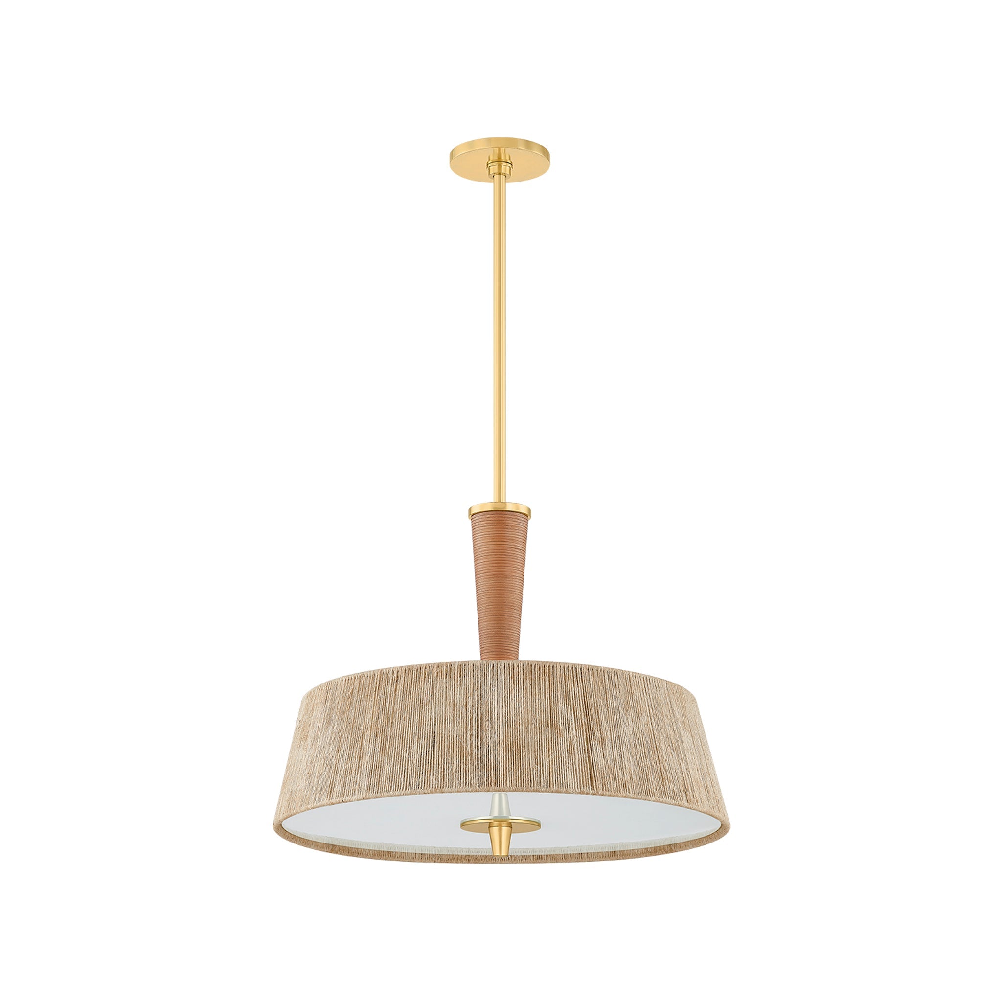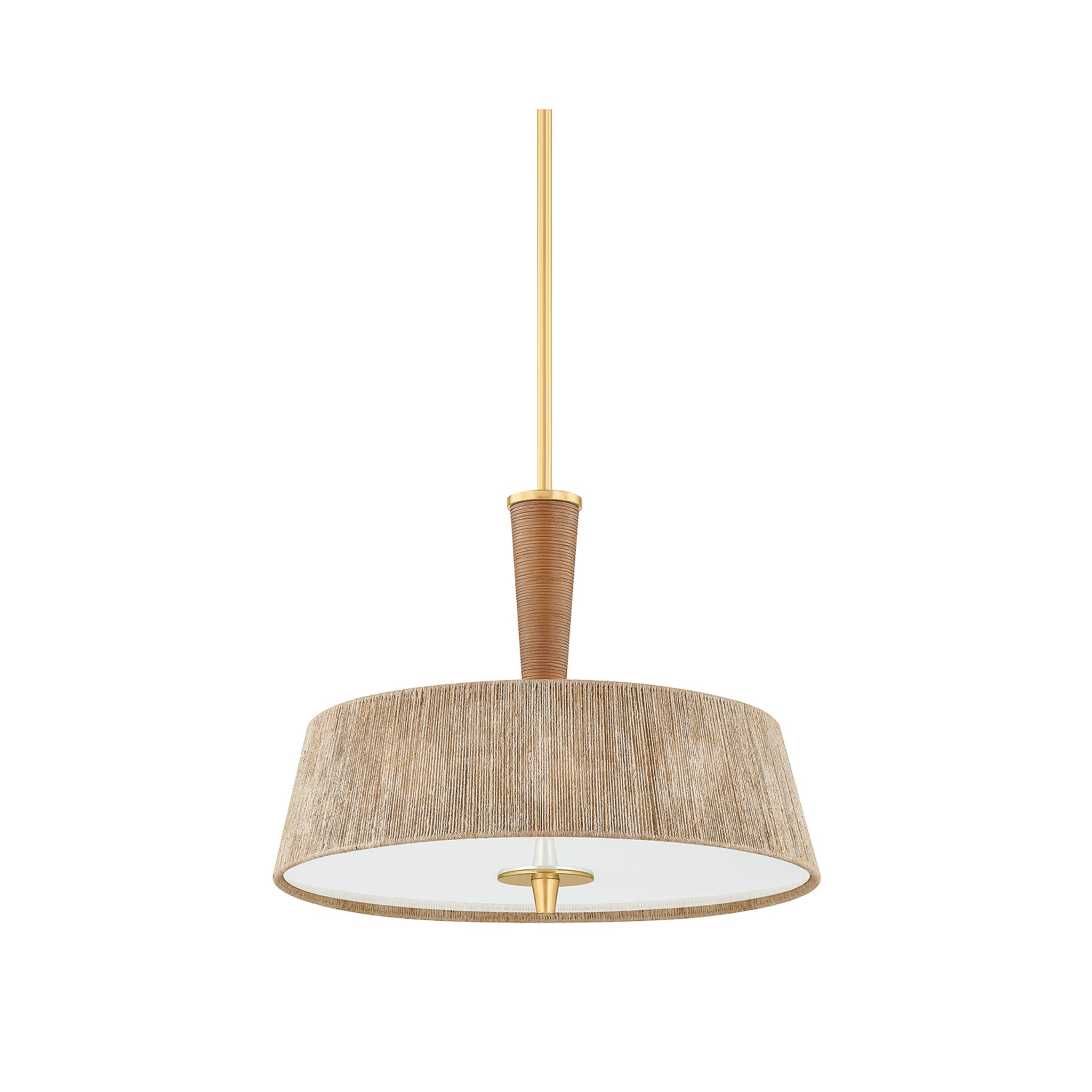 The George family of ceiling lights are boldly scaled and texturally inviting. The combination of the banana leaf string shade, rattan wrapping, and white glass gives each fixture a bohemian feel while remaining sophisticated. The natural, tonal hues enhance the rustic effect, while the Aged Brass metalwork is a timeless finish. Suitable for larger spaces, George introduces an organic freshness to entries and dining areas. Cortney Bishop for Hudson Valley Lighting.