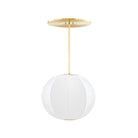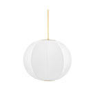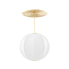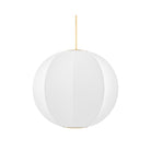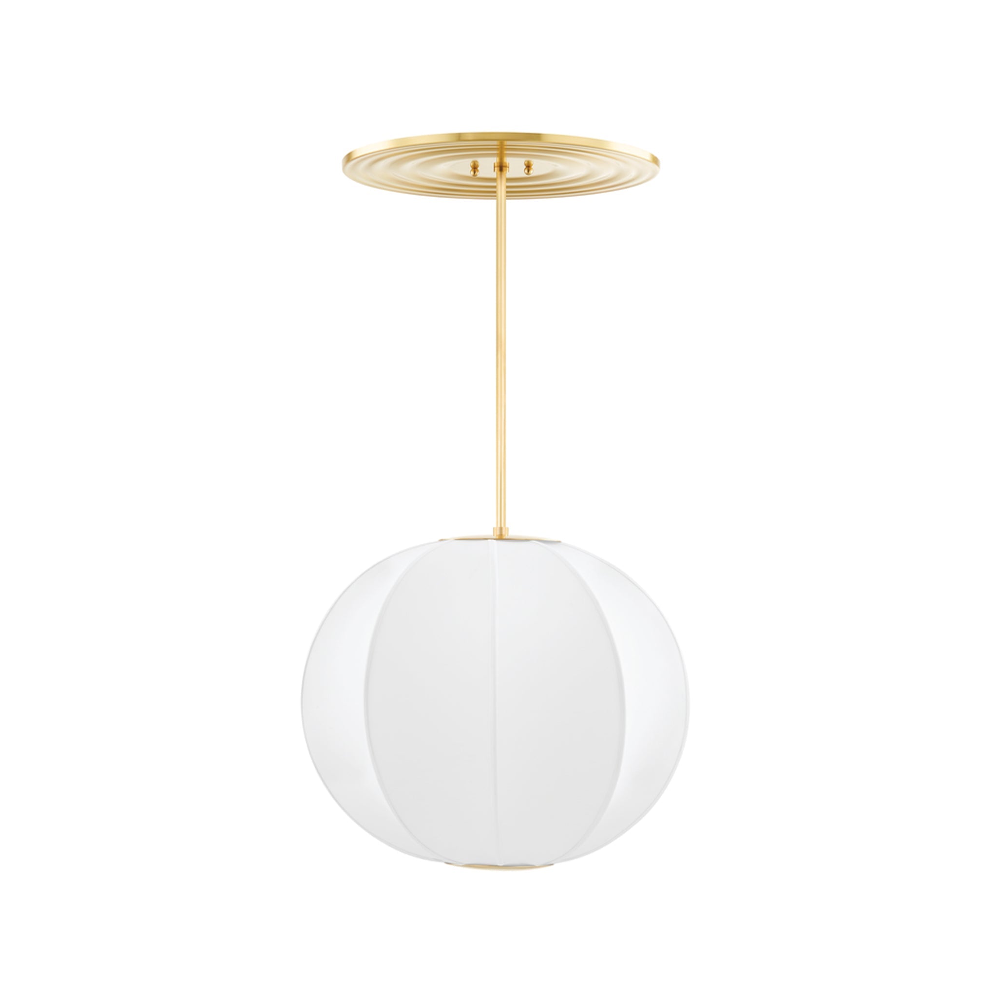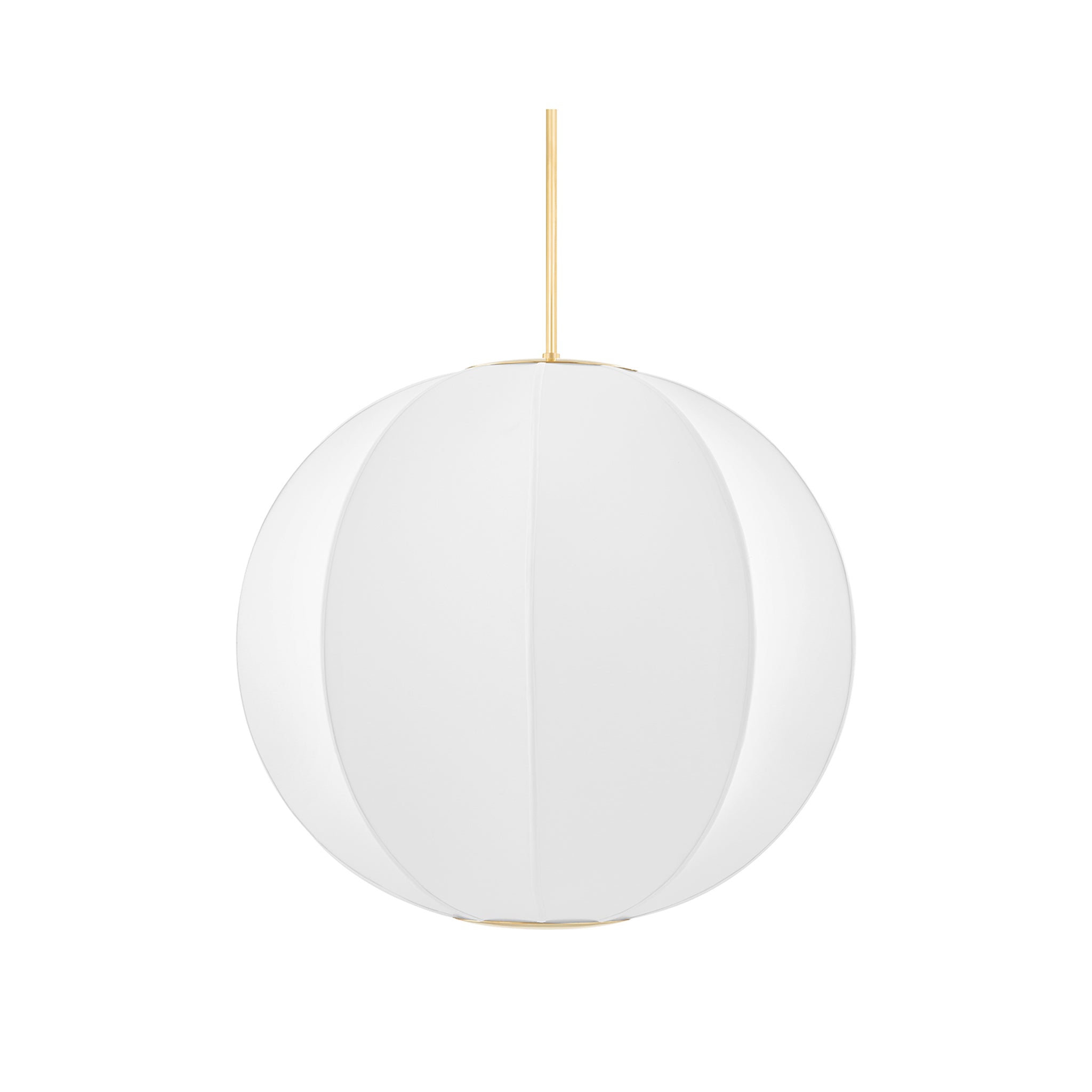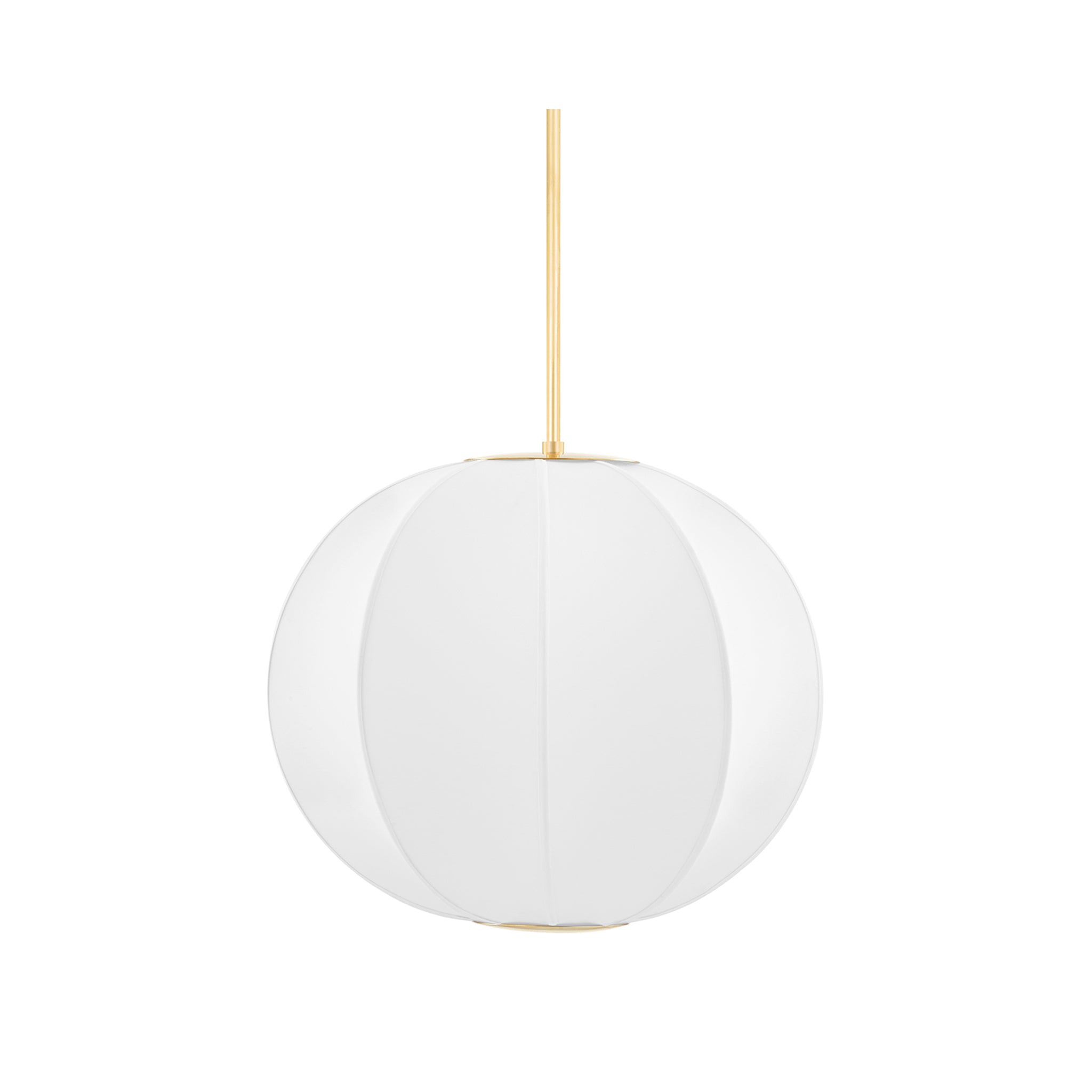 As the name suggests, Jupiter is large in scale and draws the eye upward. An aged brass metal frame is wrapped in white stretch fabric creating a dramatic effect even unlit. When lit, light fills the pendant with a gorgeous glow that bounces off the ringed canopy above. Available in two impressive pendant sizes. Kelly Behun for Hudson Valley Lighting.