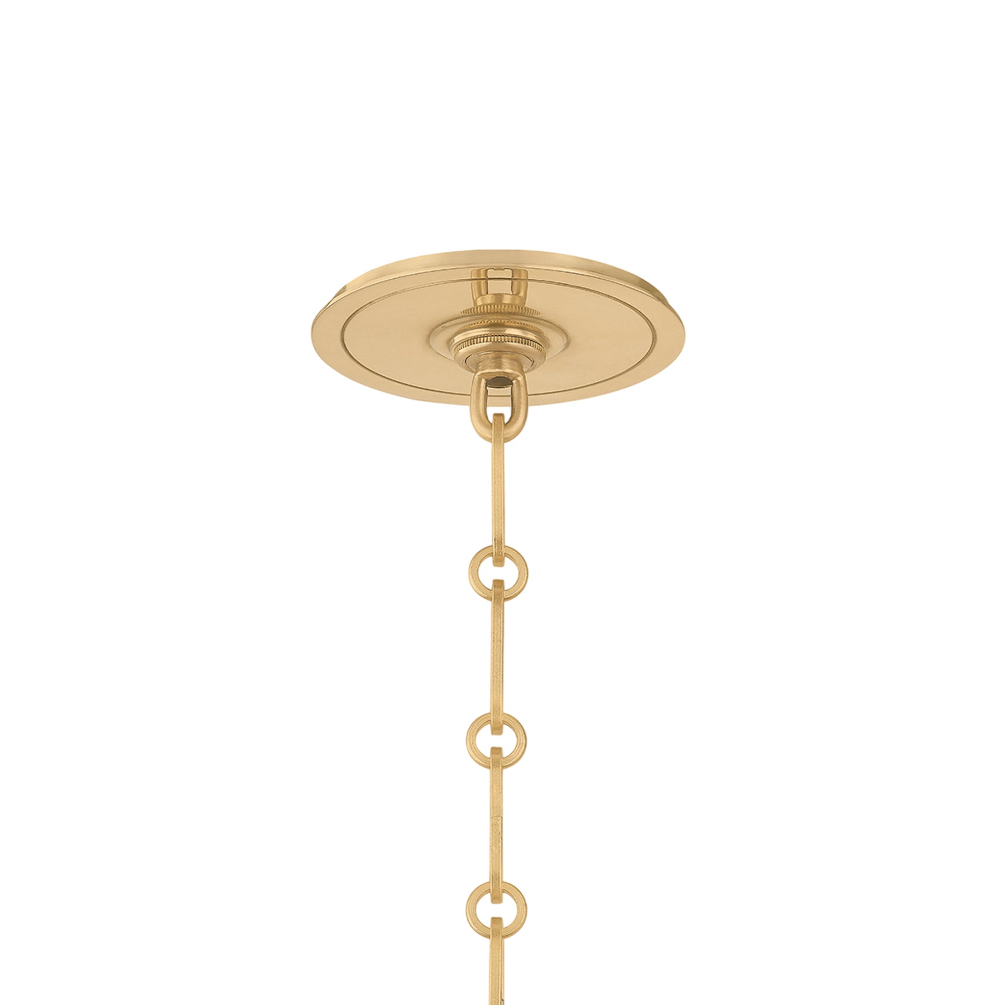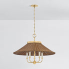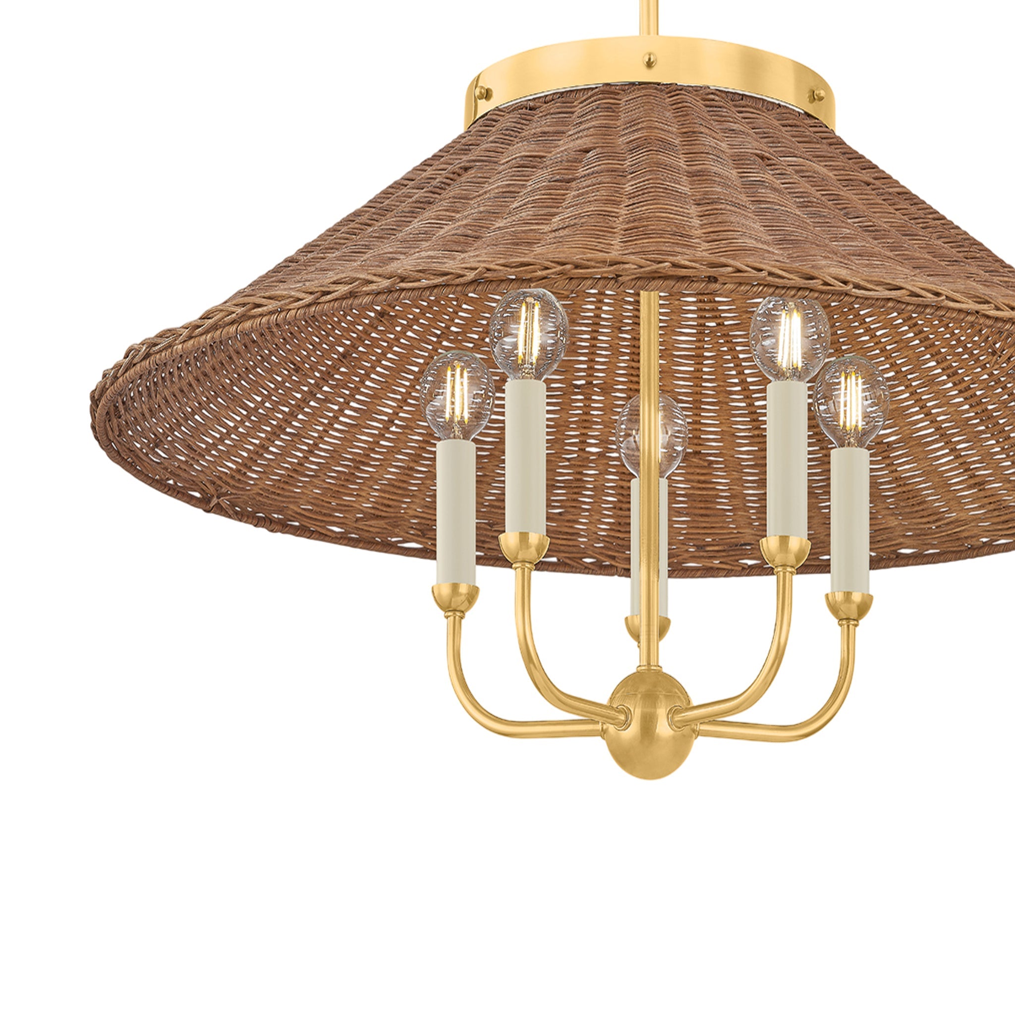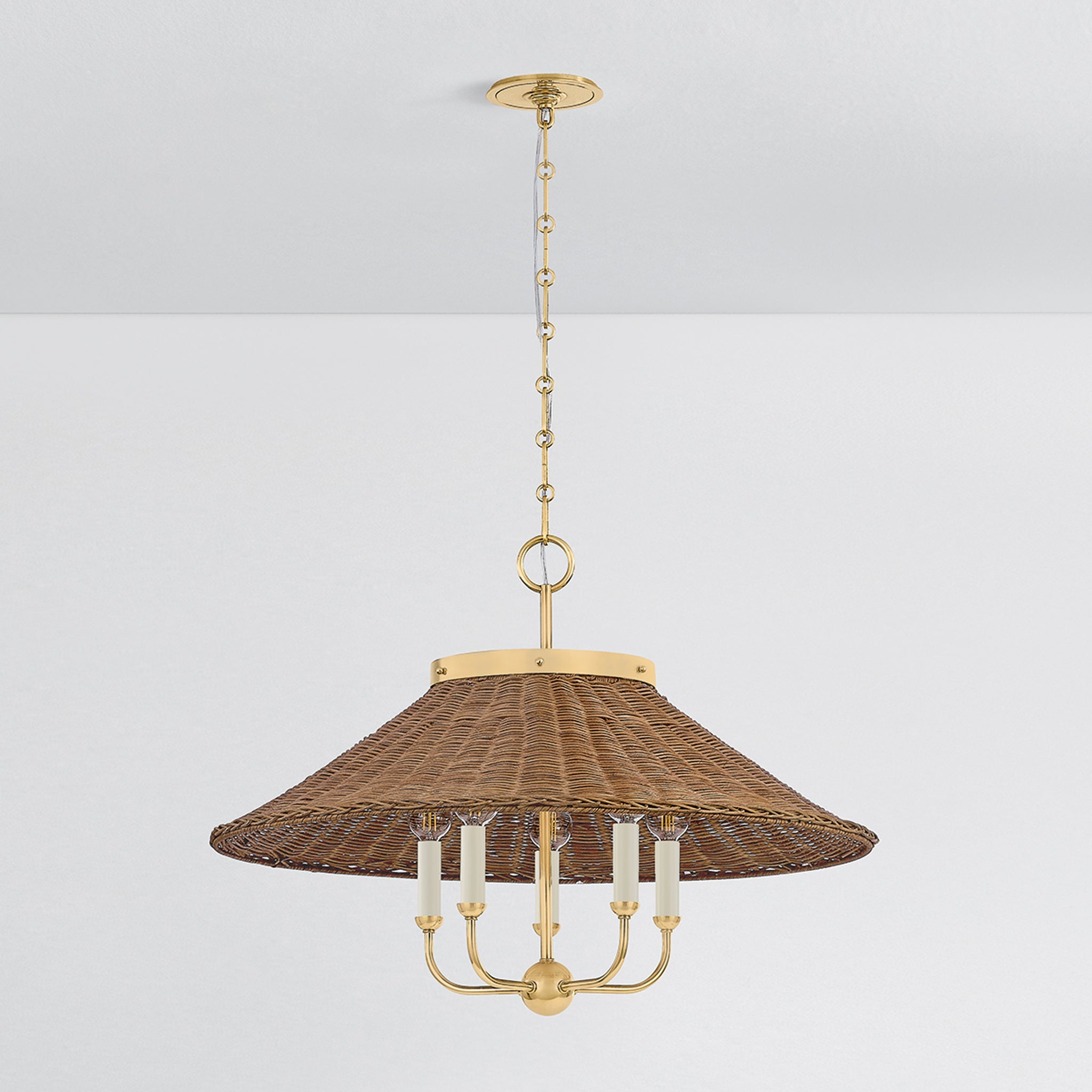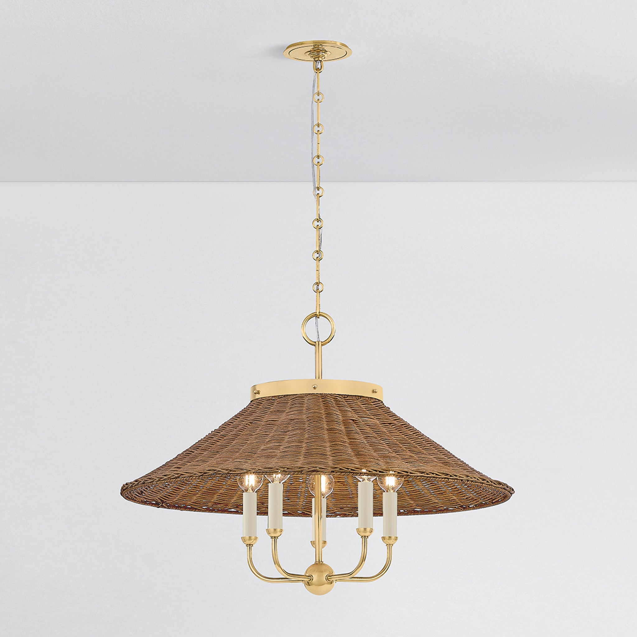 Kensington reimagines Mark D. Sikes' Clivedon family by introducing the natural beauty of walnut wicker. The heritage feel of these fixtures stems from their artisanal craftsmanship, Aged Brass accents, and classic design details like a slender gooseneck arm. An instant classic, Kensington is designed to be layered with other pieces in the same family. Available as a sconce, pendant in two sizes, and a 5-light chandelier. Mark D. Sikes for Hudson Valley Lighting.