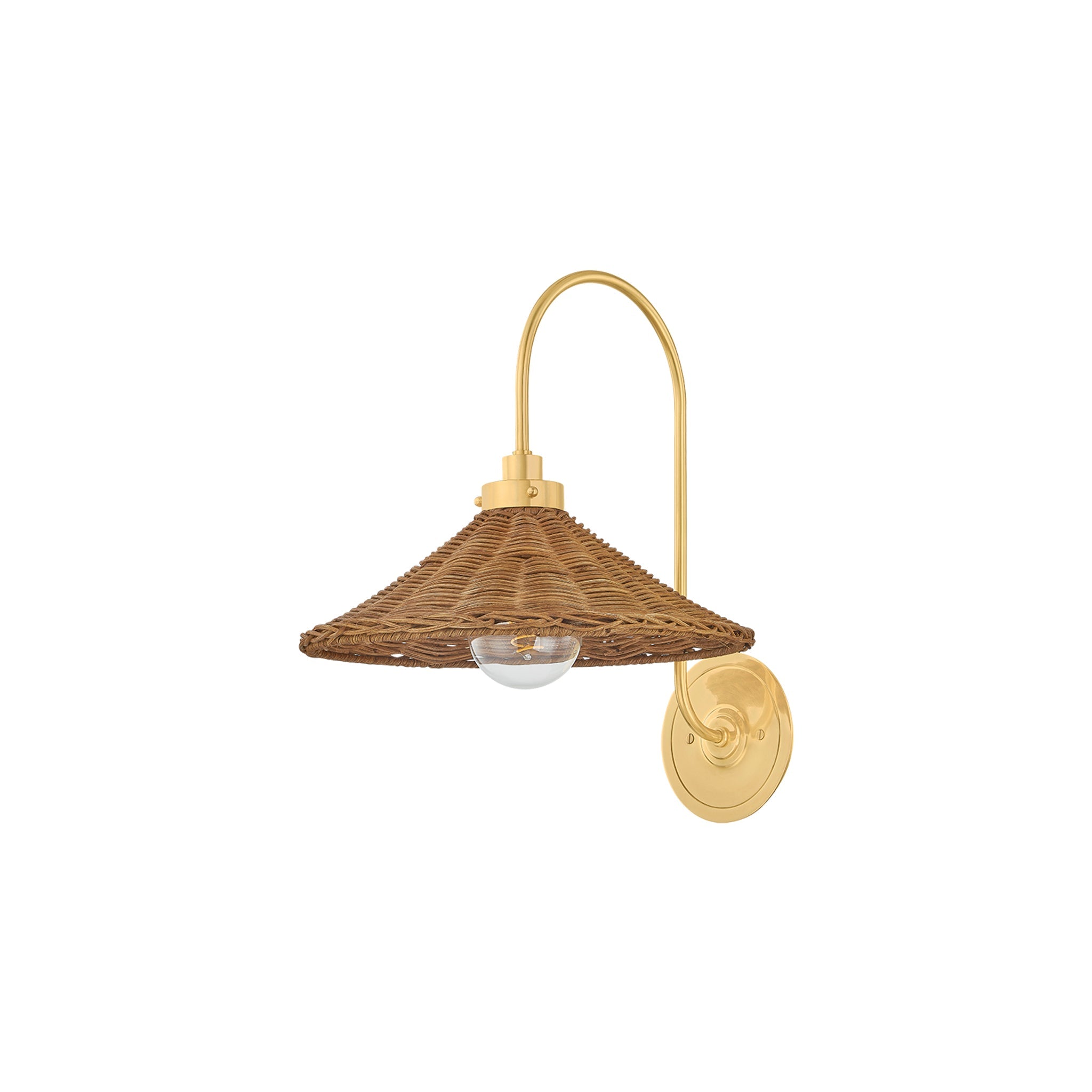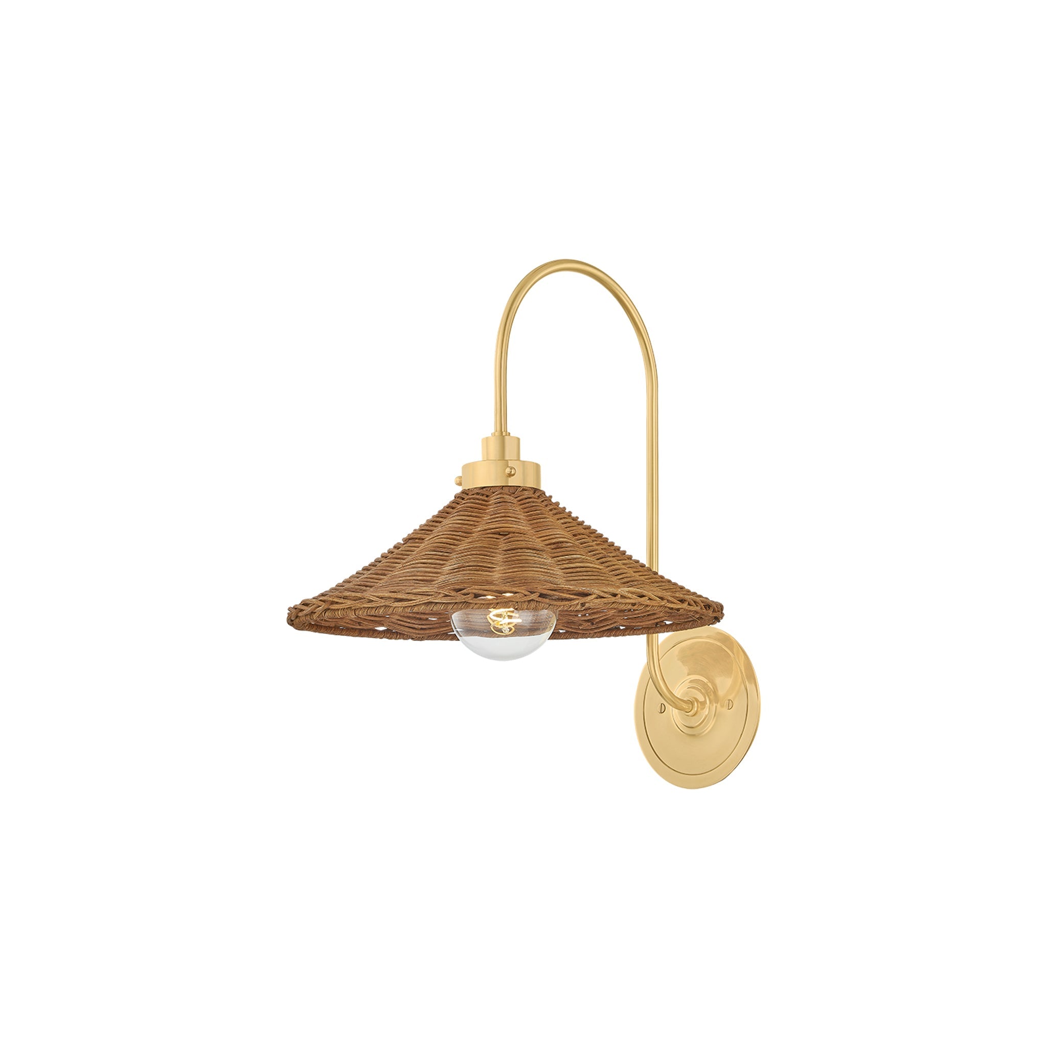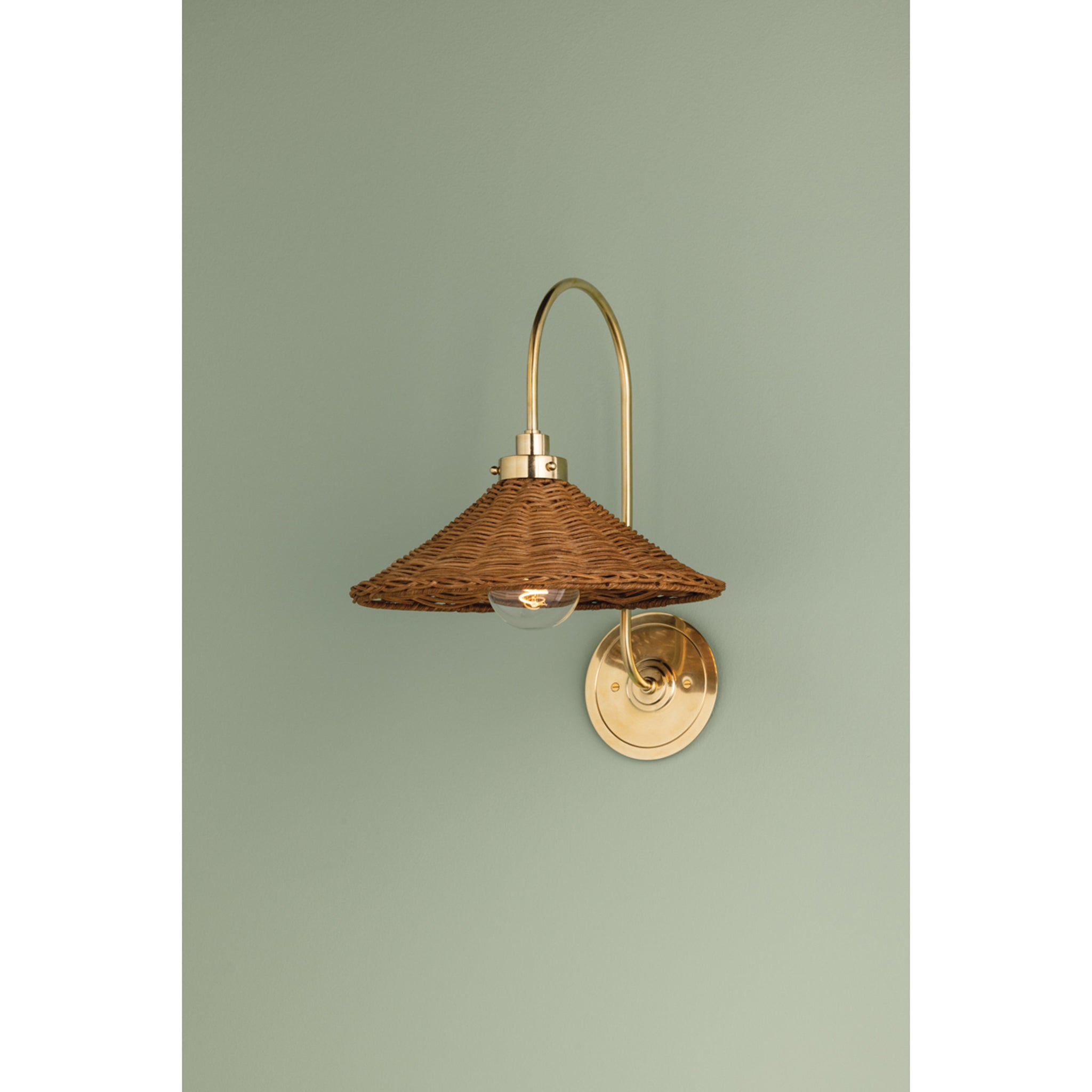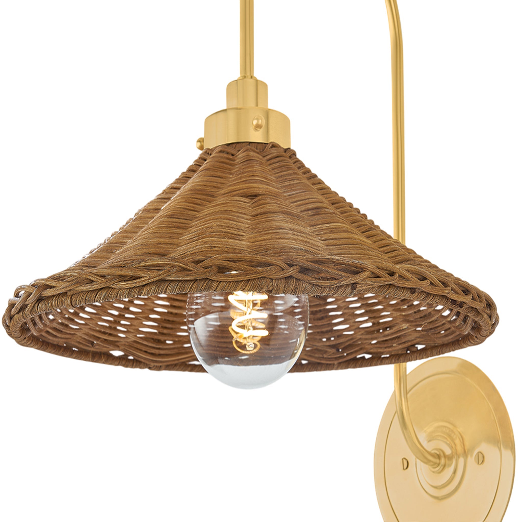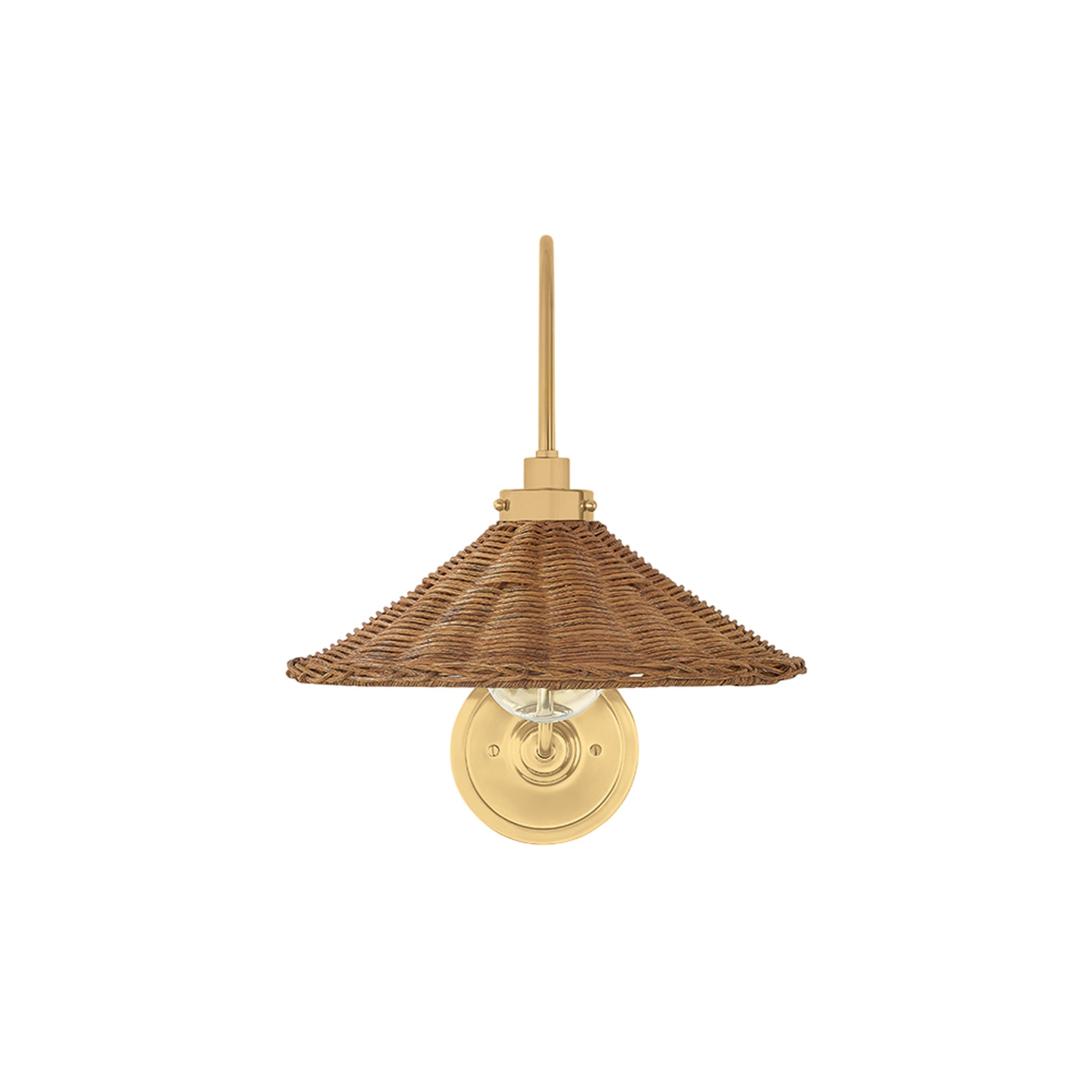 Kensington reimagines Mark D. Sikes' Clivedon family by introducing the natural beauty of walnut wicker. The heritage feel of these fixtures stems from their artisanal craftsmanship, Aged Brass accents, and classic design details like a slender gooseneck arm. An instant classic, Kensington is designed to be layered with other pieces in the same family. Available as a sconce, pendant in two sizes, and a 5-light chandelier. Mark D. Sikes for Hudson Valley Lighting.